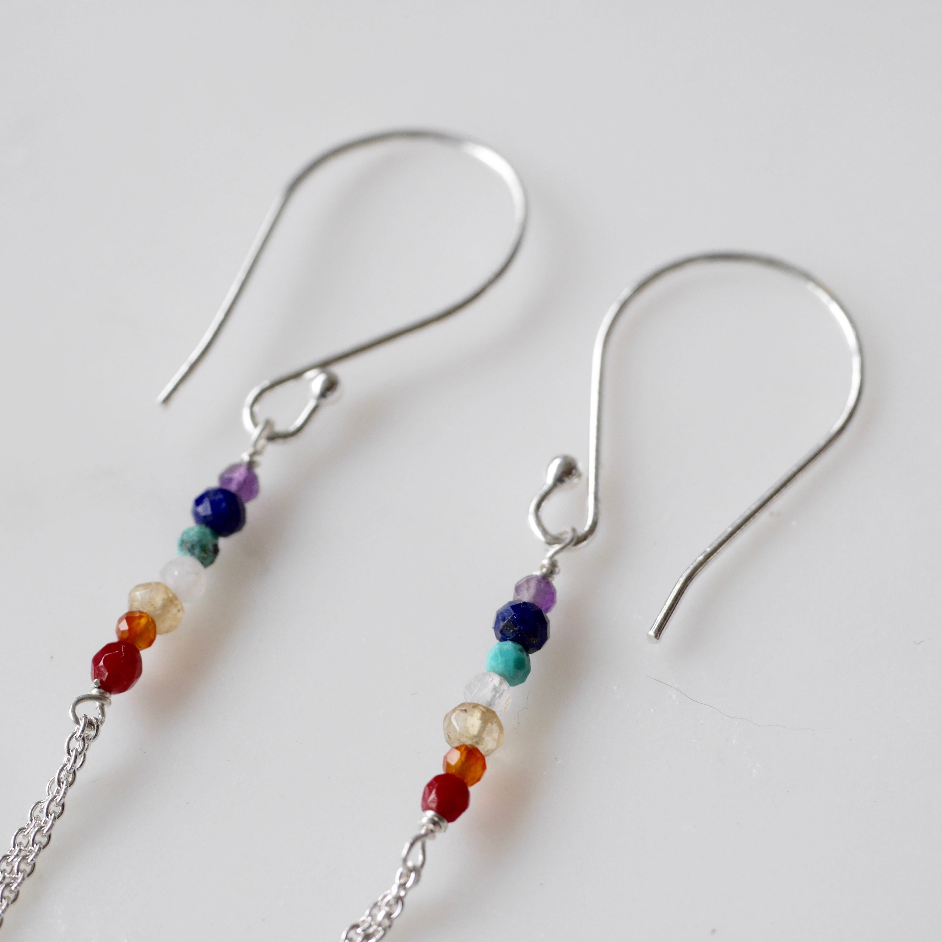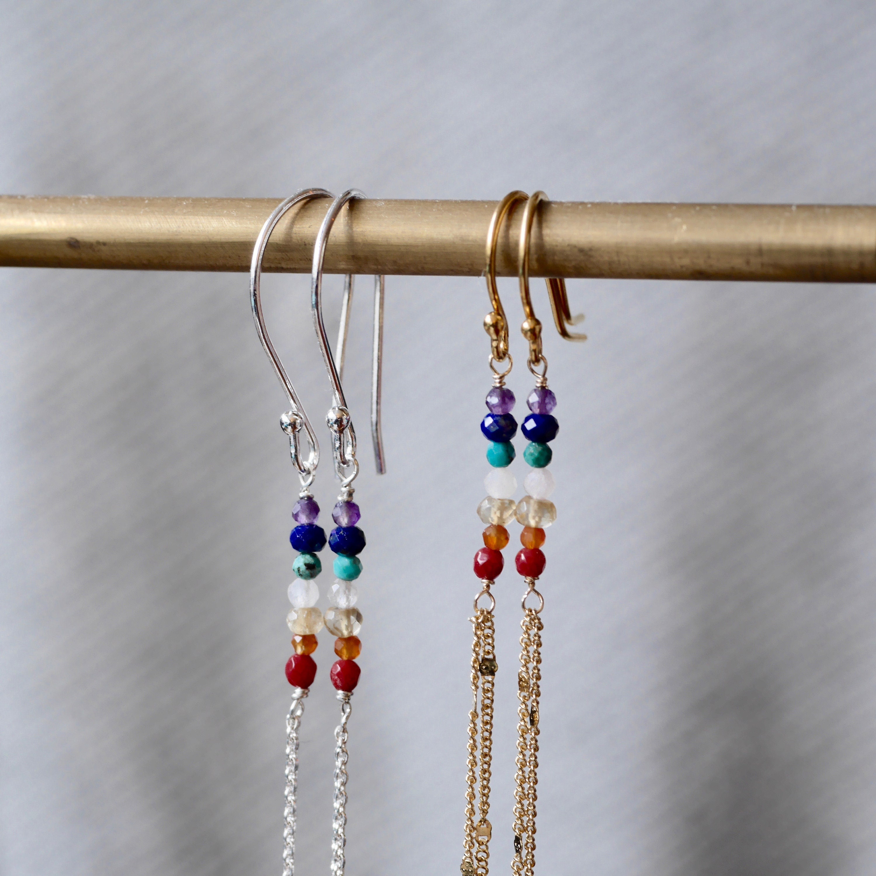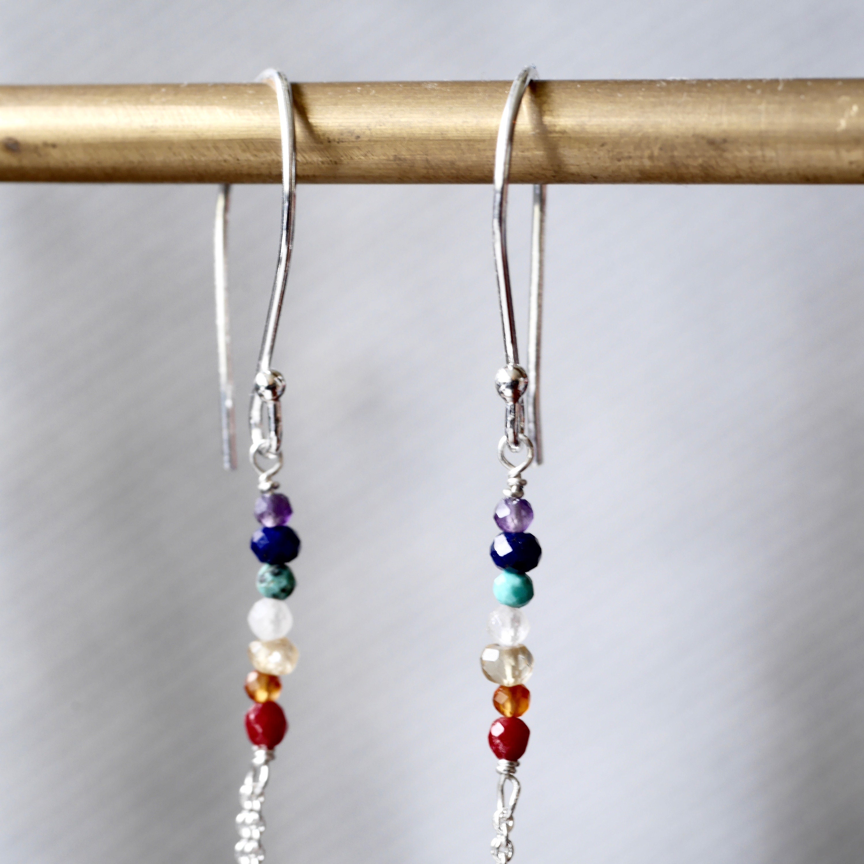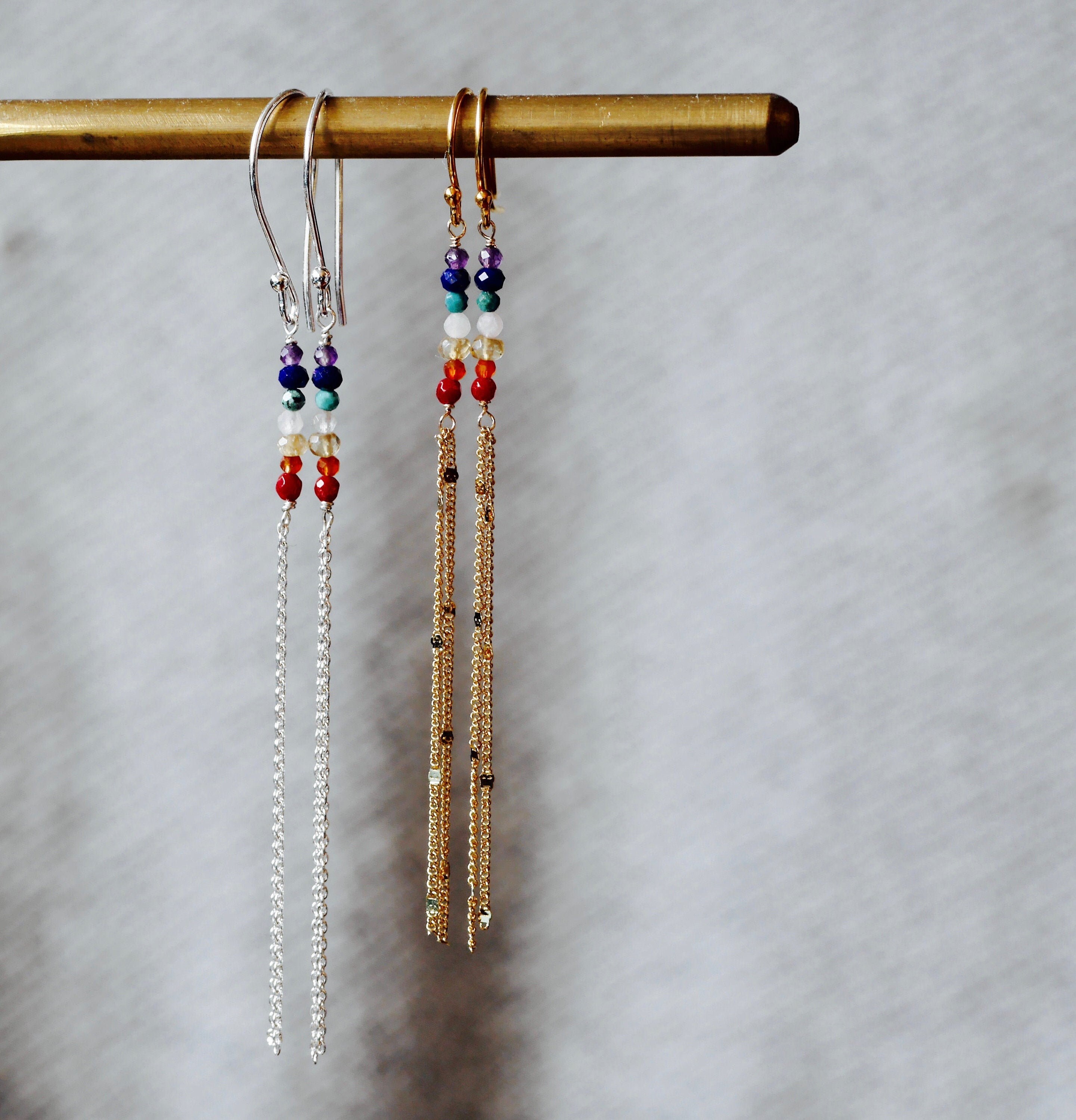 Multicoloured seven chakra real natural gemstone long drop earrings in minimalist design. The earrings are available in sterling silver or Gold finish (gold filled chain and gold vermeil ear wires).