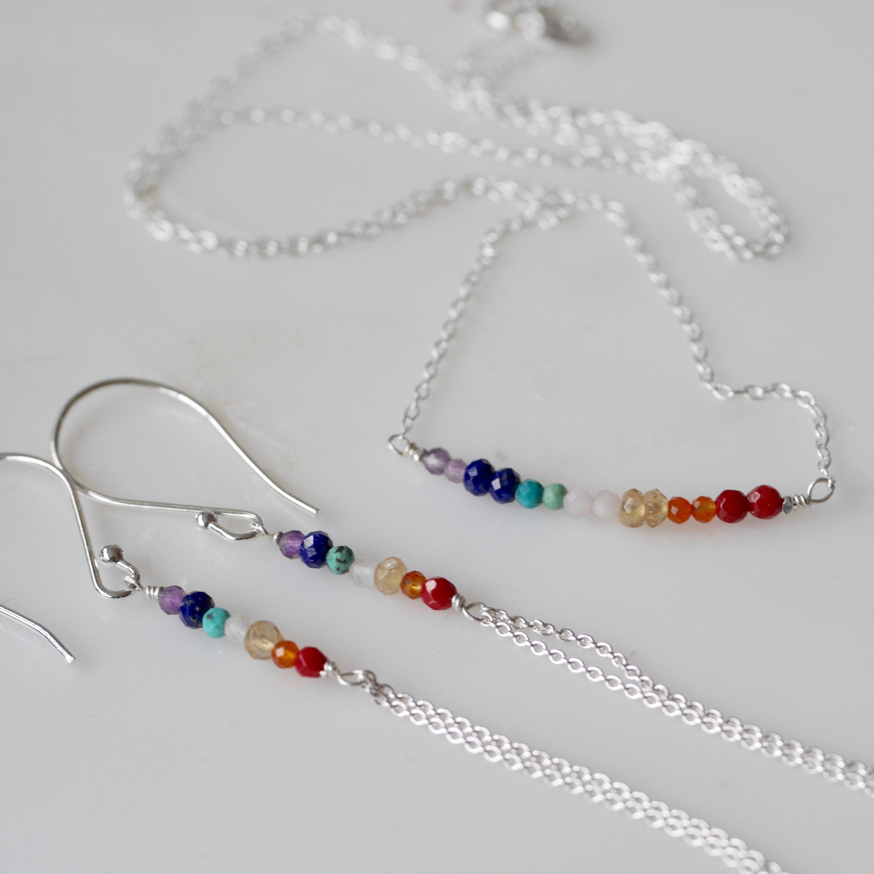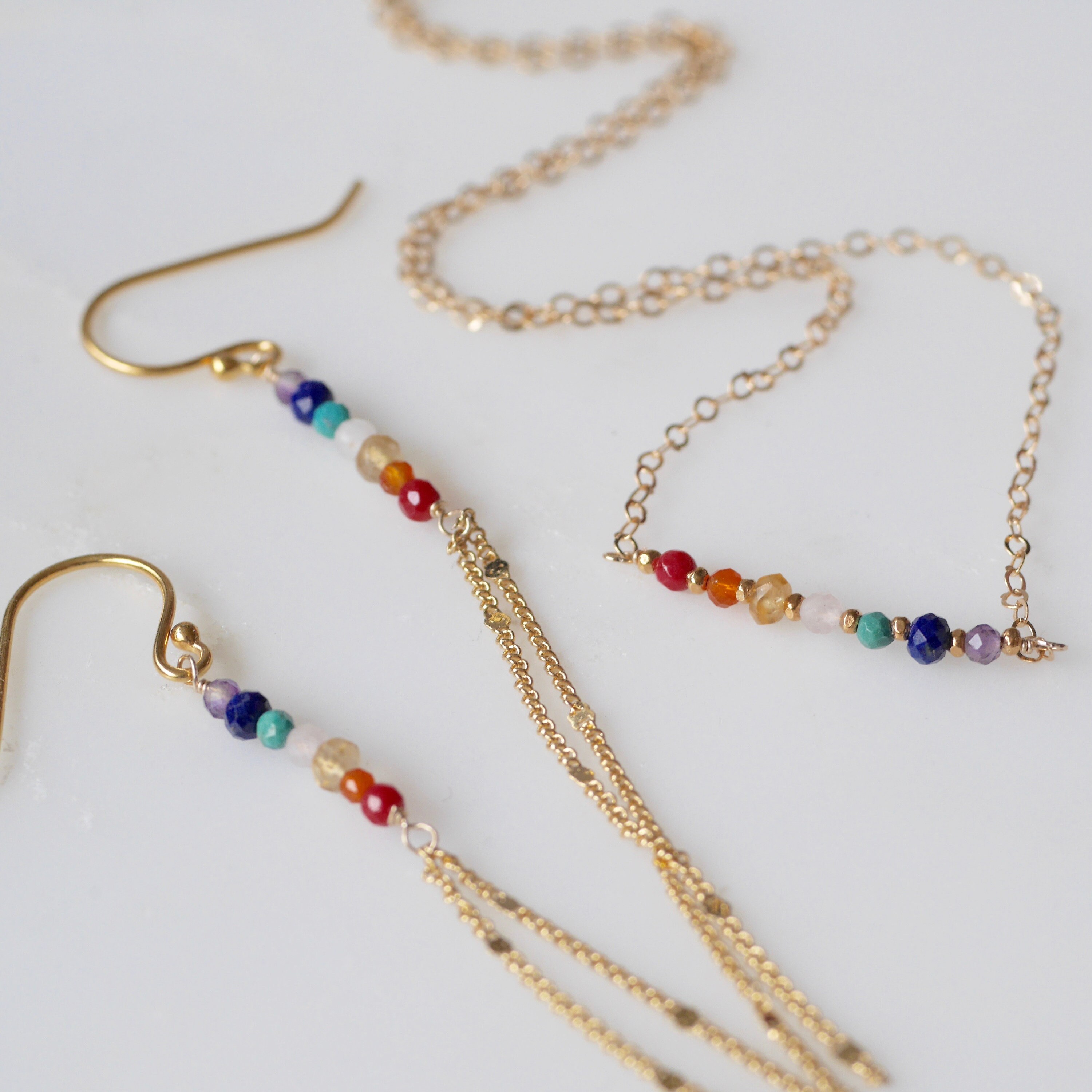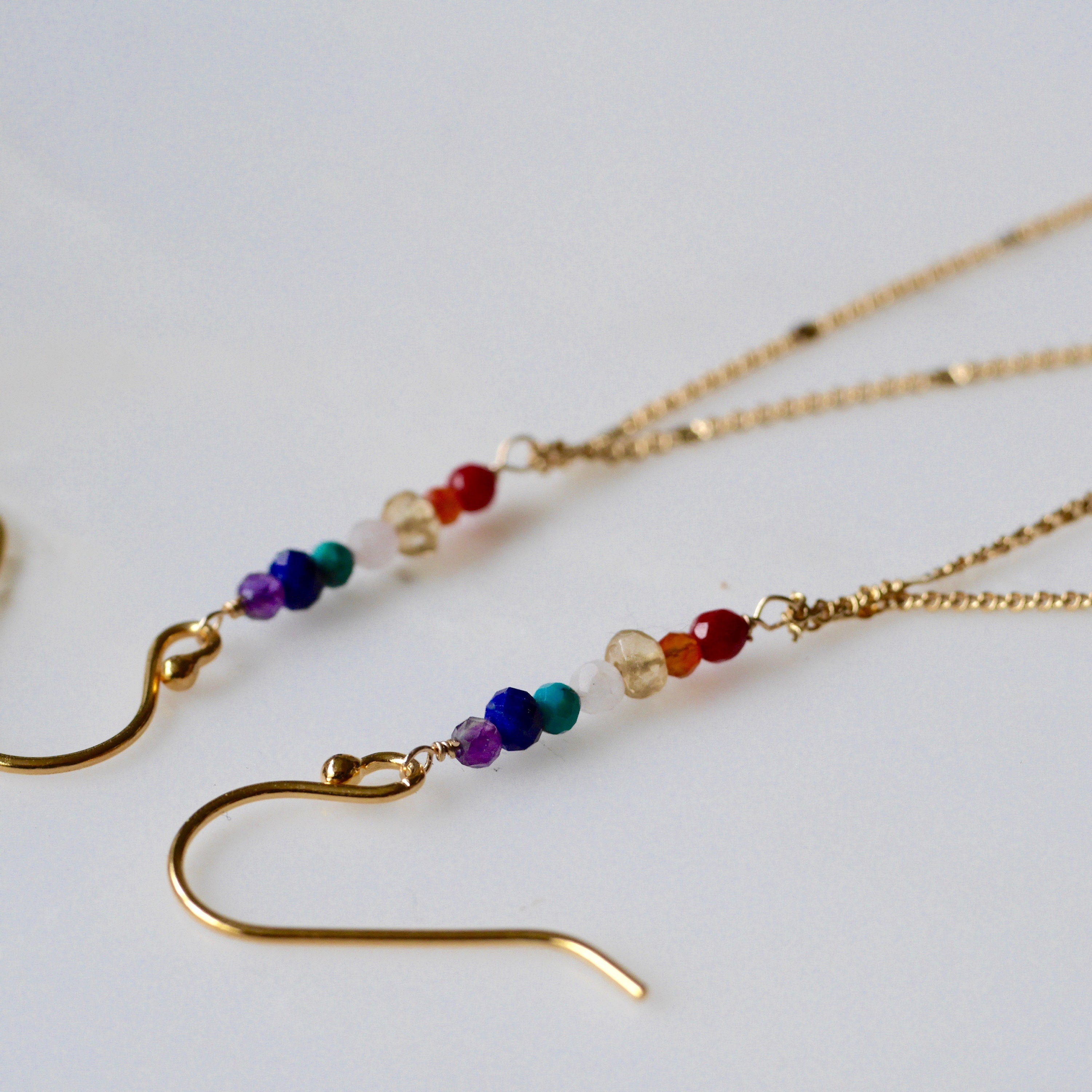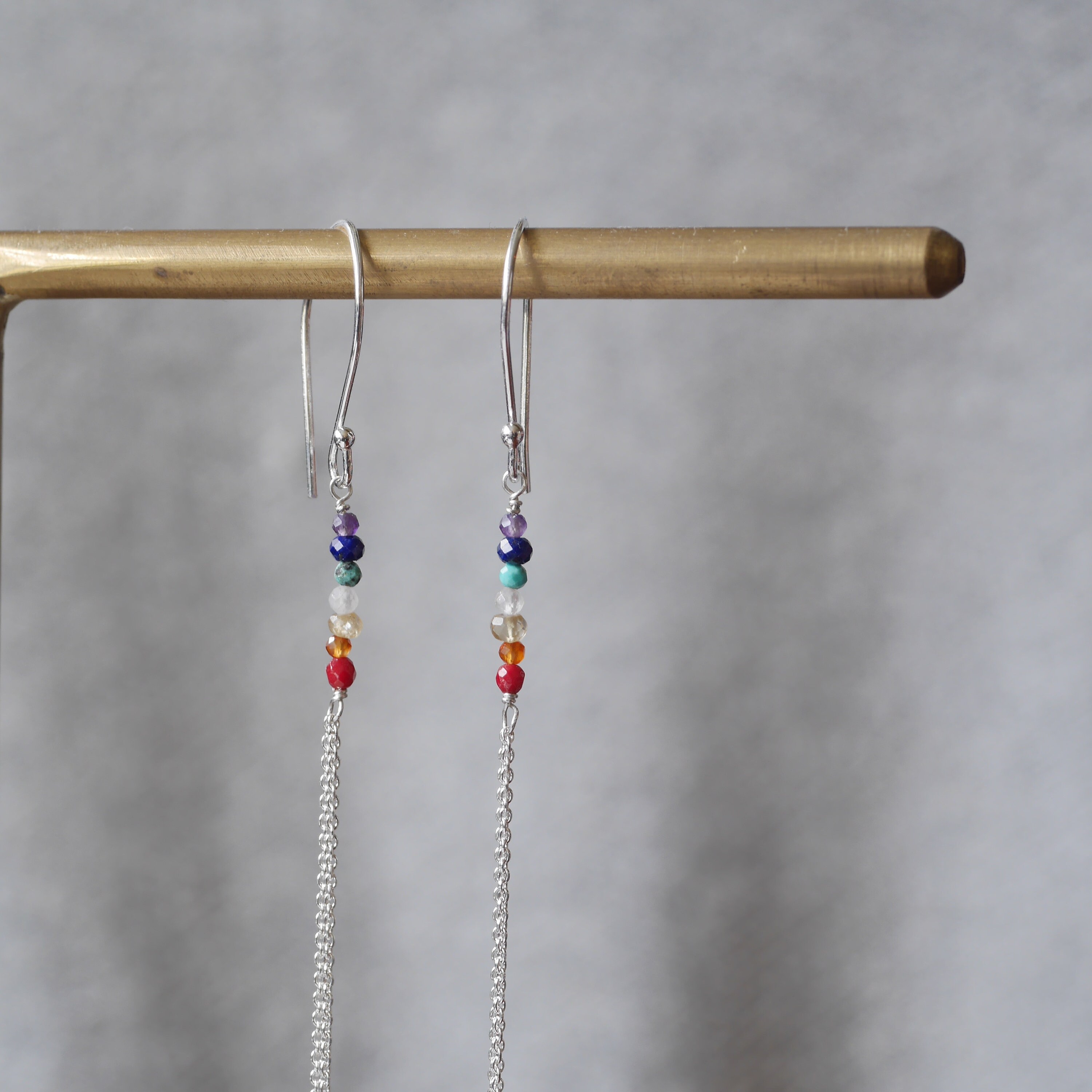 Multicoloured seven chakra real natural gemstone long drop earrings in minimalist design. The earrings are available in sterling silver or Gold finish (gold filled chain and gold vermeil ear wires).