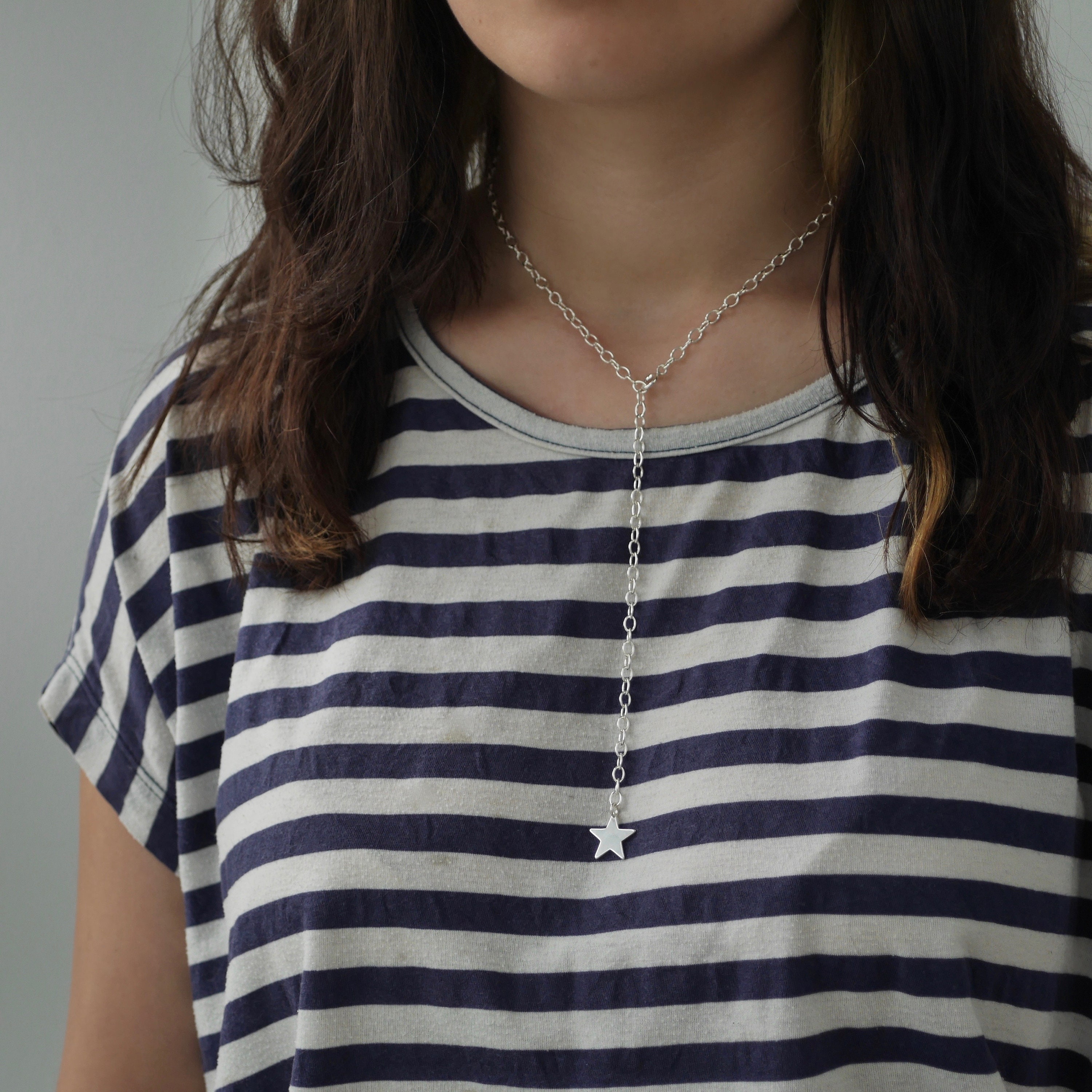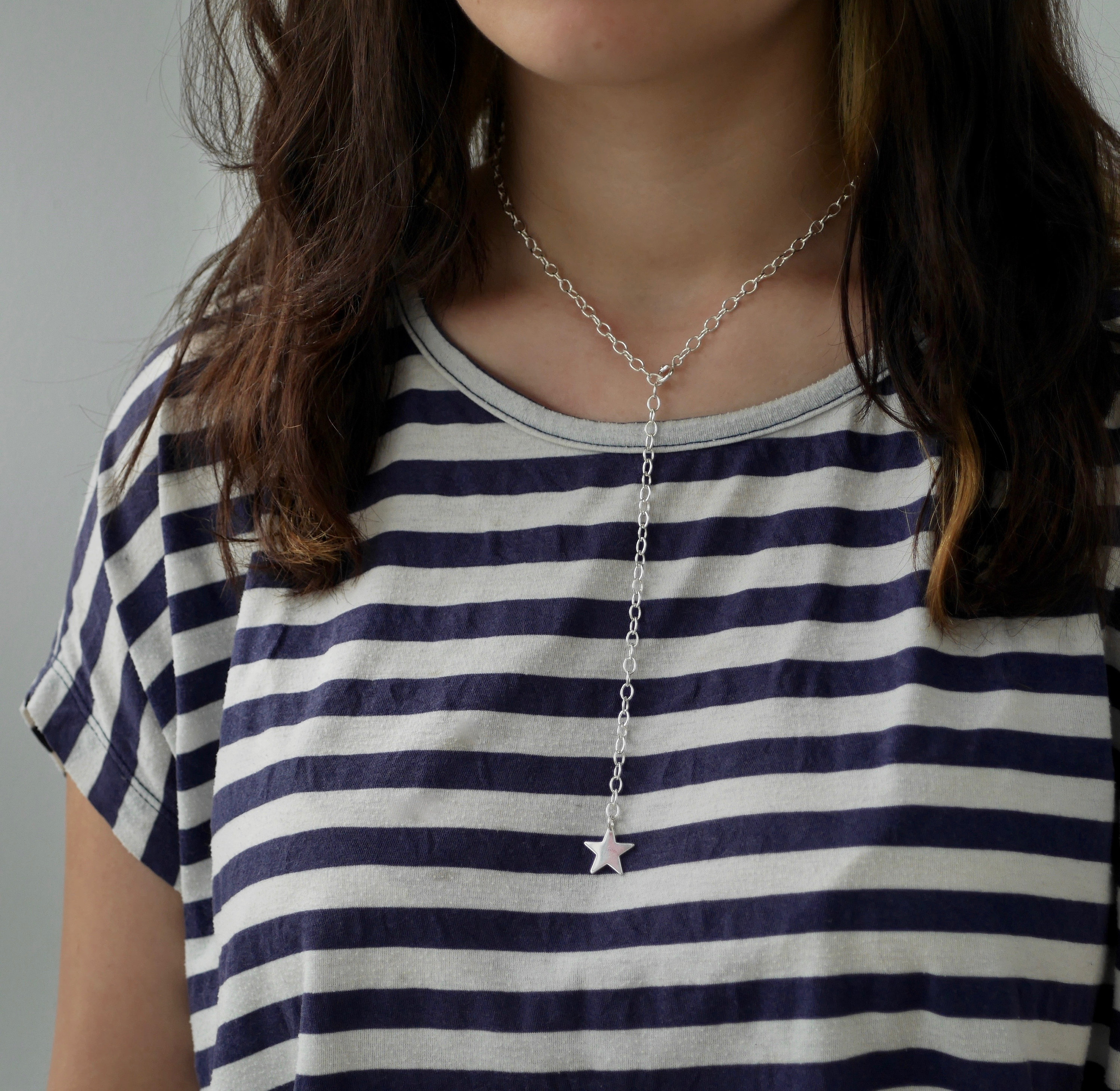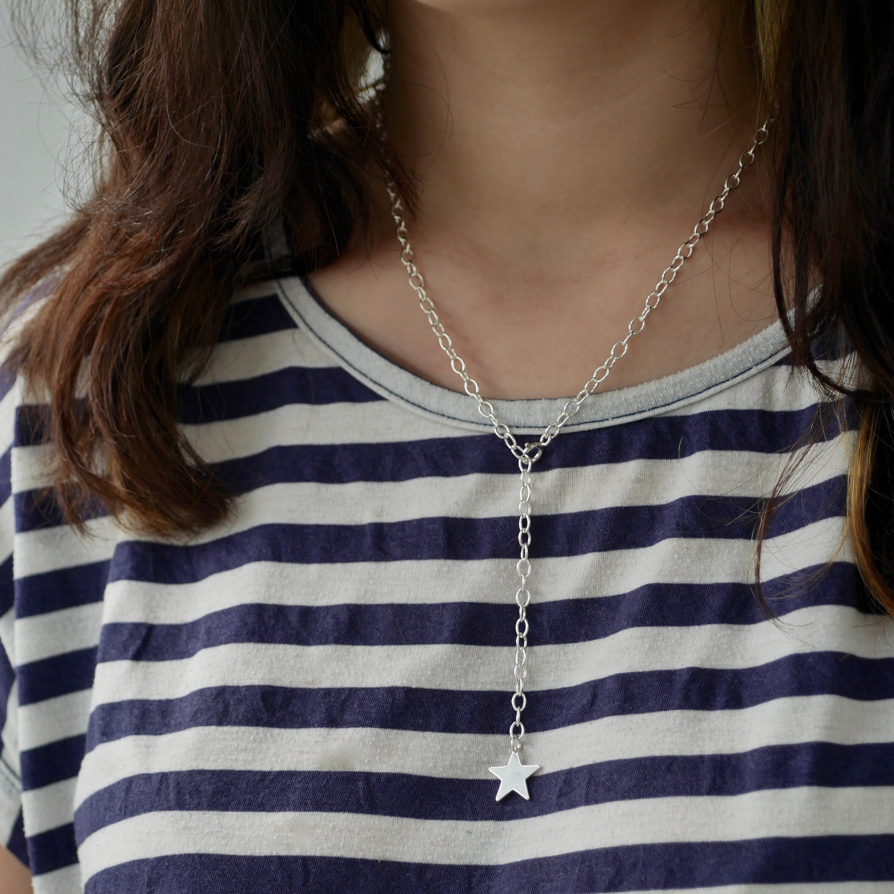 Sterling Silver medium chain adjustable necklace comes with your choice of tags; star or circle shapes. Adjustable Sterling Silver chain Y necklace.