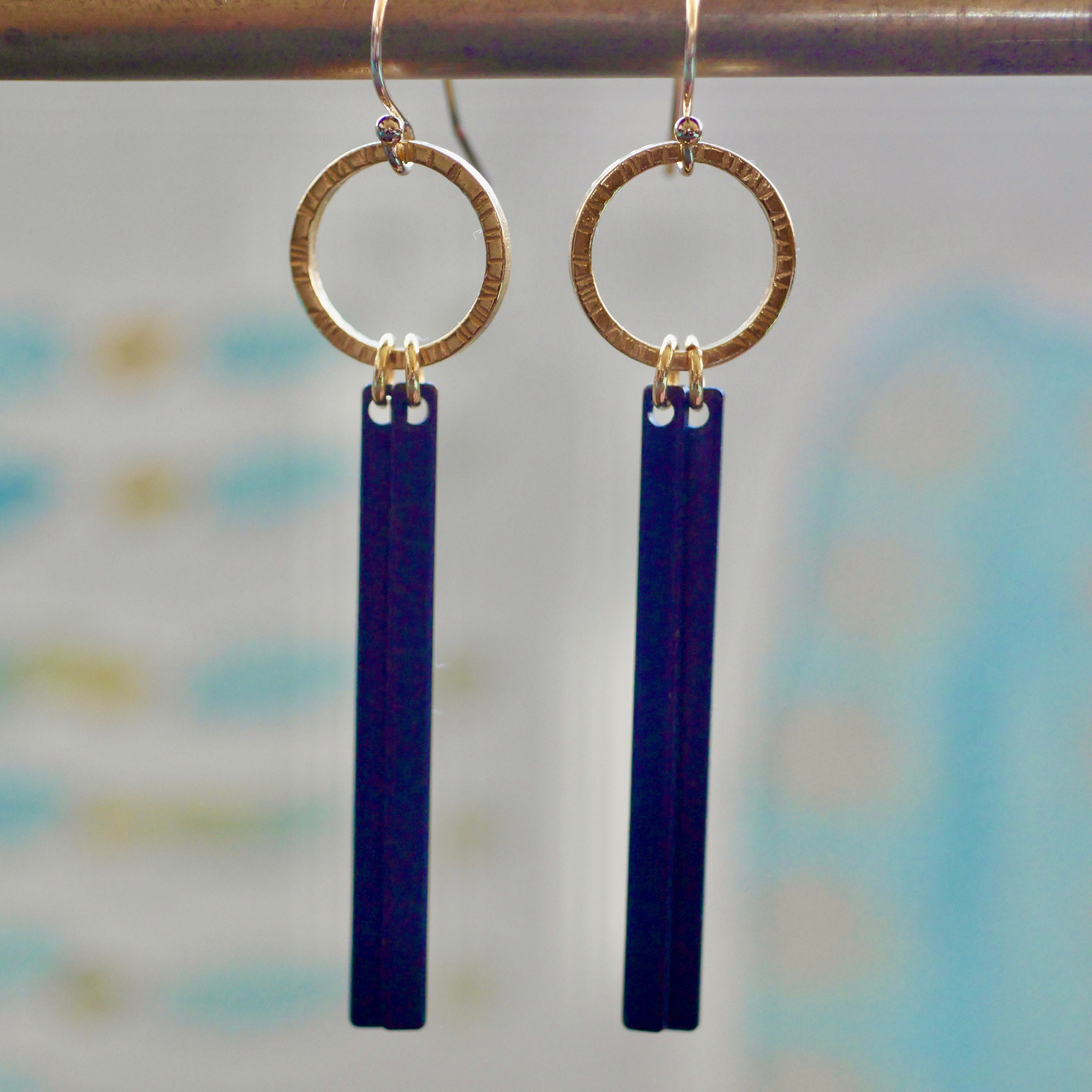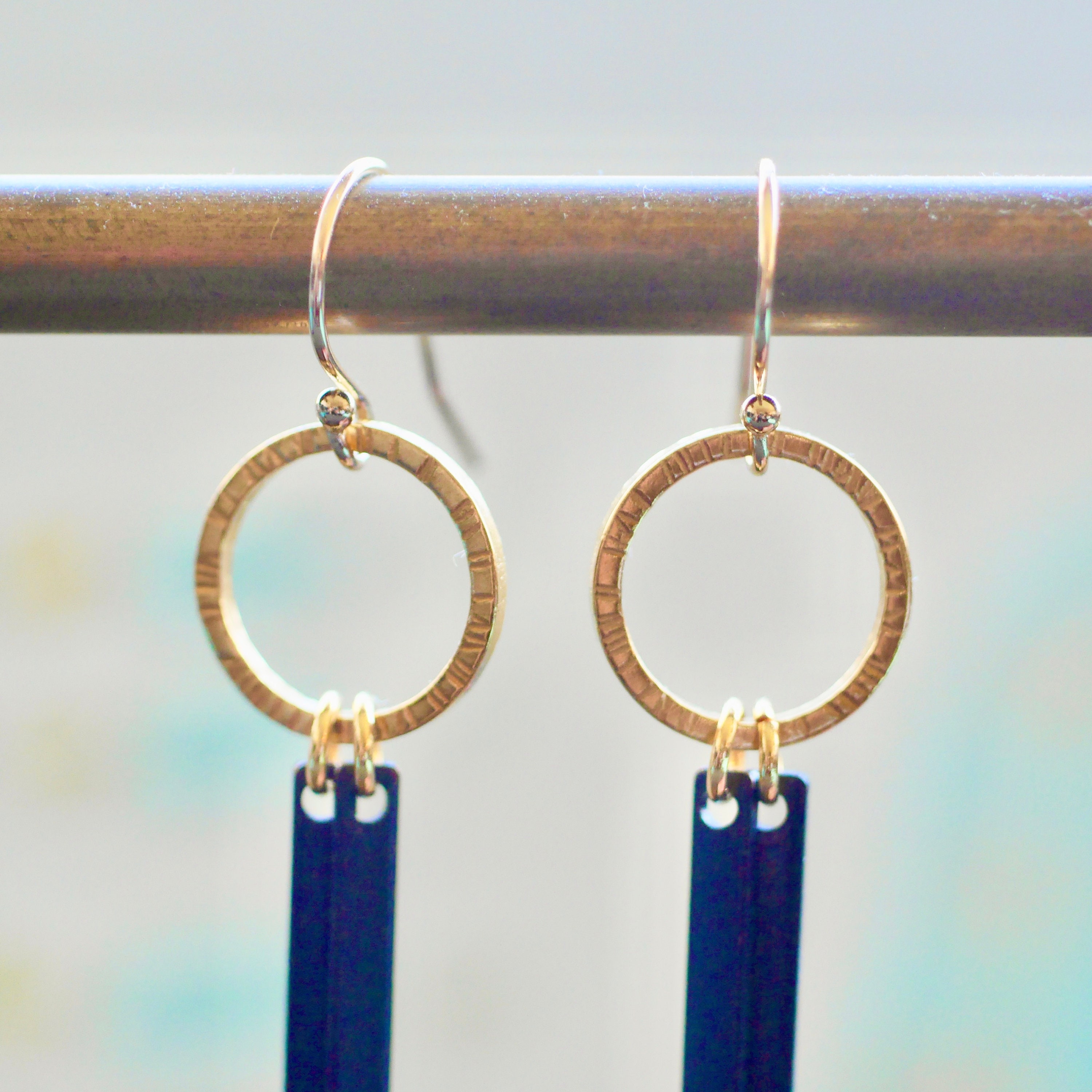 Minimalist Textured Circle and Bar Geometric Mixed Metal Drop Earrings