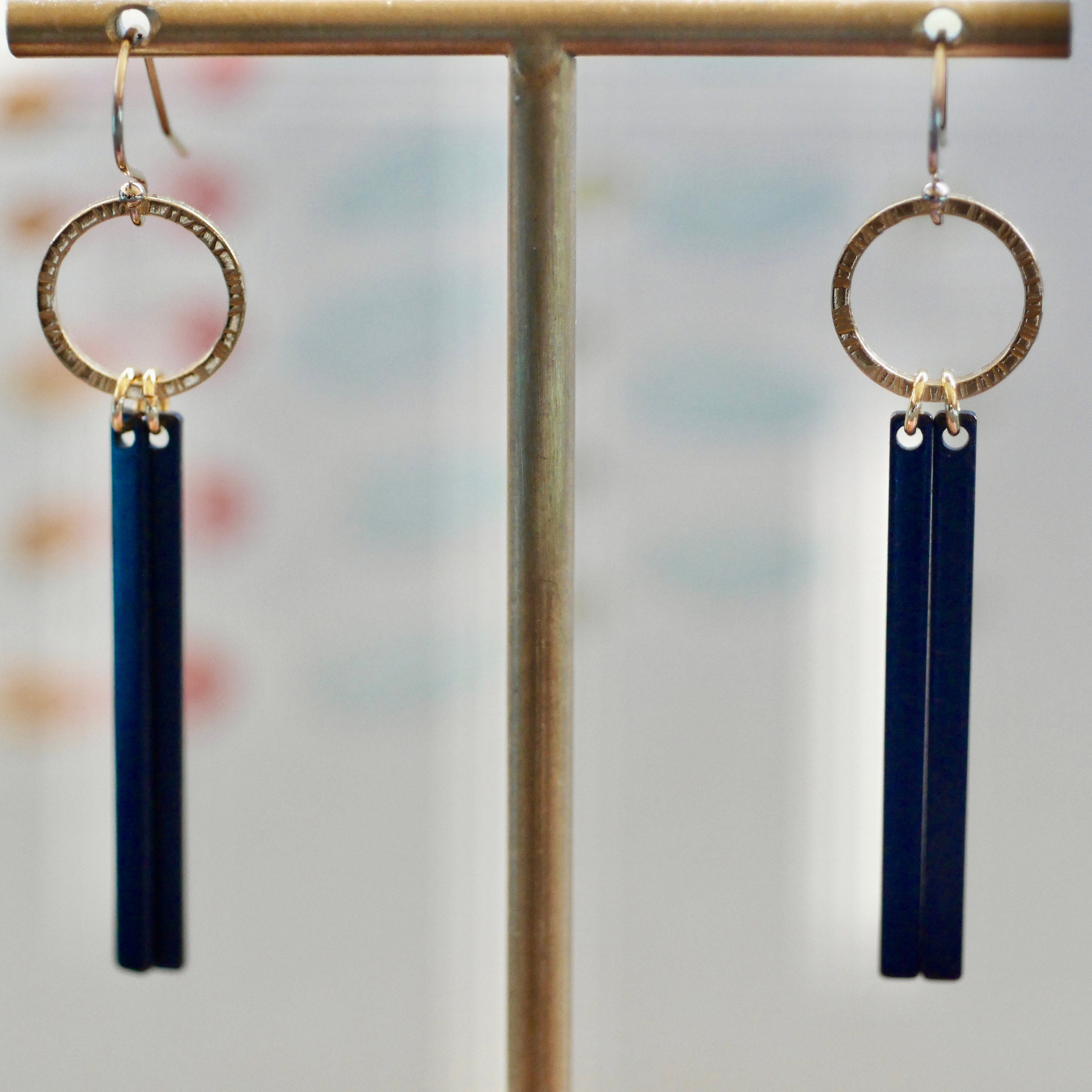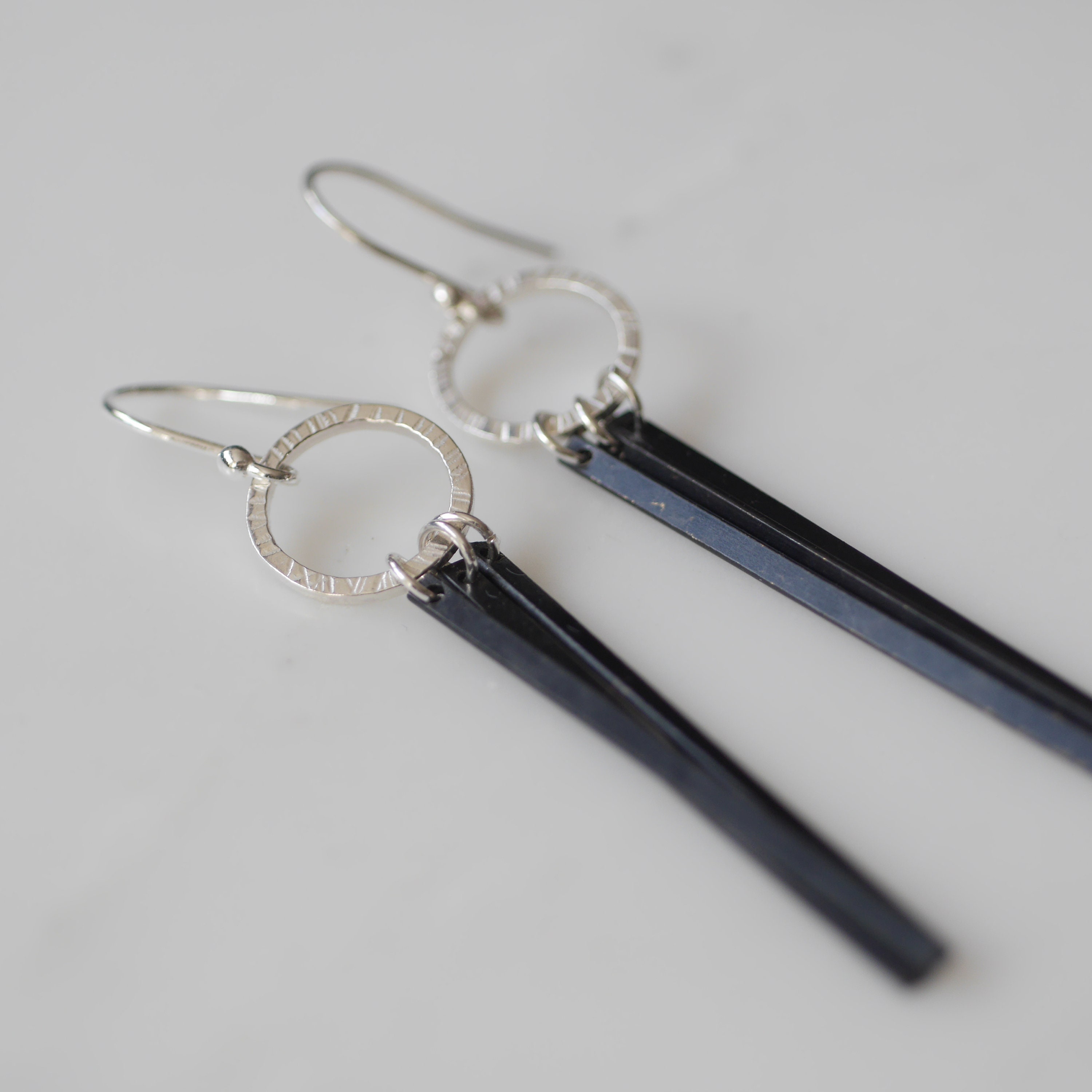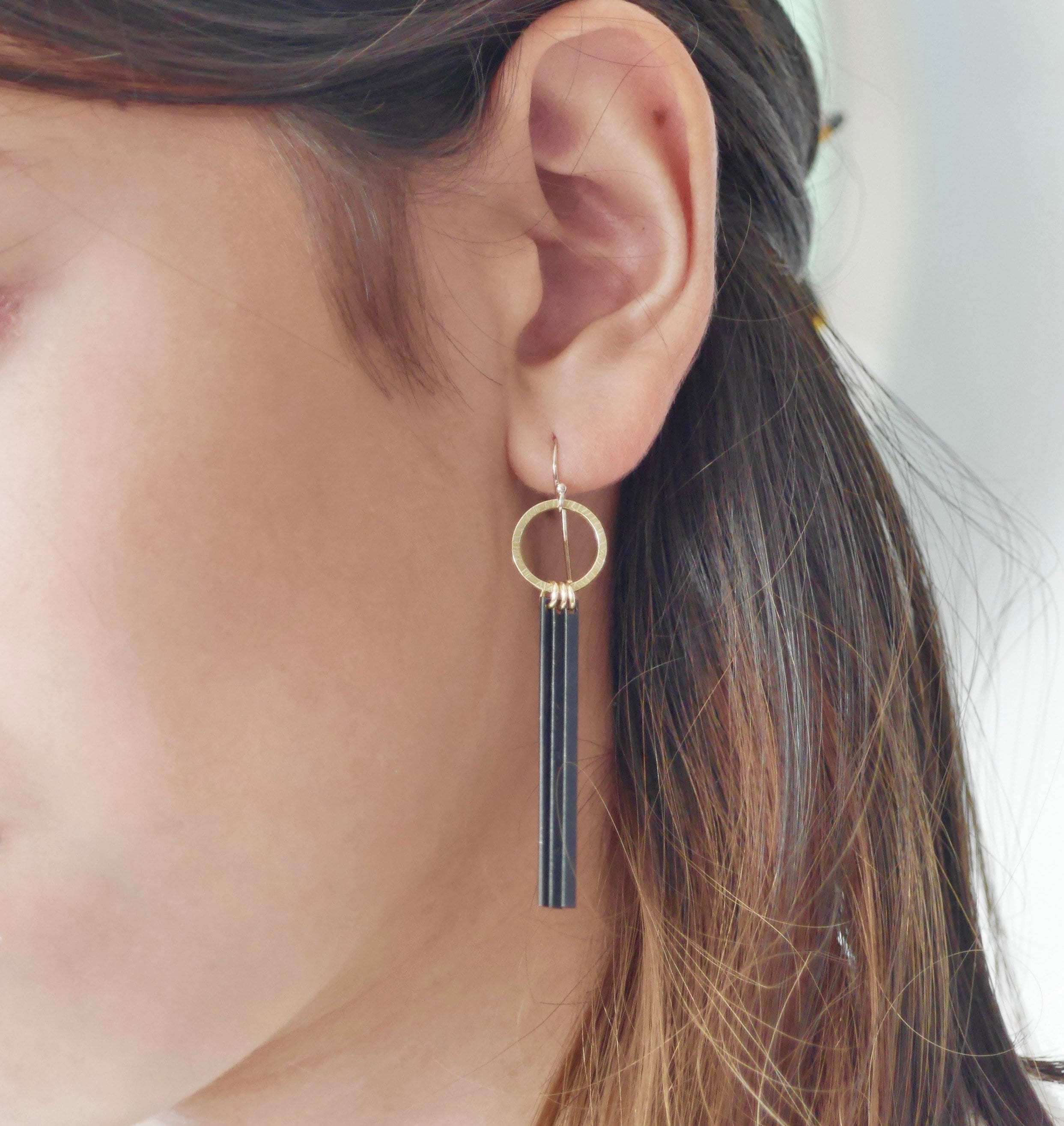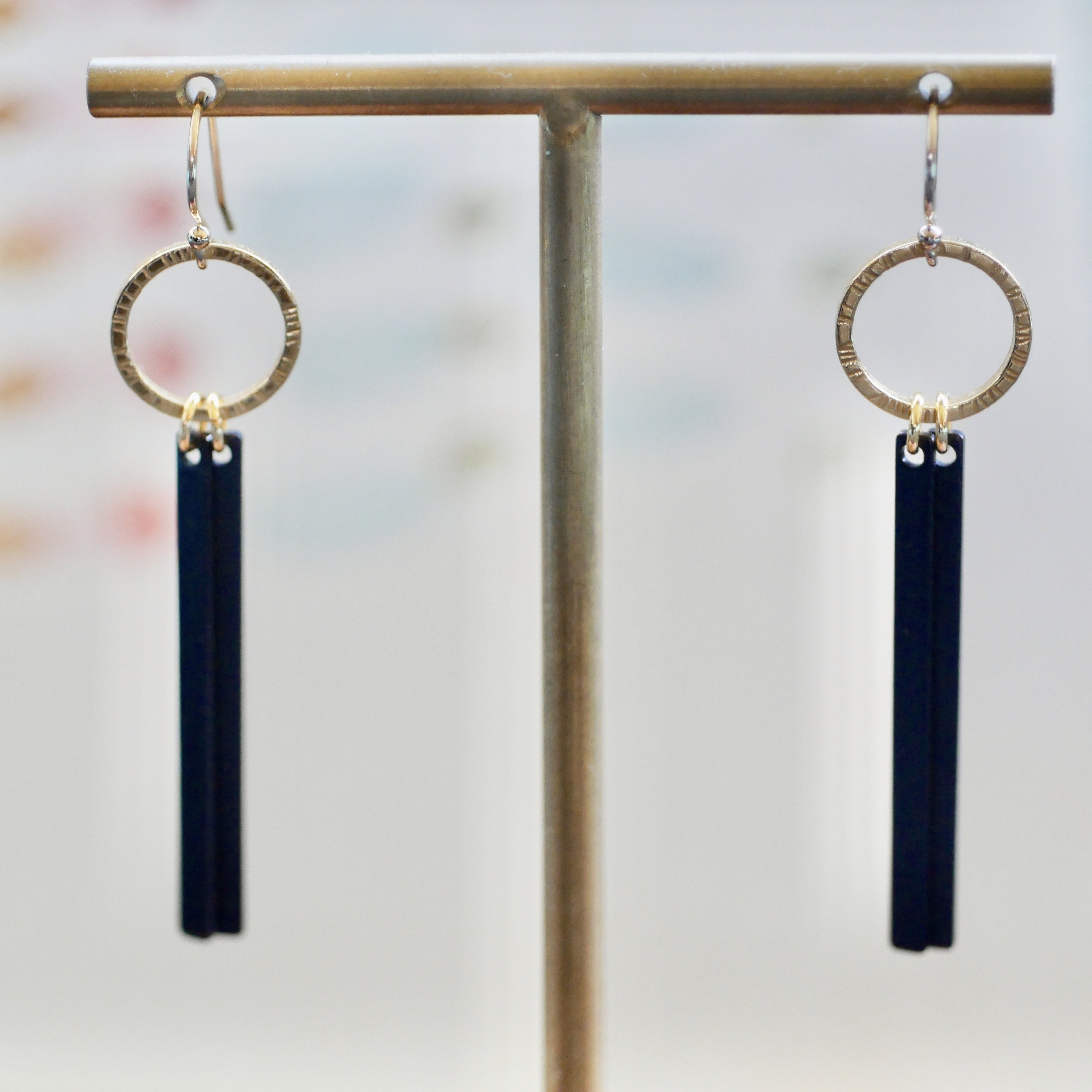 These minimalist and elegant earrings feature hand-textured circle charms paired with two oxidized brass bars in a sleek geometric design. The total length of each earring, from the ear hook to the bottom of the bars, is 7cm.
