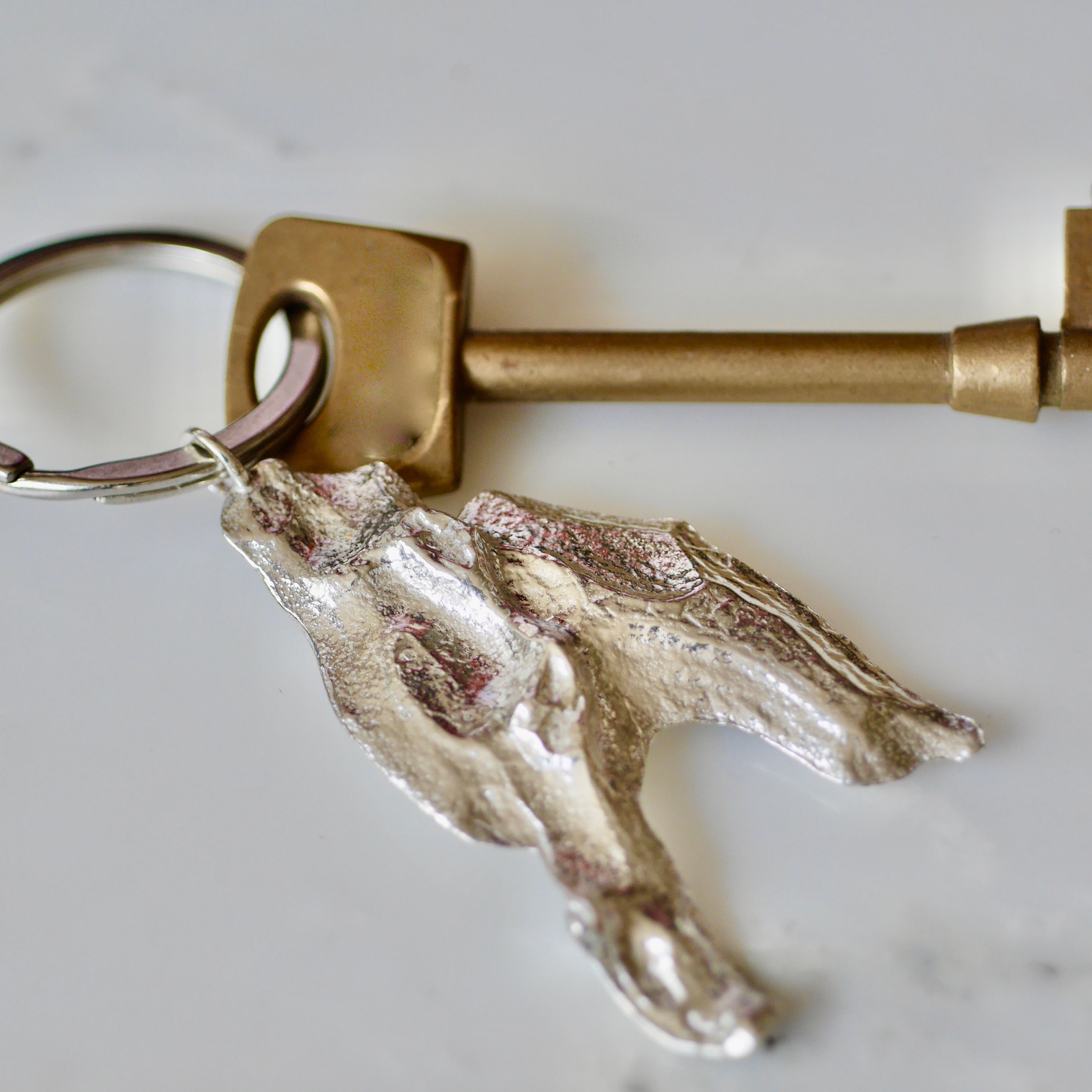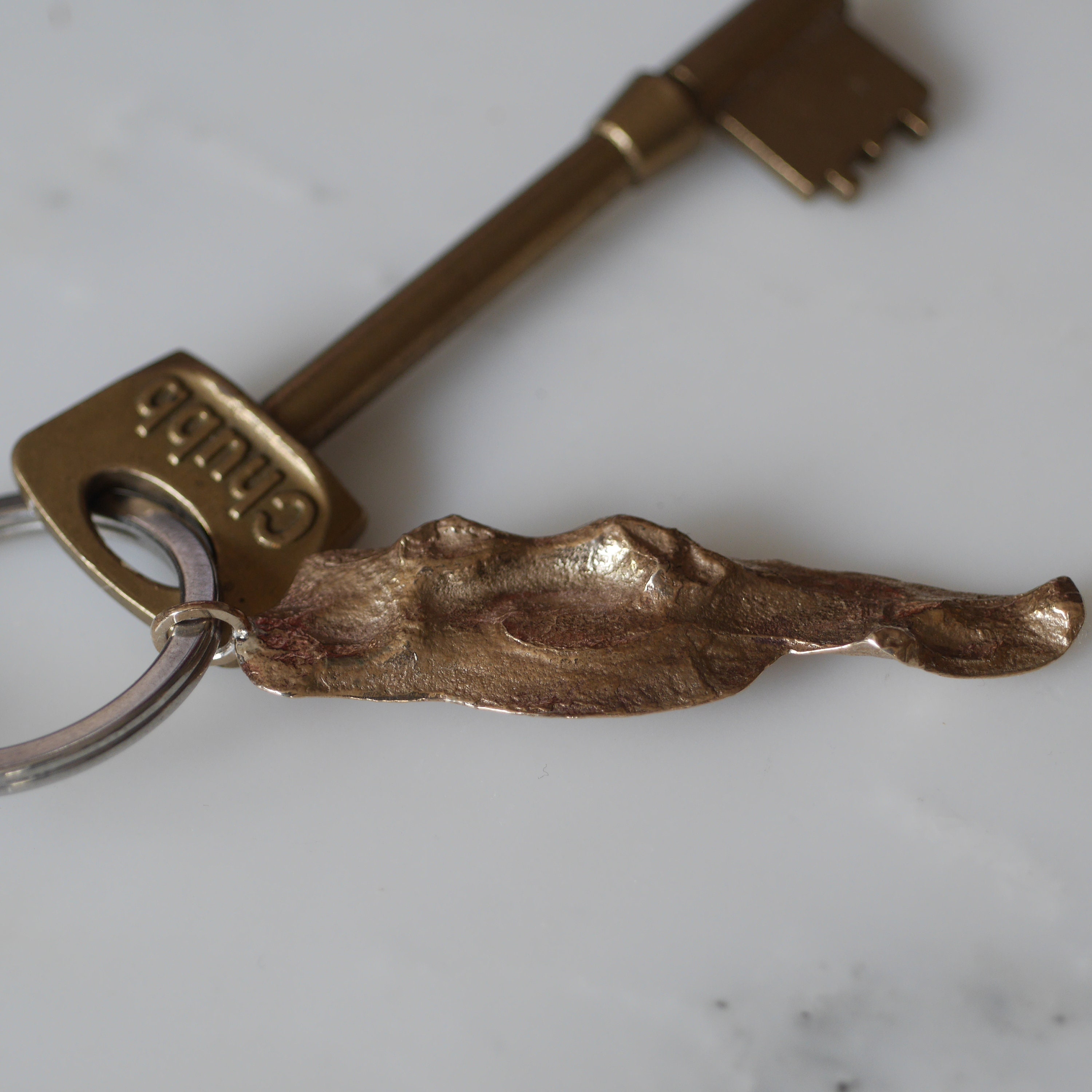 This keyring comes with a very special story. I was given a big piece of pine tree bark that was collected from C.G. Jung's house in Zurich. I wanted to carry a little essence of Jung every day with me. I sent a small piece of pine tree bark that fell off naturally to the casting company in the UK and I made it into a keyring. When it came back as a casted metal, I realised that this is a heavy charm and therefore it comes at a cost. I thought I could make 3 styles out of this piece to give more choices to my customers.