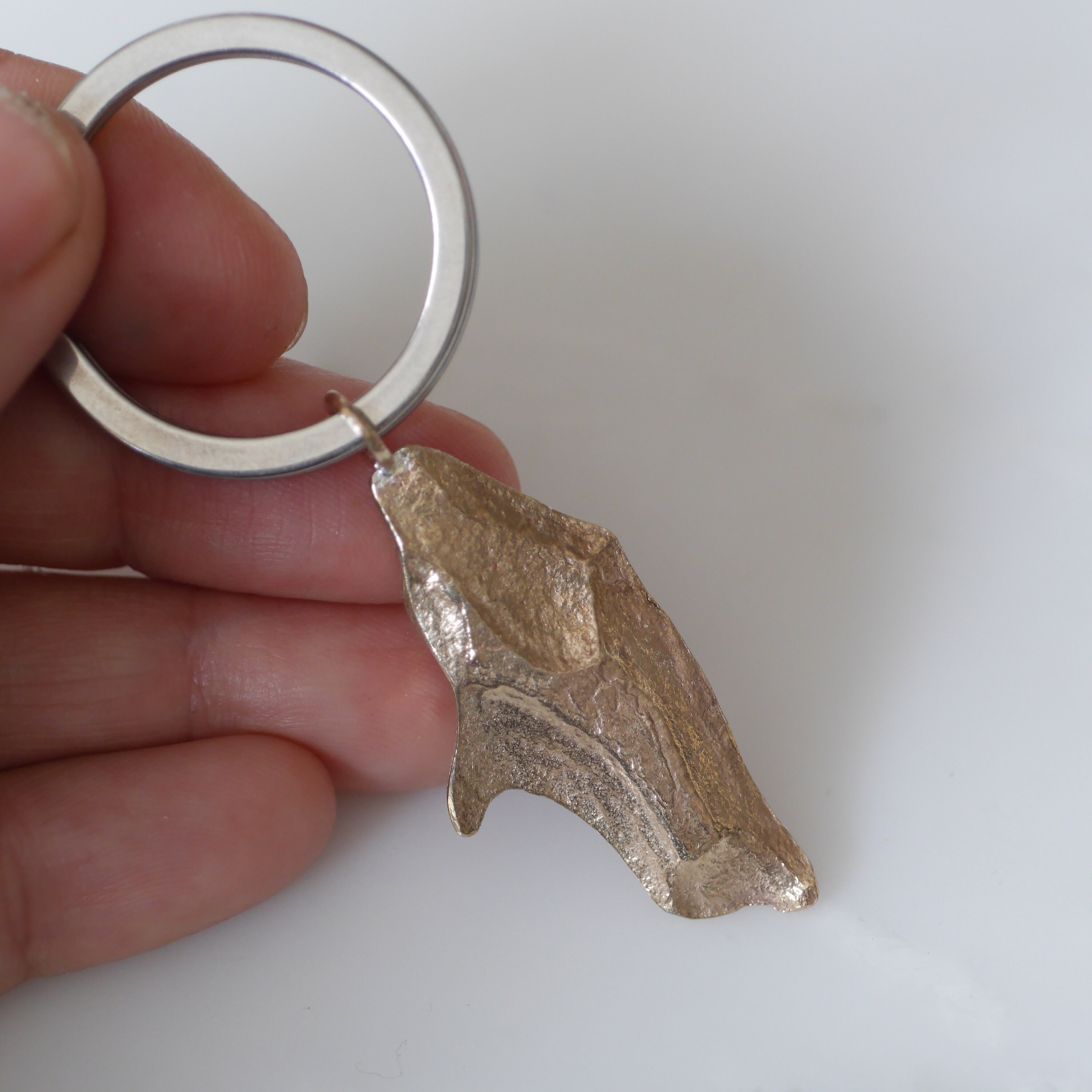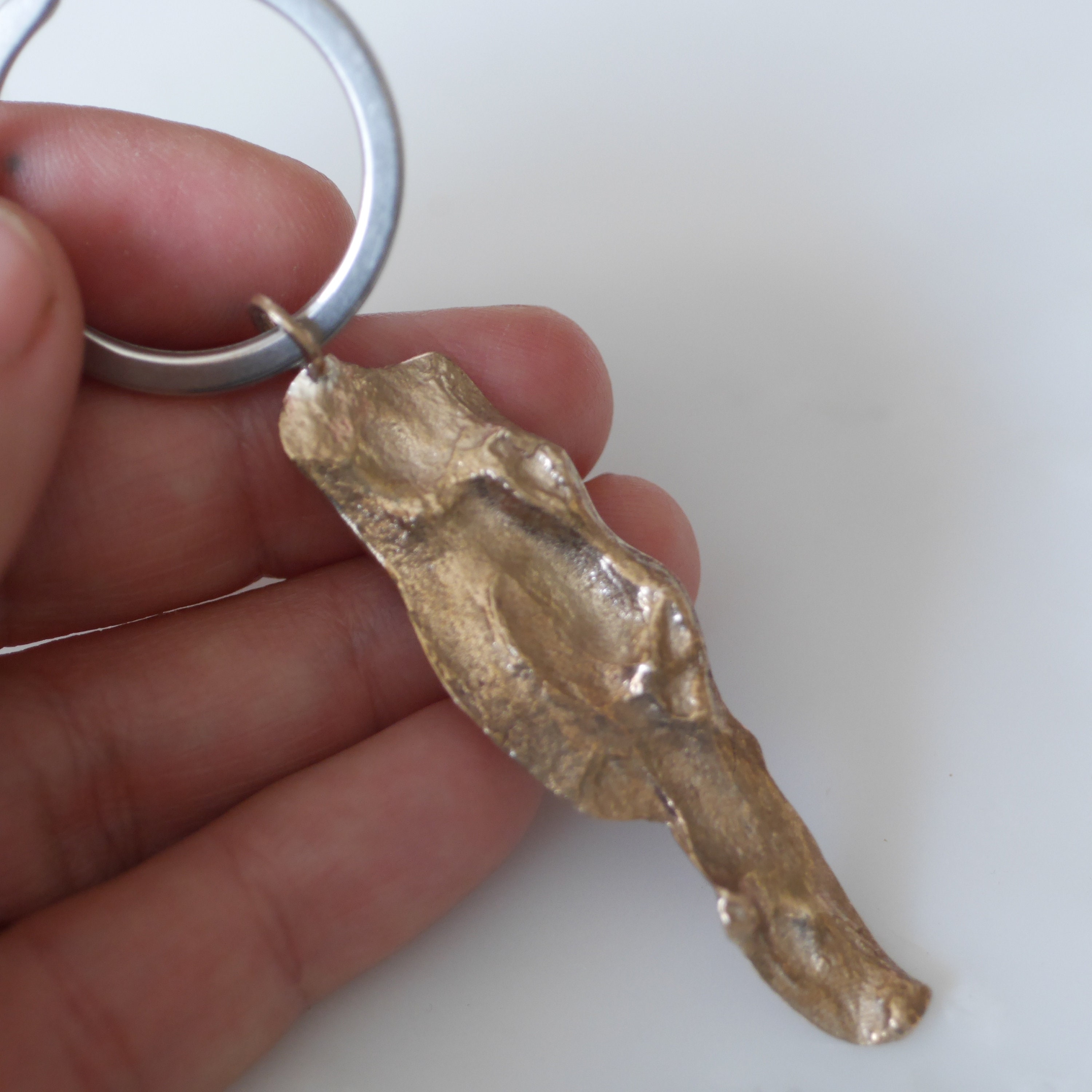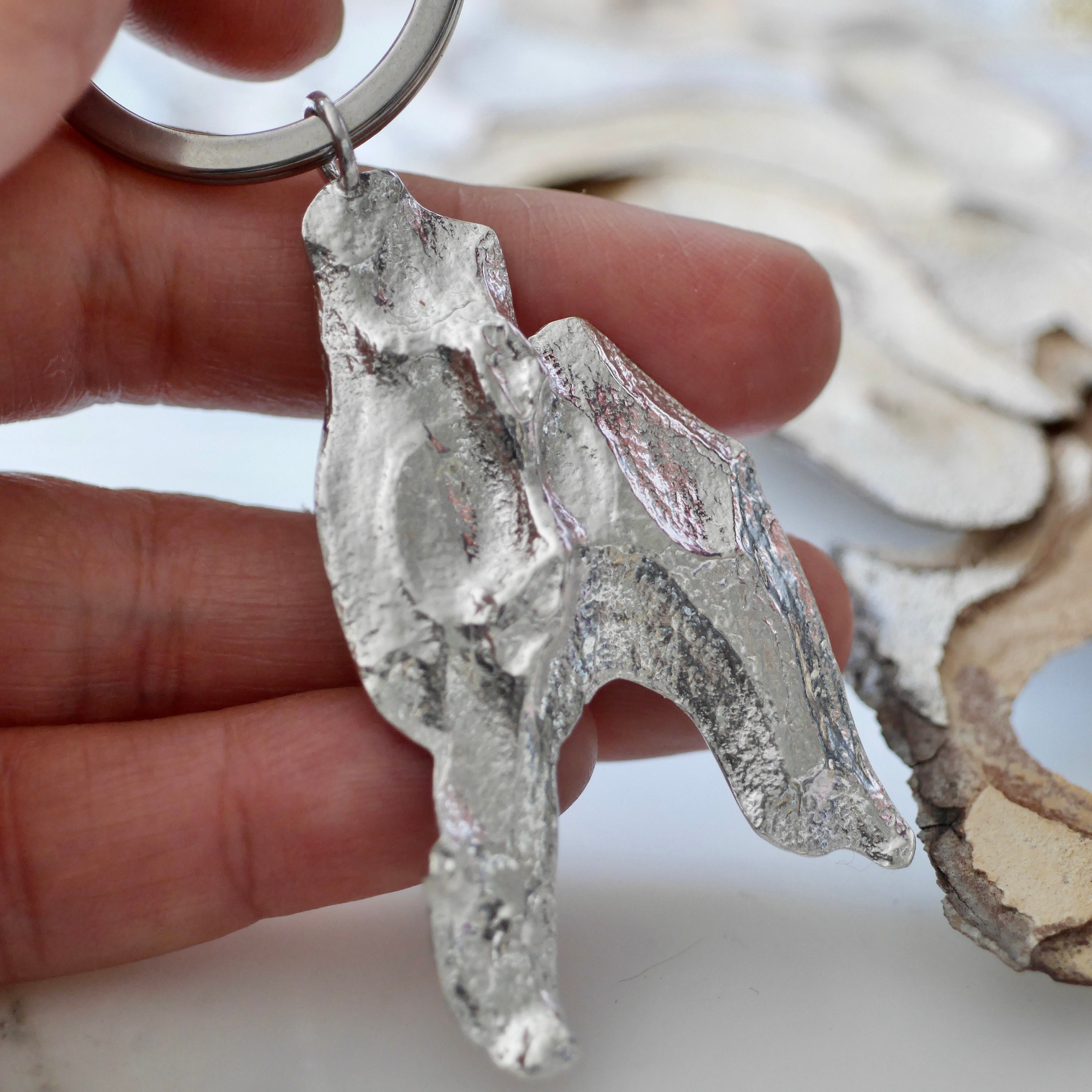Solid sterling silver or bronze finish pine tree bark keyring comes in 3 styles. A whole piece which makes me think of a man standing up, a half-large tree bark that reminds me of a female body, a nugget one that looks like a bird or a dolphin.