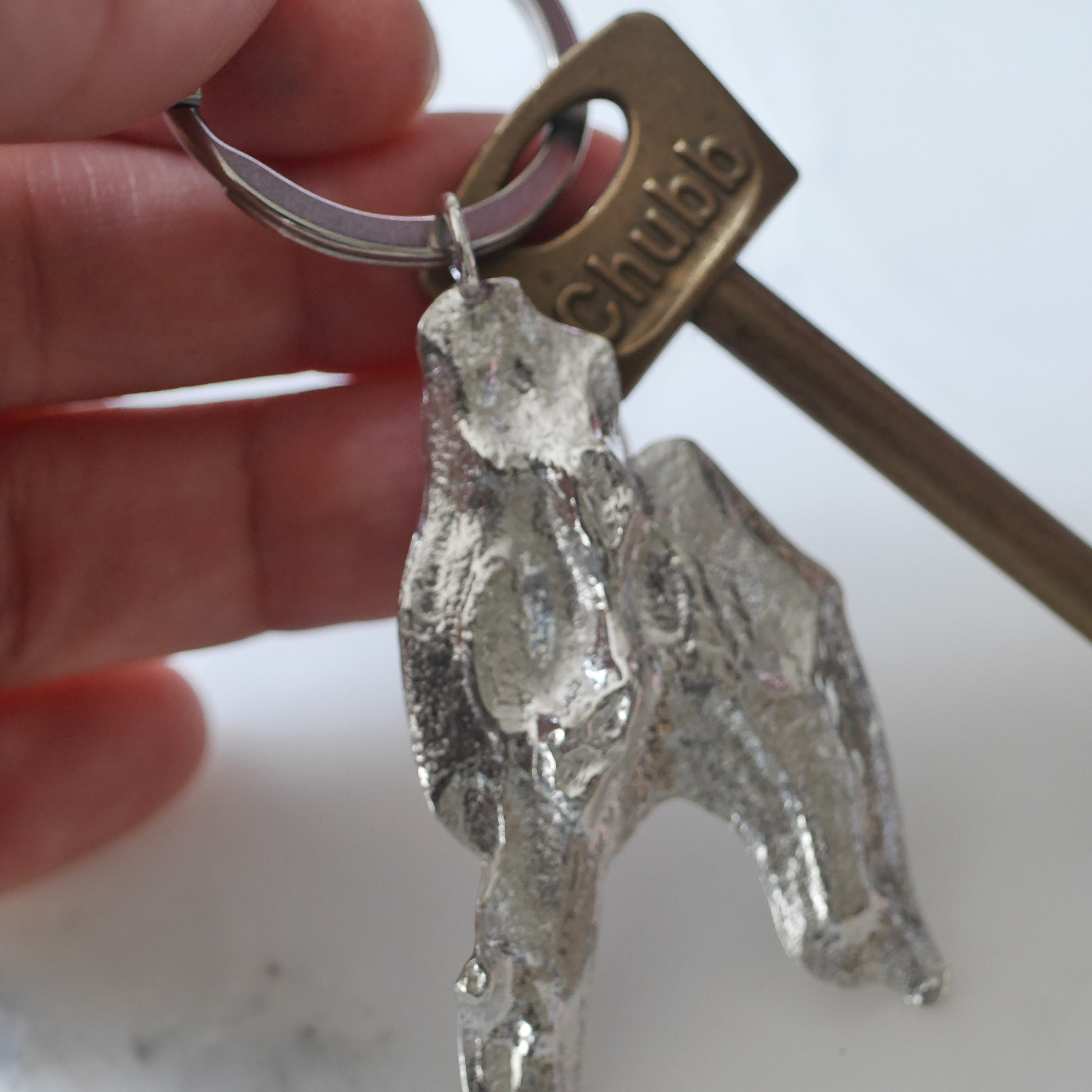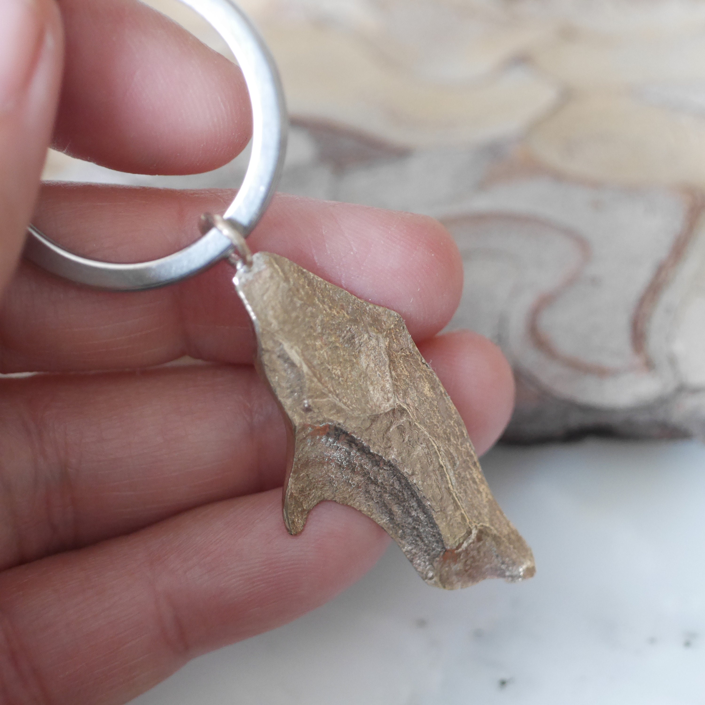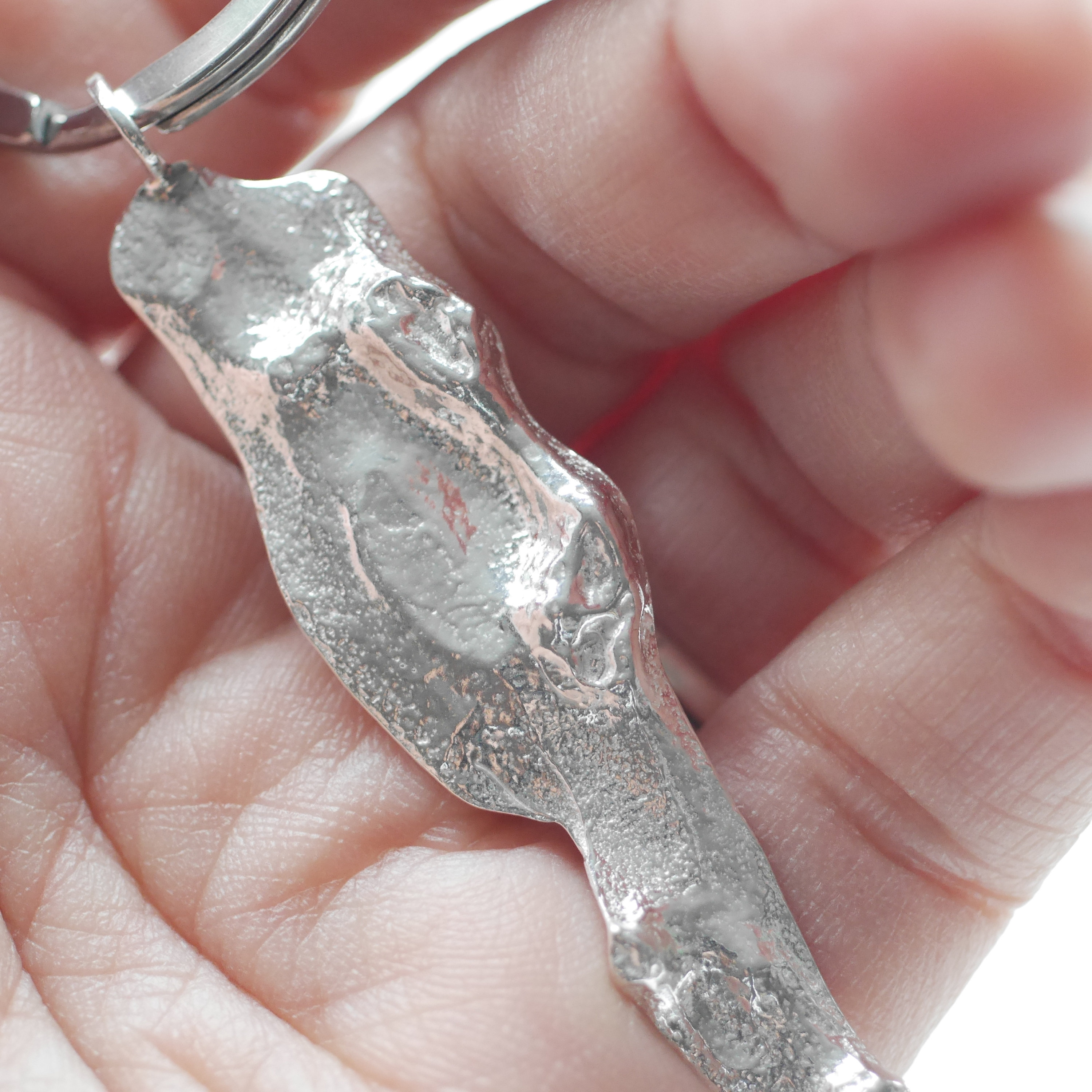 Solid sterling silver or bronze finish pine tree bark keyring comes in 3 styles. A whole piece which makes me think of a man standing up, a half-large tree bark that reminds me of a female body, a nugget one that looks like a bird or a dolphin.
