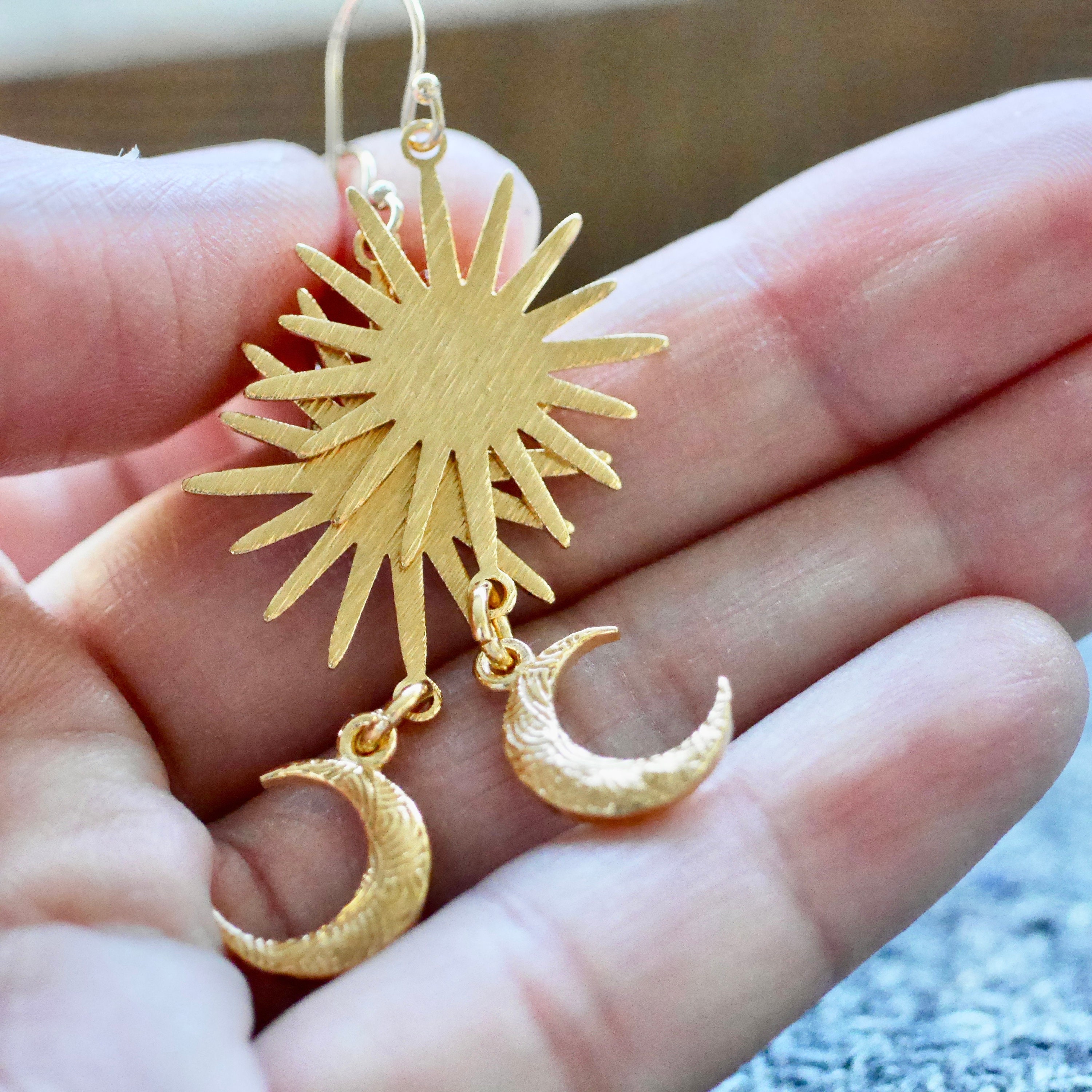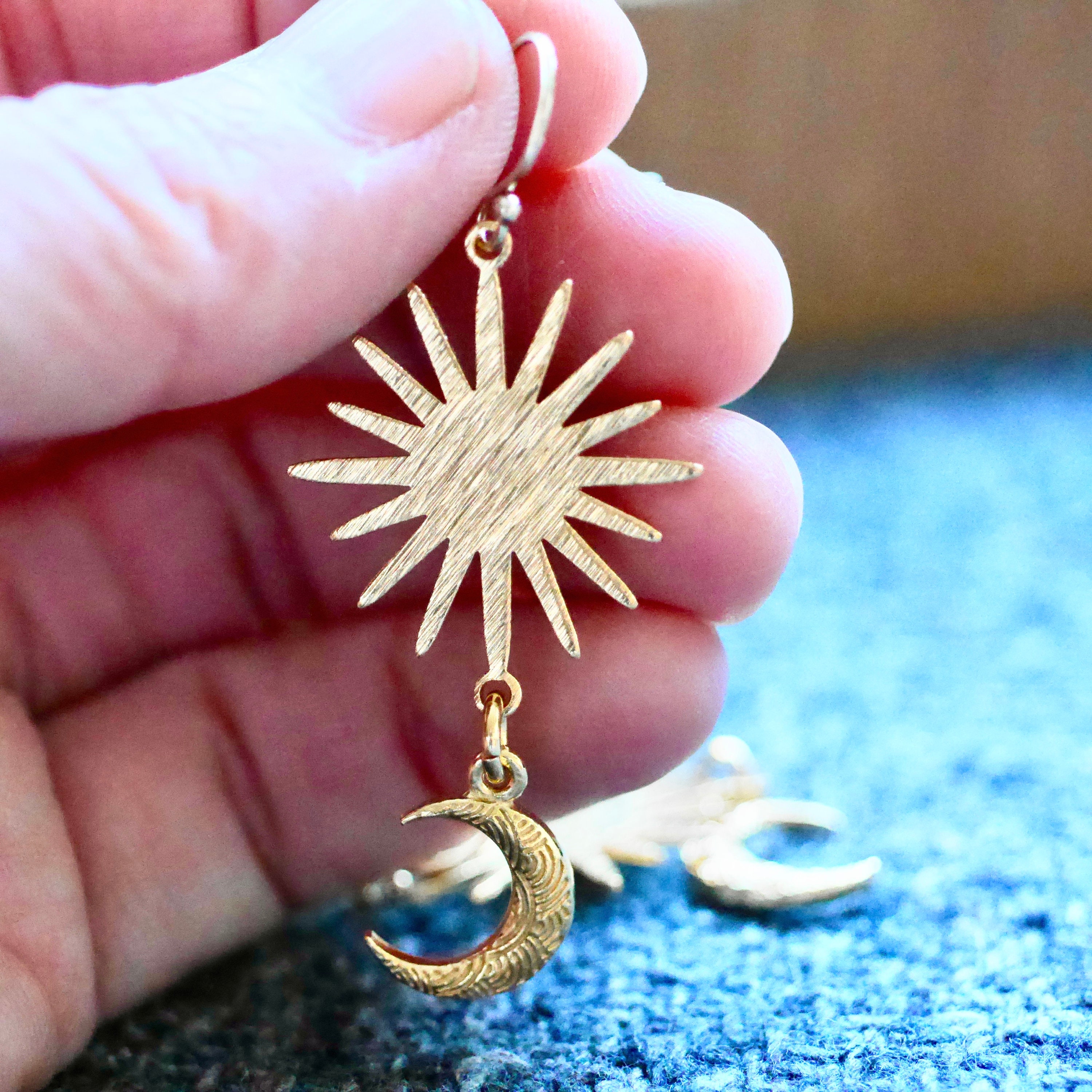 Gold Moon and Sun Celestial Drop Earrings. Jungian Psychology Earrings.