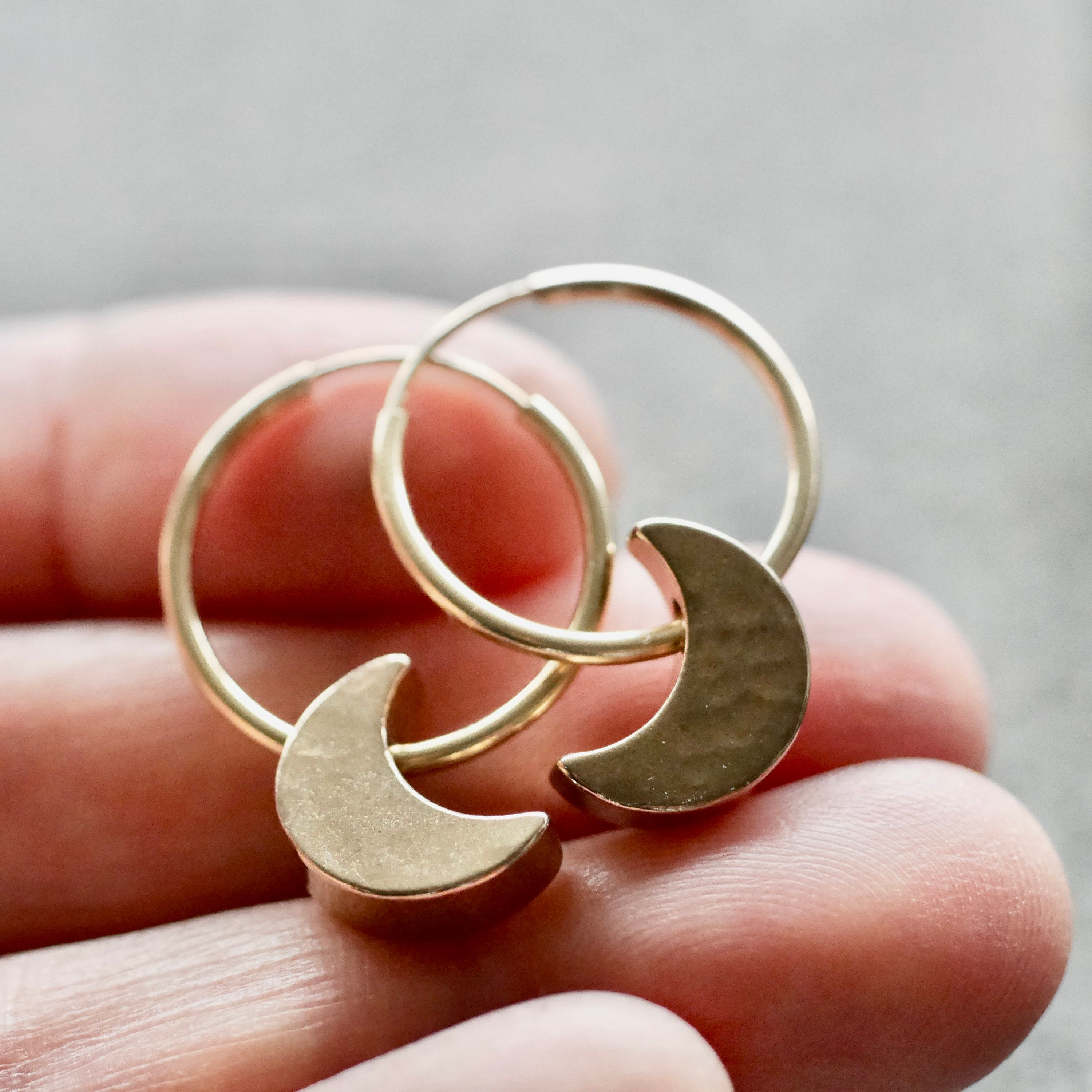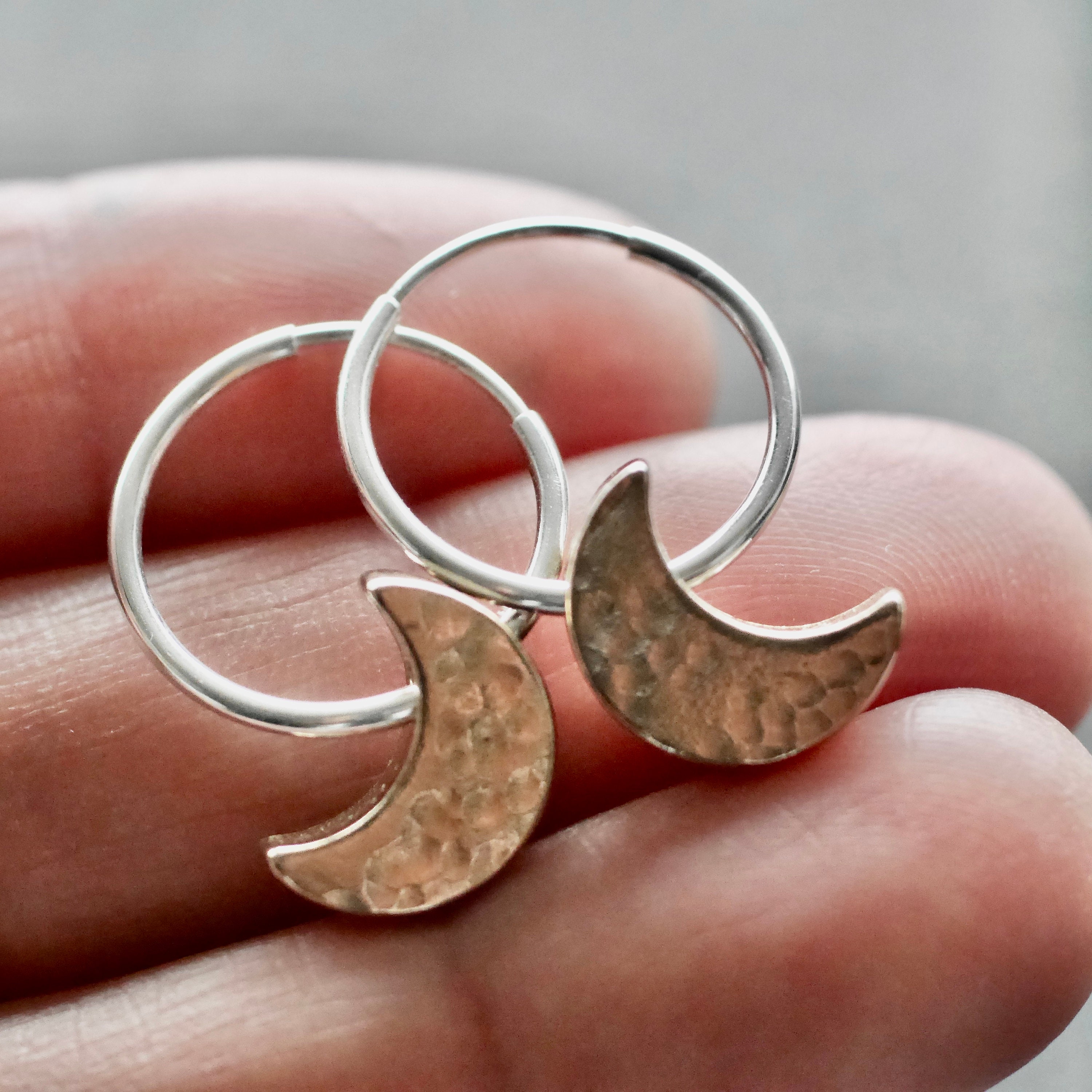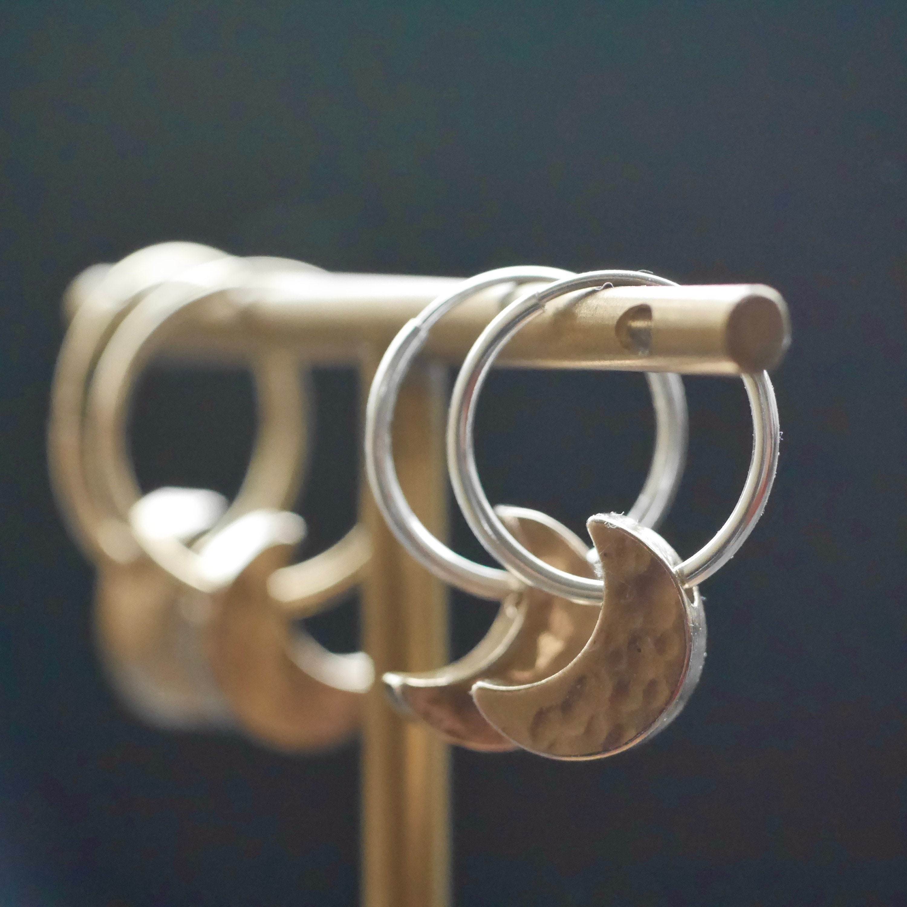 Hand Hammered Brass Crescent Moon Charm Hoop Earrings. These unisex Crescent moon charm ear hoops come in sterling silver or gold-filled finish.