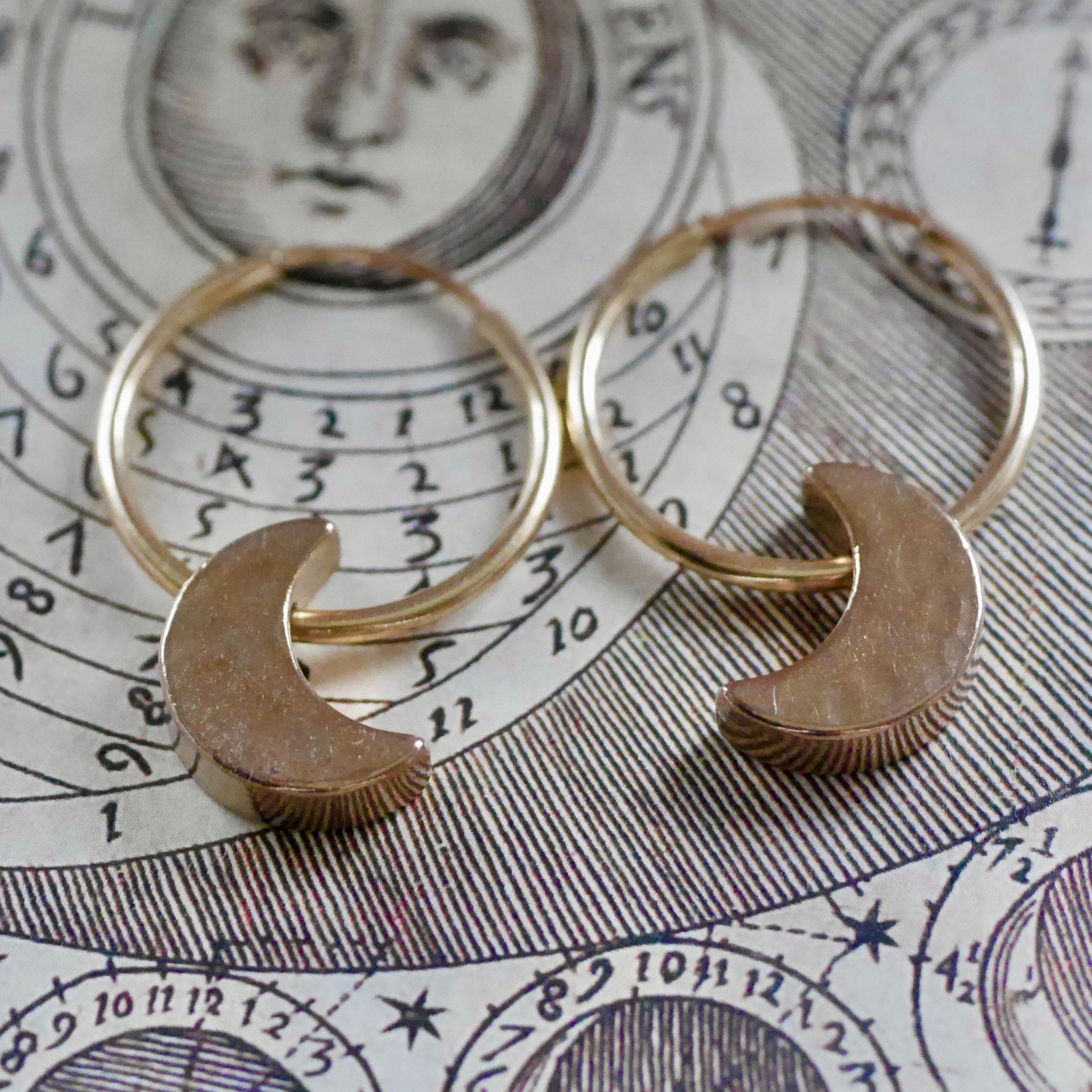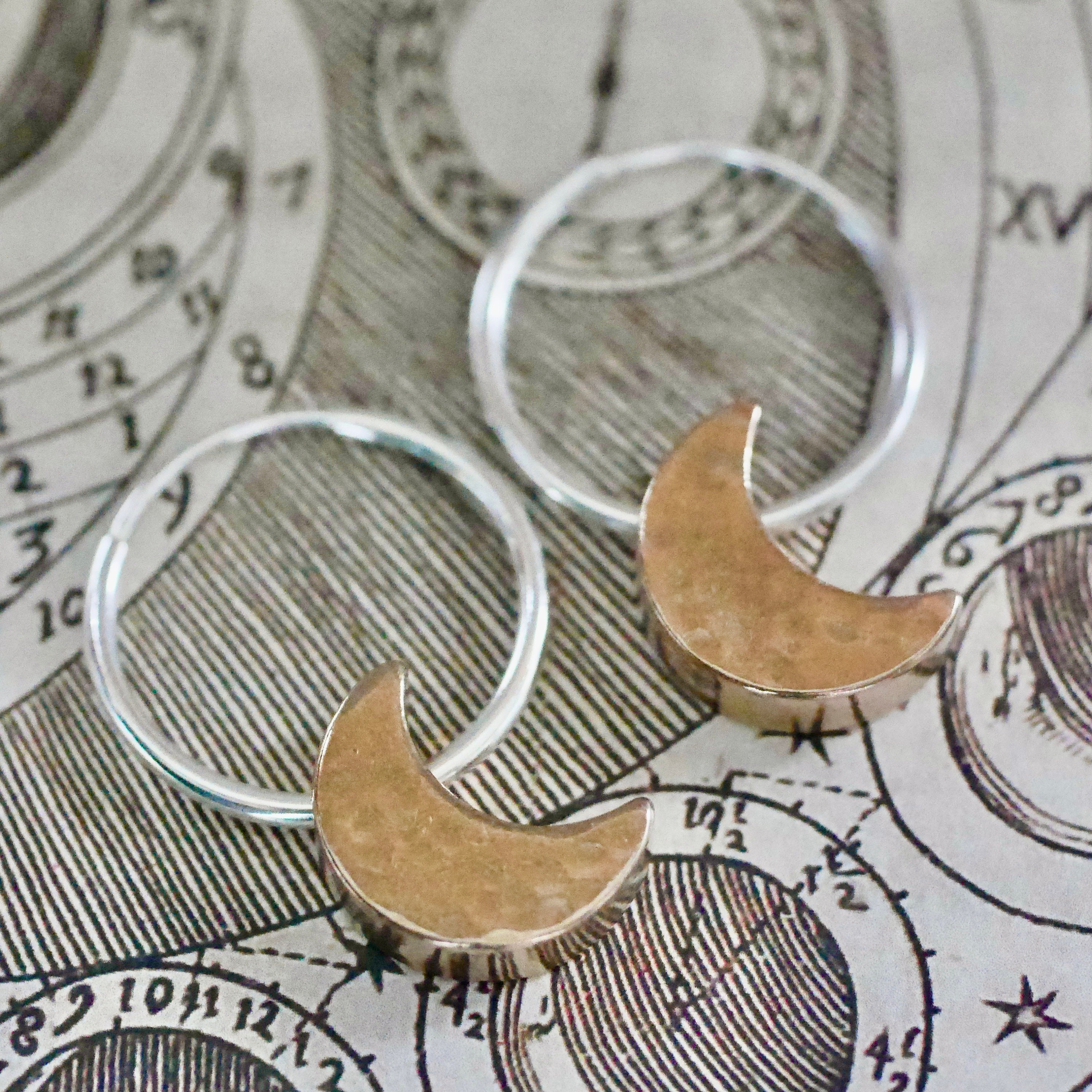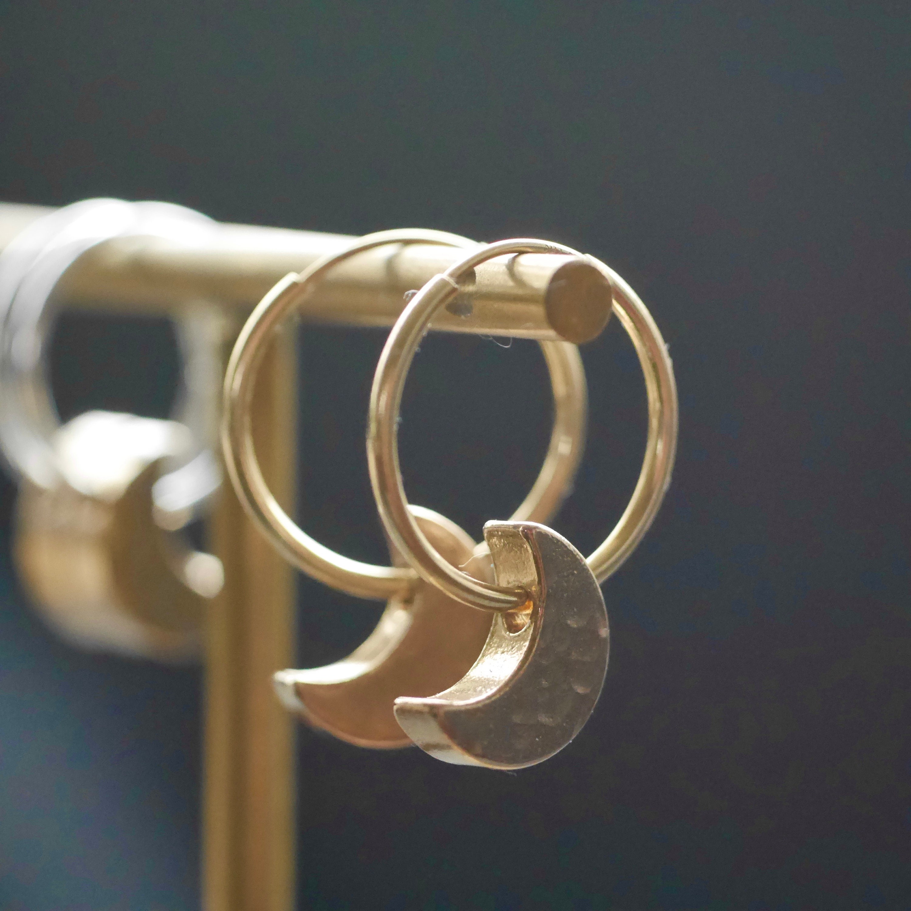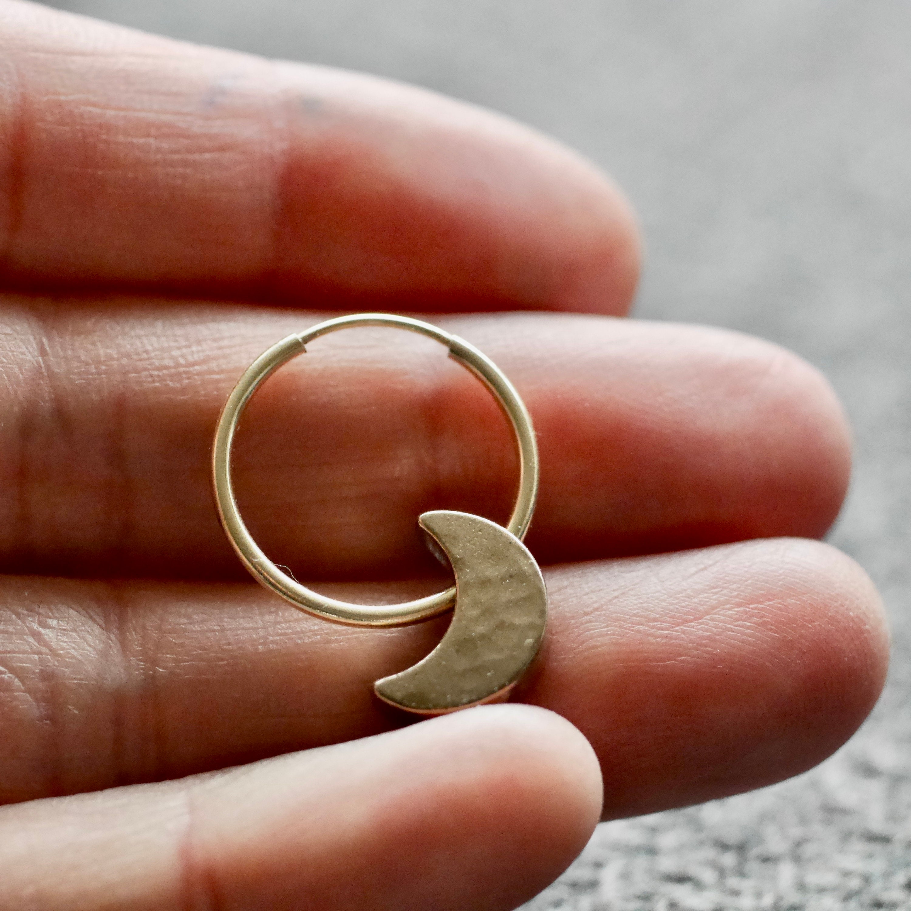 Hand Hammered Brass Crescent Moon Charm Hoop Earrings. These unisex Crescent moon charm ear hoops come in sterling silver or gold-filled finish.
