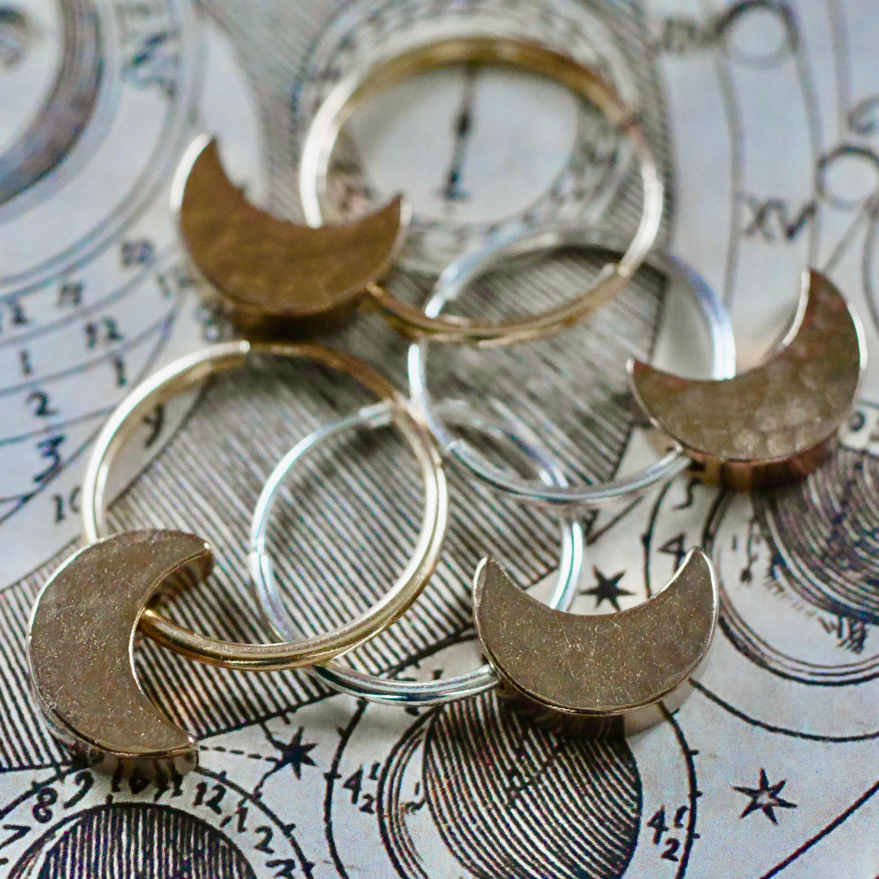 Each brass crescent is hand hammered on both the front and back sides and gives a nice effect. Minimal and beautiful statement hoop earrings for any occasion when you want to tune in your feminine energy. The crescent symbol is used as the moon in astrology and also is a representation of silver in alchemy. We also associate the Moon with femininity as opposed to the Sun with masculinity.