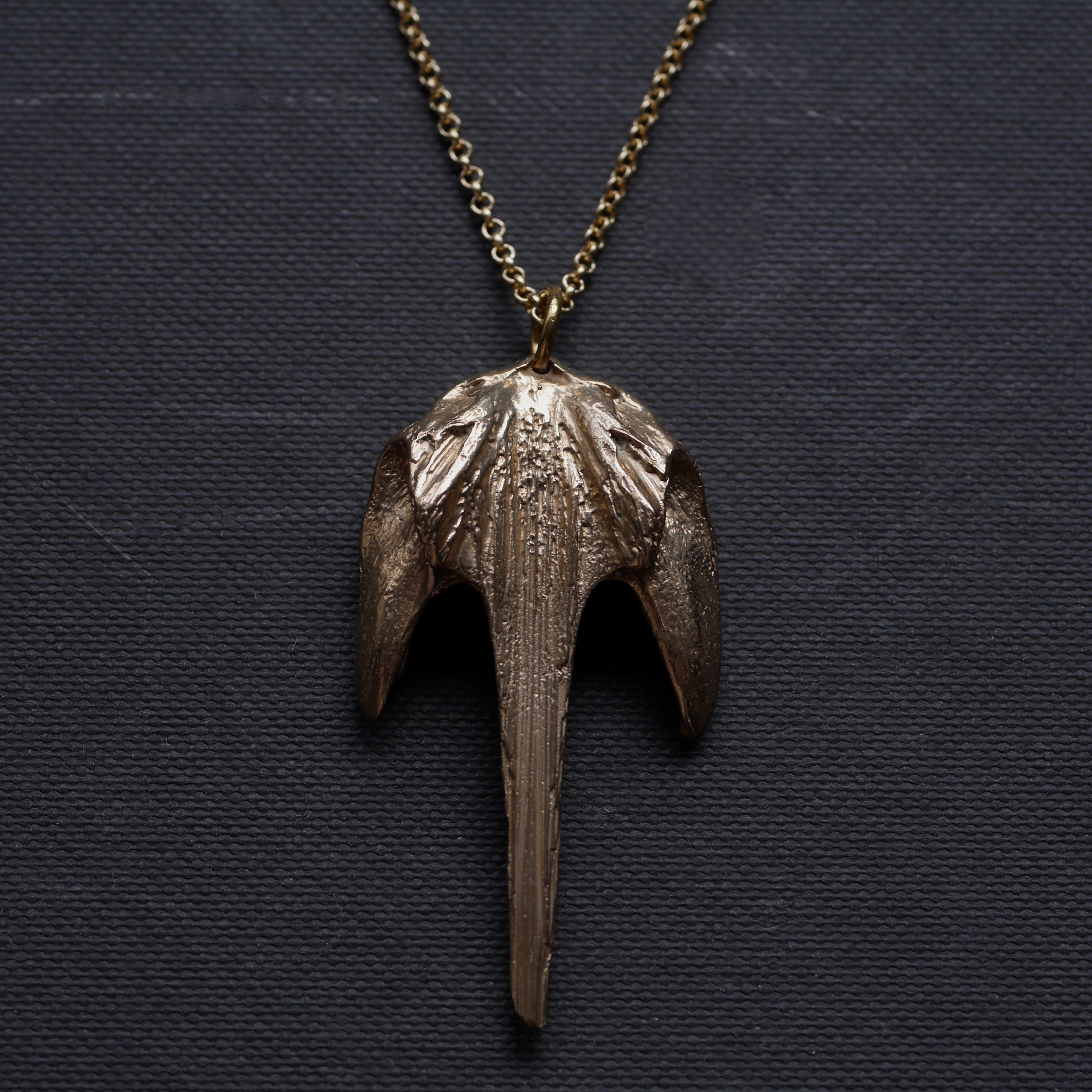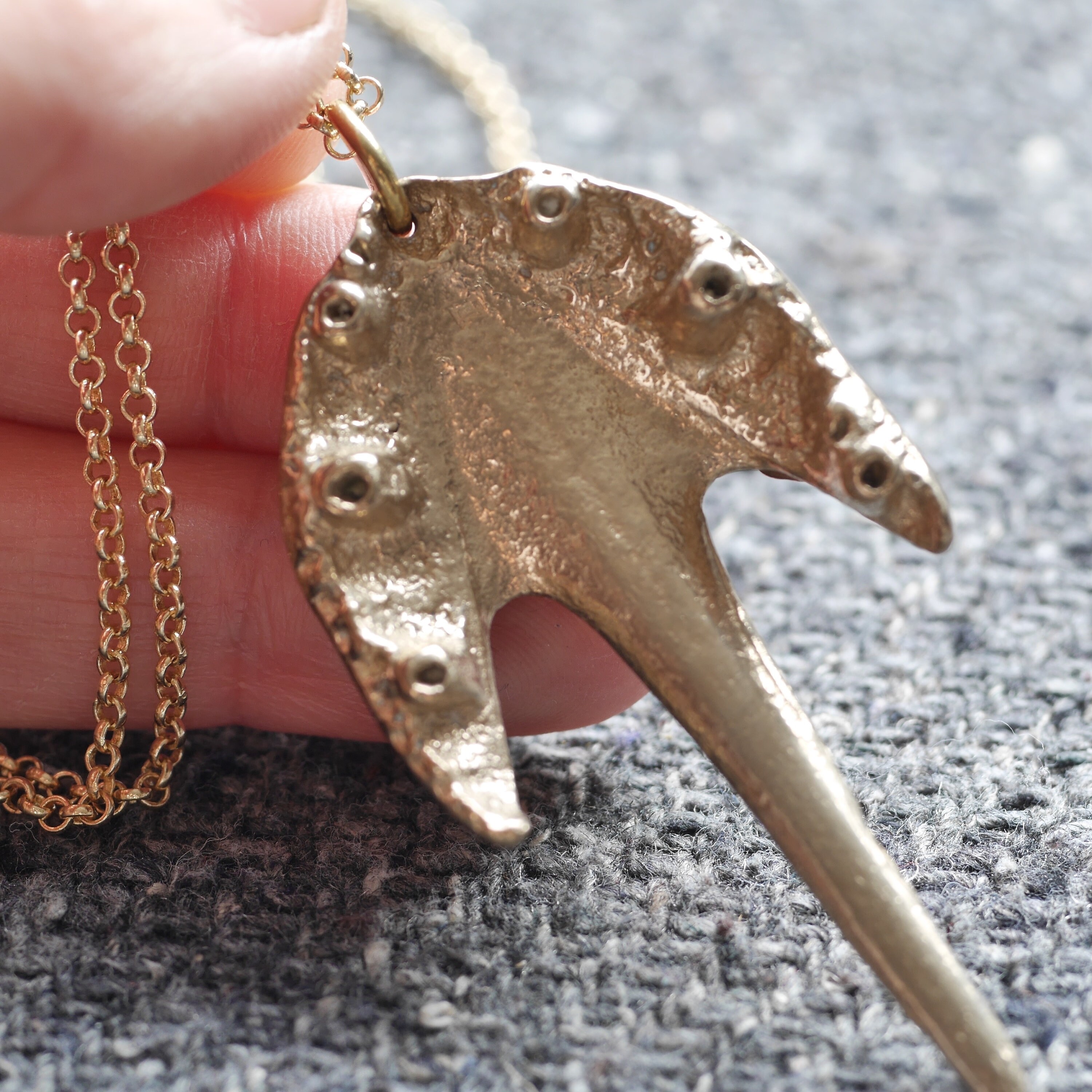 I stumbled upon this fishbone washed out on the beach, drawn in by its intriguing shape. Inspired by its unique form, I decided to transform it into a piece of jewellery. While I suspect it may be the skeleton of a horseshoe crab, I've never been able to confirm its true identity. However, there's a certain allure in leaving the mystery unresolved, and perhaps one day I'll uncover the answer.