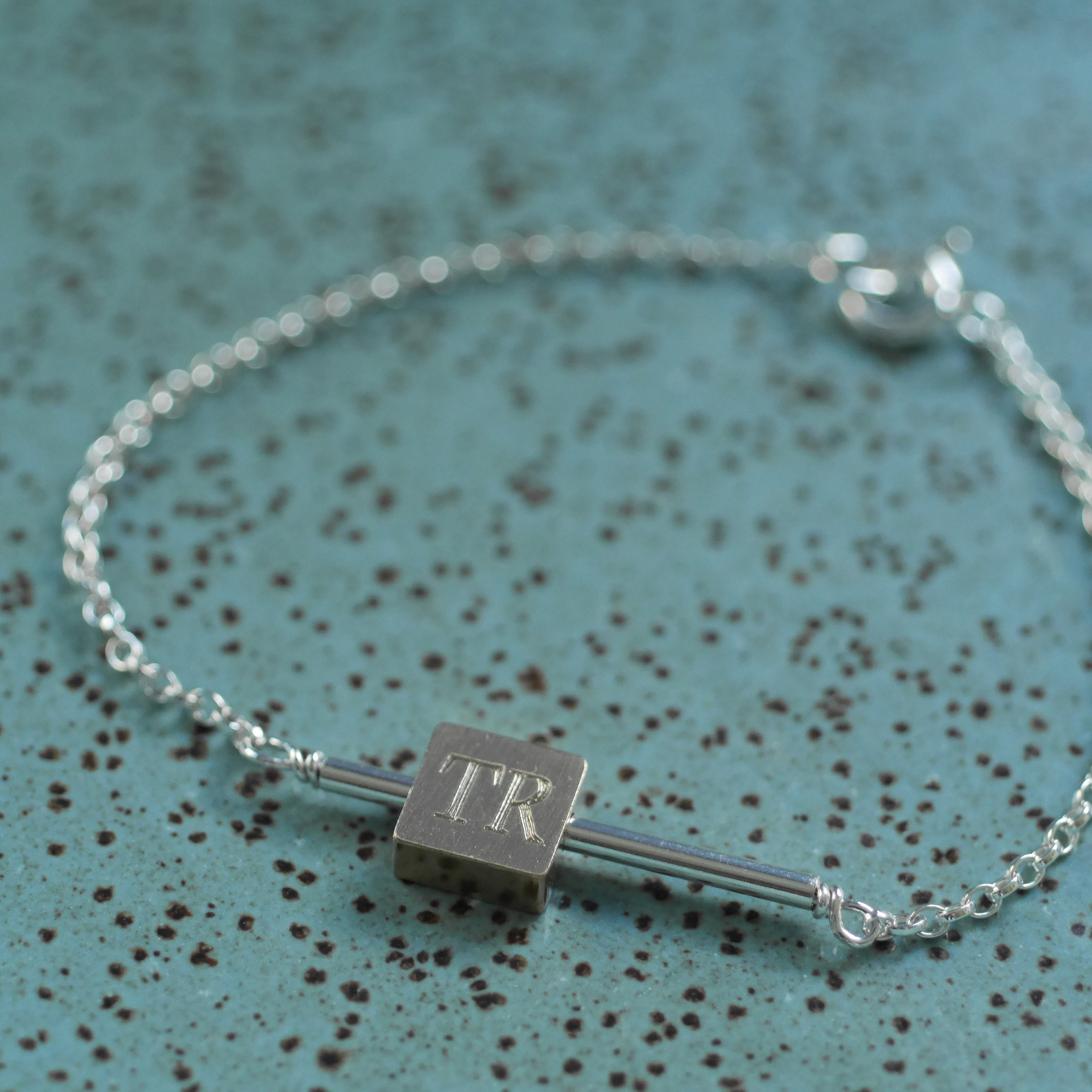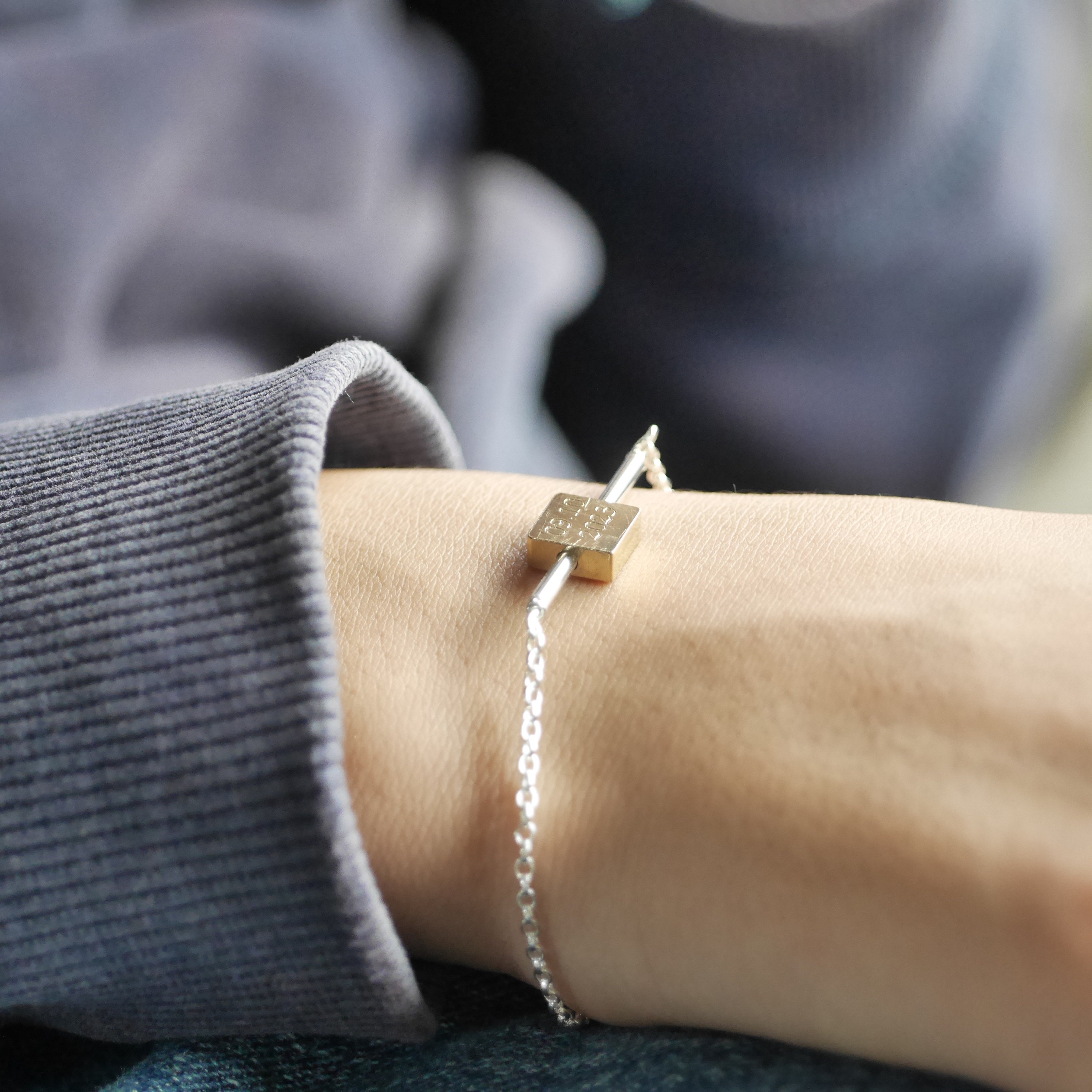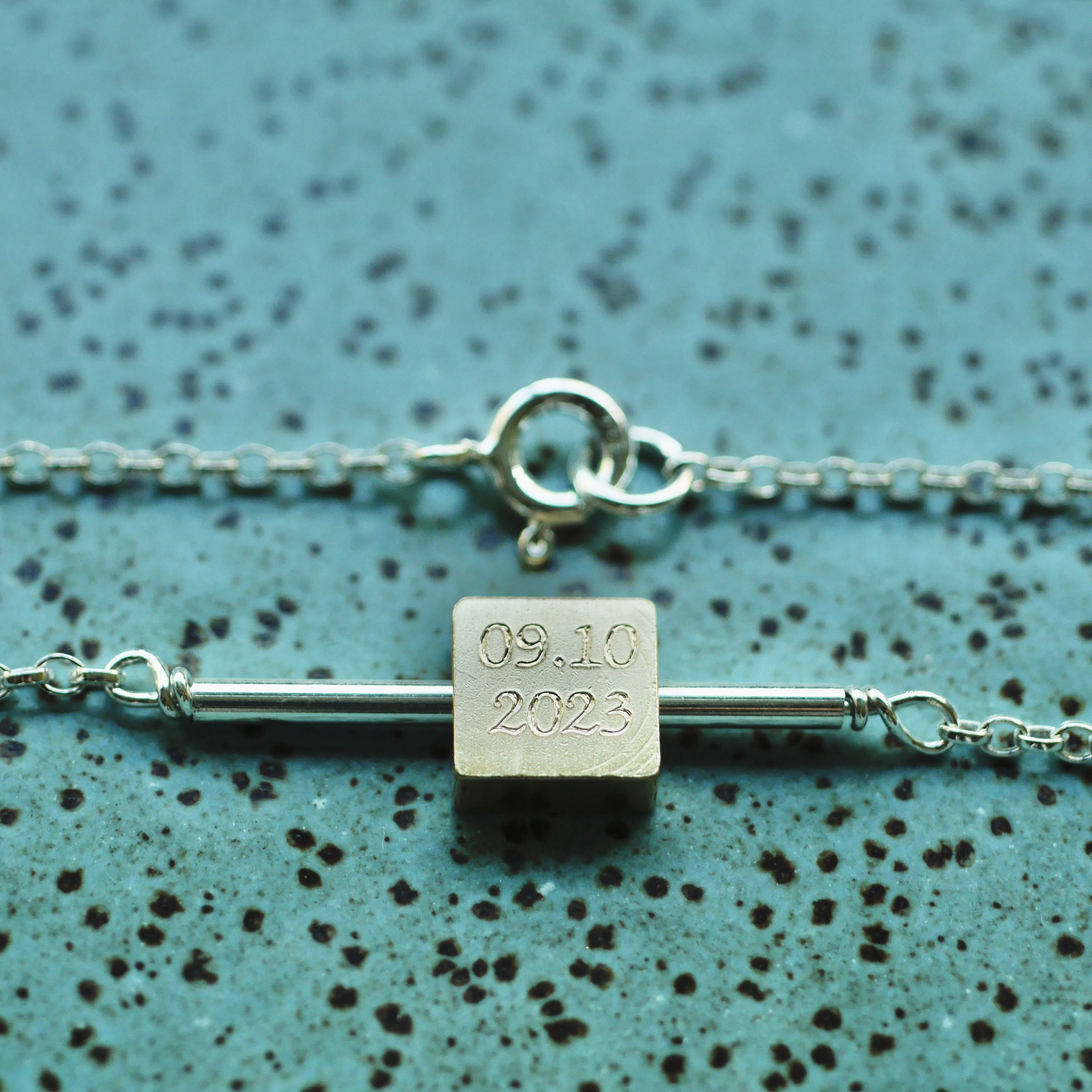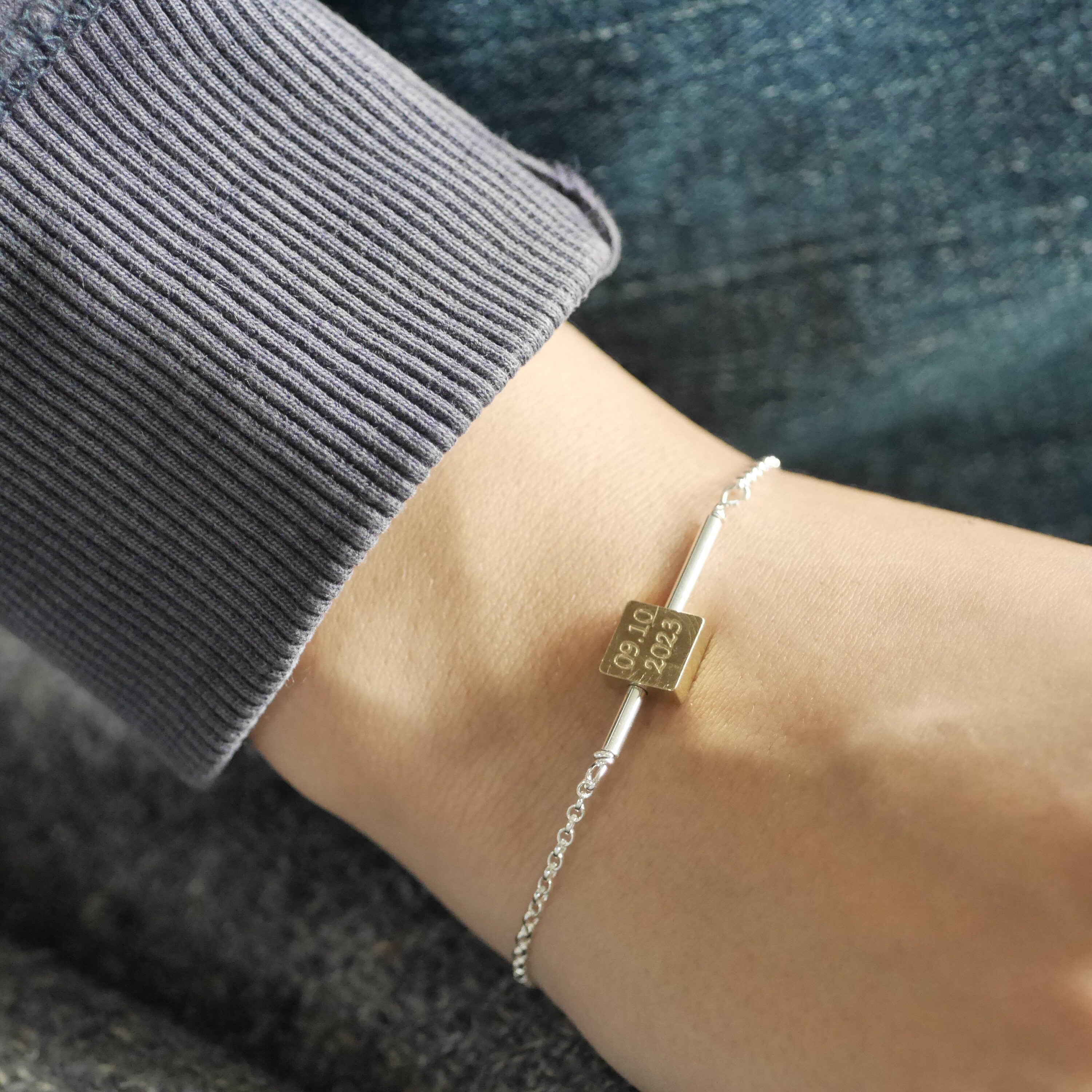 This unique unisex mixed metal bracelet comes with a personalisation option. I can engrave both sides of the brass cube charm to make it even more special. The brass cube charm slides on the sterling silver bar and you can wear the bracelet as a fidget bracelet to help soothe your anxiety.