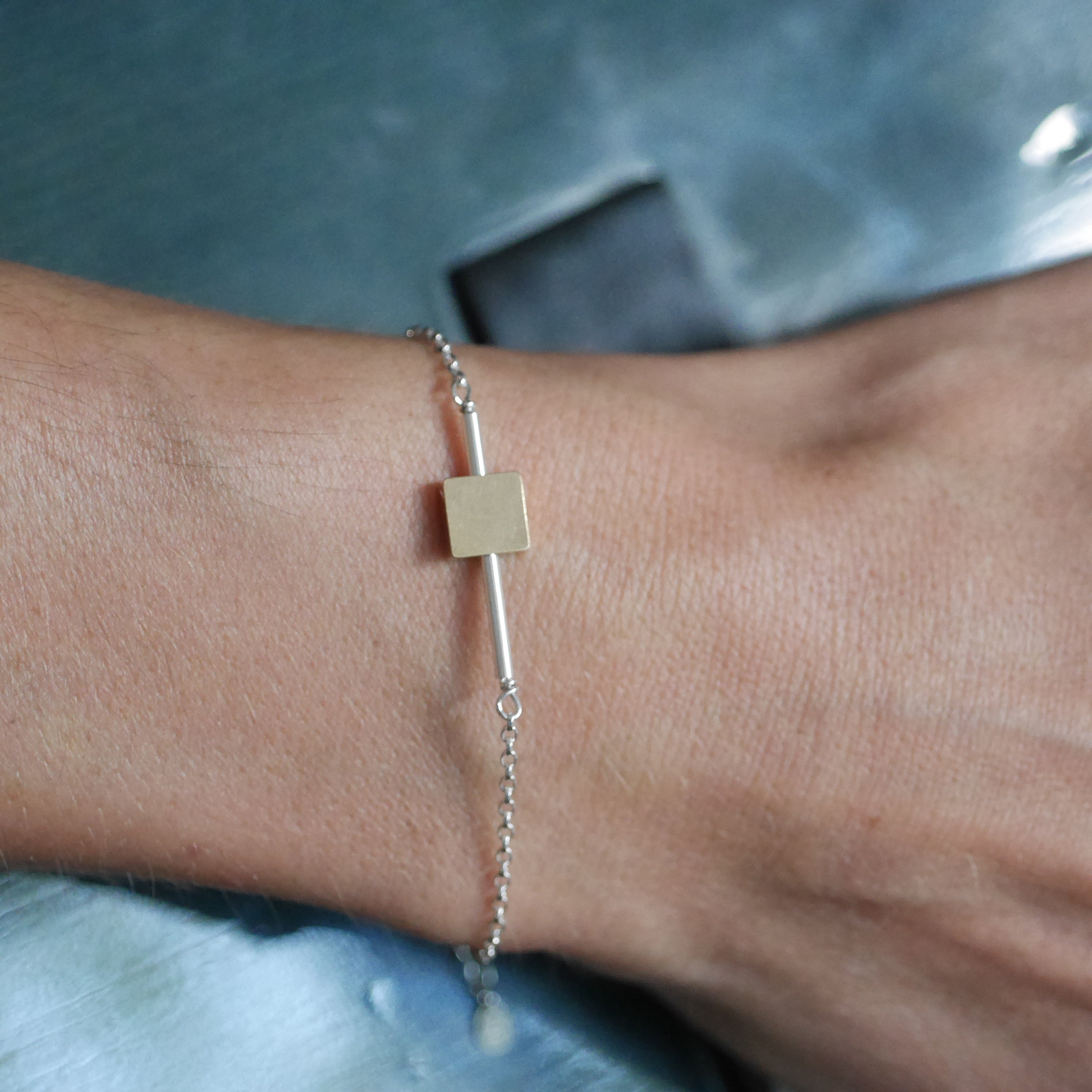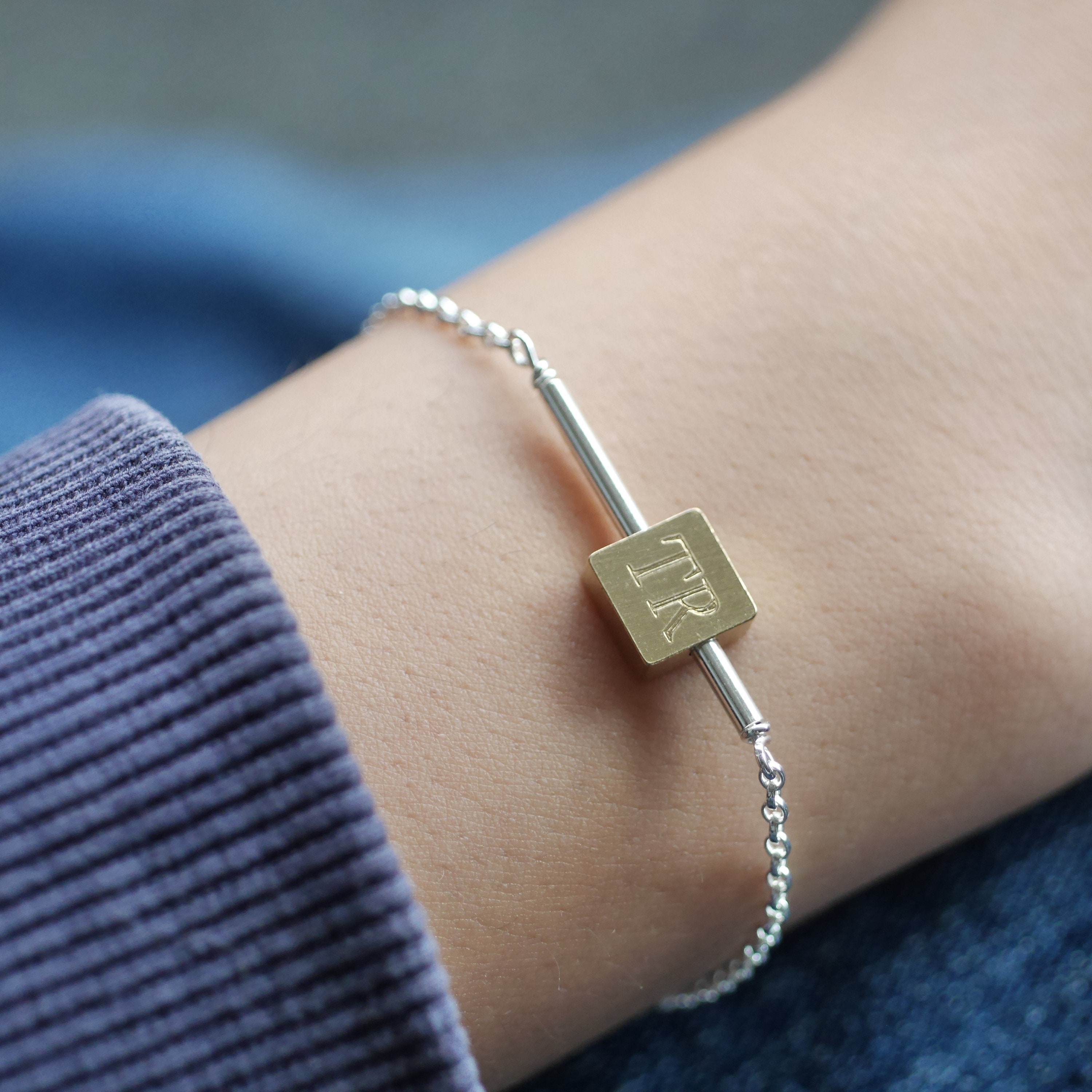 Personalised brass cube and sterling silver bar geometric fidget bracelet for any gender.