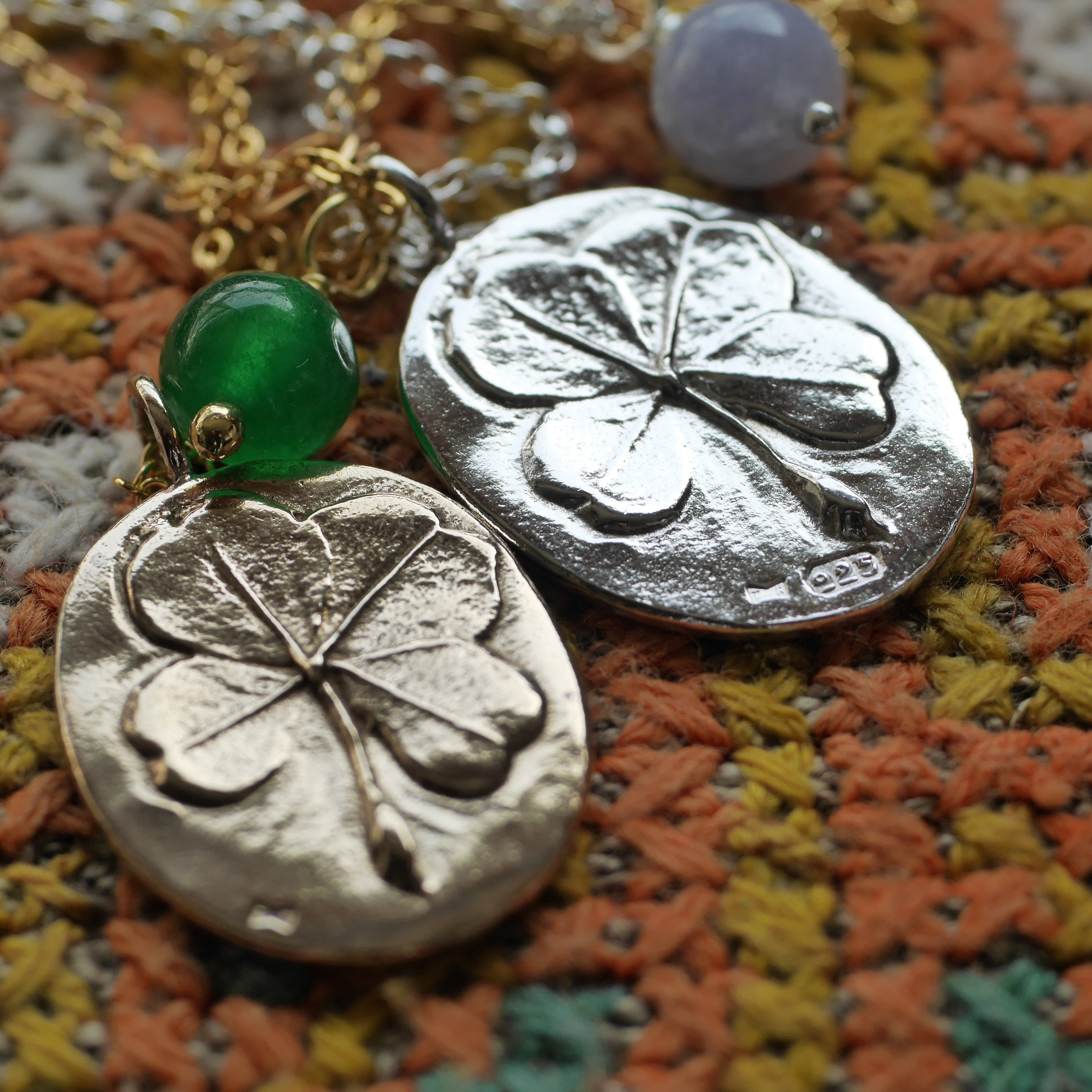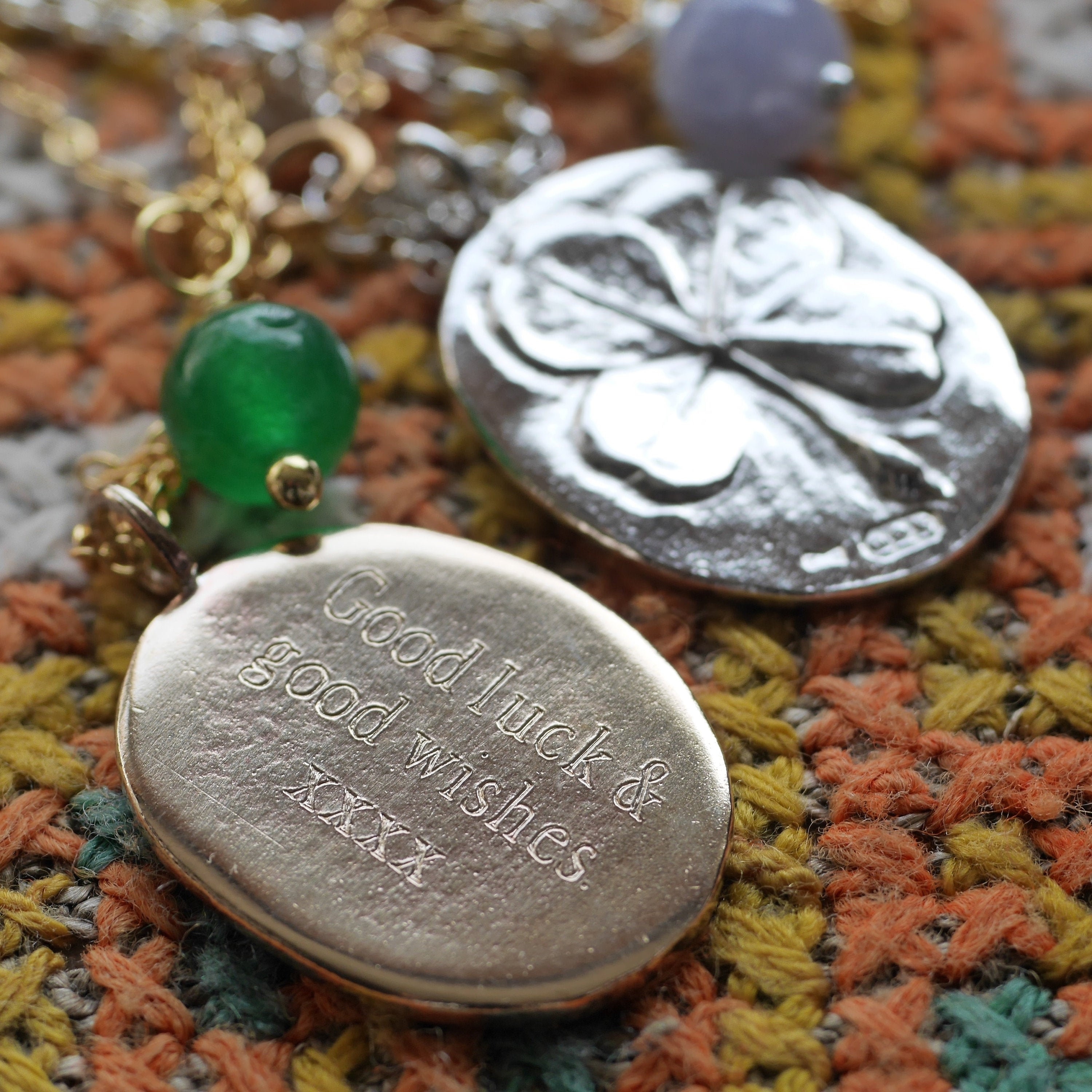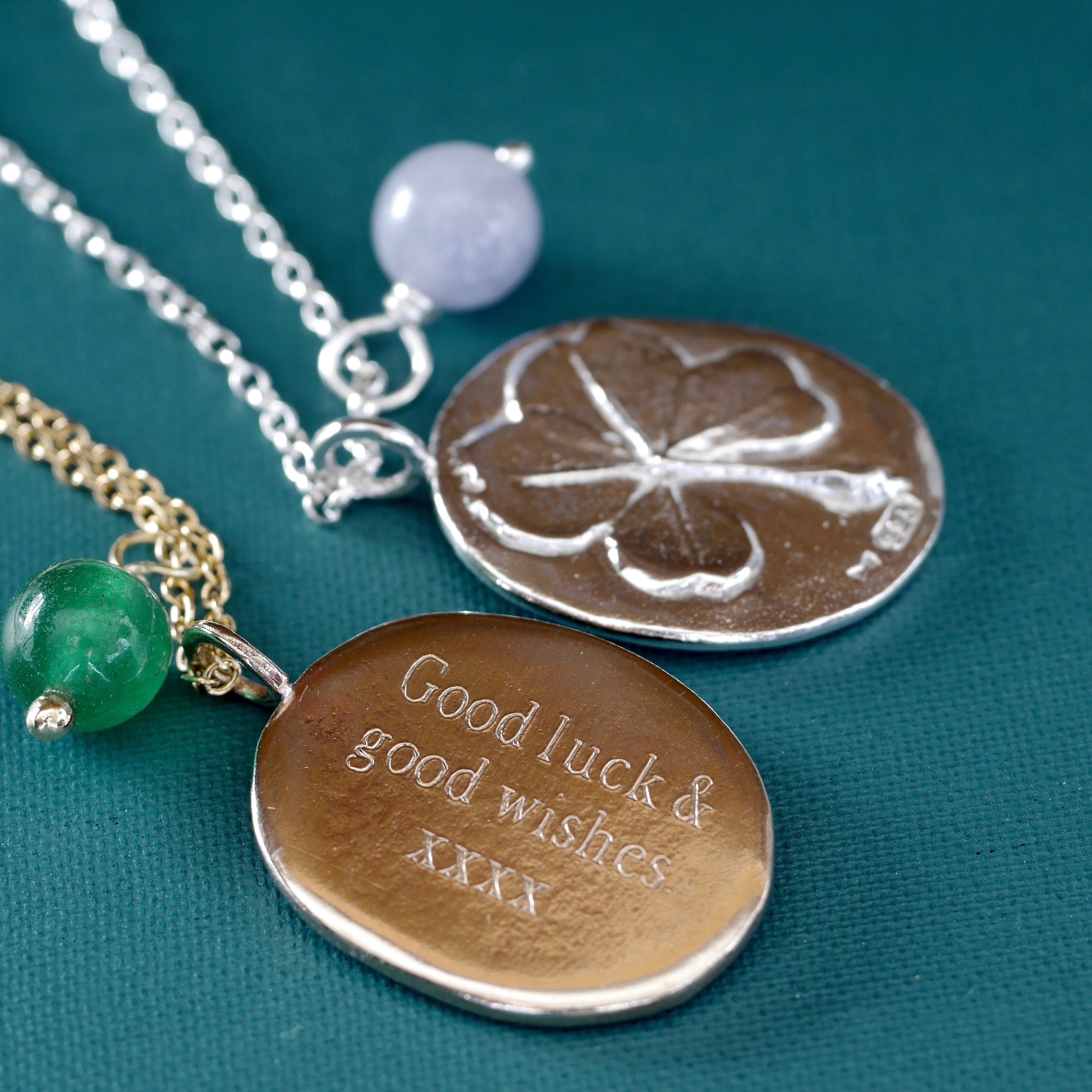 Solid Sterling Silver Personalised Four Leaf Clover Coin Lucky Charm Necklace, Shamrock Lucky Charm Jewellery Gift for her.