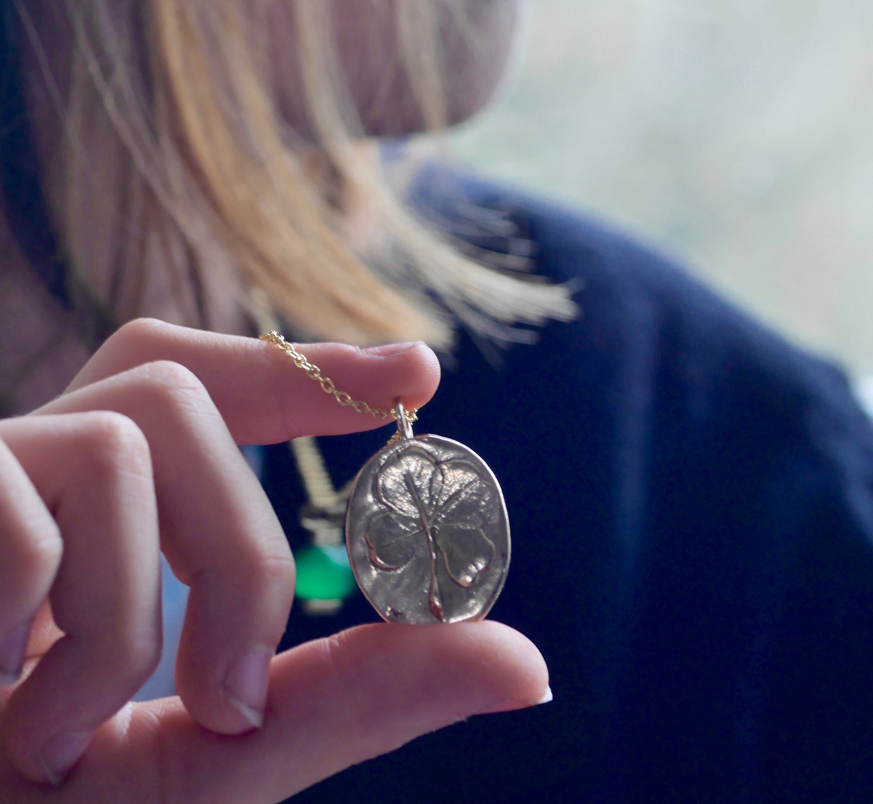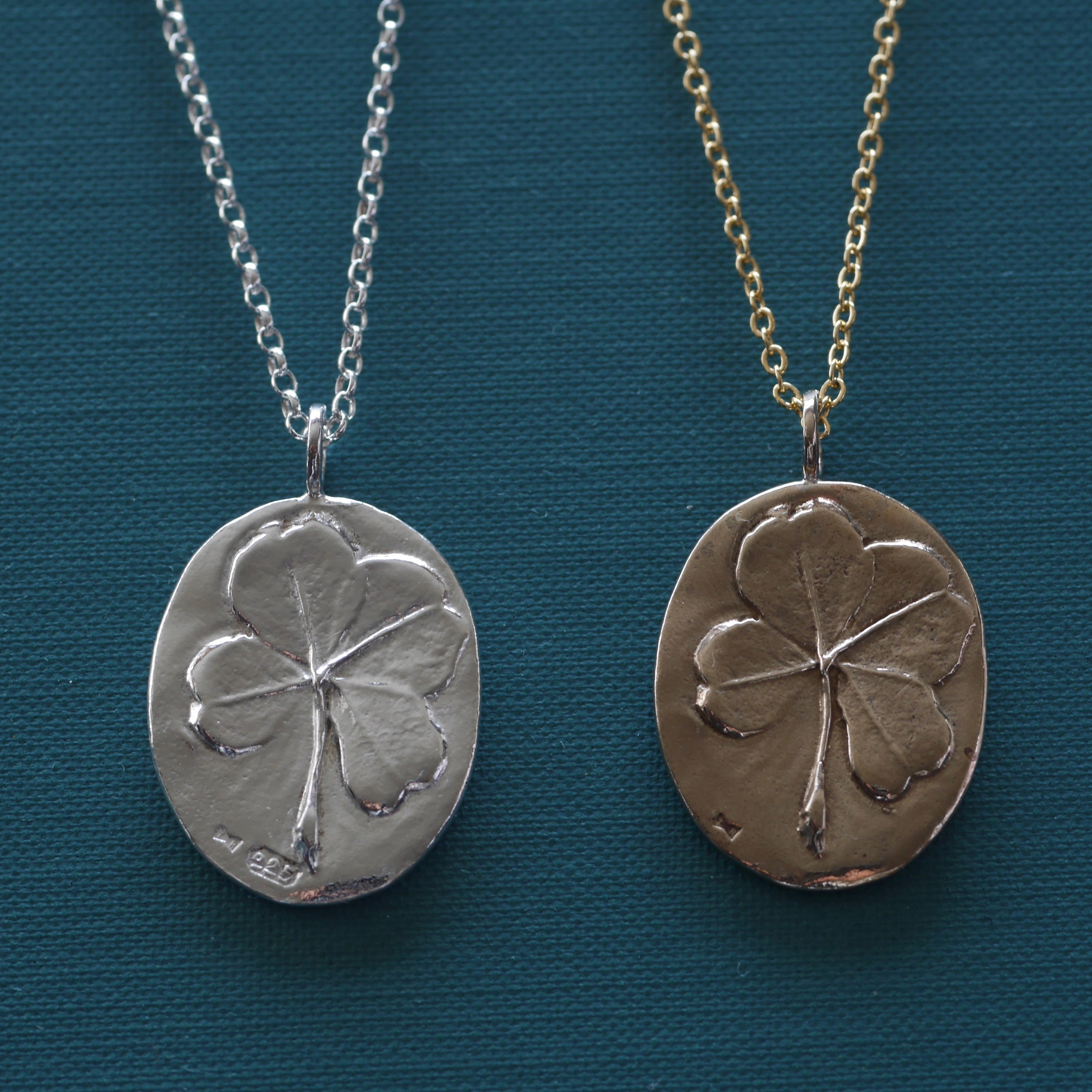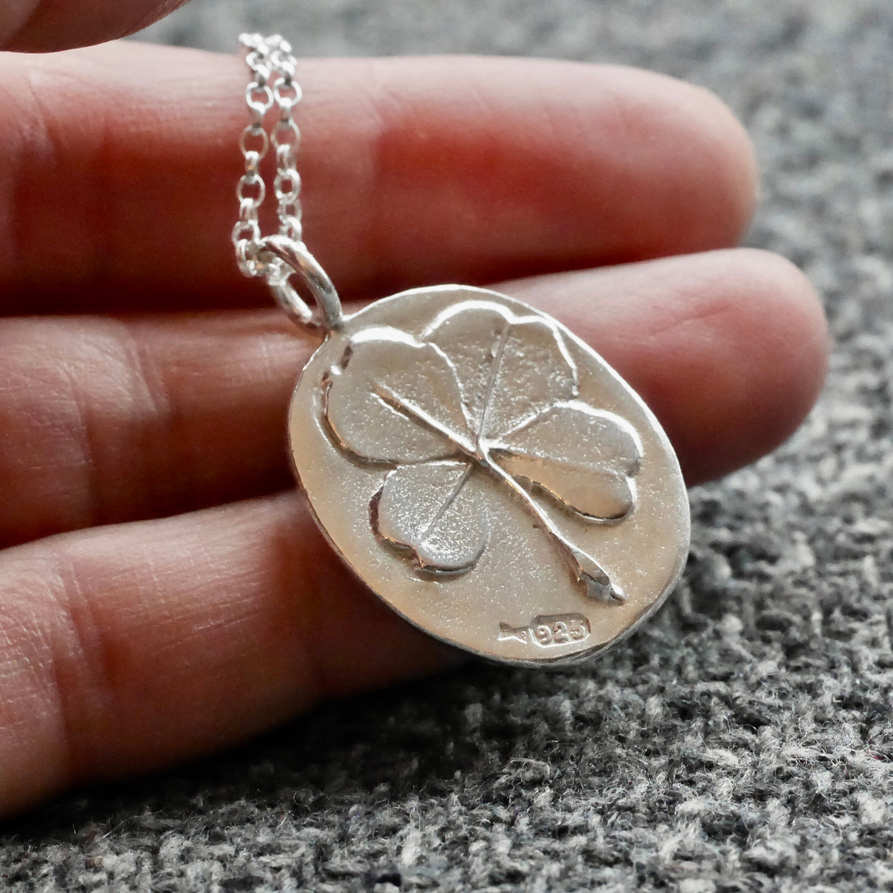 Solid Sterling Silver Personalised Four Leaf Clover Coin Lucky Charm Necklace, Shamrock Lucky Charm Jewellery Gift for her.