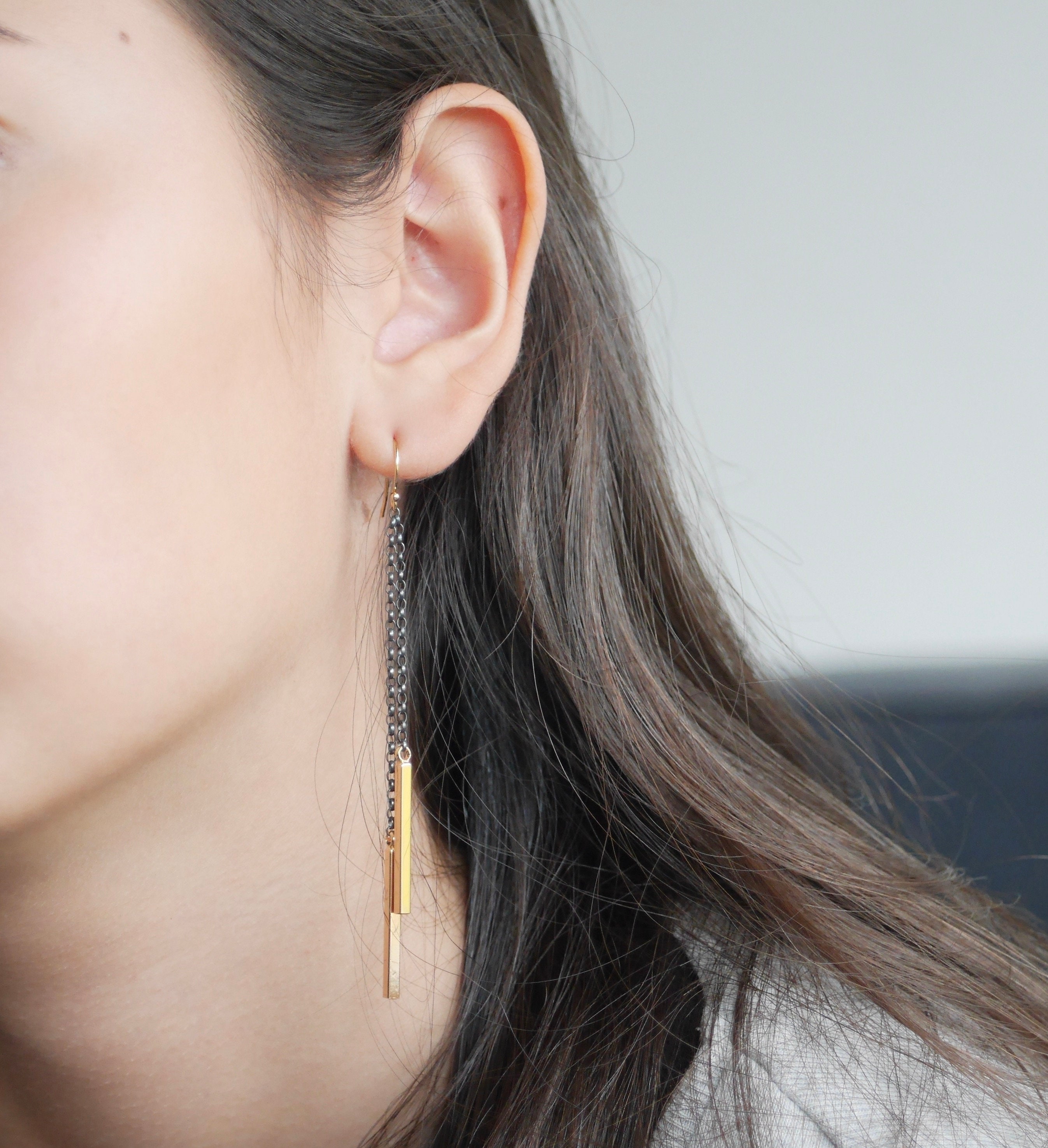 Each detail is thoughtfully designed to enhance the geometric elegance of the earrings. The oxidised sterling silver chain provides a chic backdrop, accentuating the brilliance of the gold-plated bars.