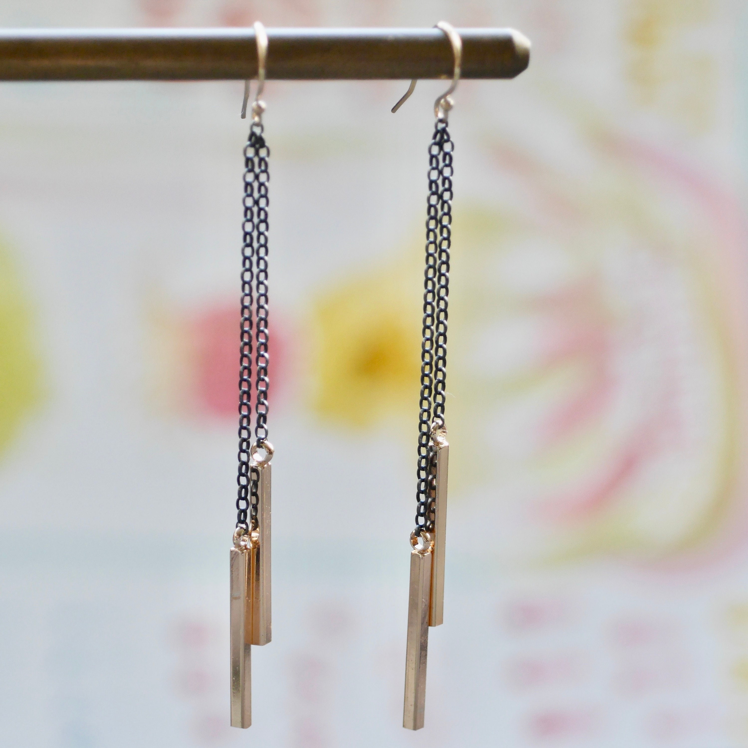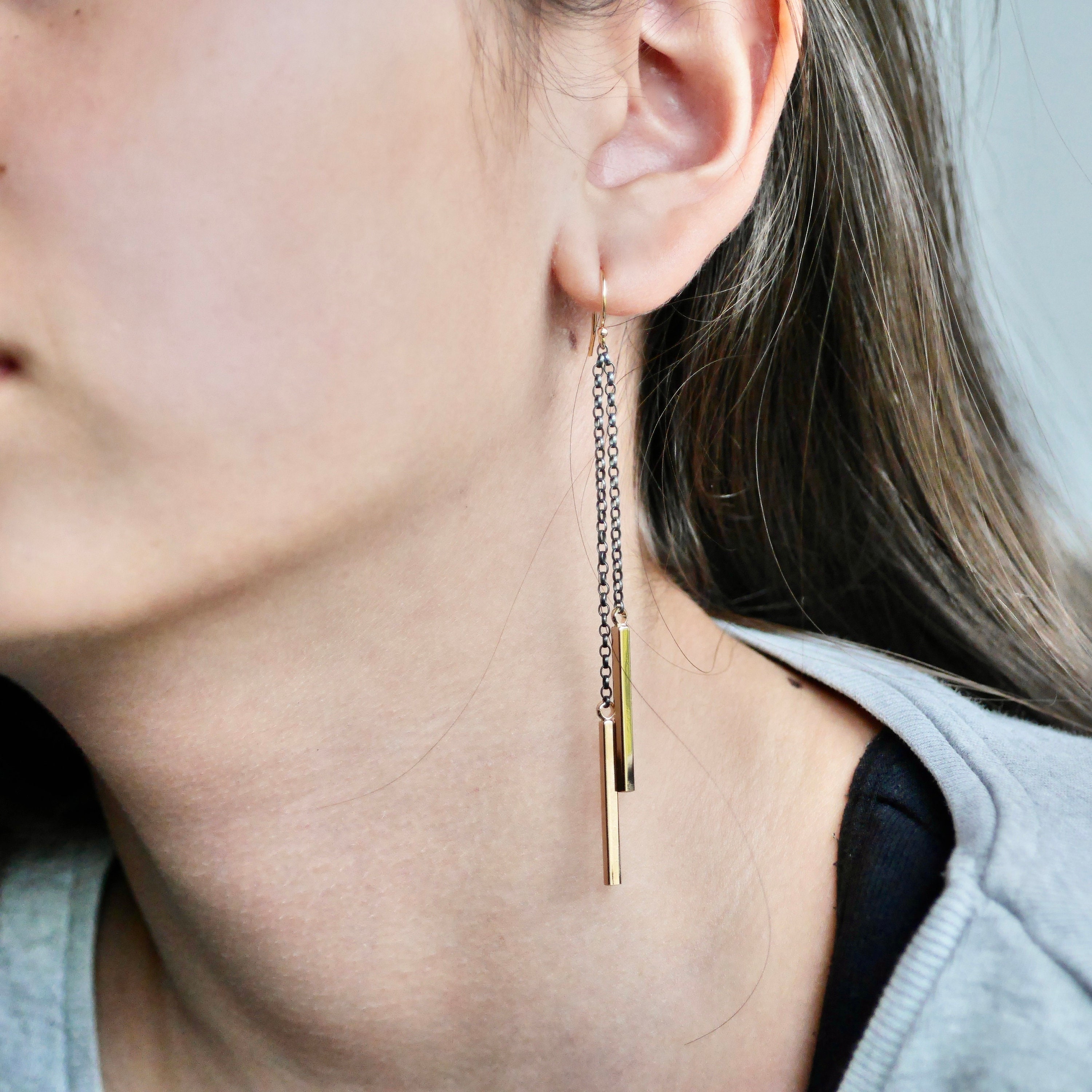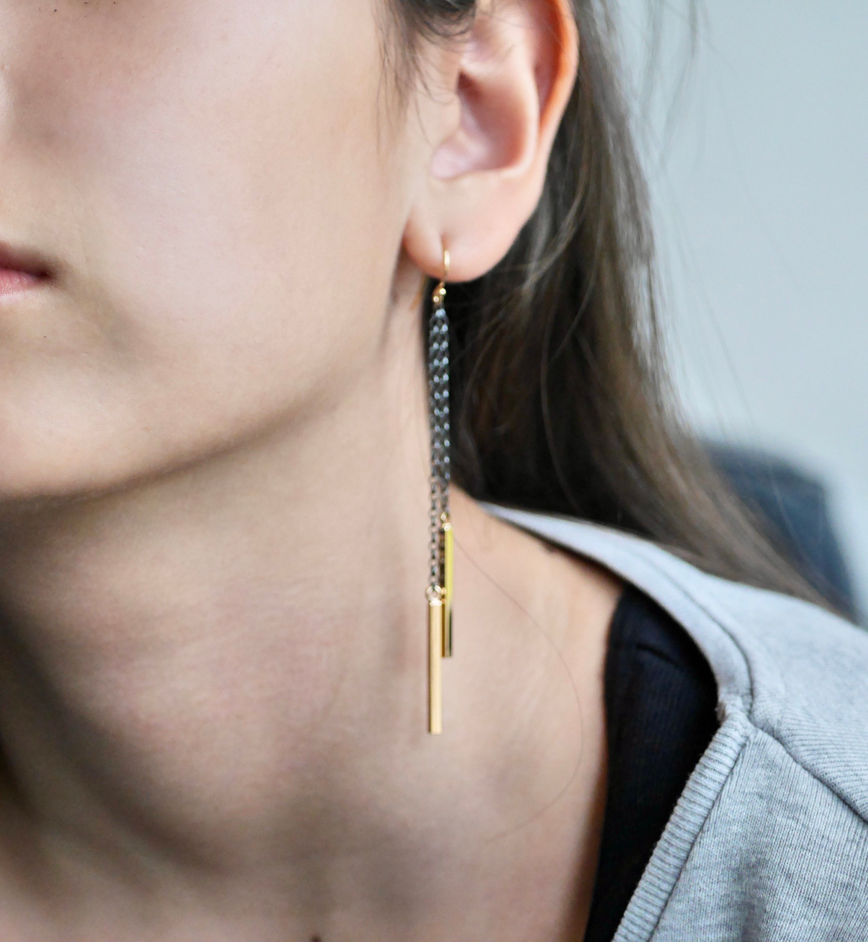 Indulge in the allure of minimalist elegance with these captivating geometric long-drop earrings. Crafted from oxidised sterling silver chain and adorned with gold-plated bars, these earrings embody the perfect balance of black and gold in contemporary jewelry.