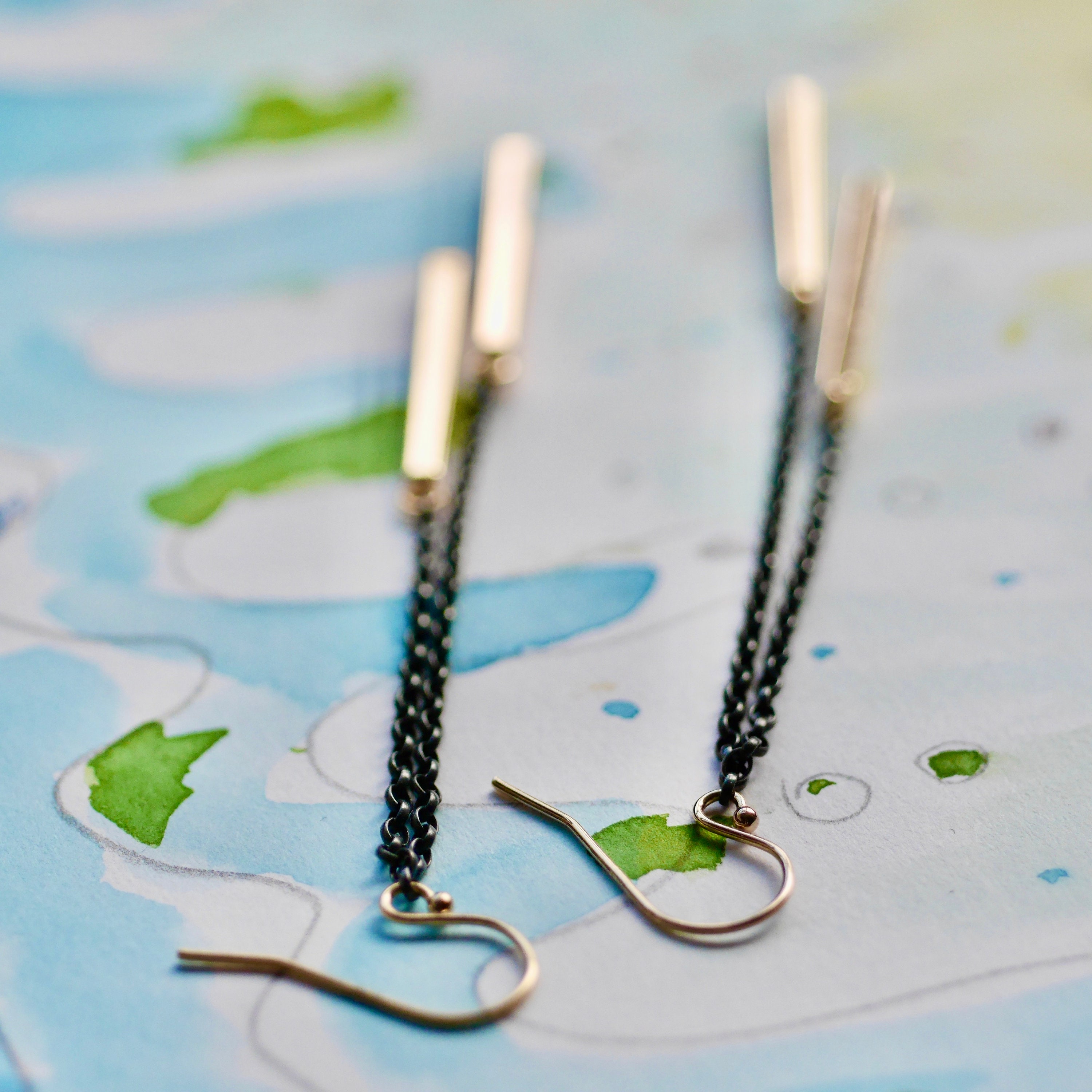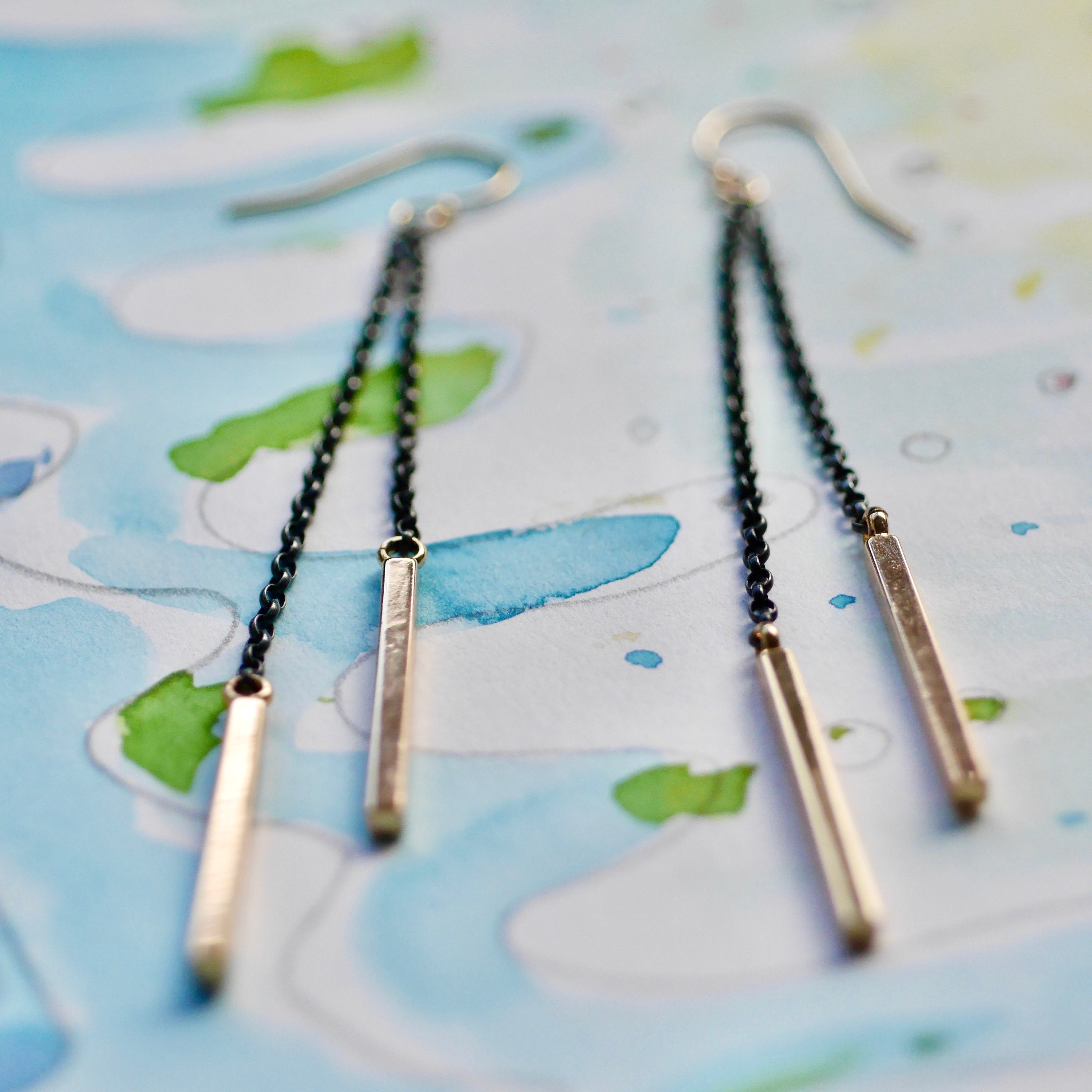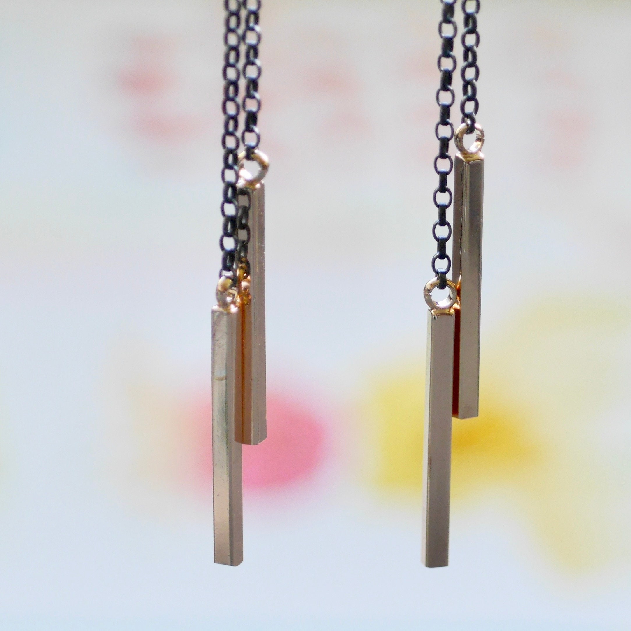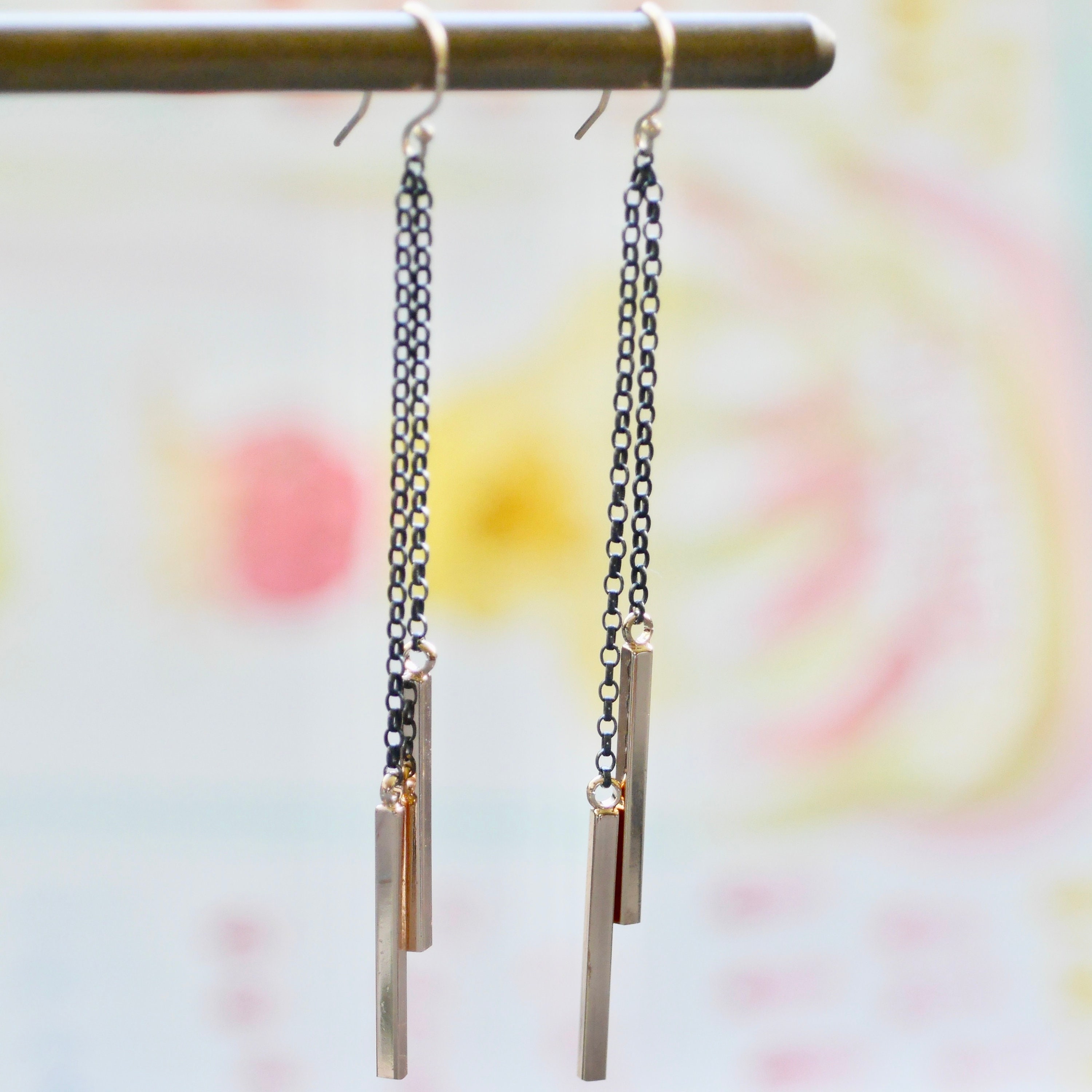 Indulge in the allure of minimalist elegance with these captivating geometric long-drop earrings. Crafted from oxidised sterling silver chain and adorned with gold-plated bars, these earrings embody the perfect balance of black and gold in contemporary jewelry.