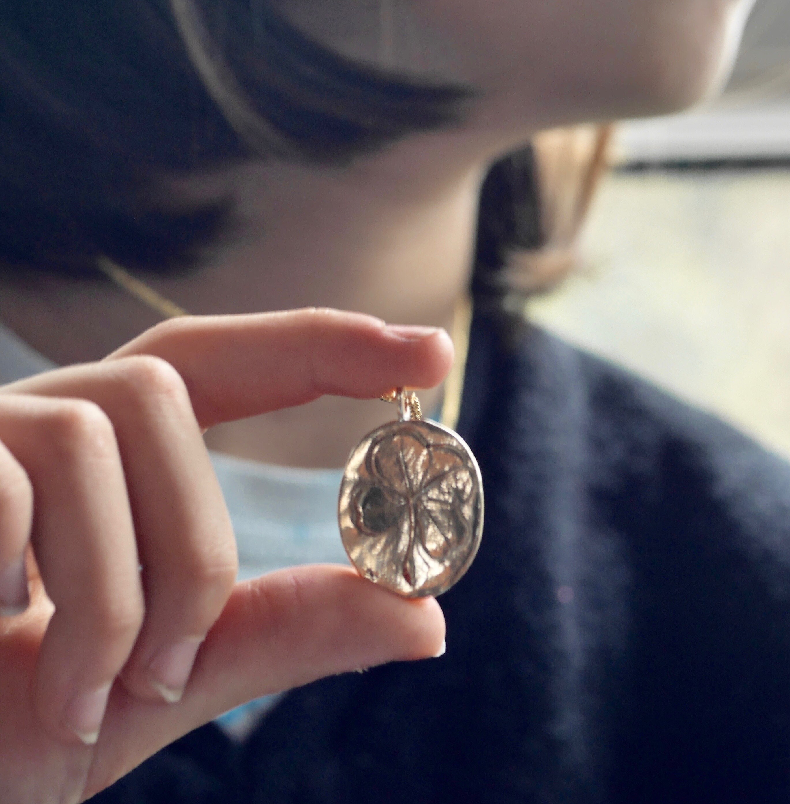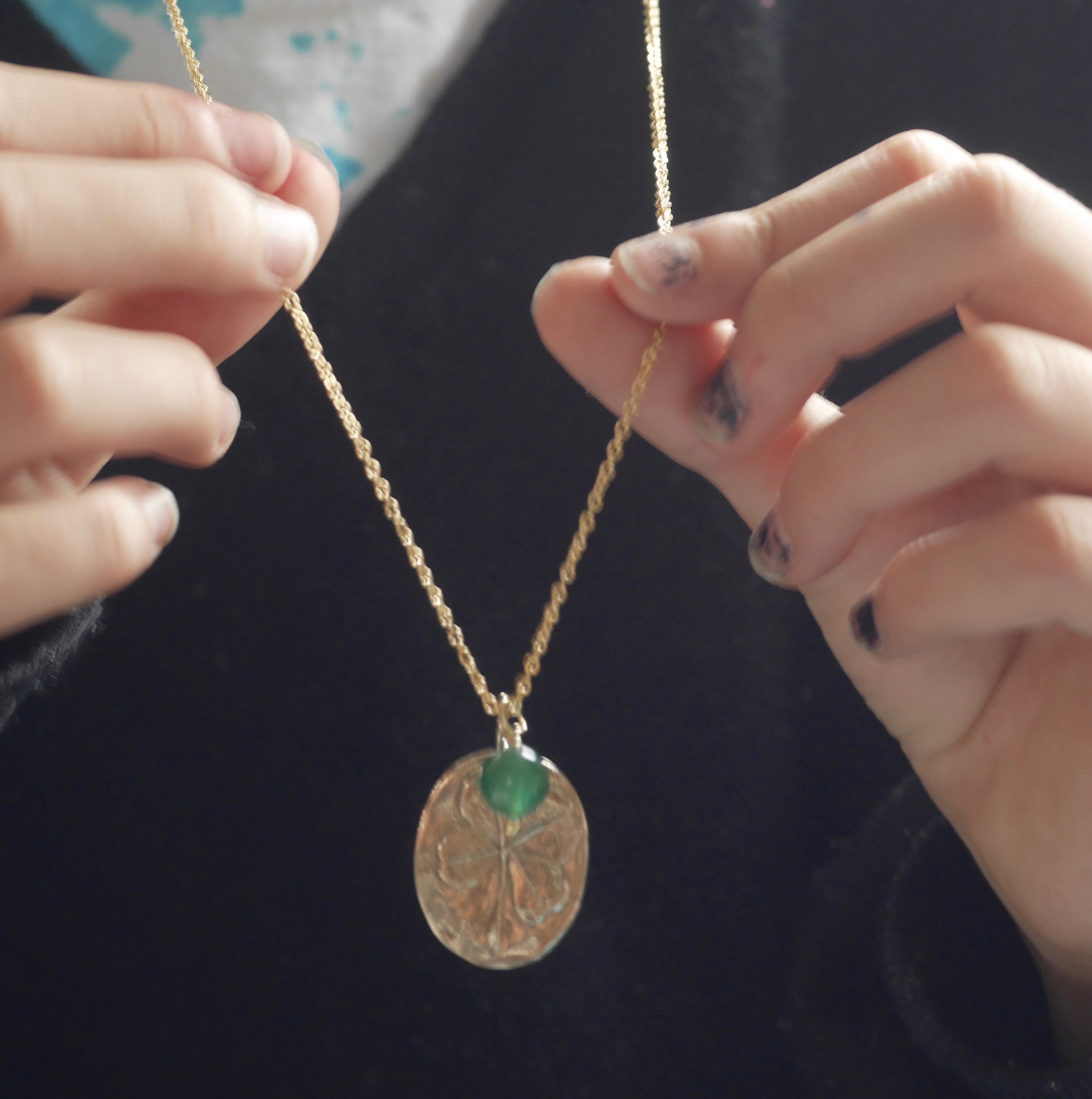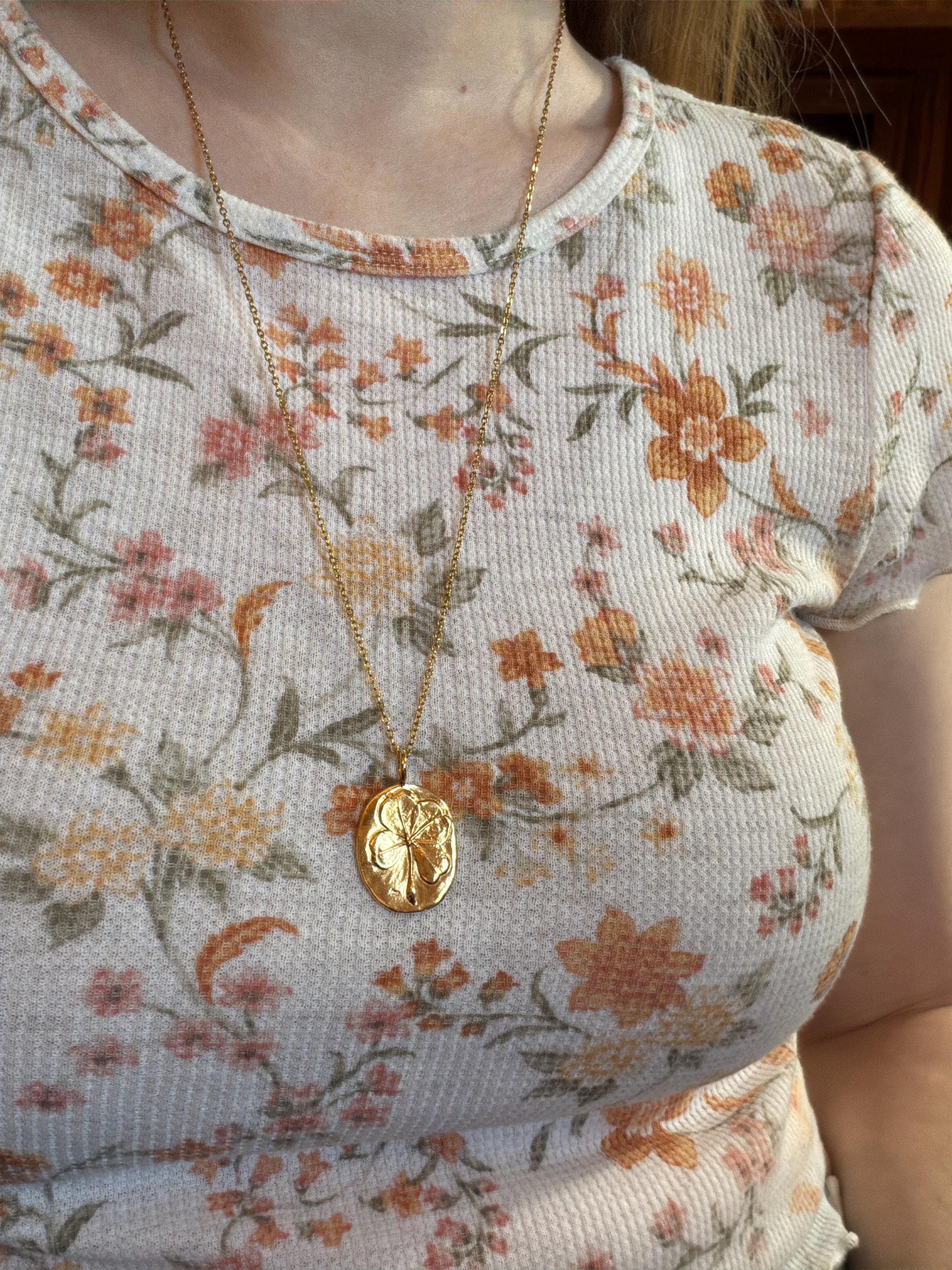 This is an 18-carat gold-plated Bronze four-leaf clover charm. The necklace can be worn as a lucky charm necklace or amulet.