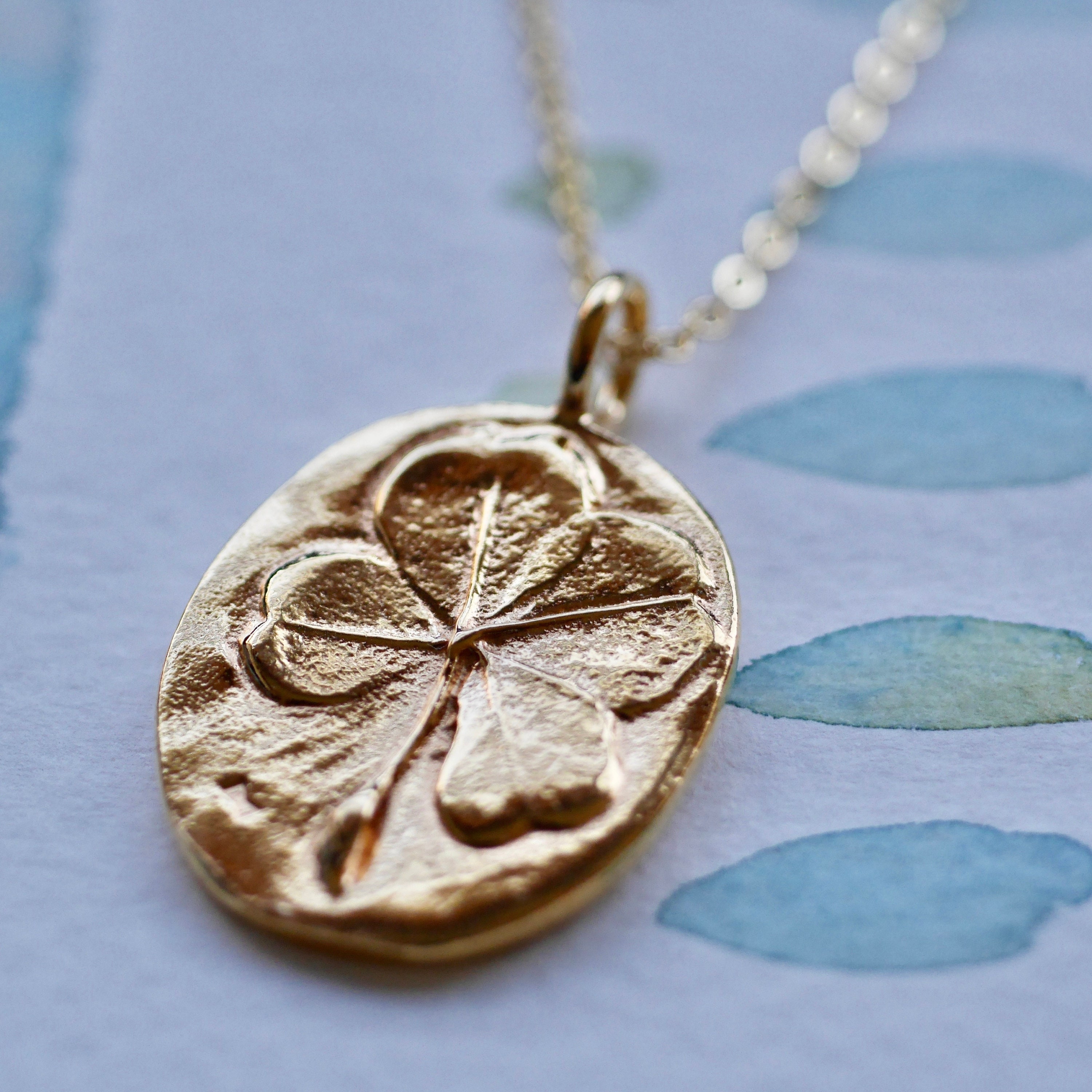 Personalised Gold plated on Bronze Four Leaf Clover Coin Lucky Charm Necklace, Shamrock Lucky Charm Gold Jewellery Gift for her.
