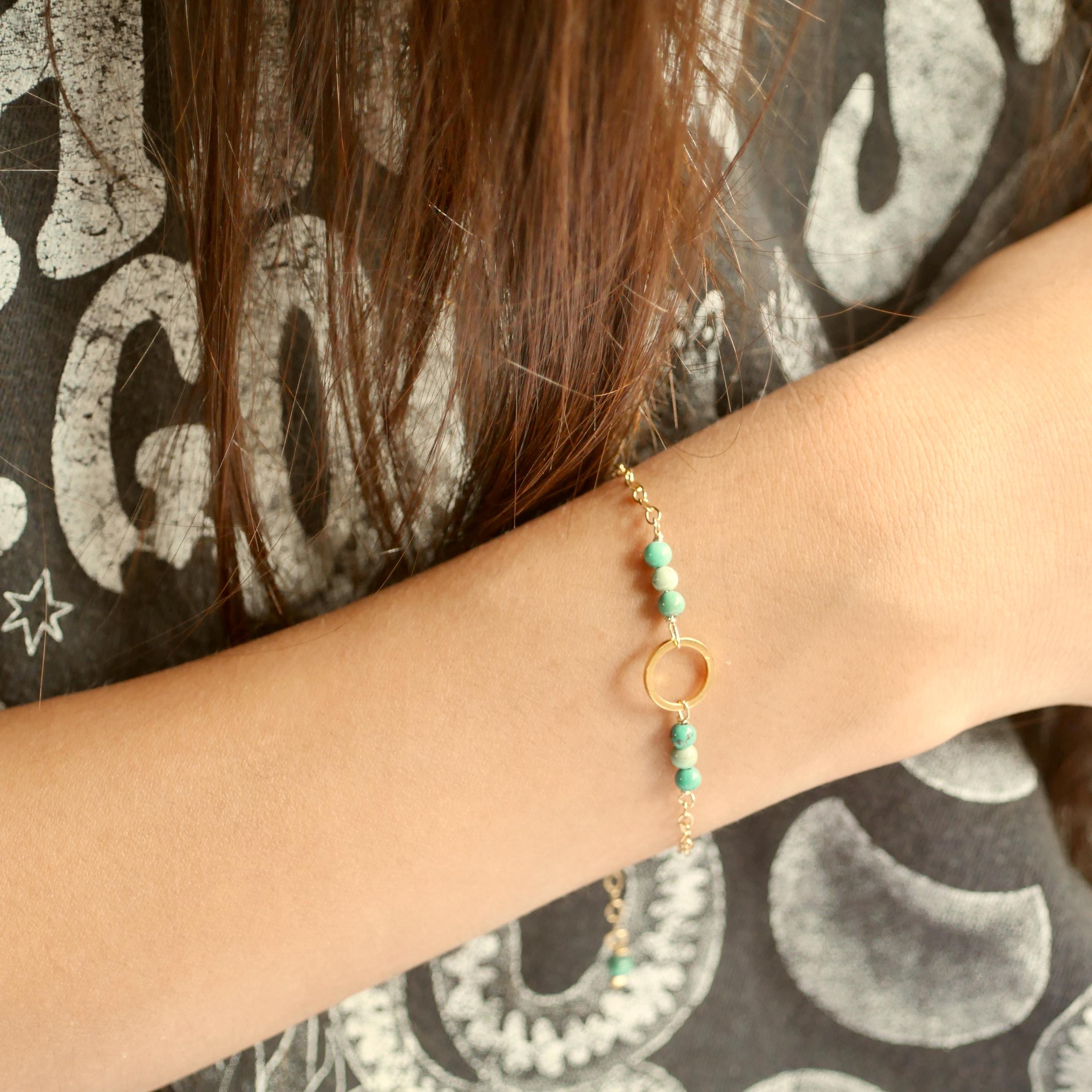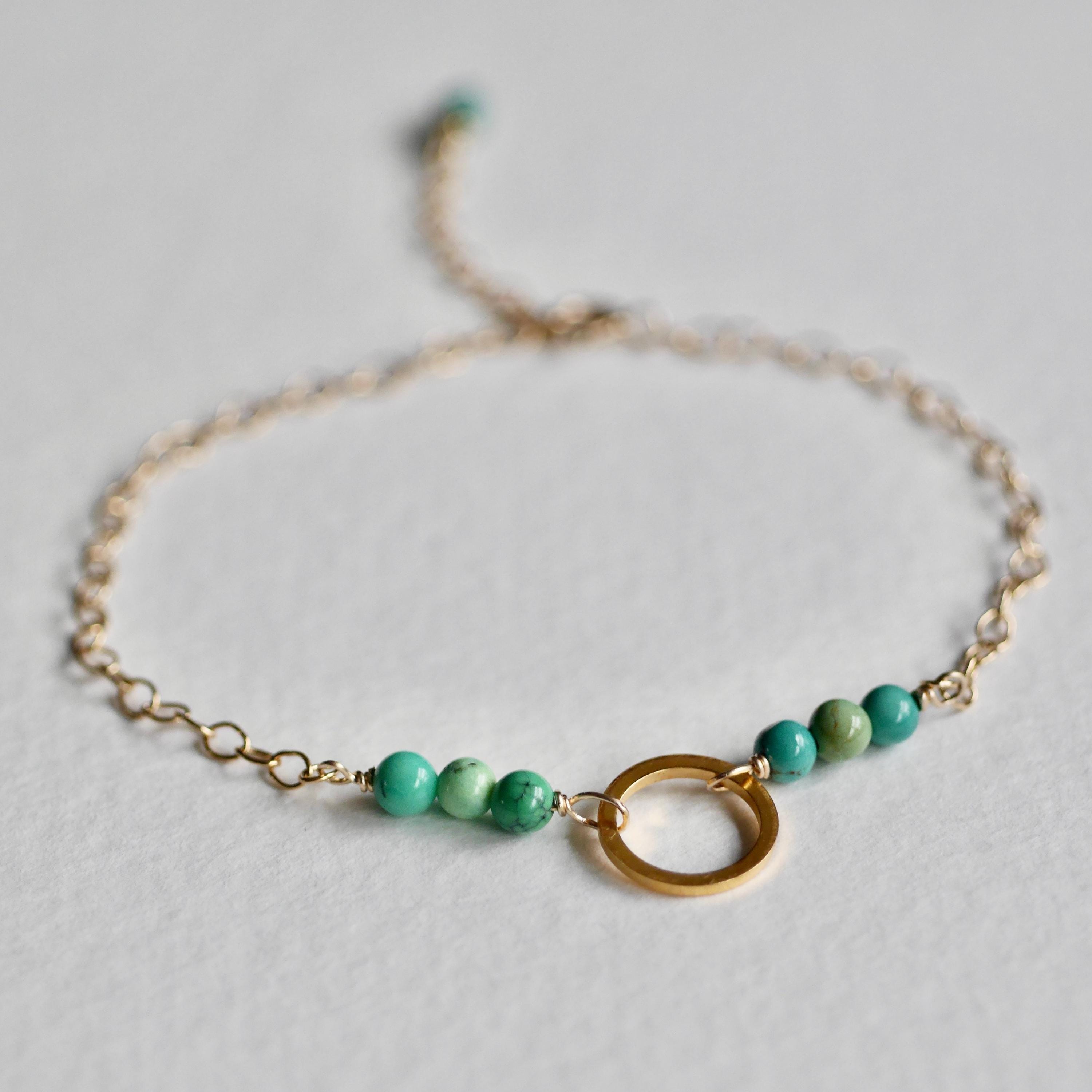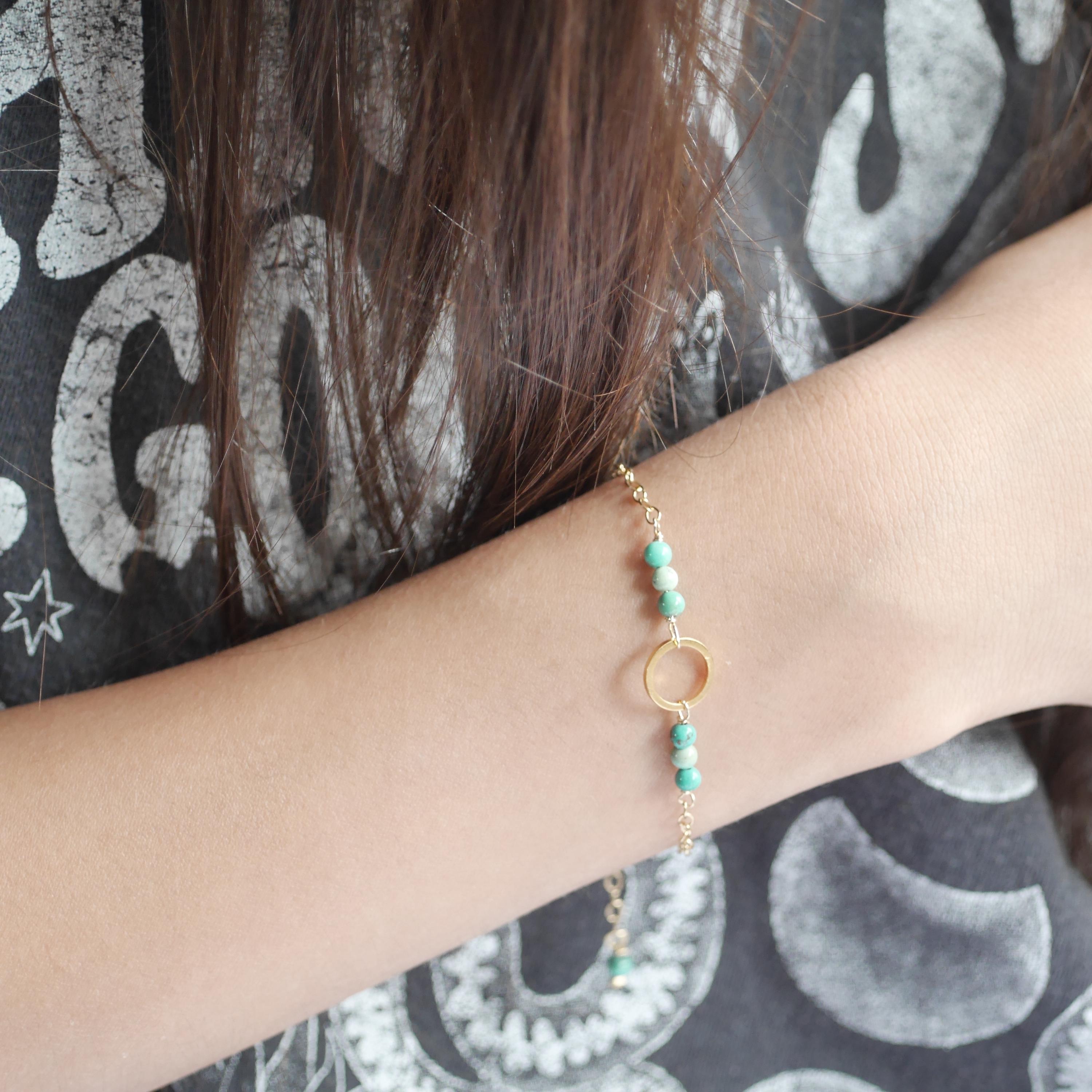 Beautiful and elegant turquoise gemstone and gold circle charm adjustable gold bracelet.