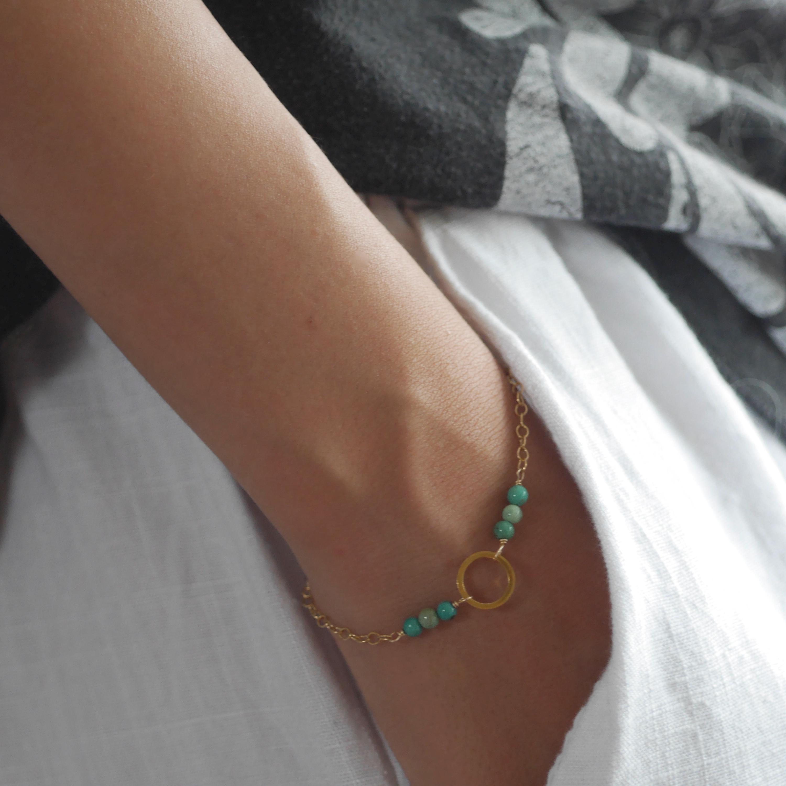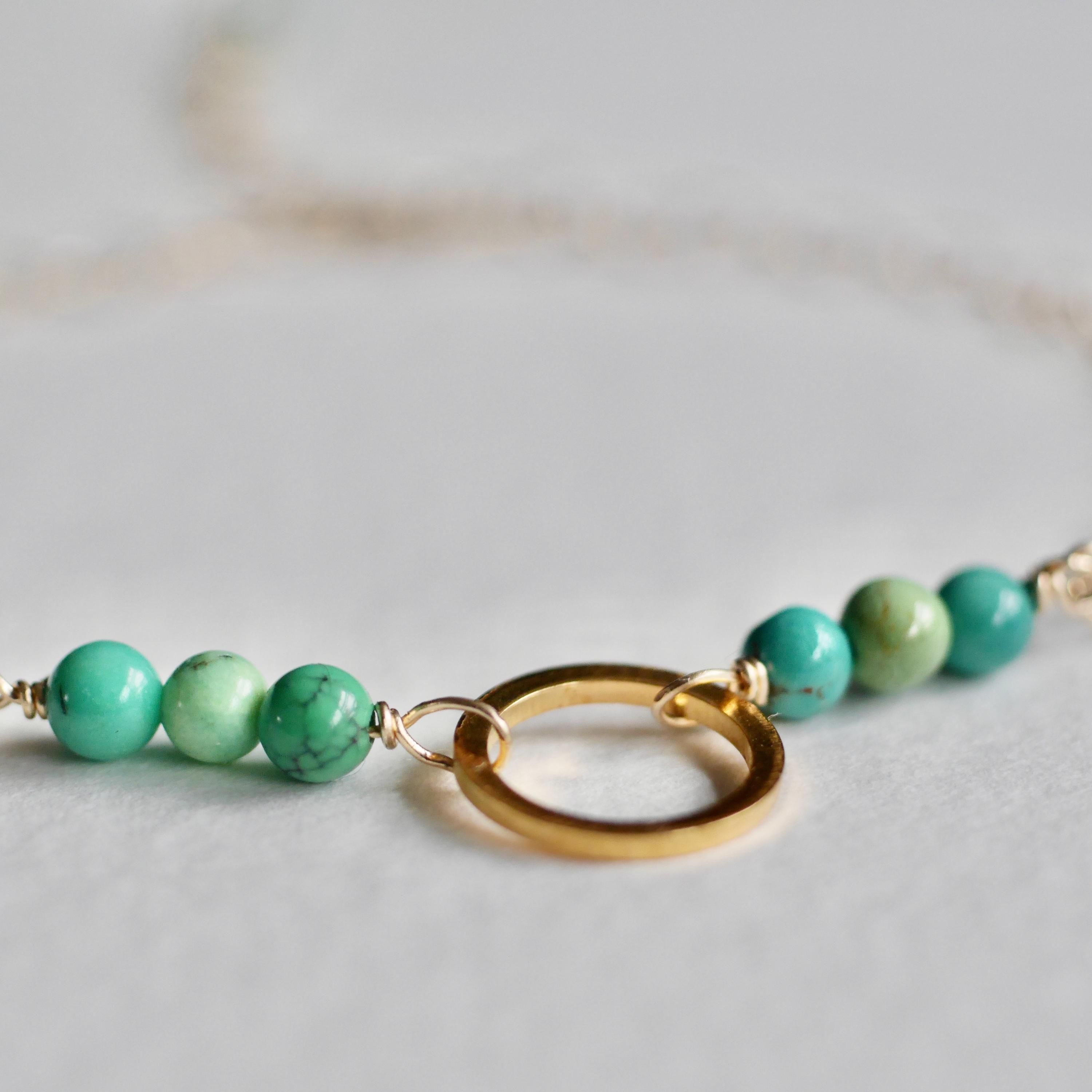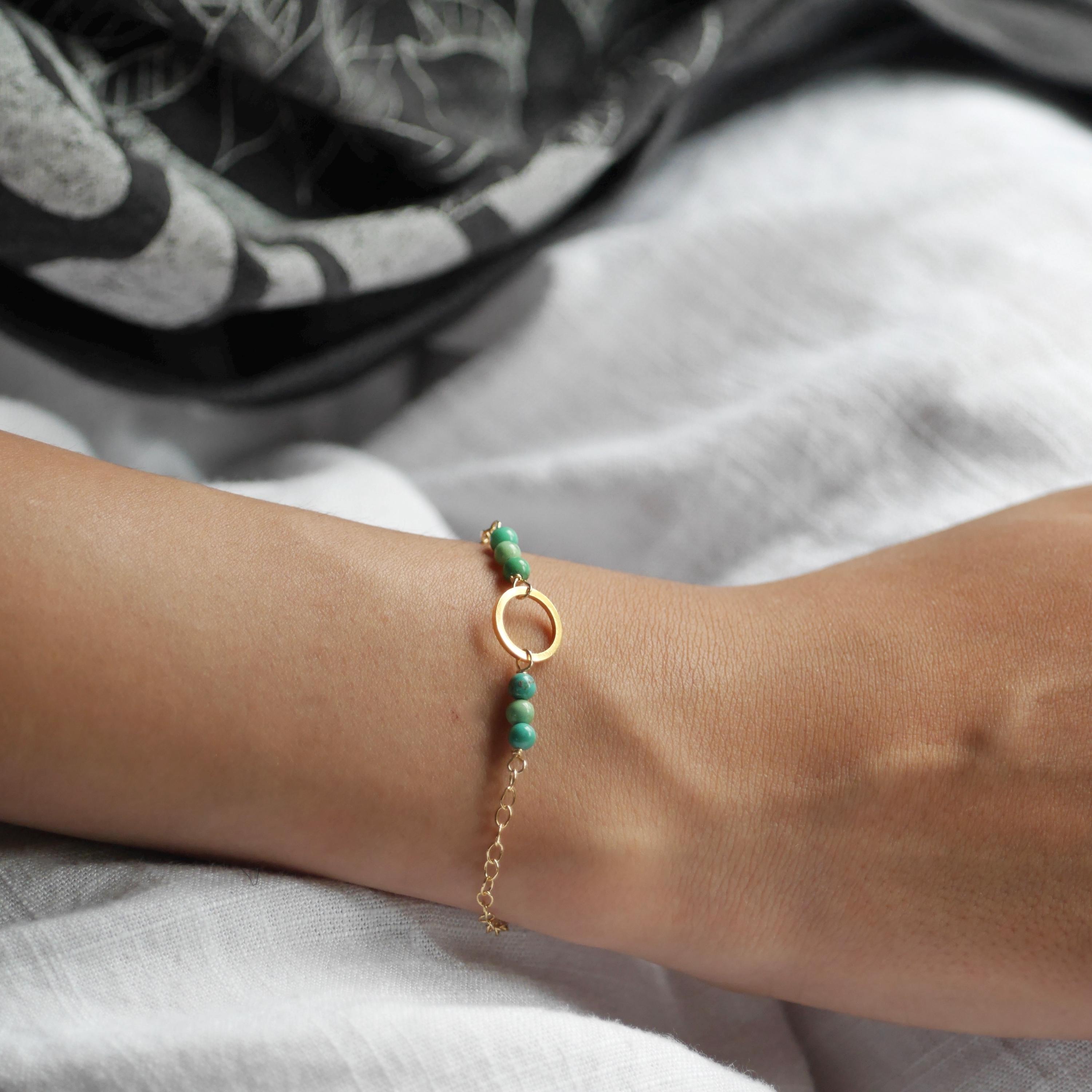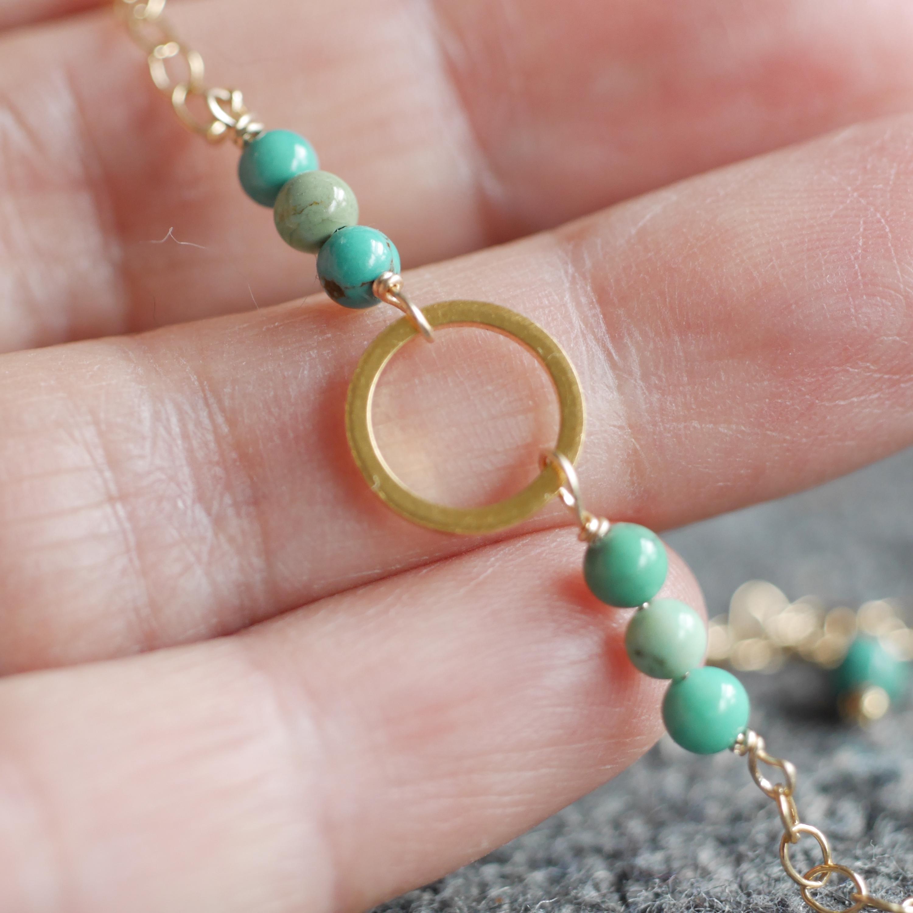 Beautiful and elegant turquoise gemstone and gold circle charm adjustable gold bracelet.
