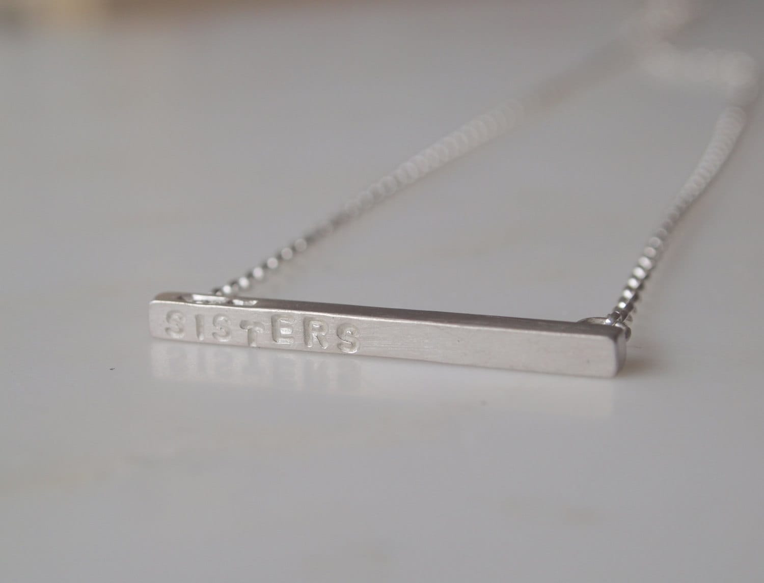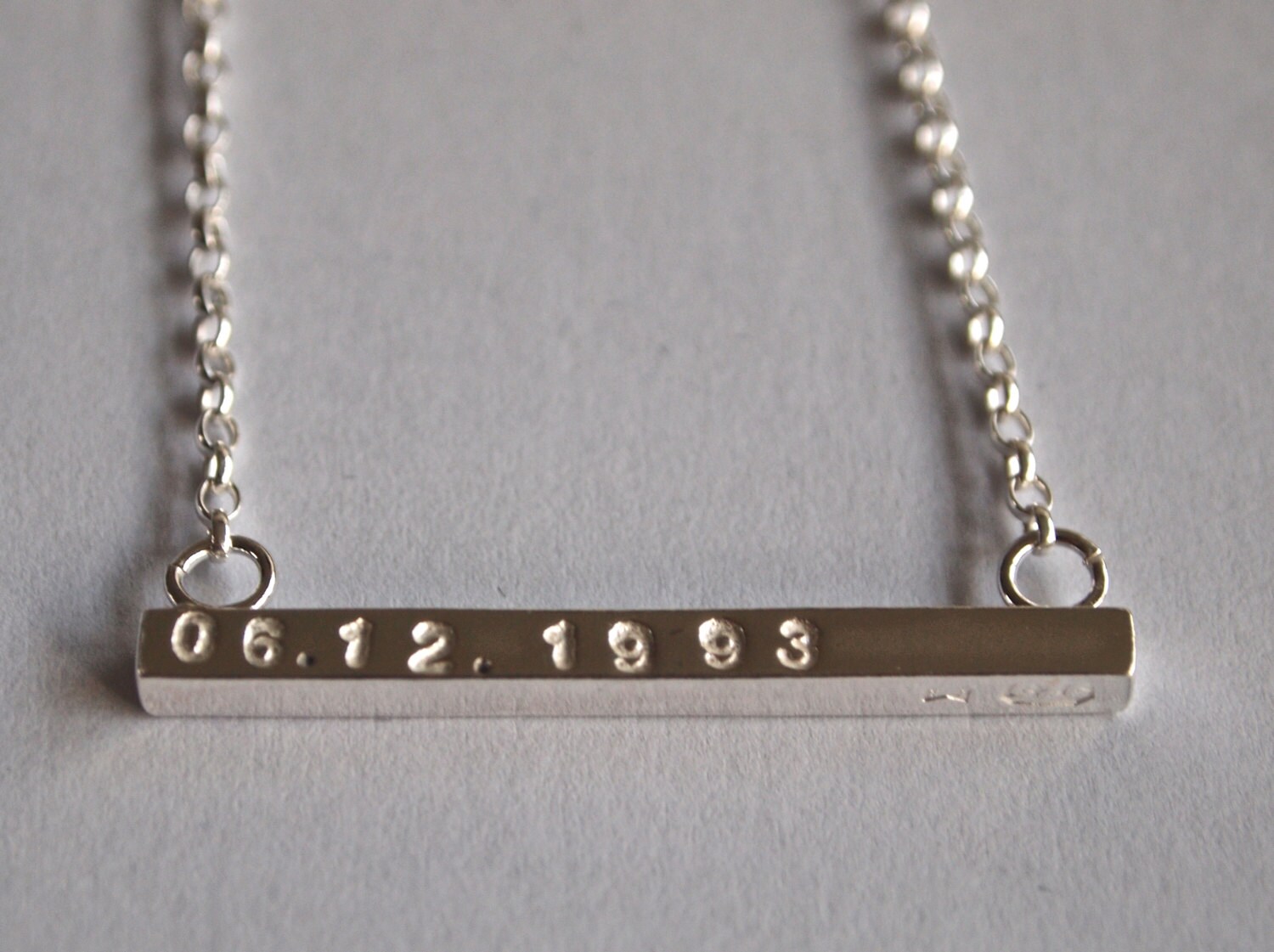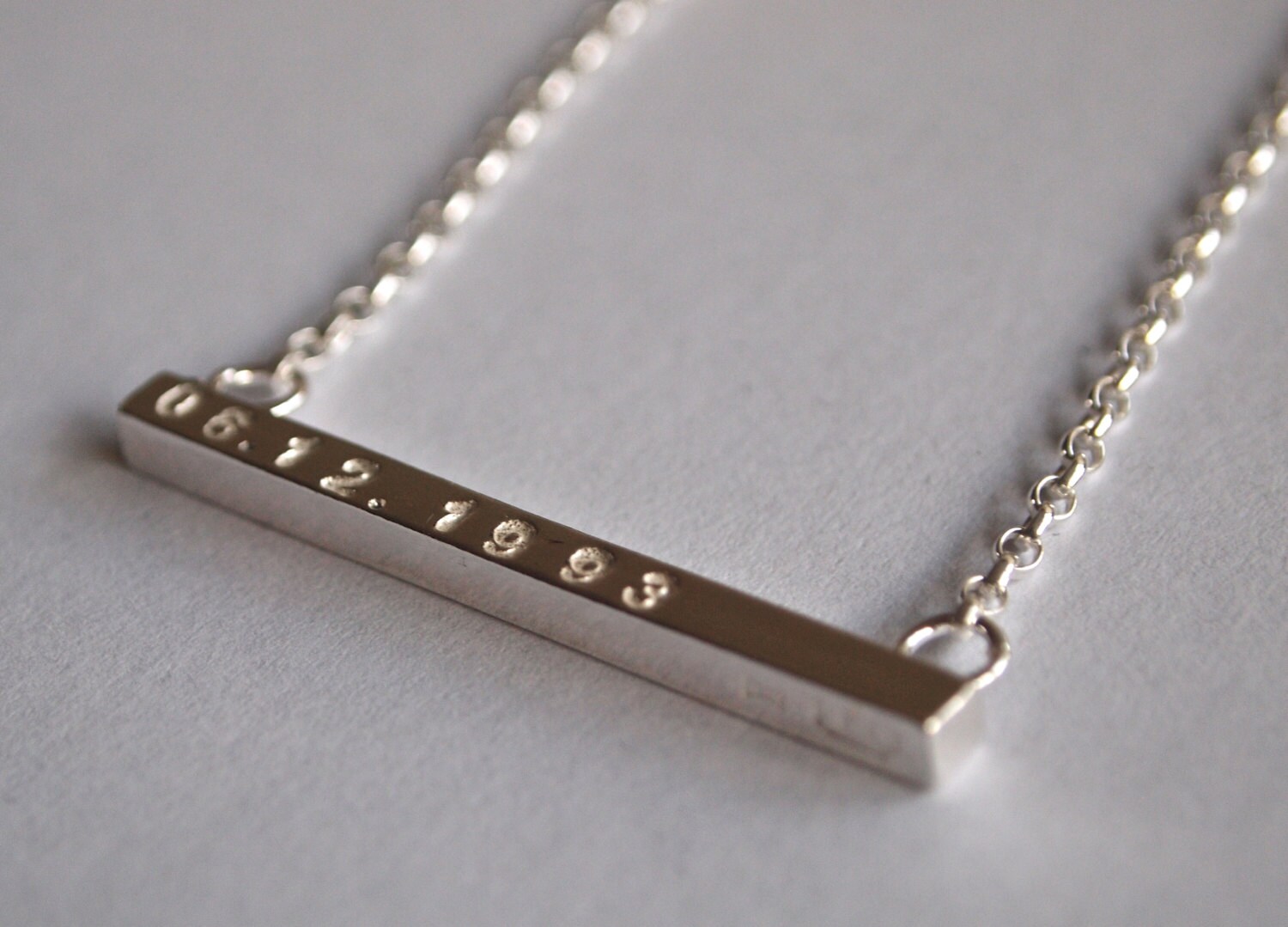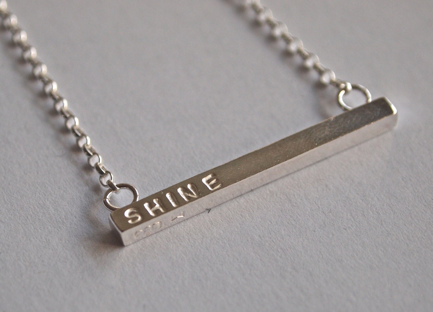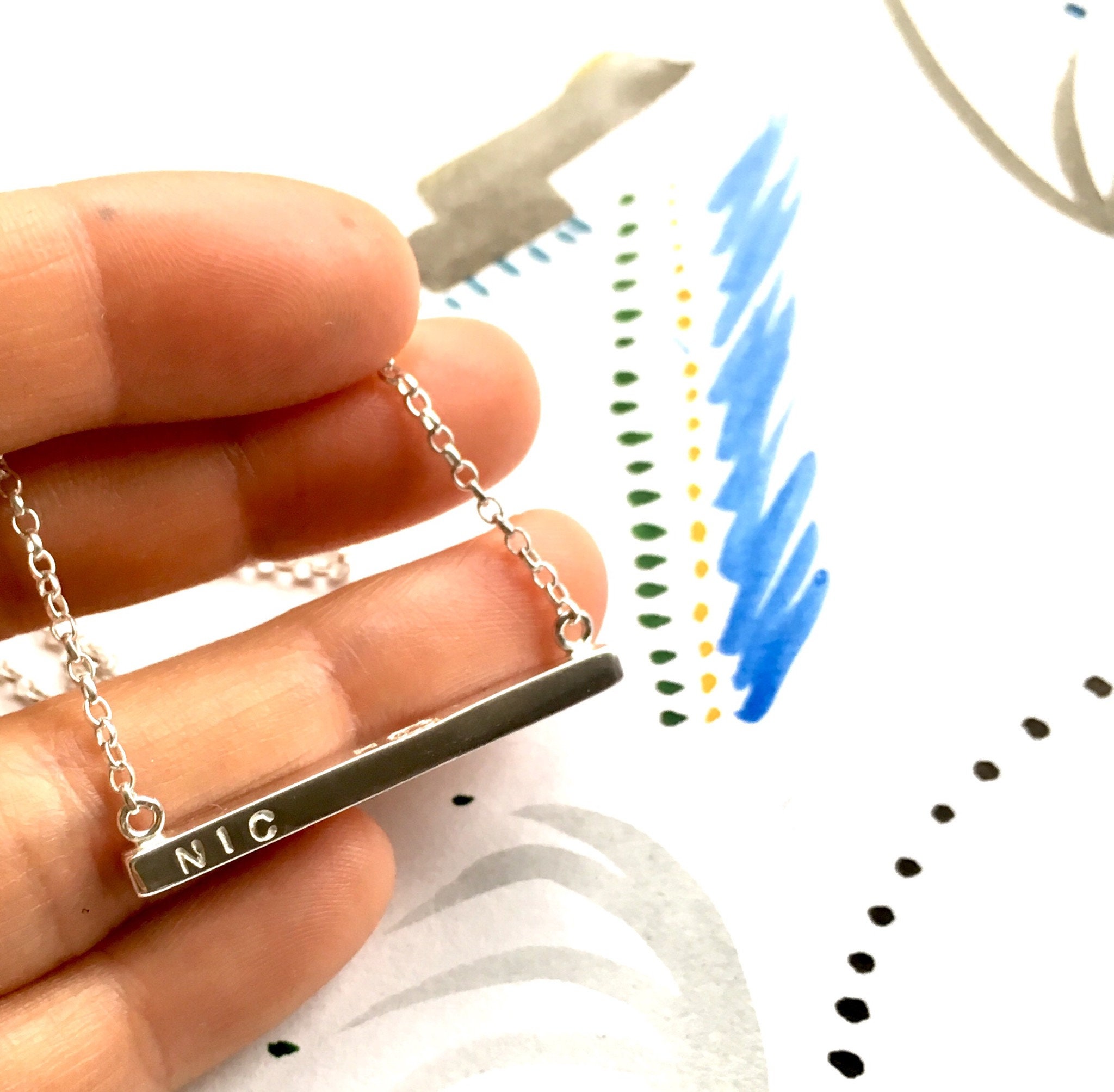 Stylish solid sterling silver bar necklace comes with free personalisation. Minimalist look 3mm square silver wire bar can be personalised front side or back side to keep it a secret message. Or I can even stamp on the bottom just like the photos.