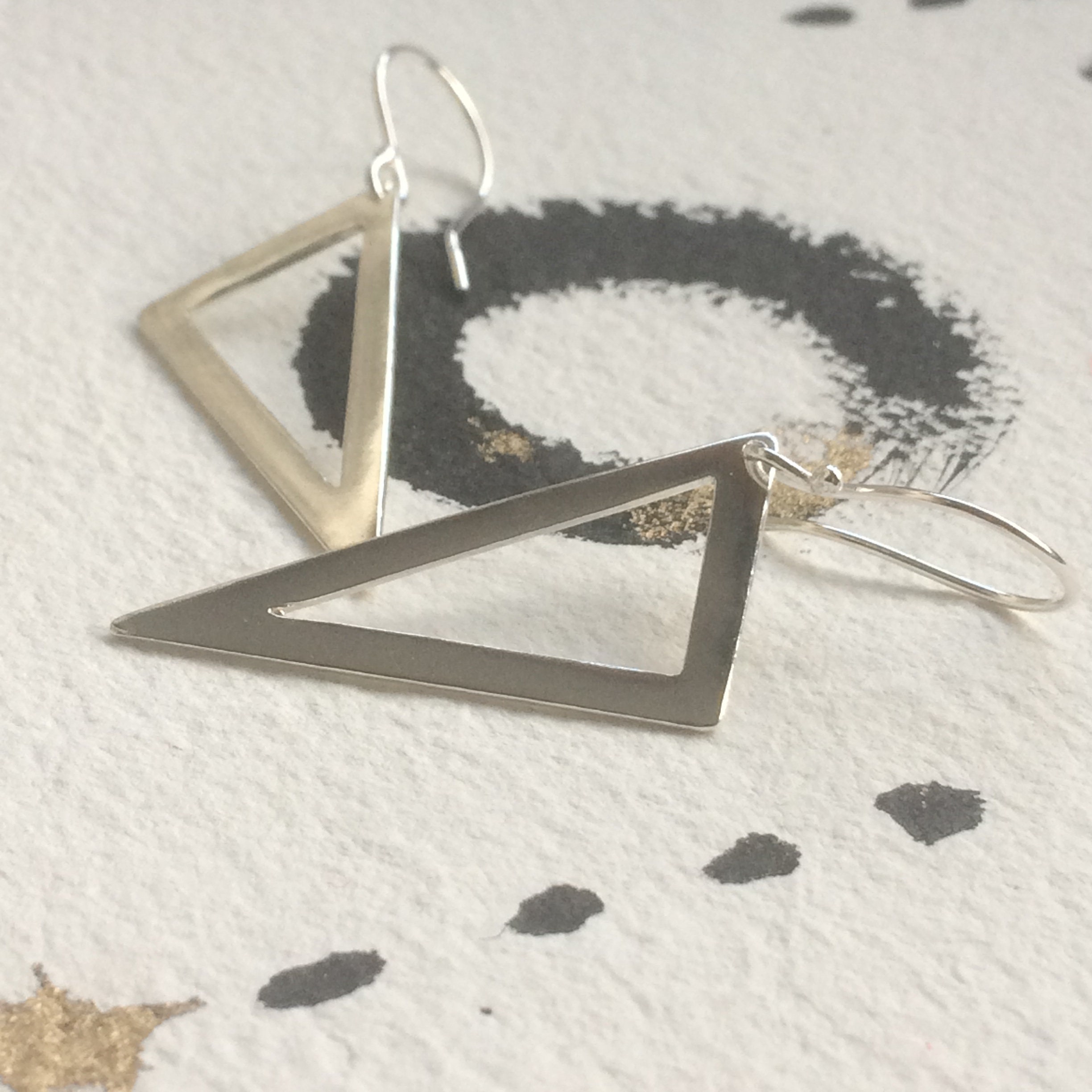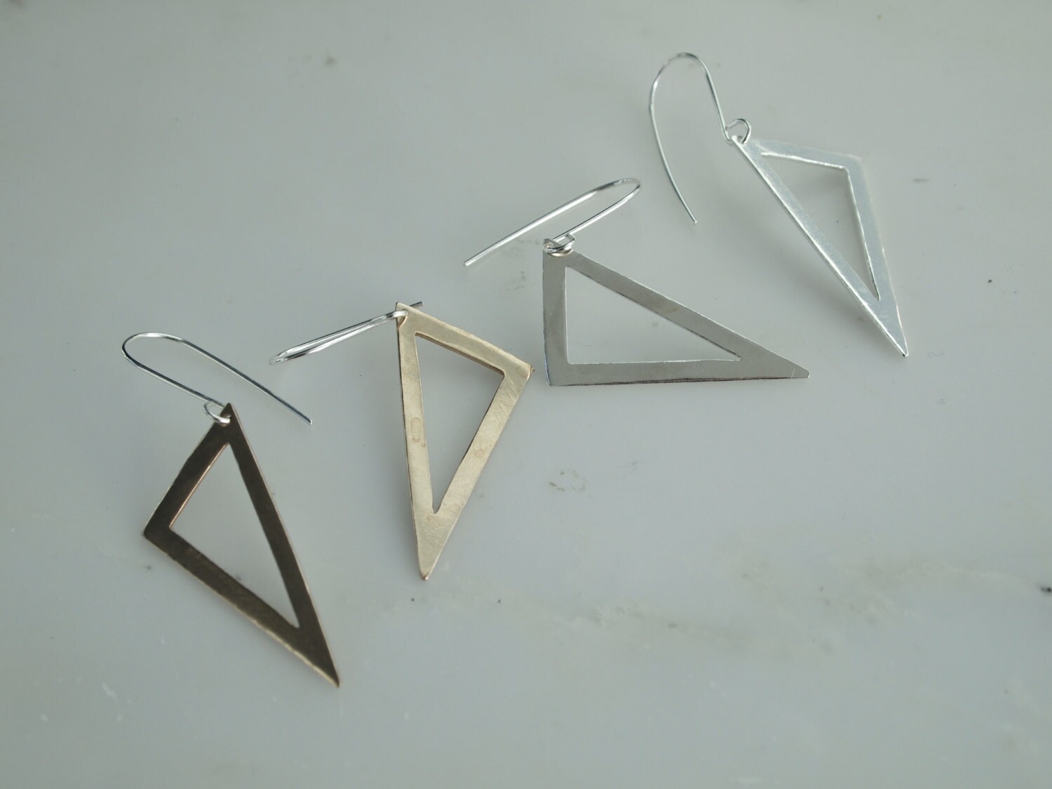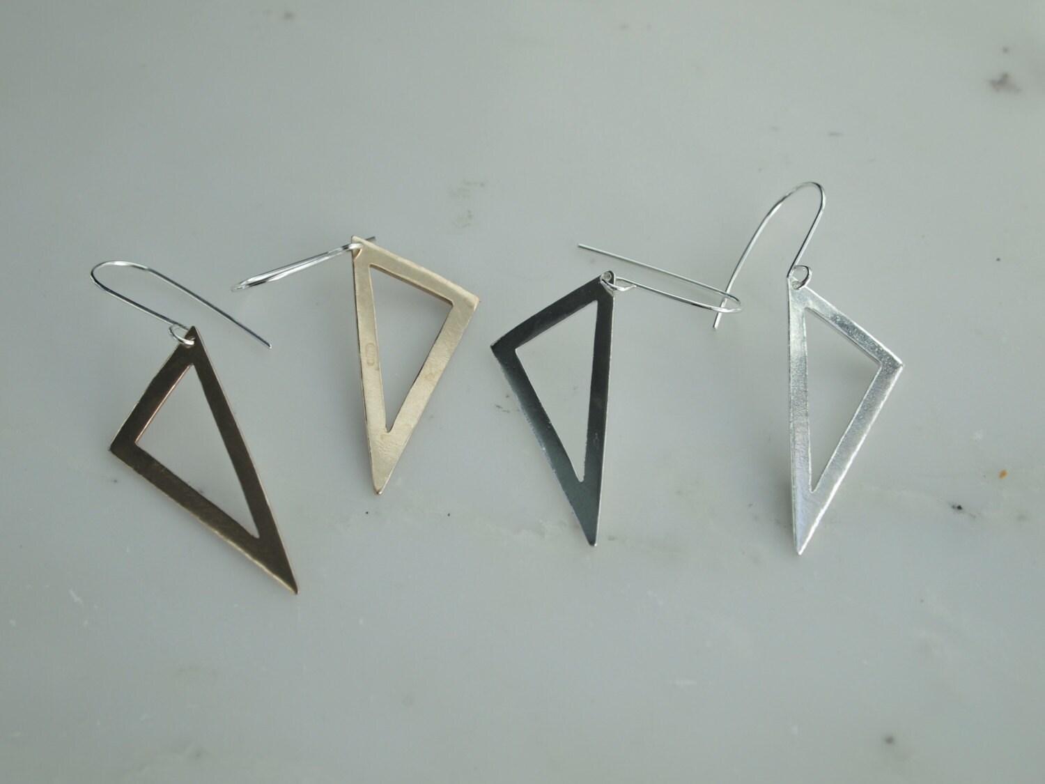 Minimalist, geometric large triangle drop earrings choice of sterling silver or bronze finish.