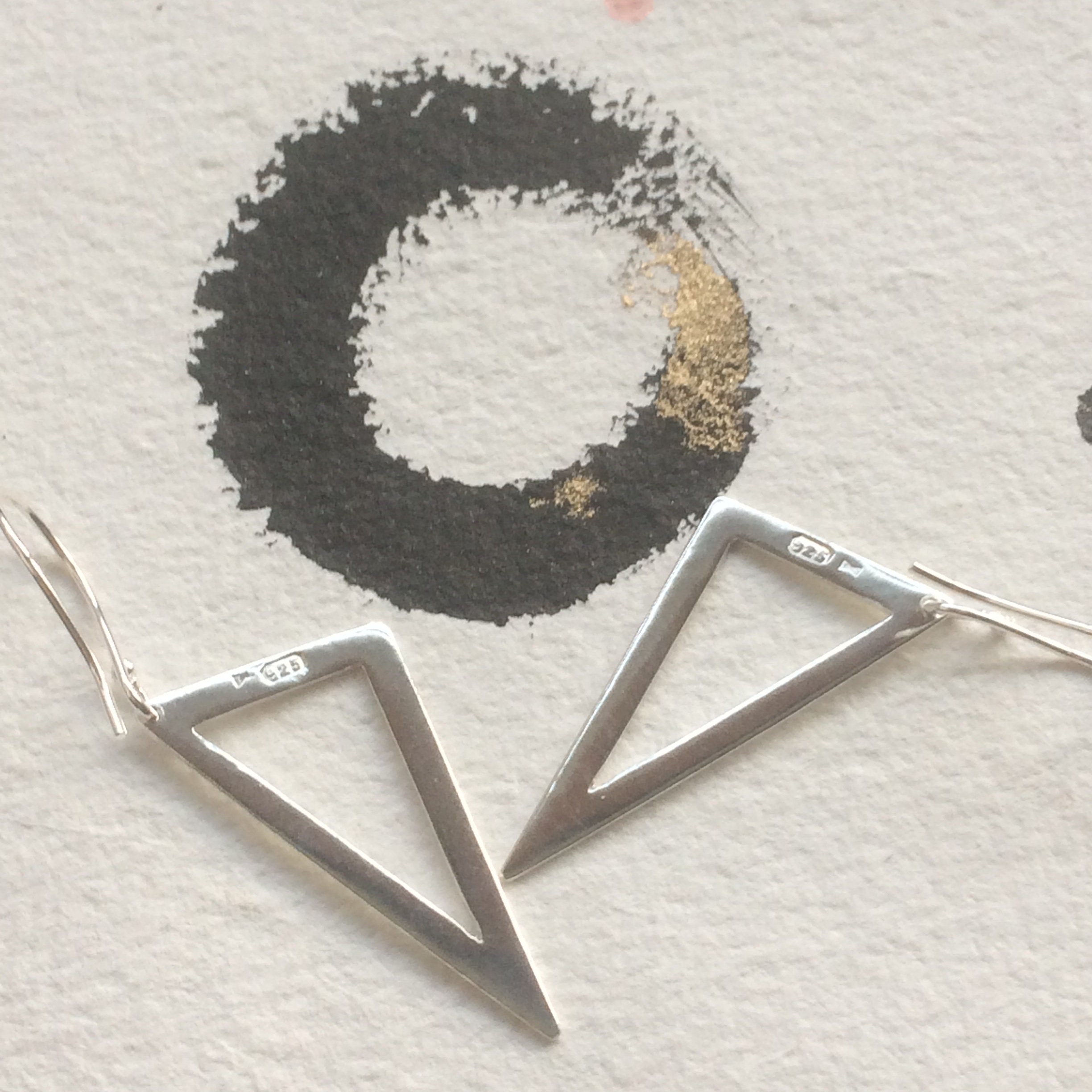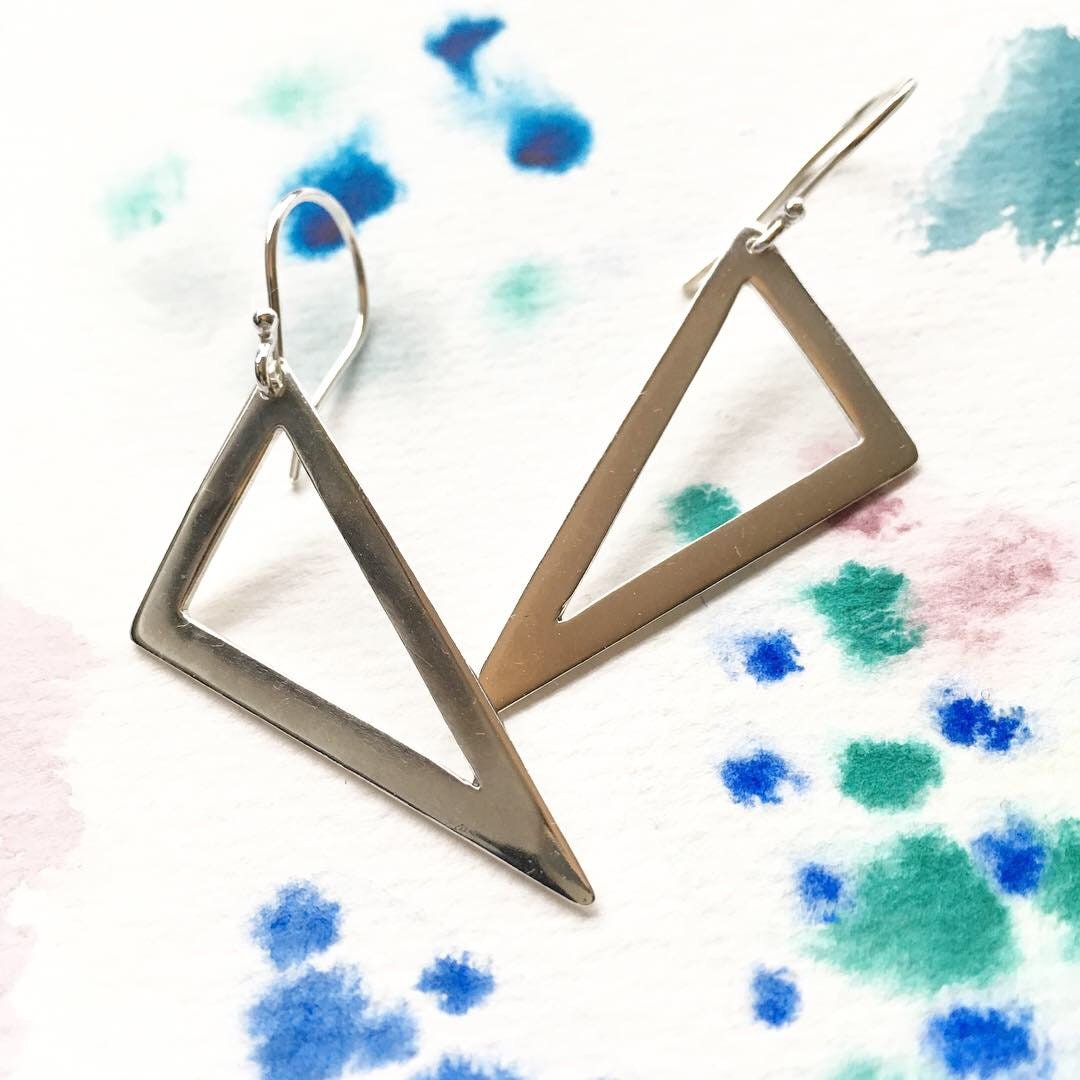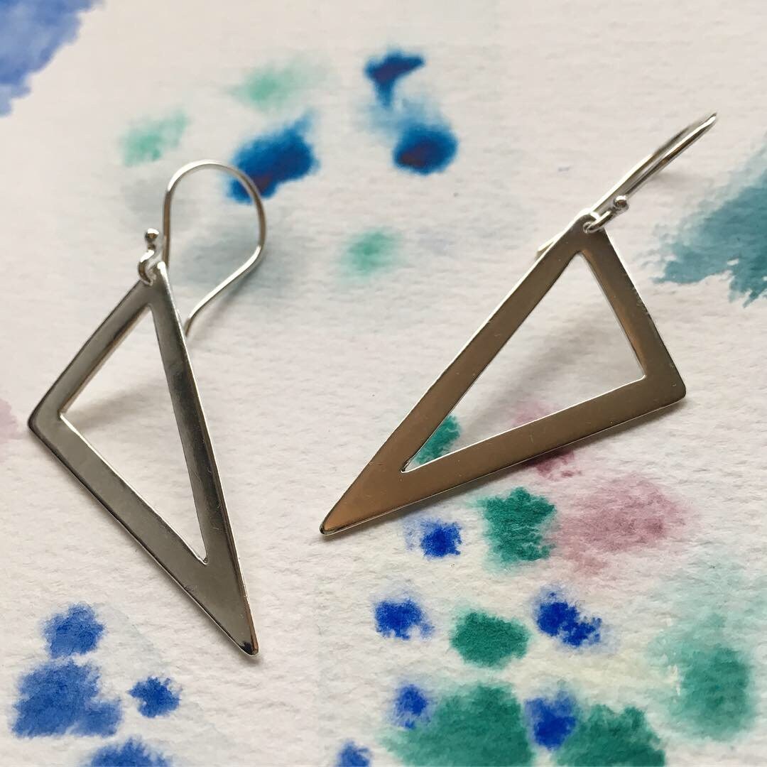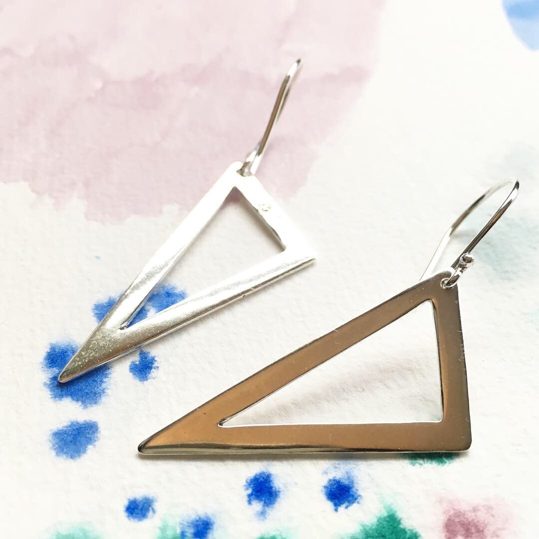 Minimalist, geometric large triangle drop earrings choice of sterling silver or bronze finish.