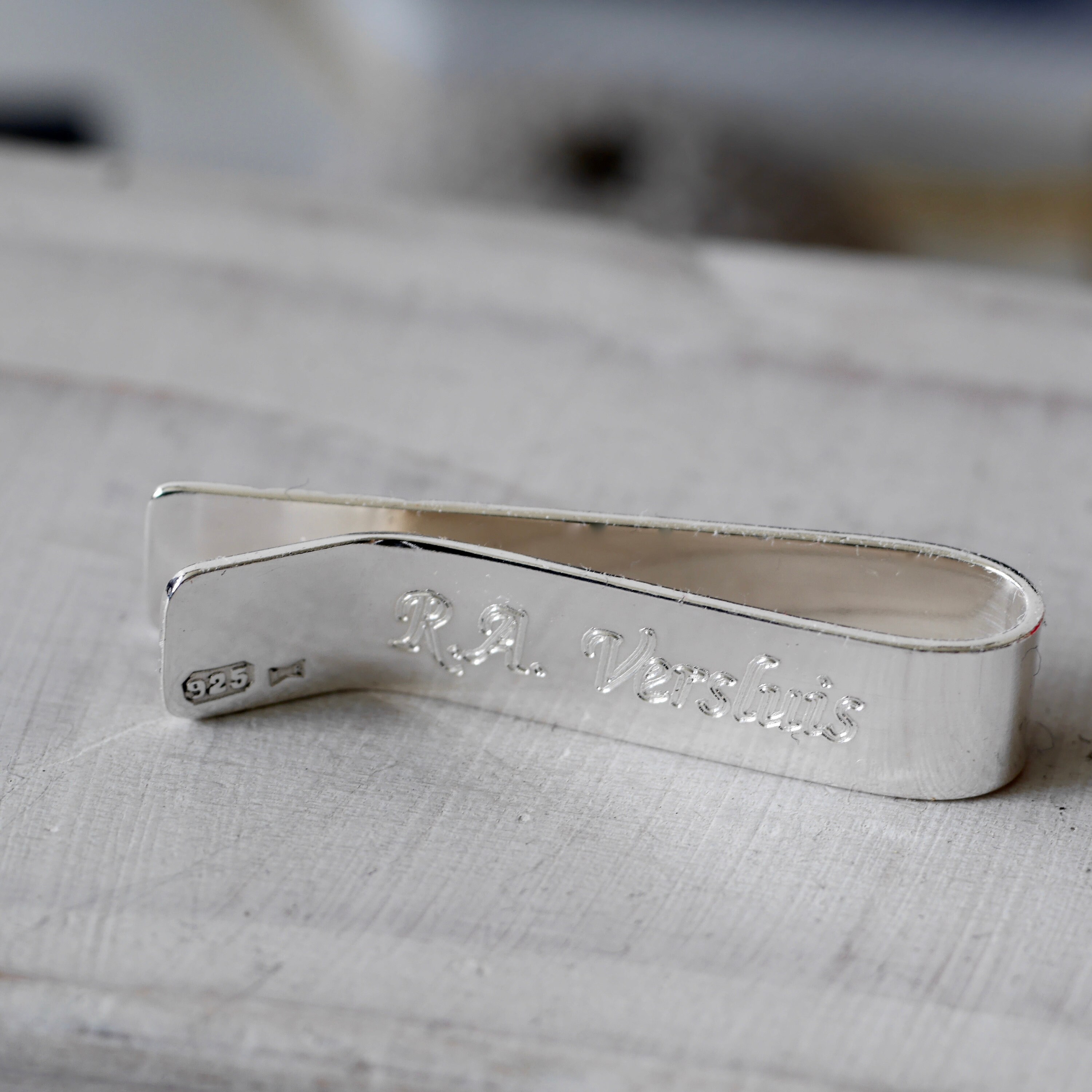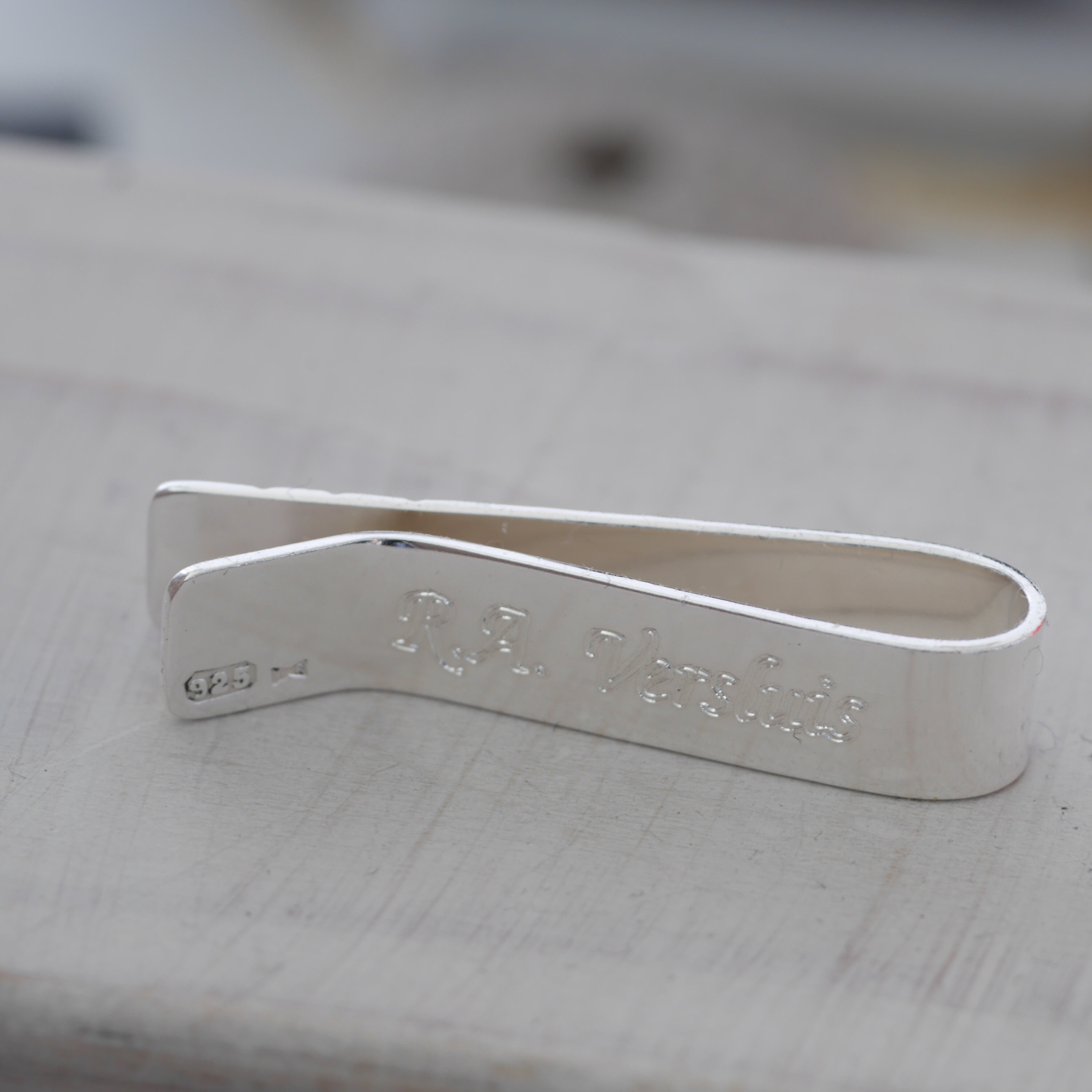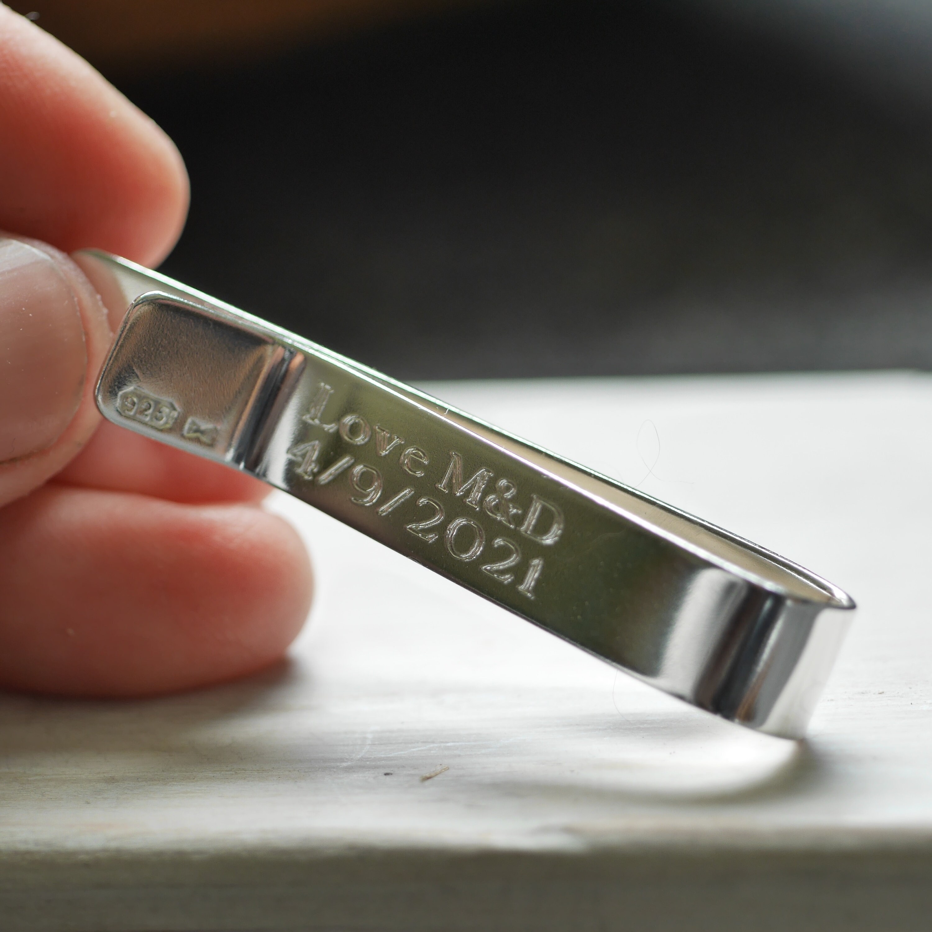 I will engrave your secret special message on a 0.9mm thick sterling silver tie clip.