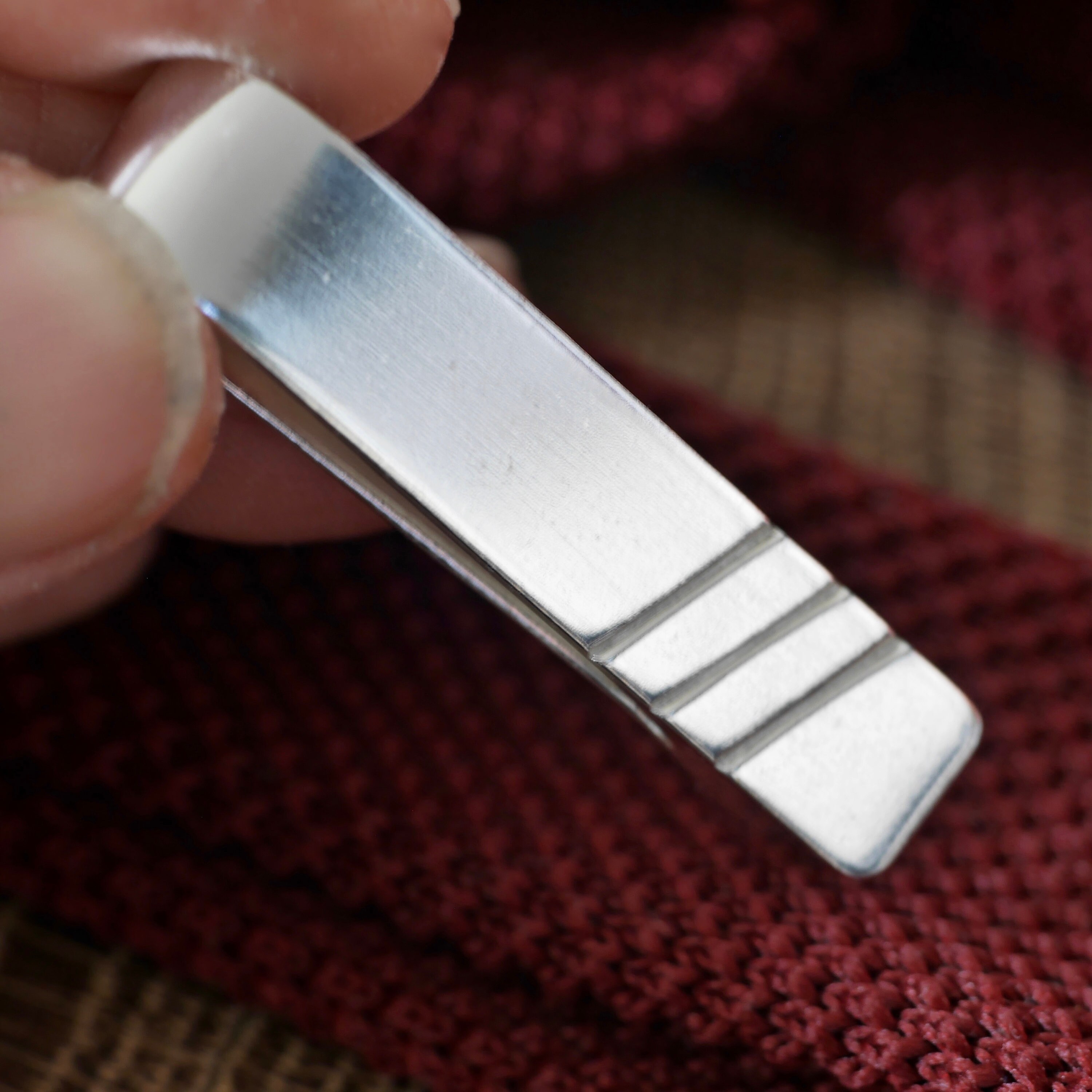 Handmade sterling silver personalised tie clip for him. This custom engraved silver tie bar is a great gift for weddings, Valentine's Day, Father's Day, birthdays and anniversaries.