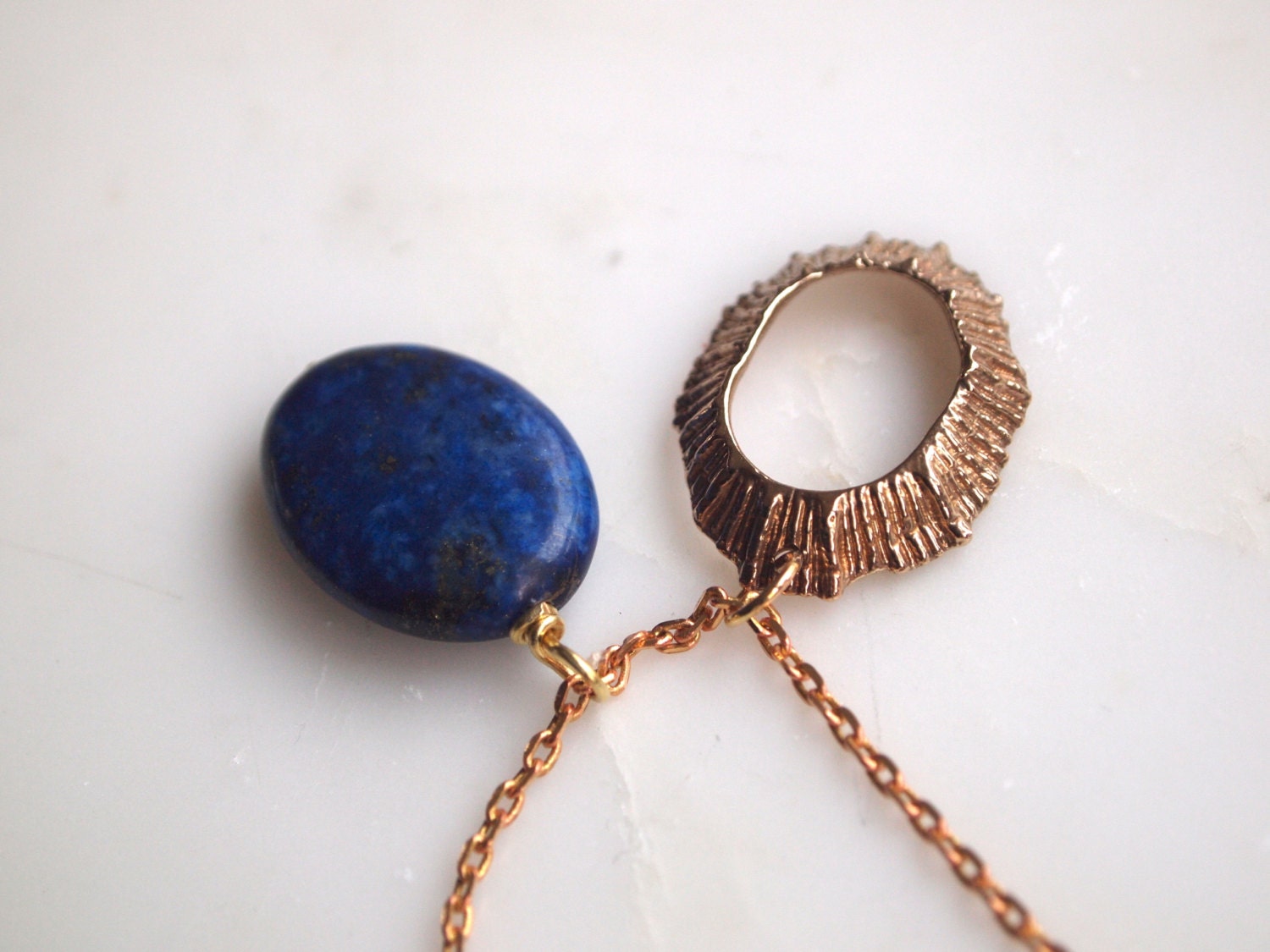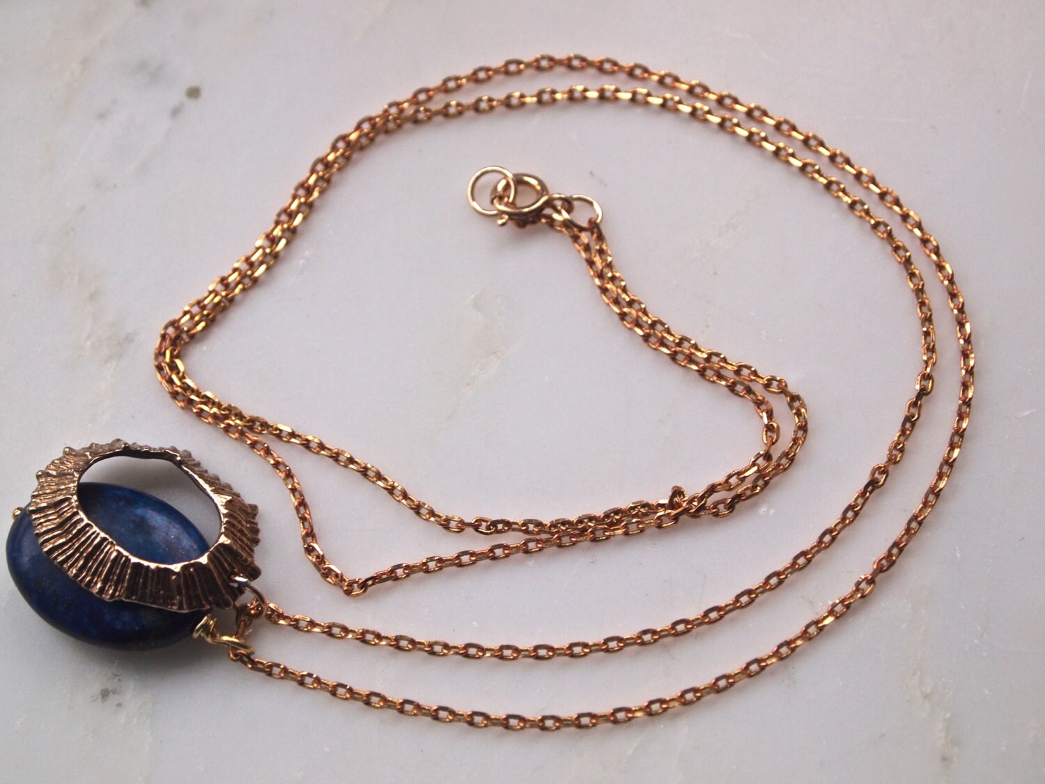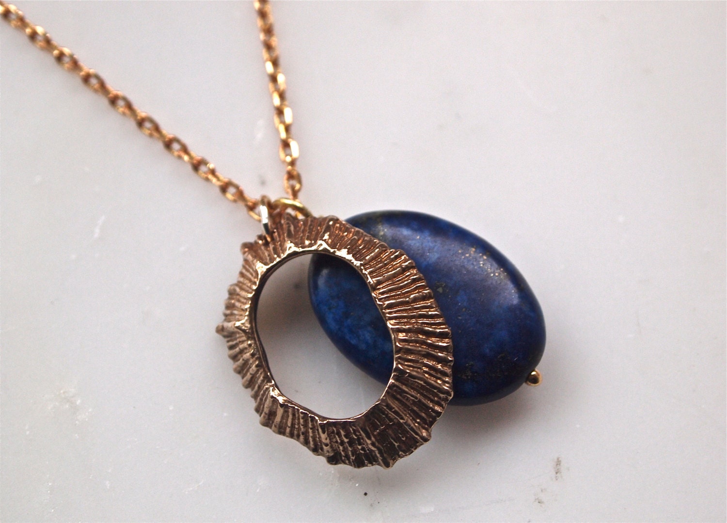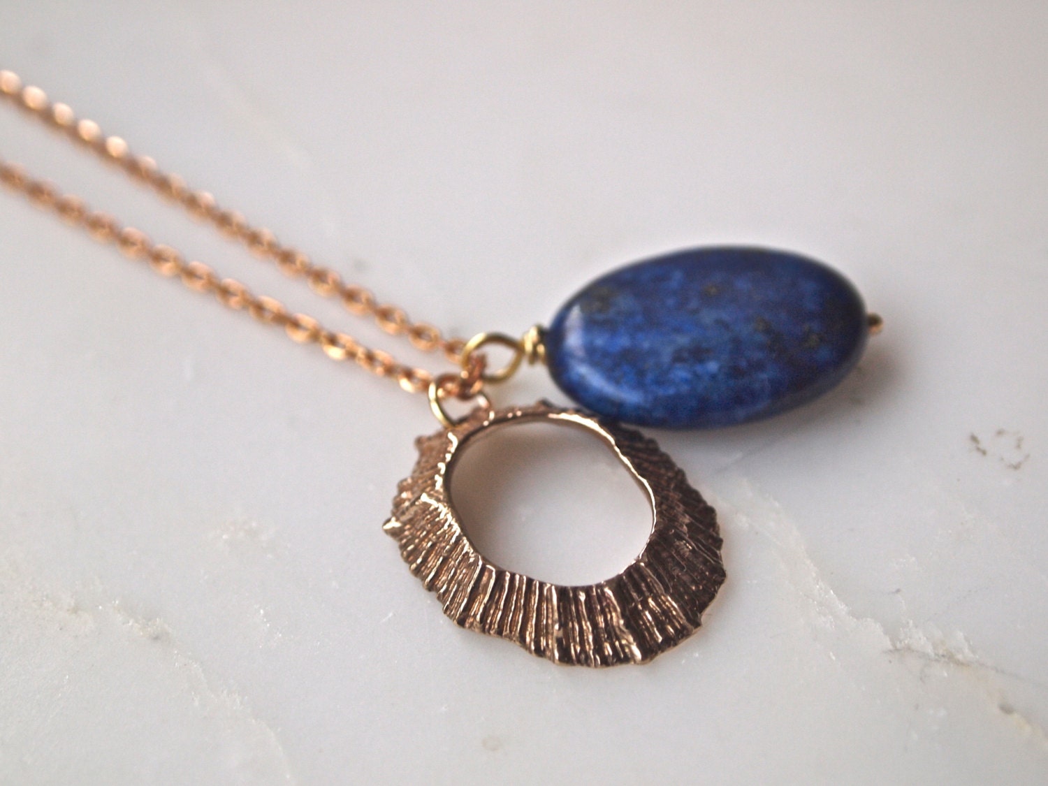 The centerpiece of this pendant is a stunning dark blue oval lapis lazuli gemstone, handpicked to complement the golden hue of the limpet charm. This versatile necklace is suitable for all occasions.