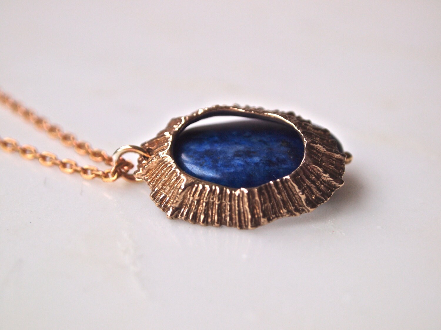 Large Limpet Shell Long Necklace - Gold Limpet Pendant - Marine Biology Jewelry - Large Limpet Gold Long Necklace with a Beautiful Lapis Lazuli Gemstone Choice.