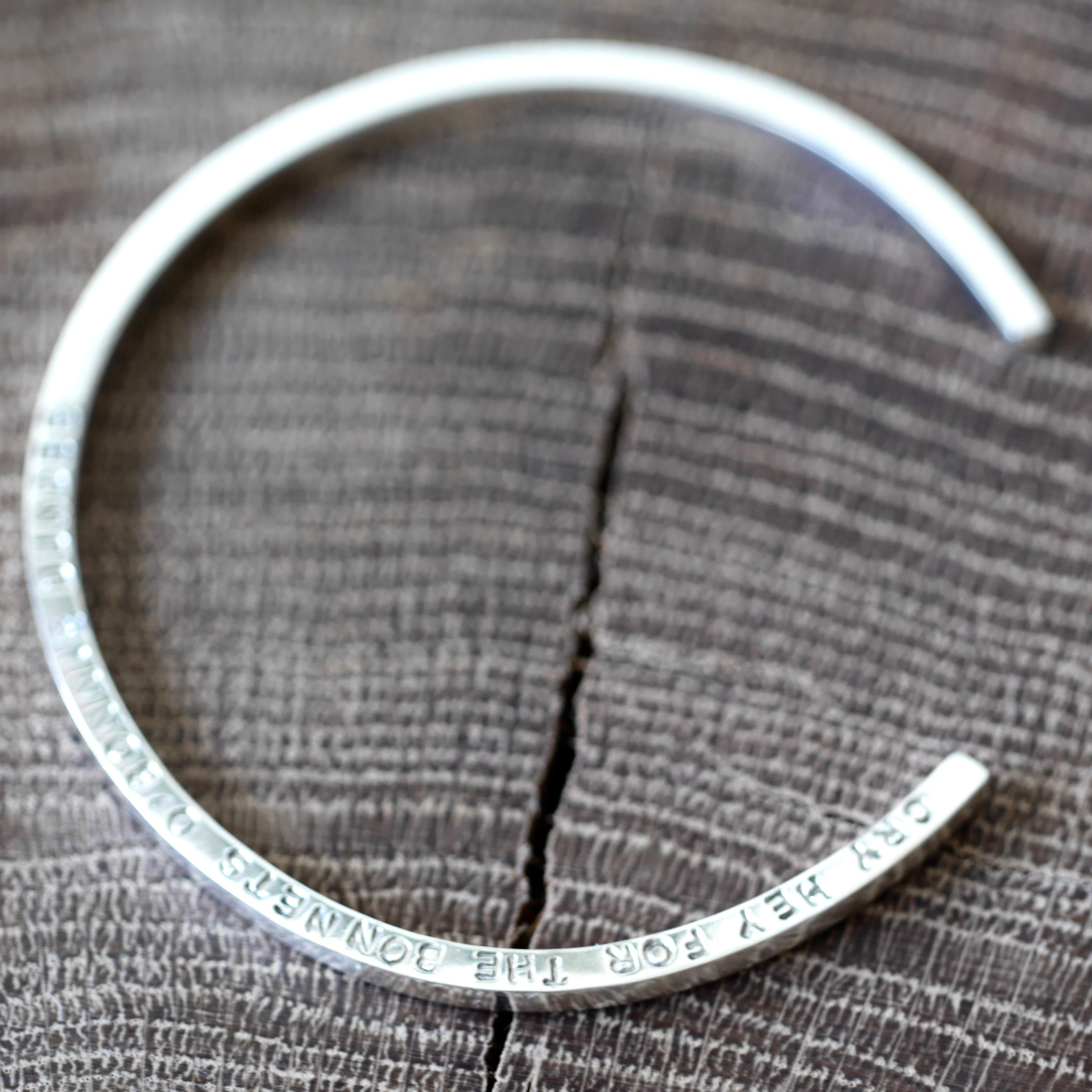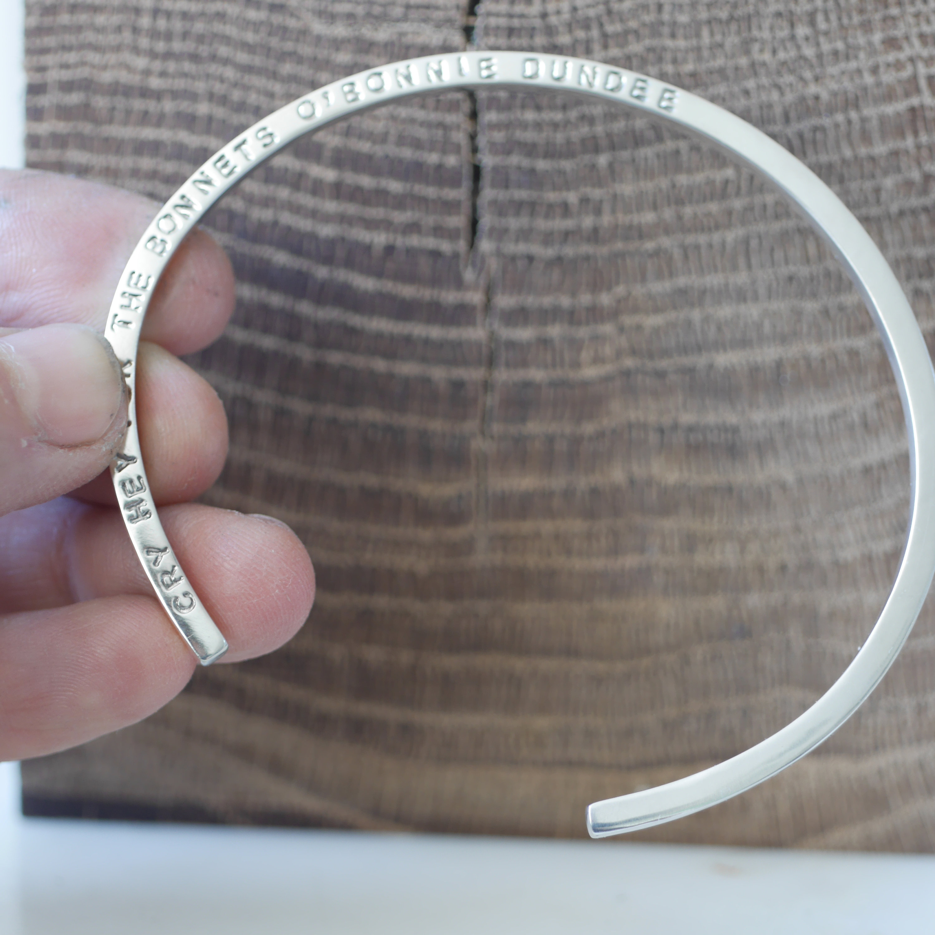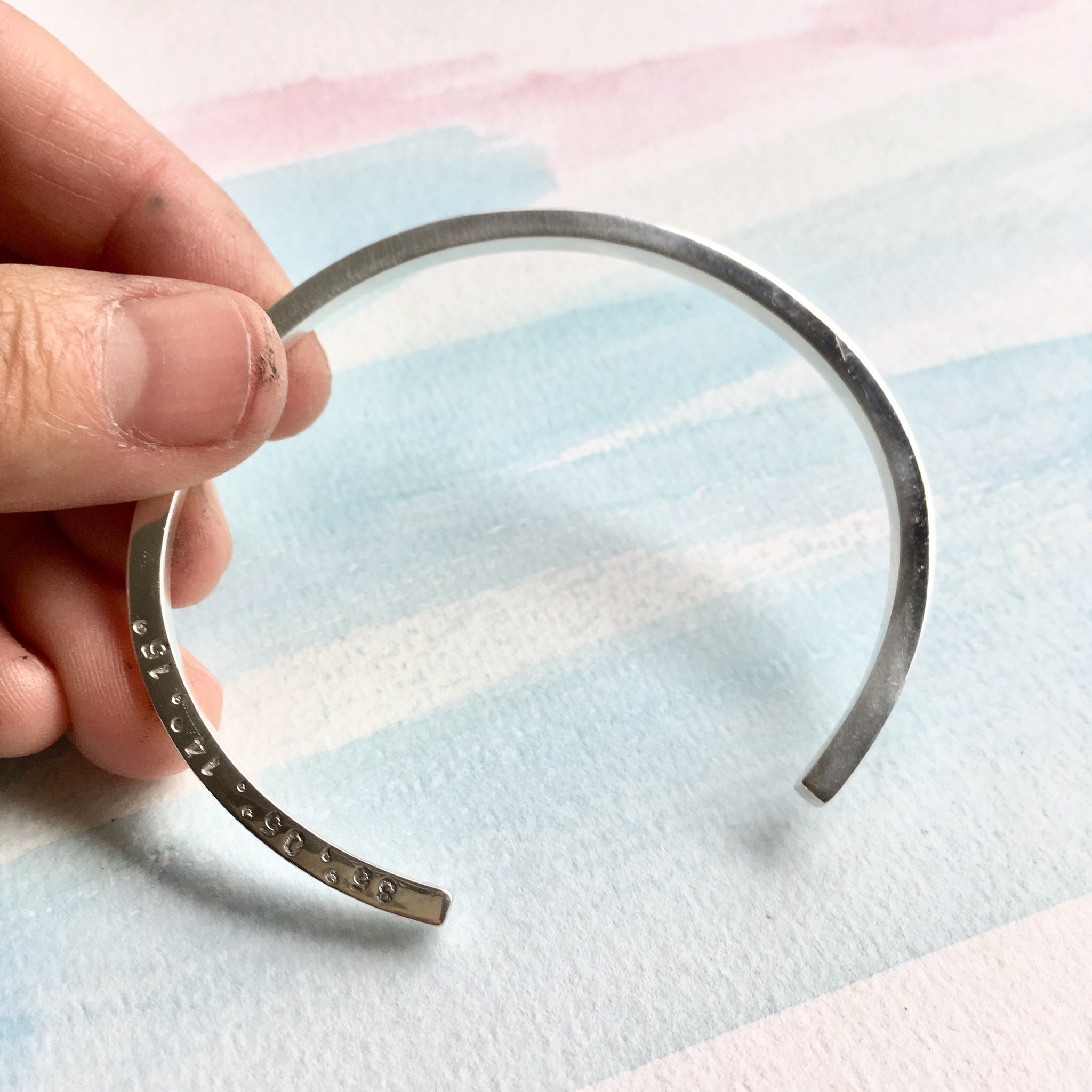You can fit 50 letters in each cuff. Please think of some words you would like to be stamped, such as poems, lyrics, or simple messages.