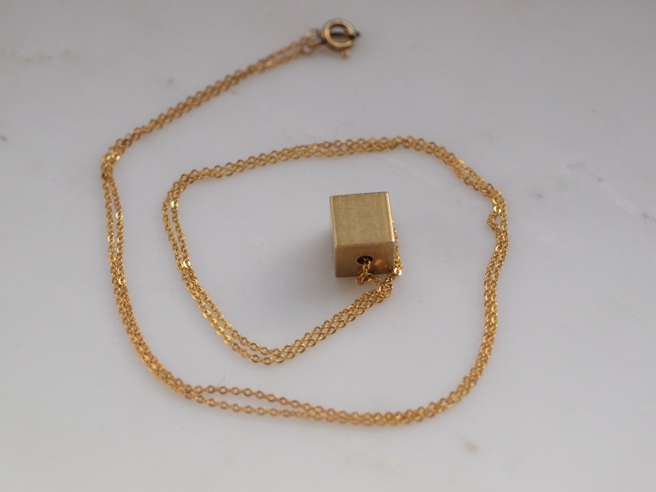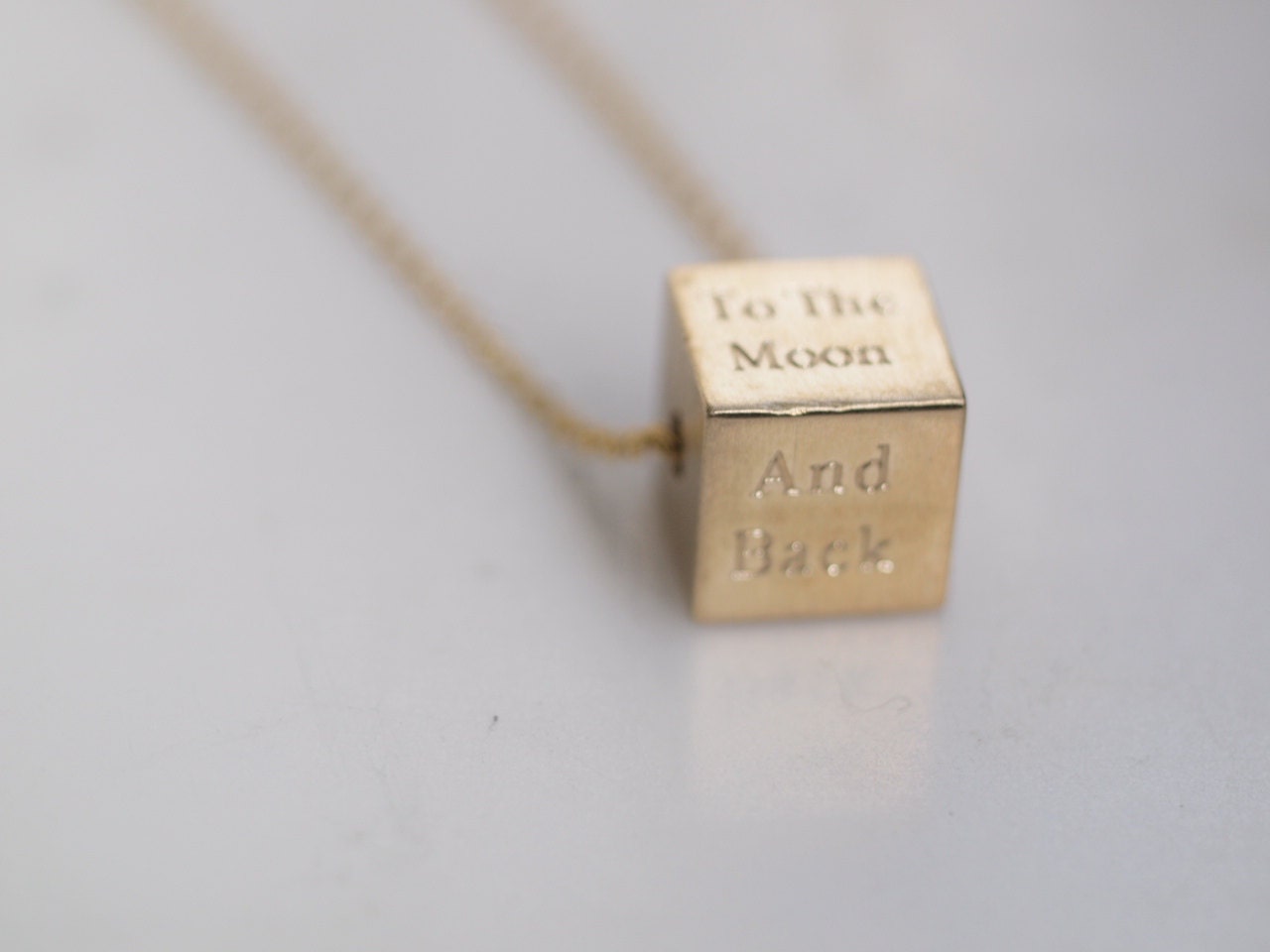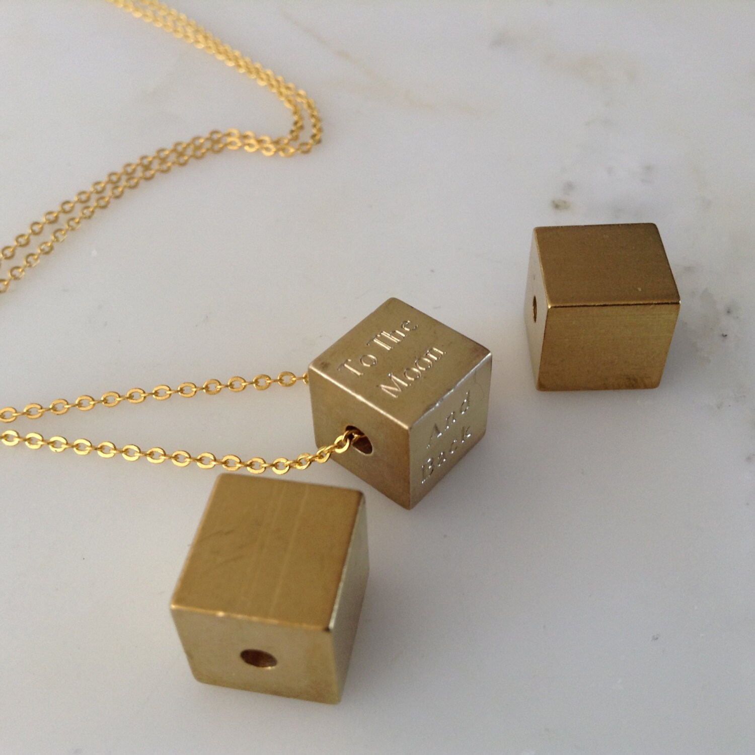 Personalised 3D Brass Cube Necklace- Engraved minimalist Cube pendant - Custom Geometric Cube jewellery with choice of gold filled or sterling silver chain finish.