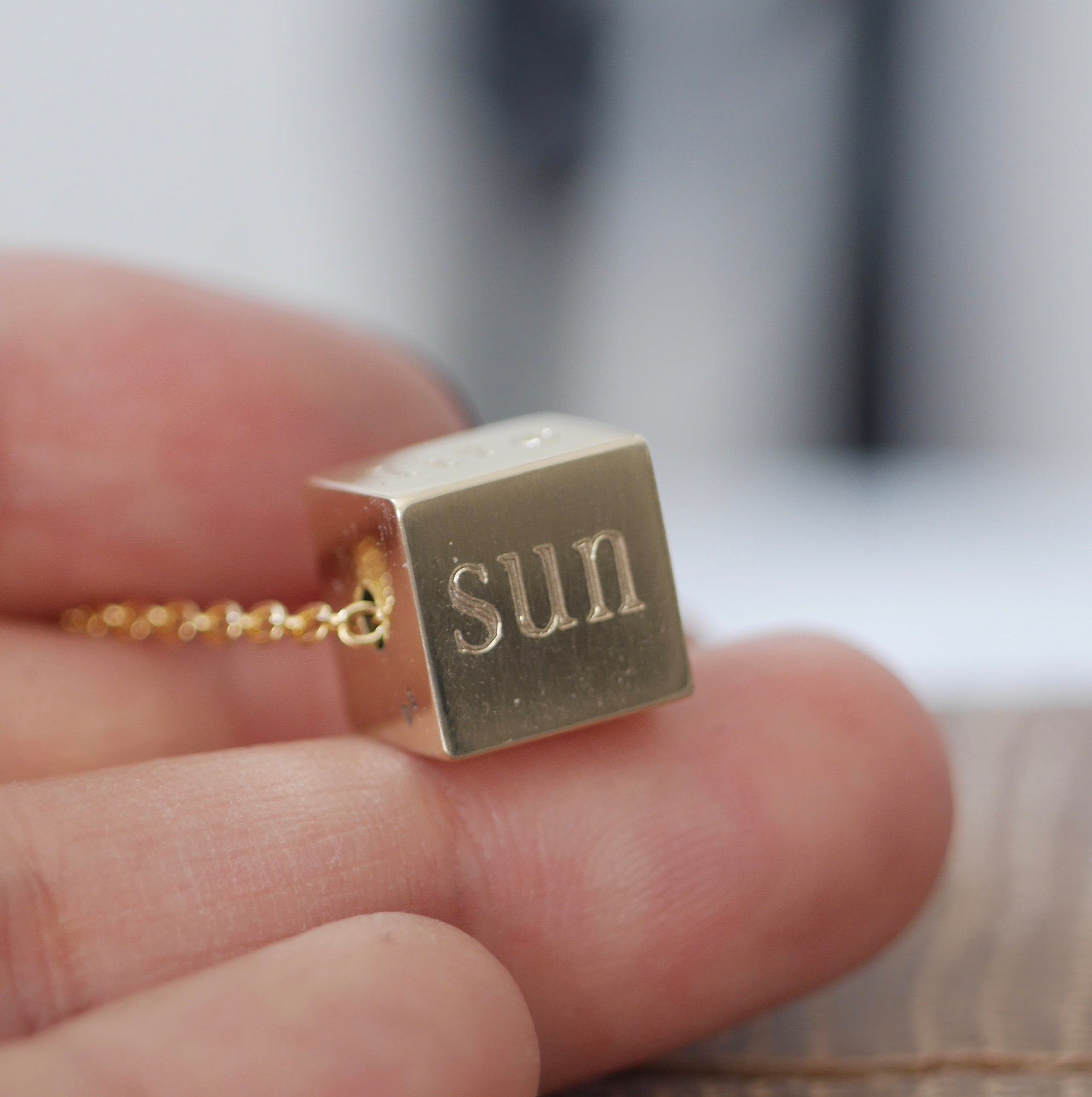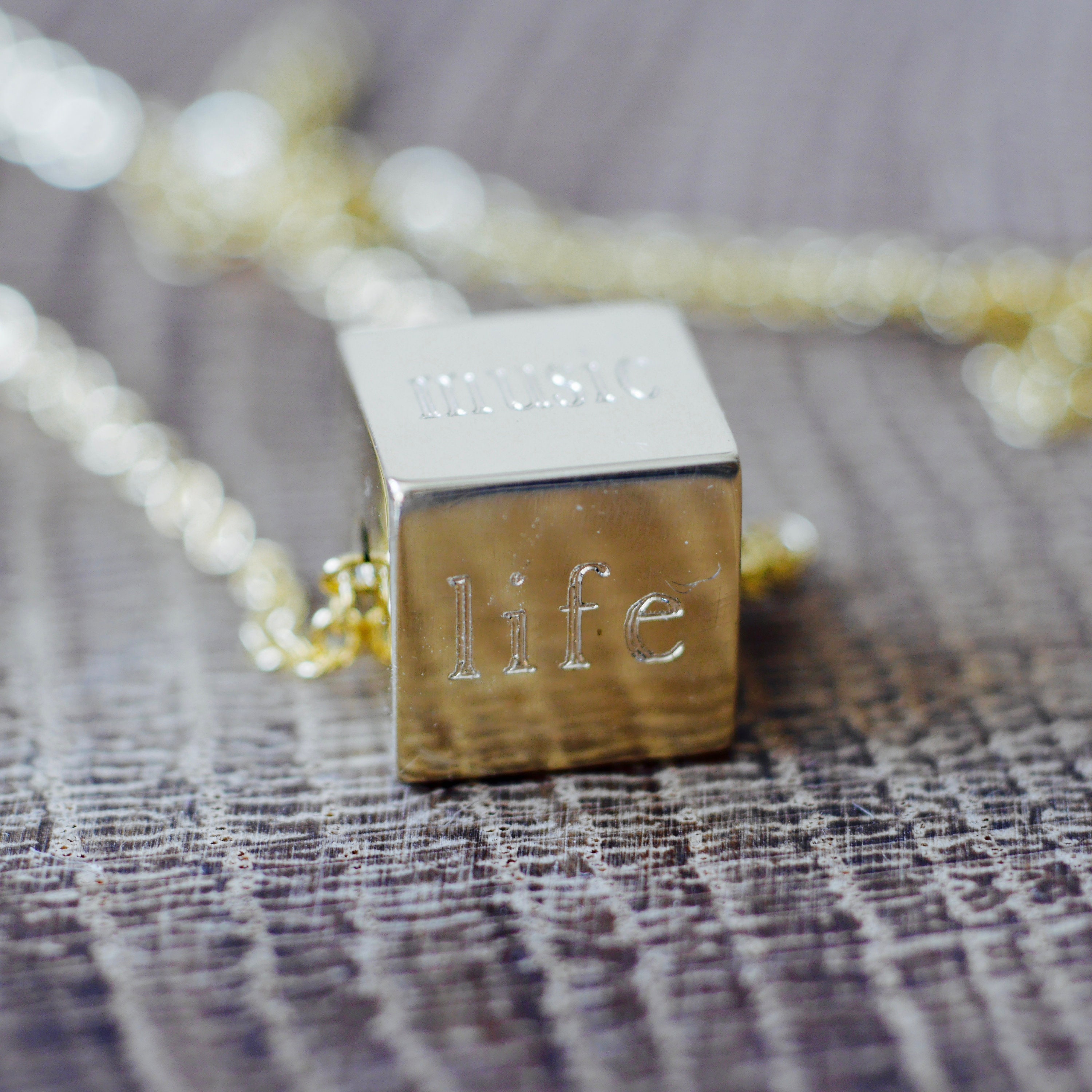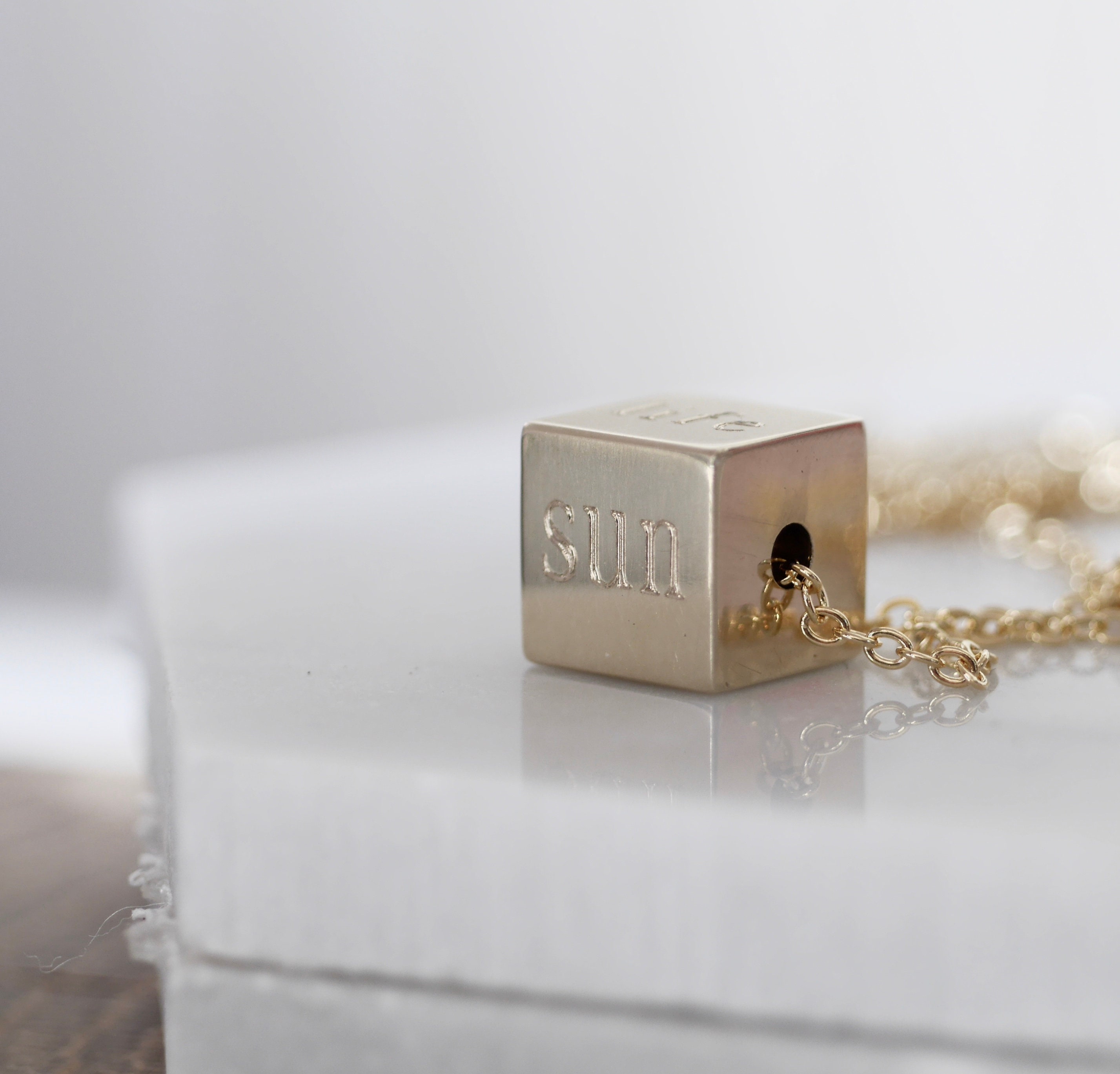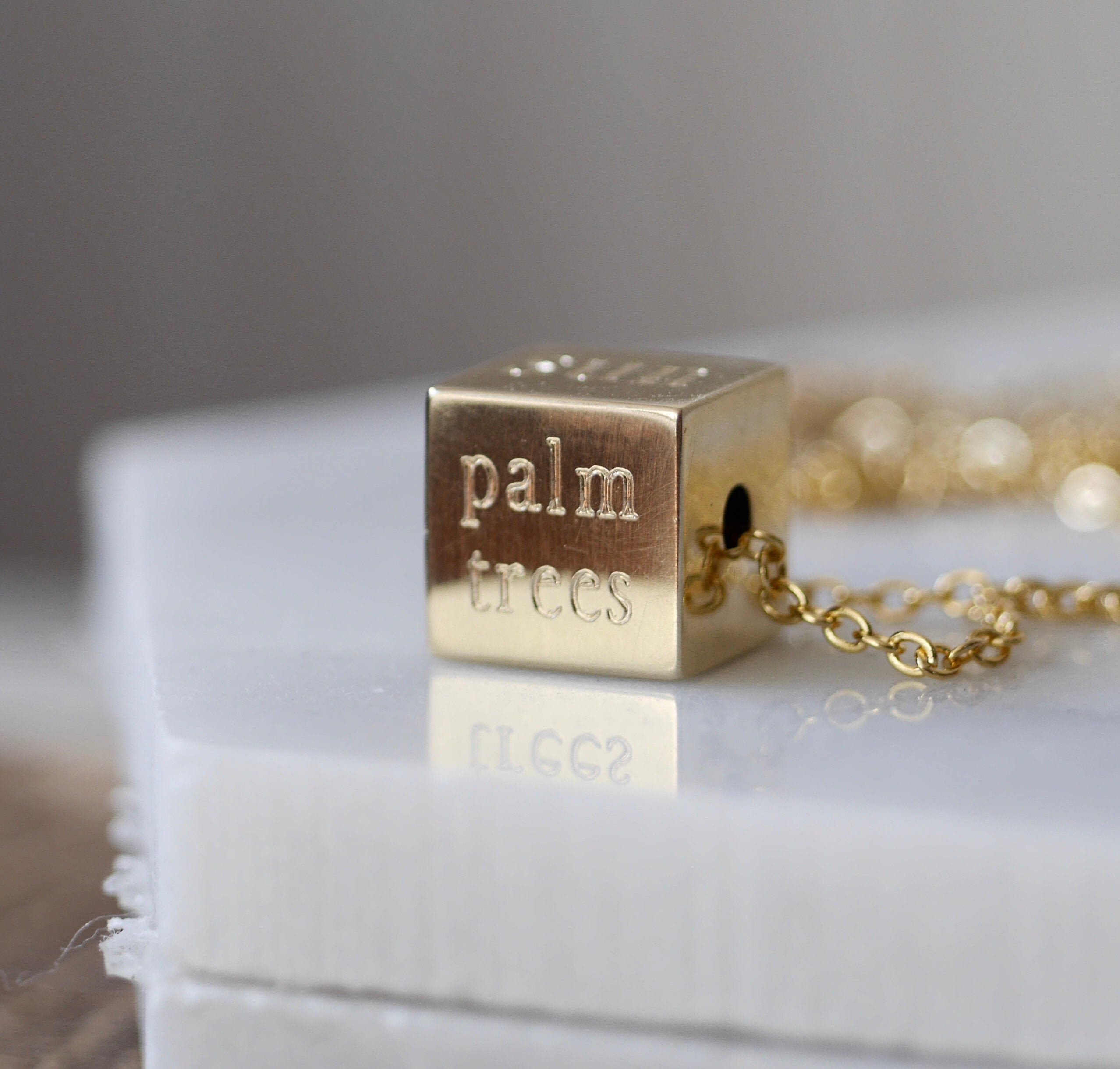 Personalised 3D Brass Cube Necklace- Engraved minimalist Cube pendant - Custom Geometric Cube jewellery with choice of gold filled or sterling silver chain finish.