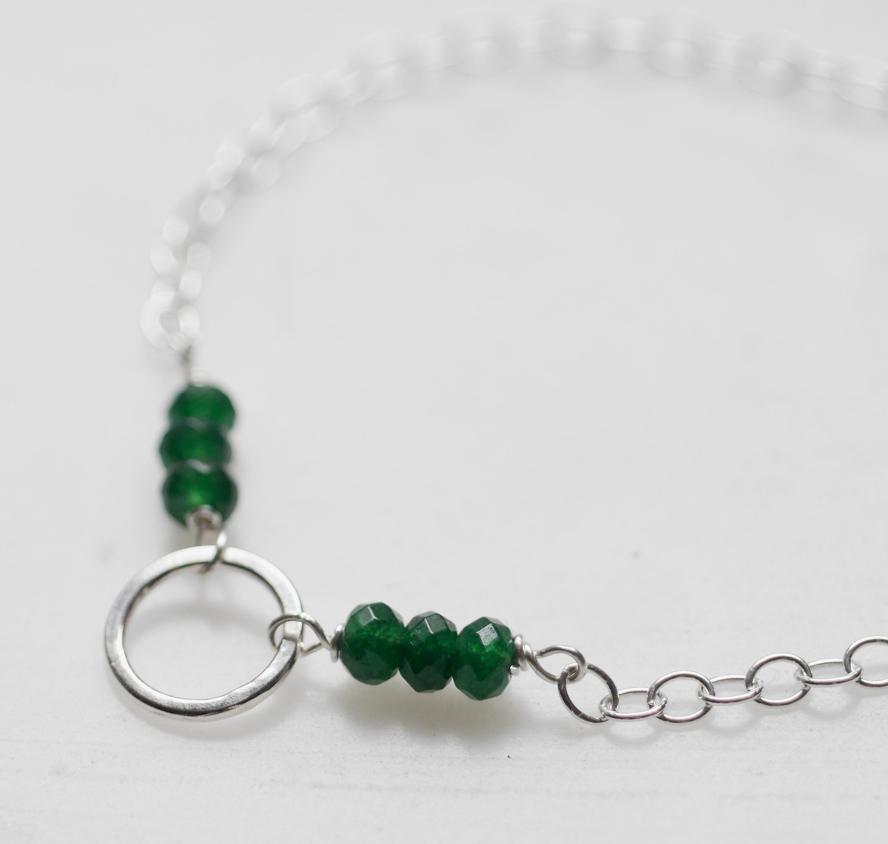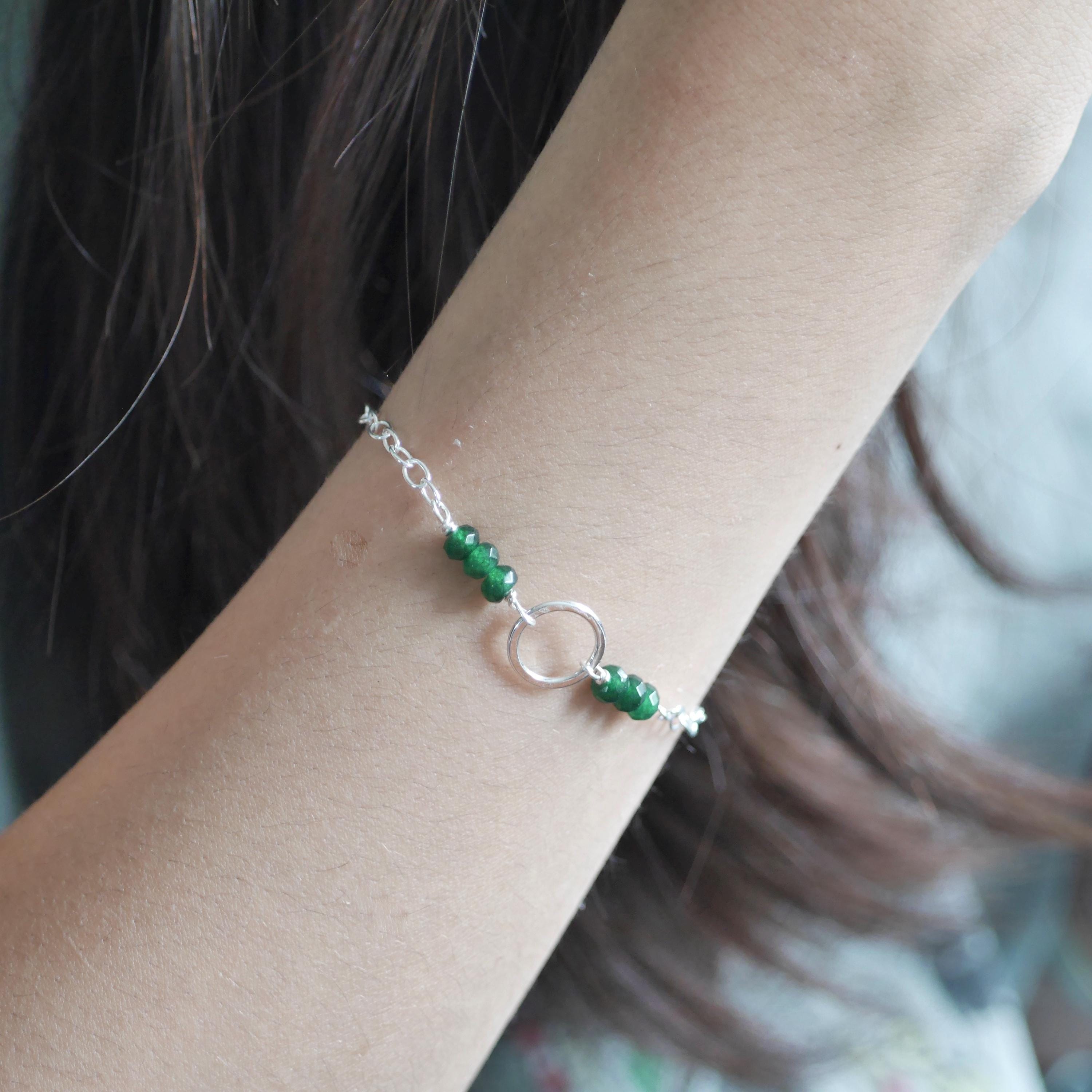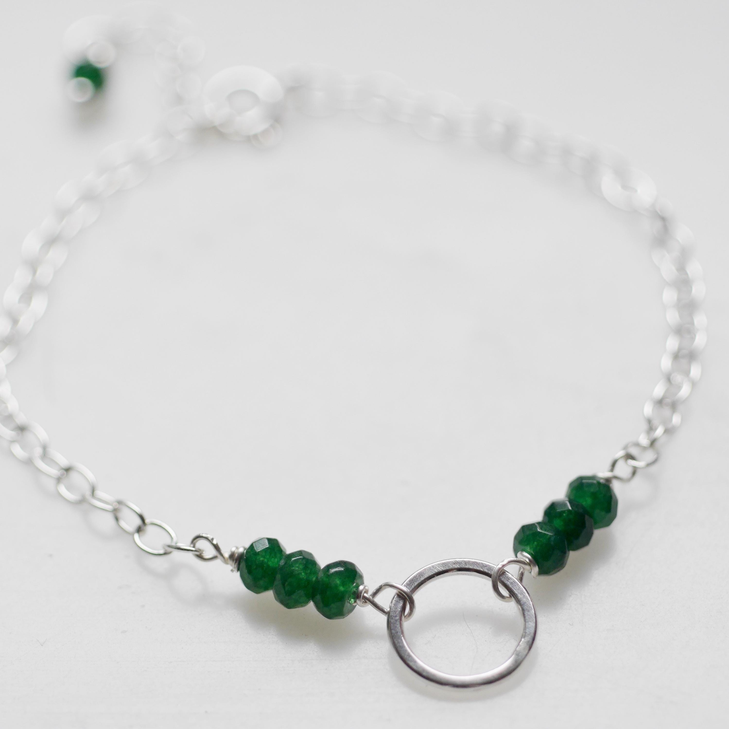 Emerald and Sterling Silver Circle Charm Adjustable Bracelet – Elegant Gemstone Jewellery- Daianty May Brithstone Jewellery, Adjustable Gemstone Gift for Her, Layering Bracelet