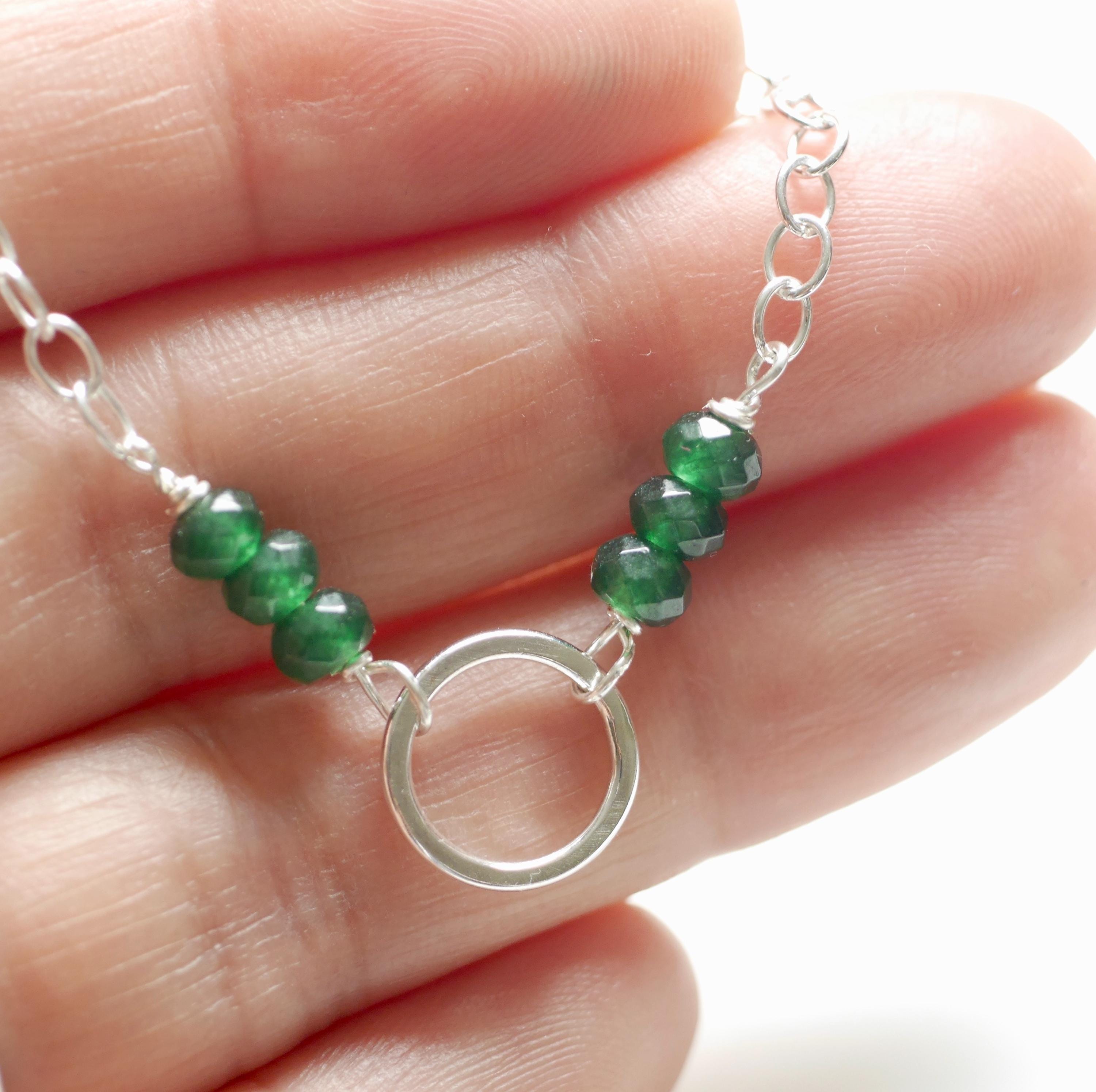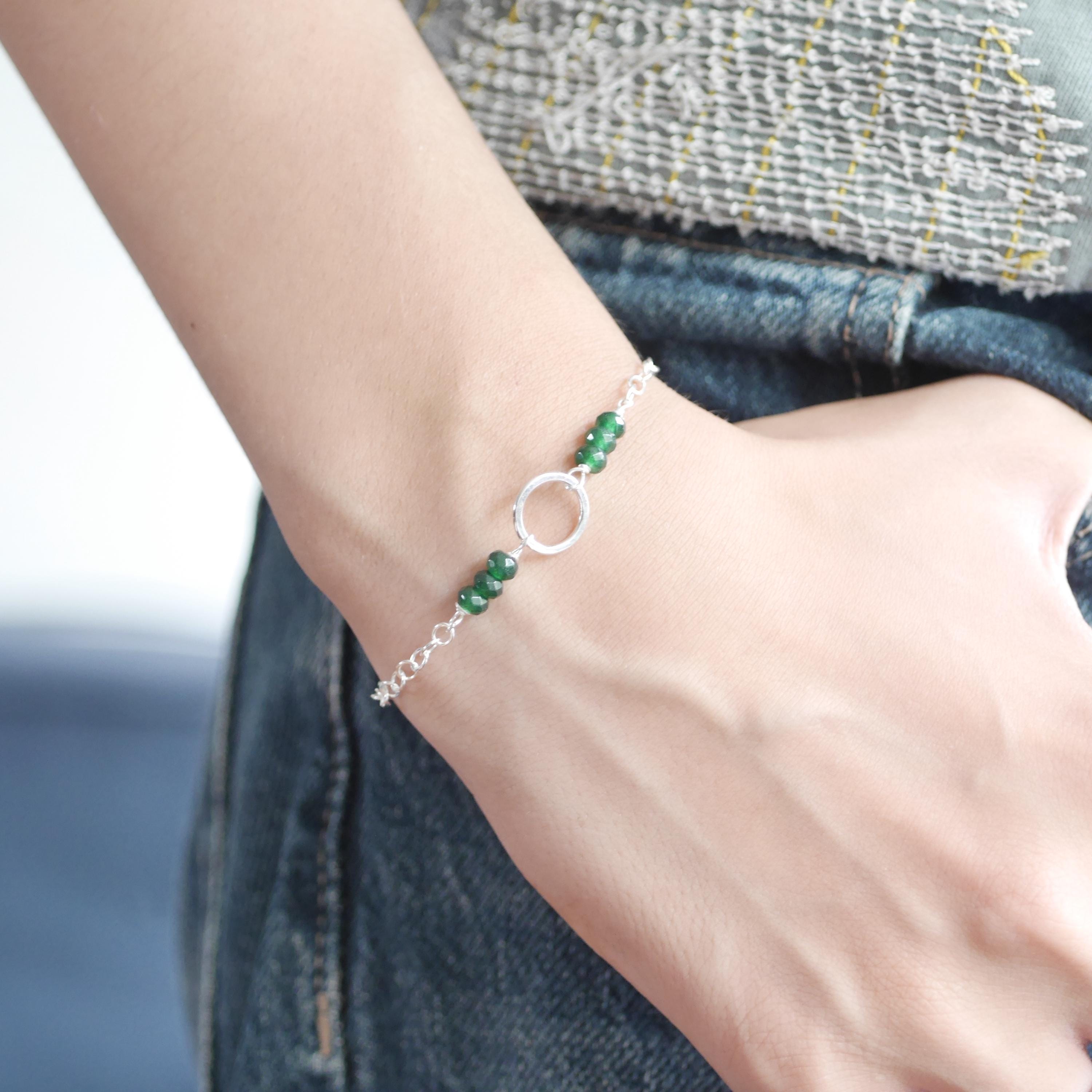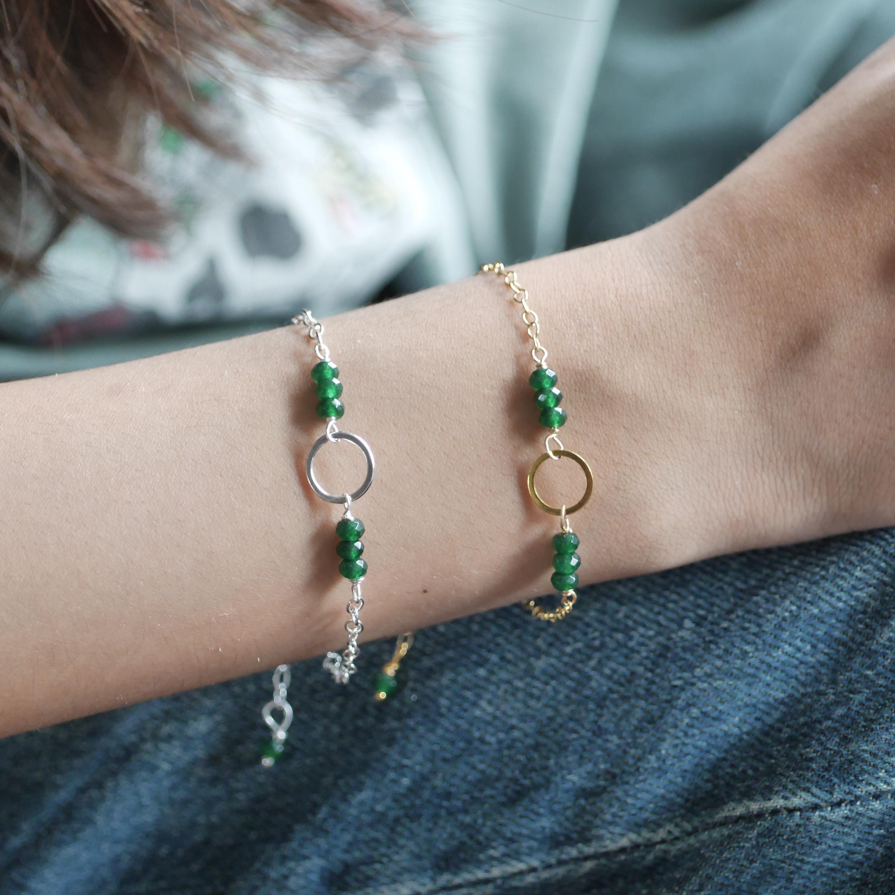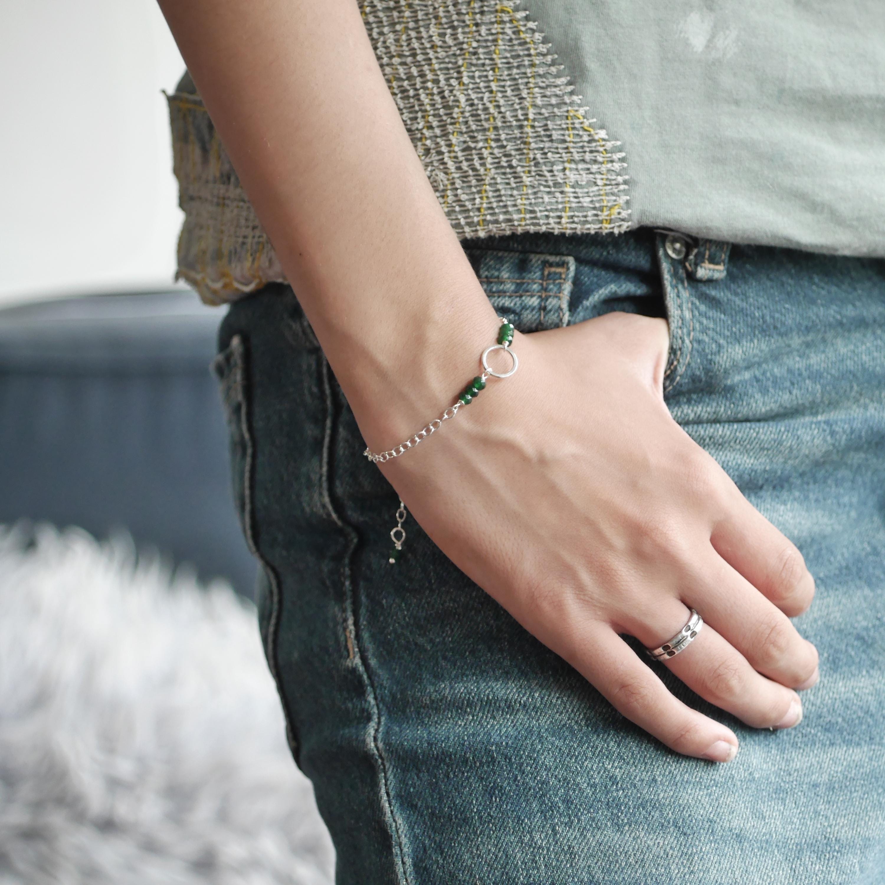 Emerald and Sterling Silver Circle Charm Adjustable Bracelet – Elegant Gemstone Jewellery- Daianty May Brithstone Jewellery, Adjustable Gemstone Gift for Her, Layering Bracelet