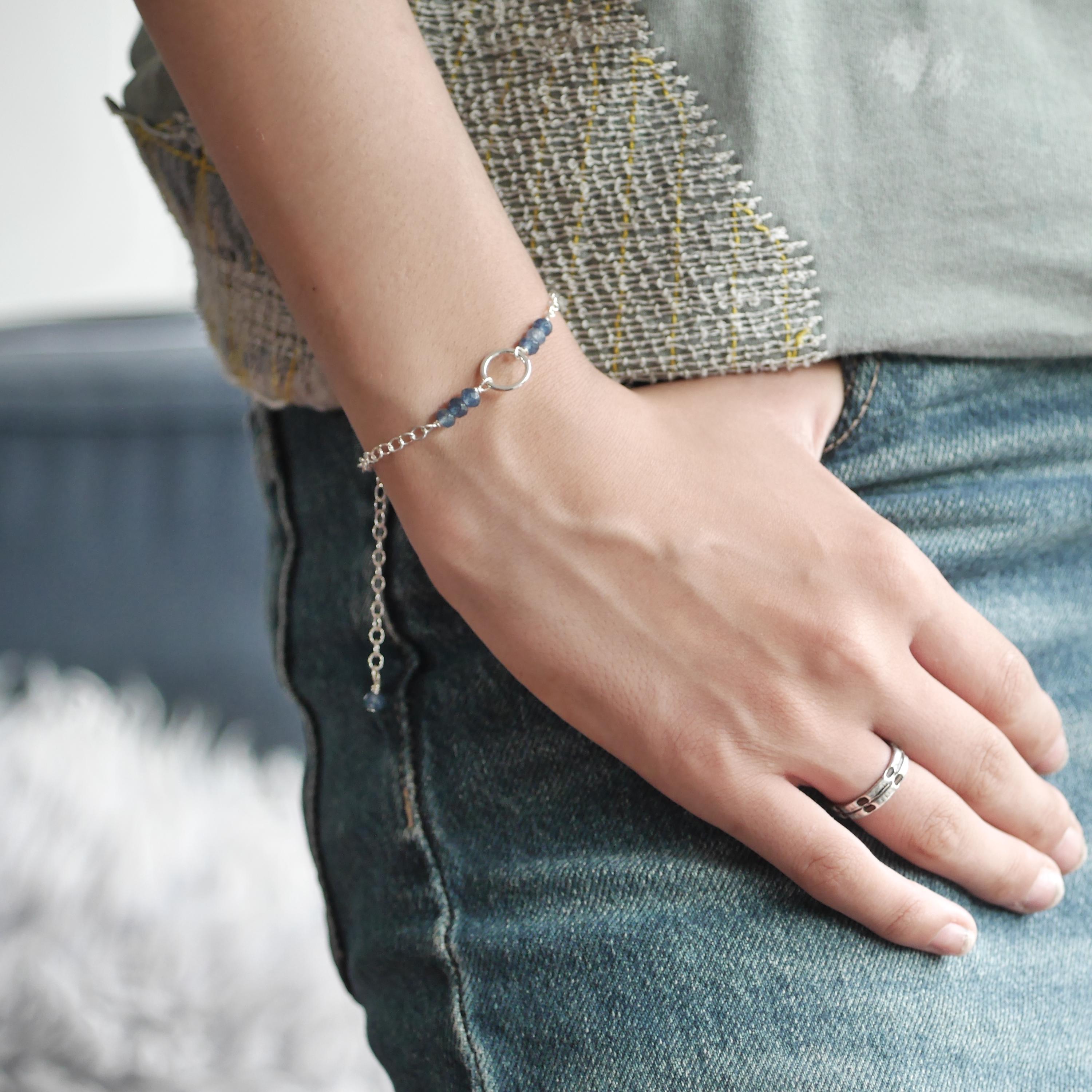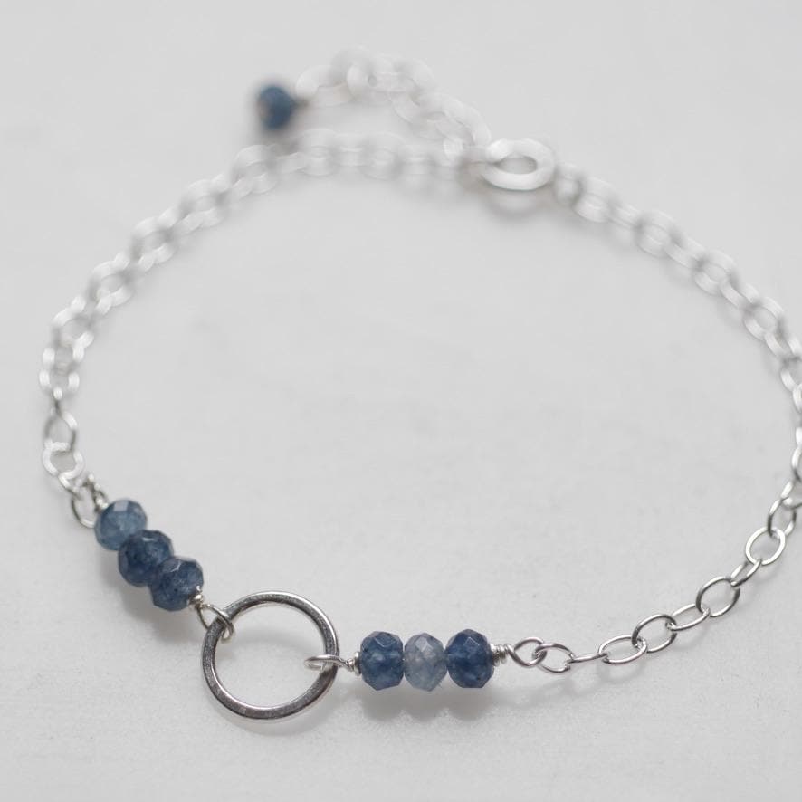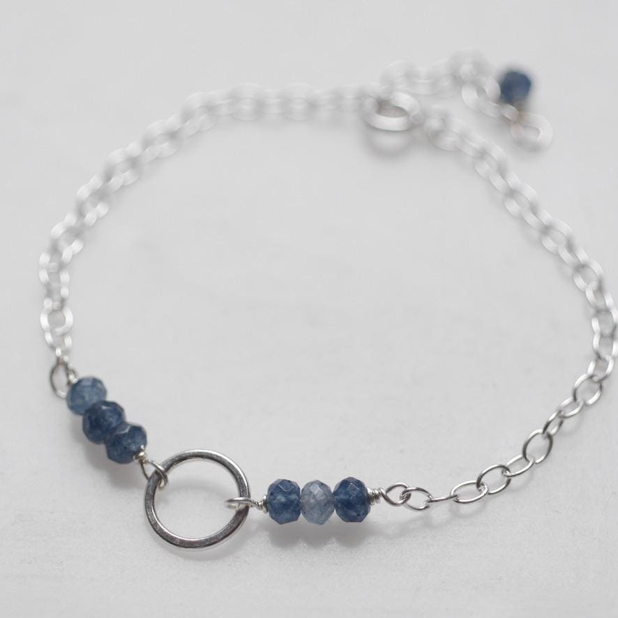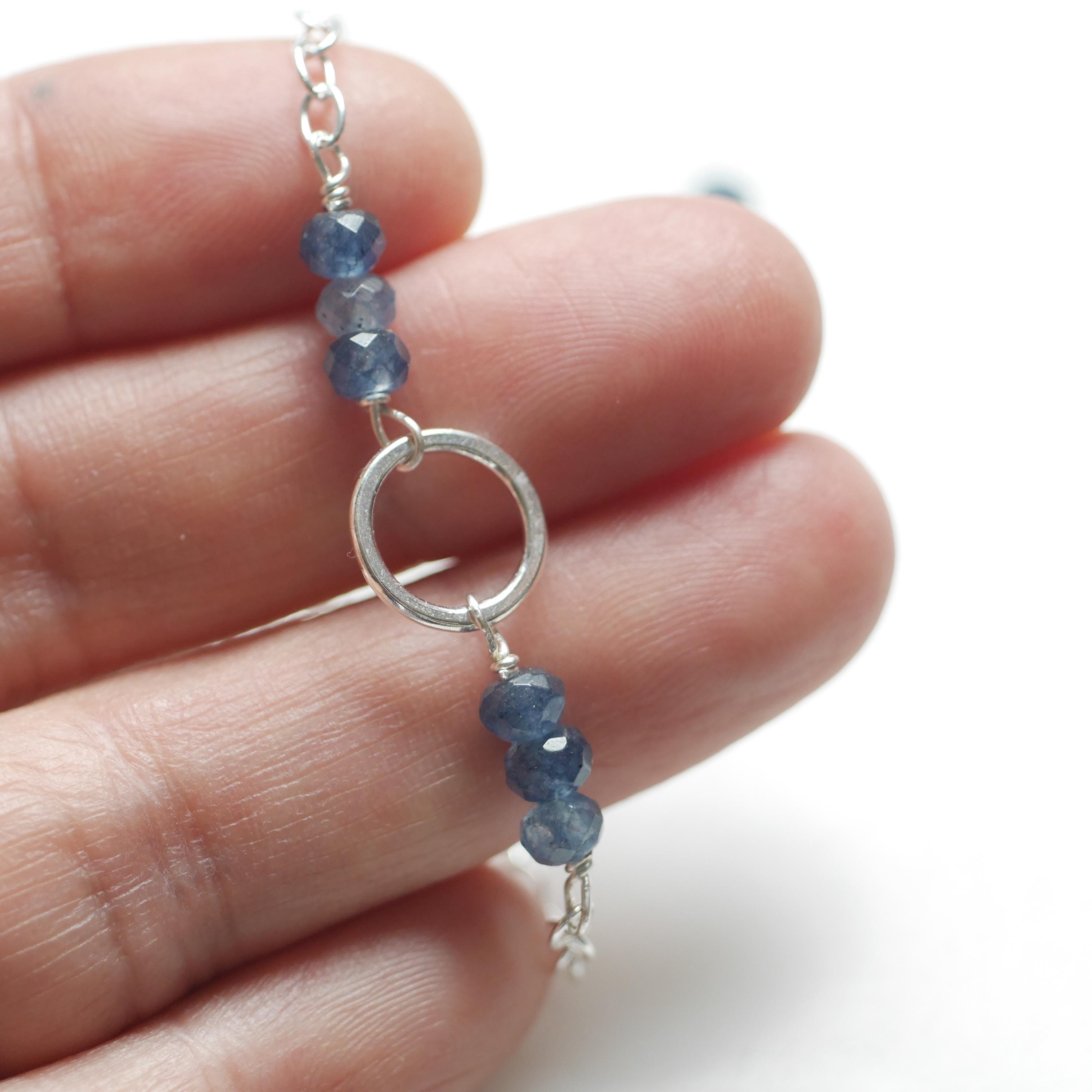 Delicate and dainty, this adjustable sterling silver bracelet features 4mm faceted light blue sapphire beads and a handmade silver circle charm, carefully crafted by me. Perfect for a September birthday, sapphire is the birthstone of the month and makes a thoughtful and meaningful gift.