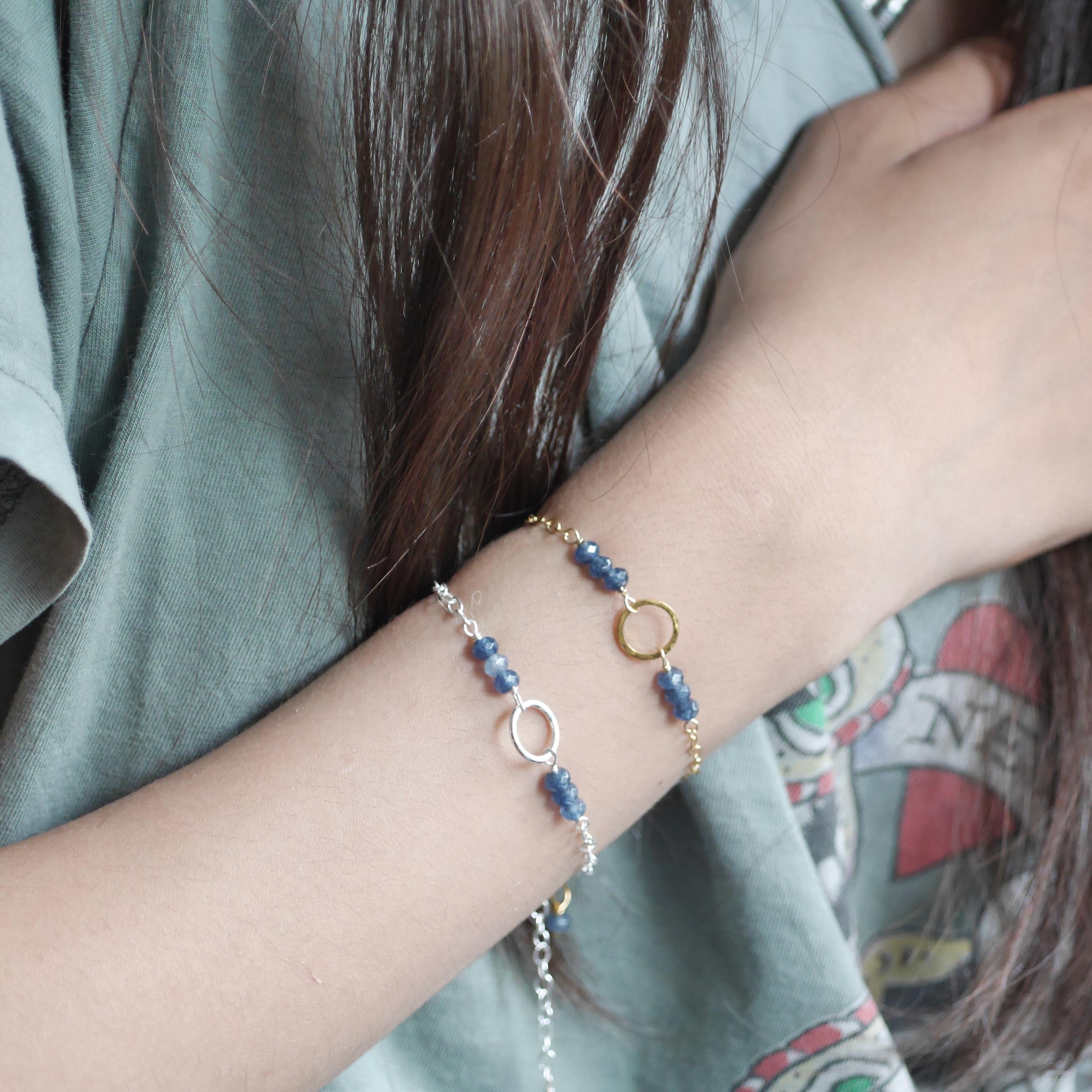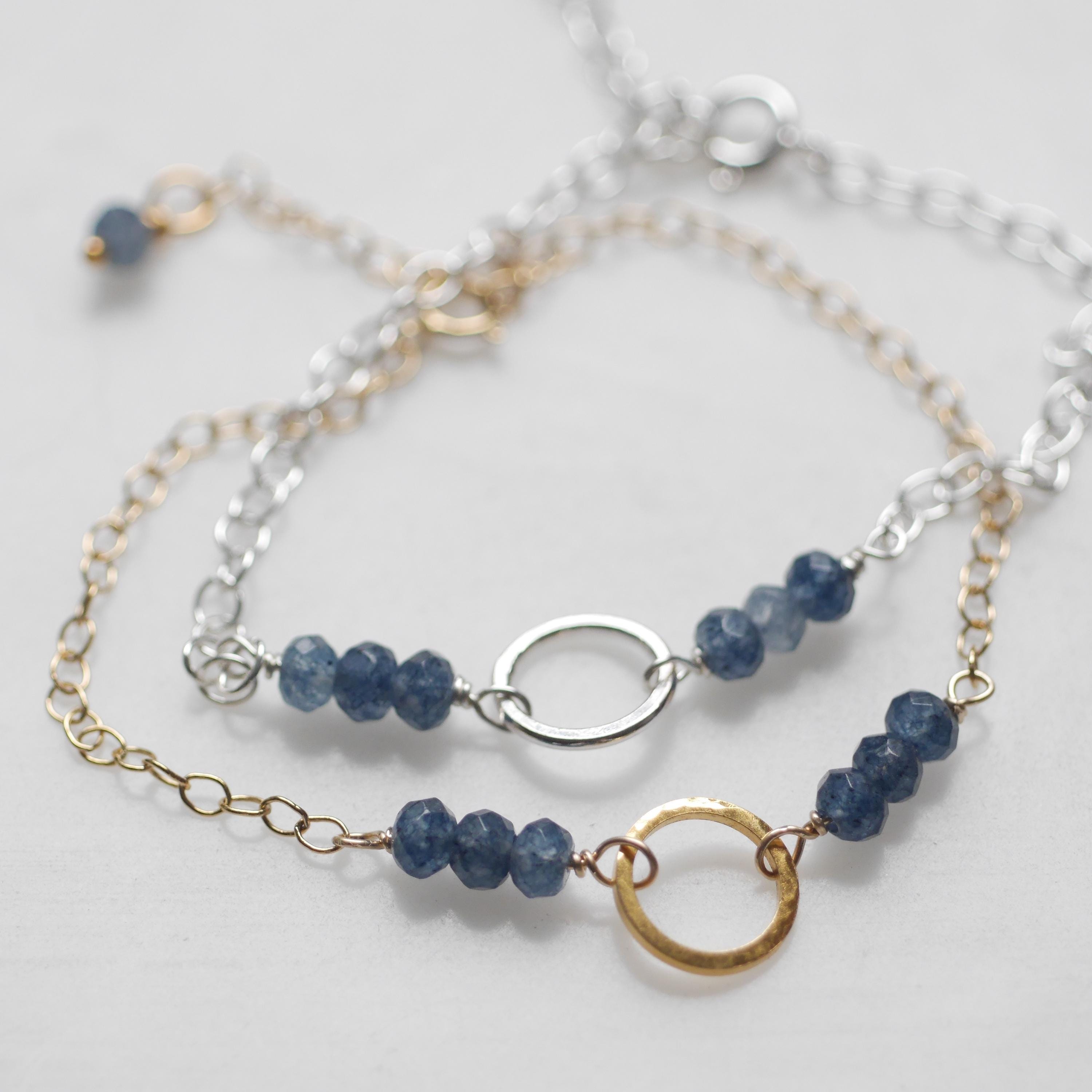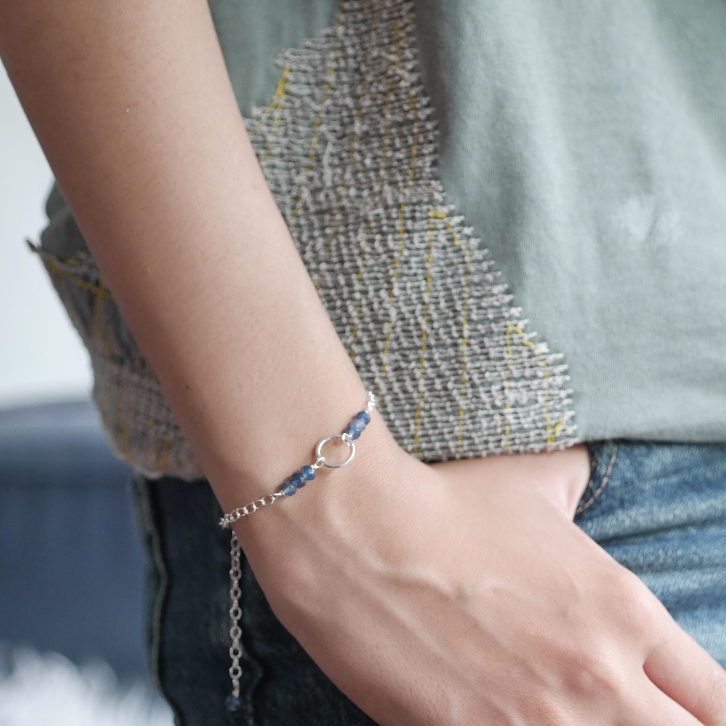 Delicate and dainty, this adjustable sterling silver bracelet features 4mm faceted light blue sapphire beads and a handmade silver circle charm, carefully crafted by me. Perfect for a September birthday, sapphire is the birthstone of the month and makes a thoughtful and meaningful gift.