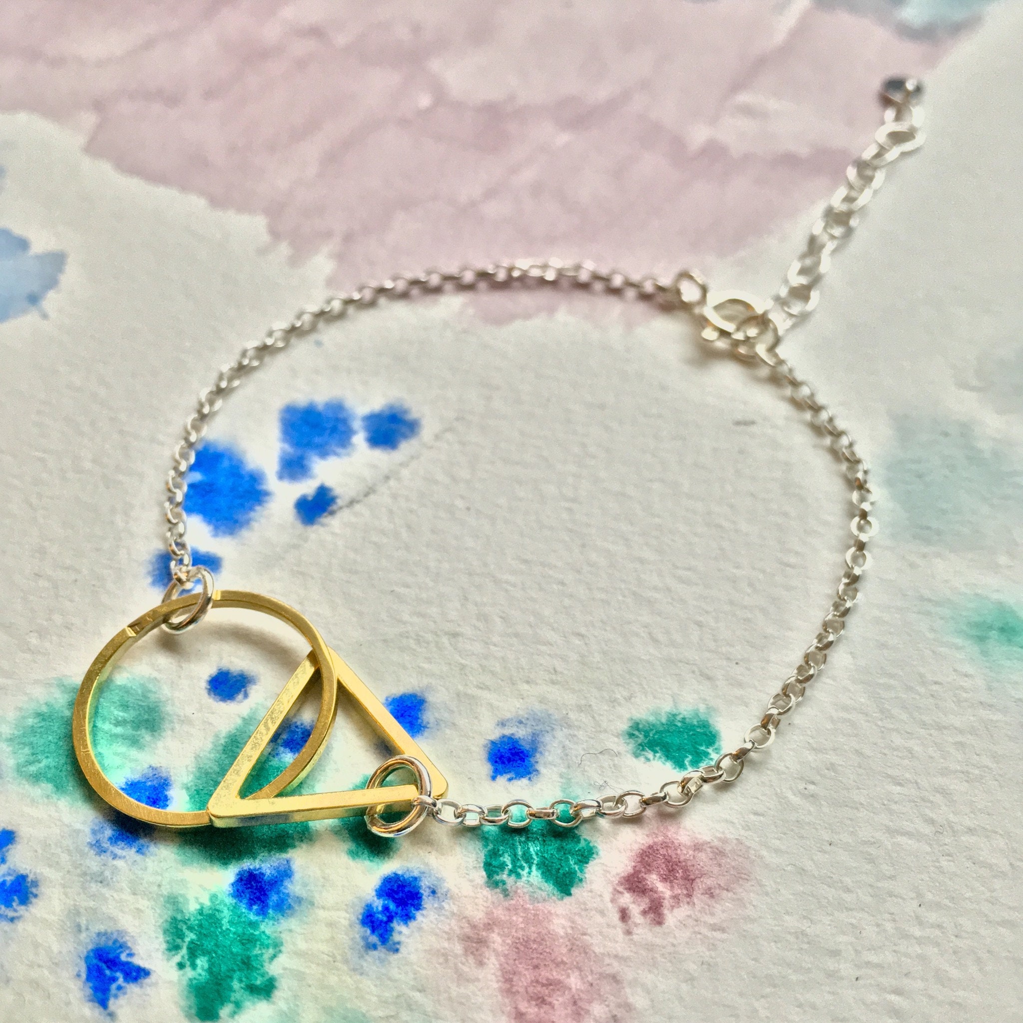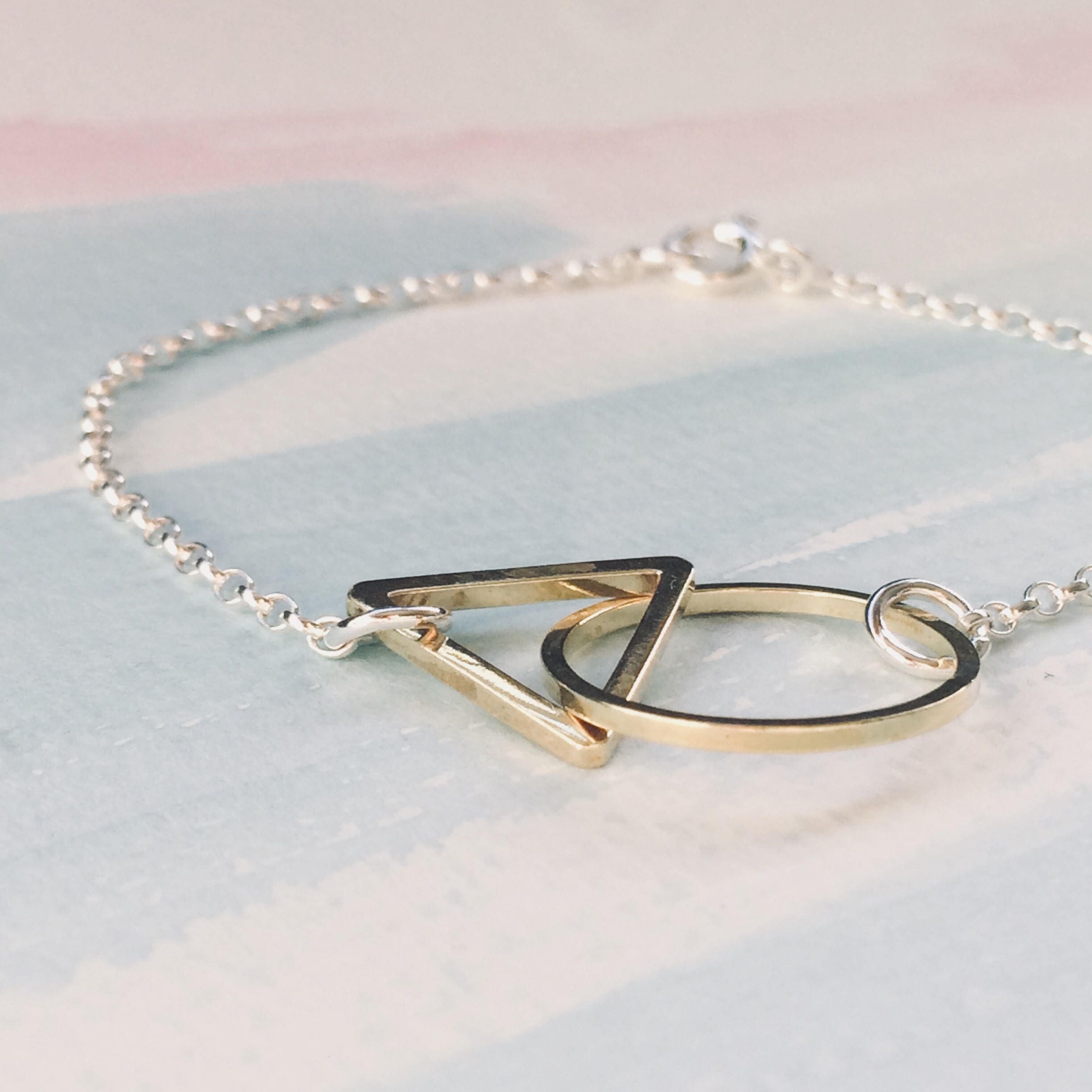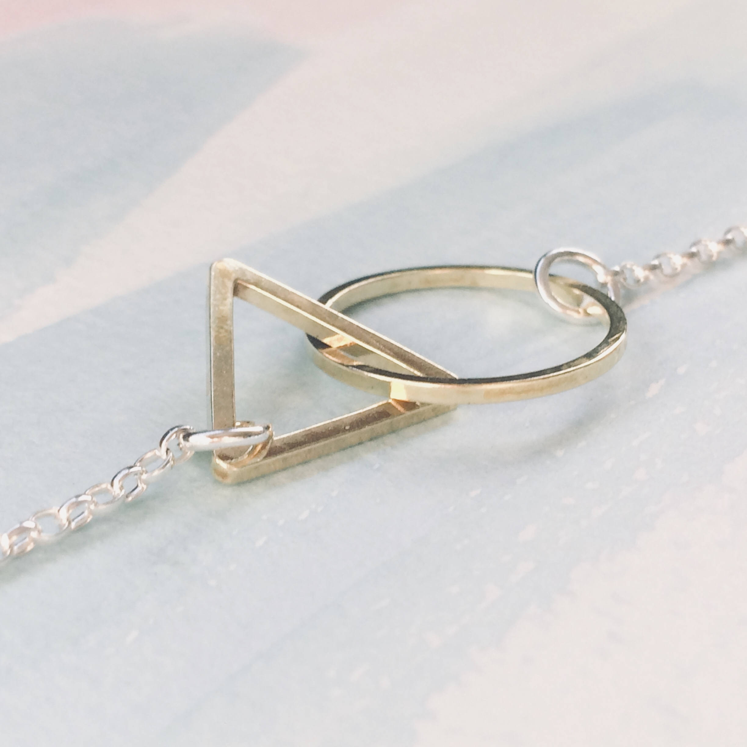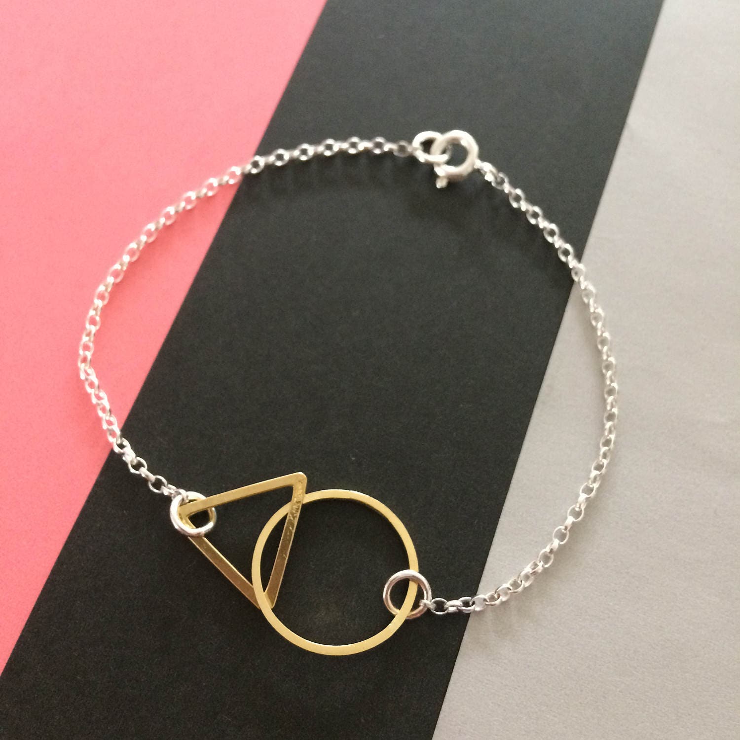 A charming and versatile addition to your jewellery collection. Crafted with precision, this bracelet features adorable circle and triangle geometric charms made from brass and sterling silver, creating a delightful contrast of materials.