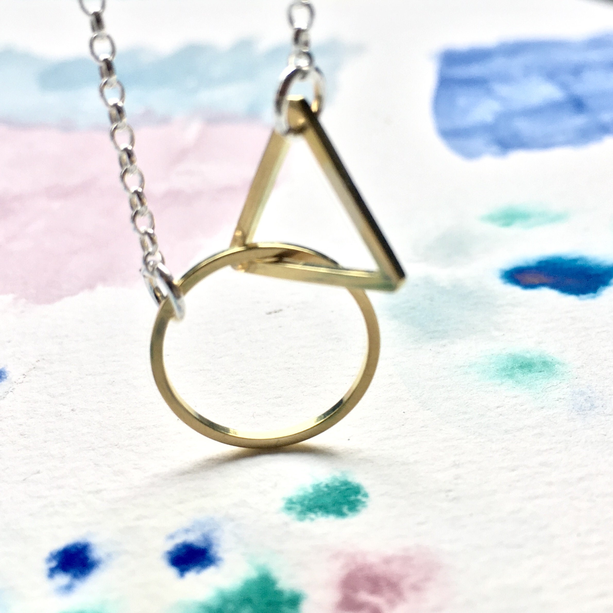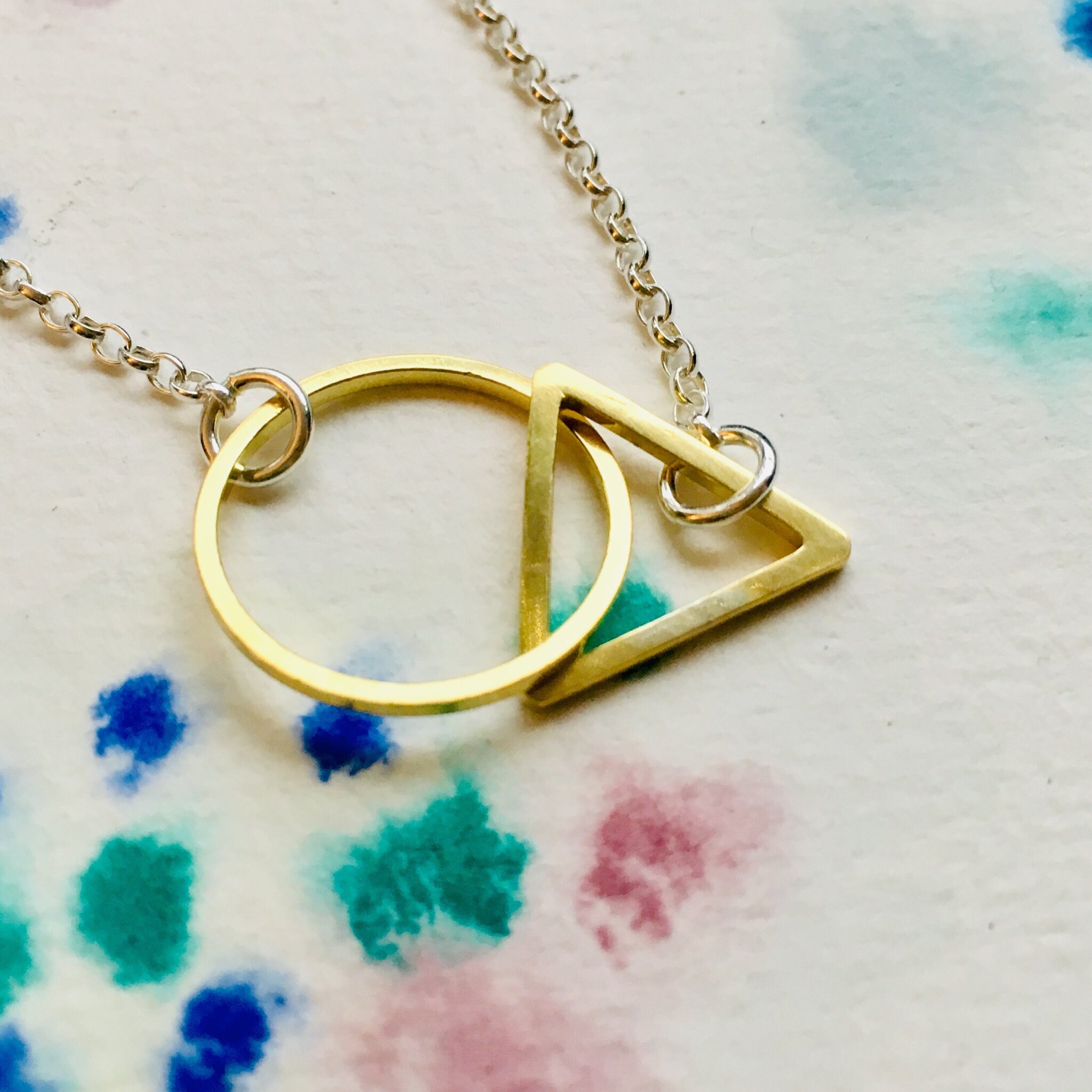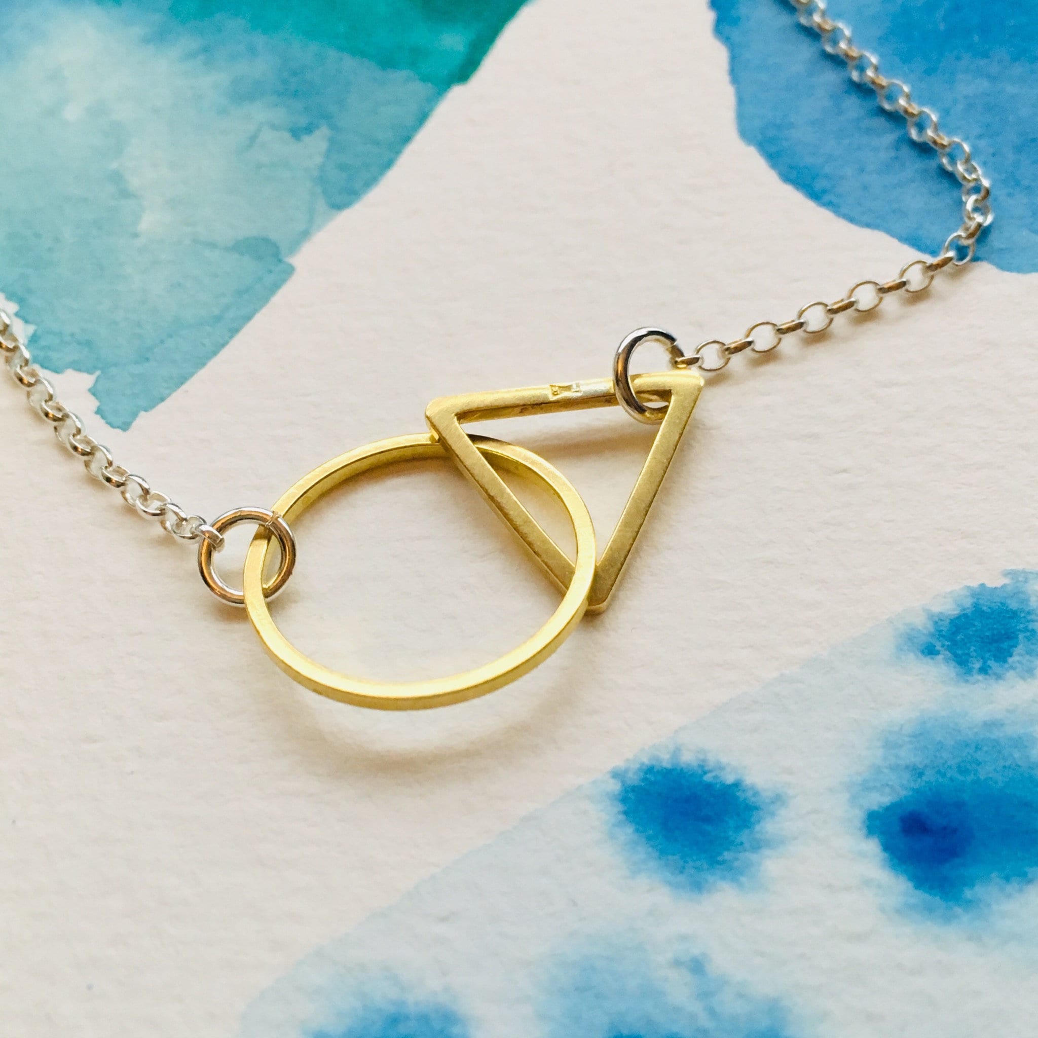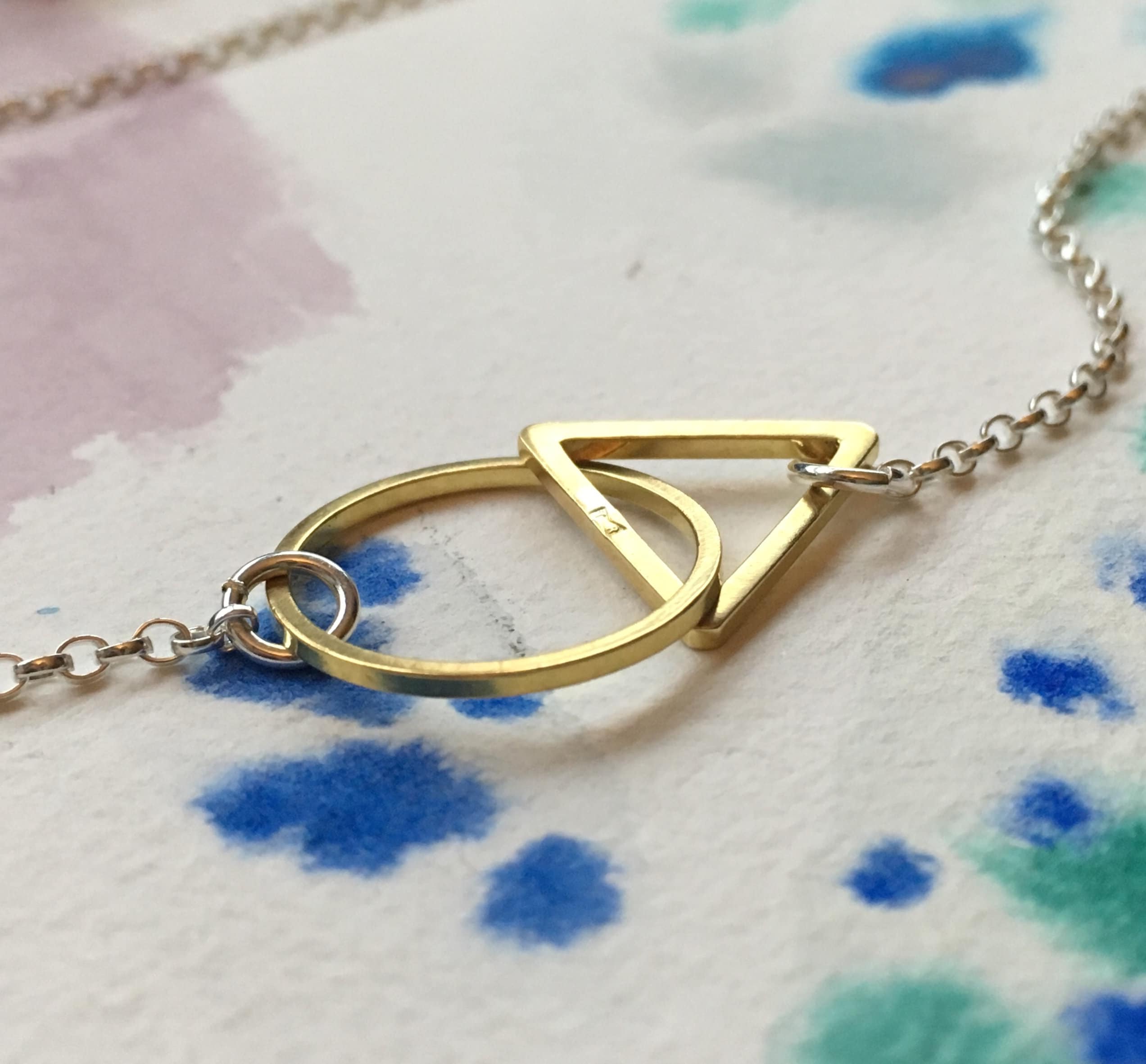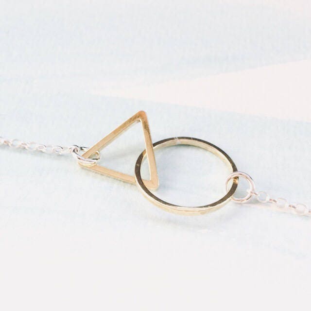 A charming and versatile addition to your jewellery collection. Crafted with precision, this bracelet features adorable circle and triangle geometric charms made from brass and sterling silver, creating a delightful contrast of materials.