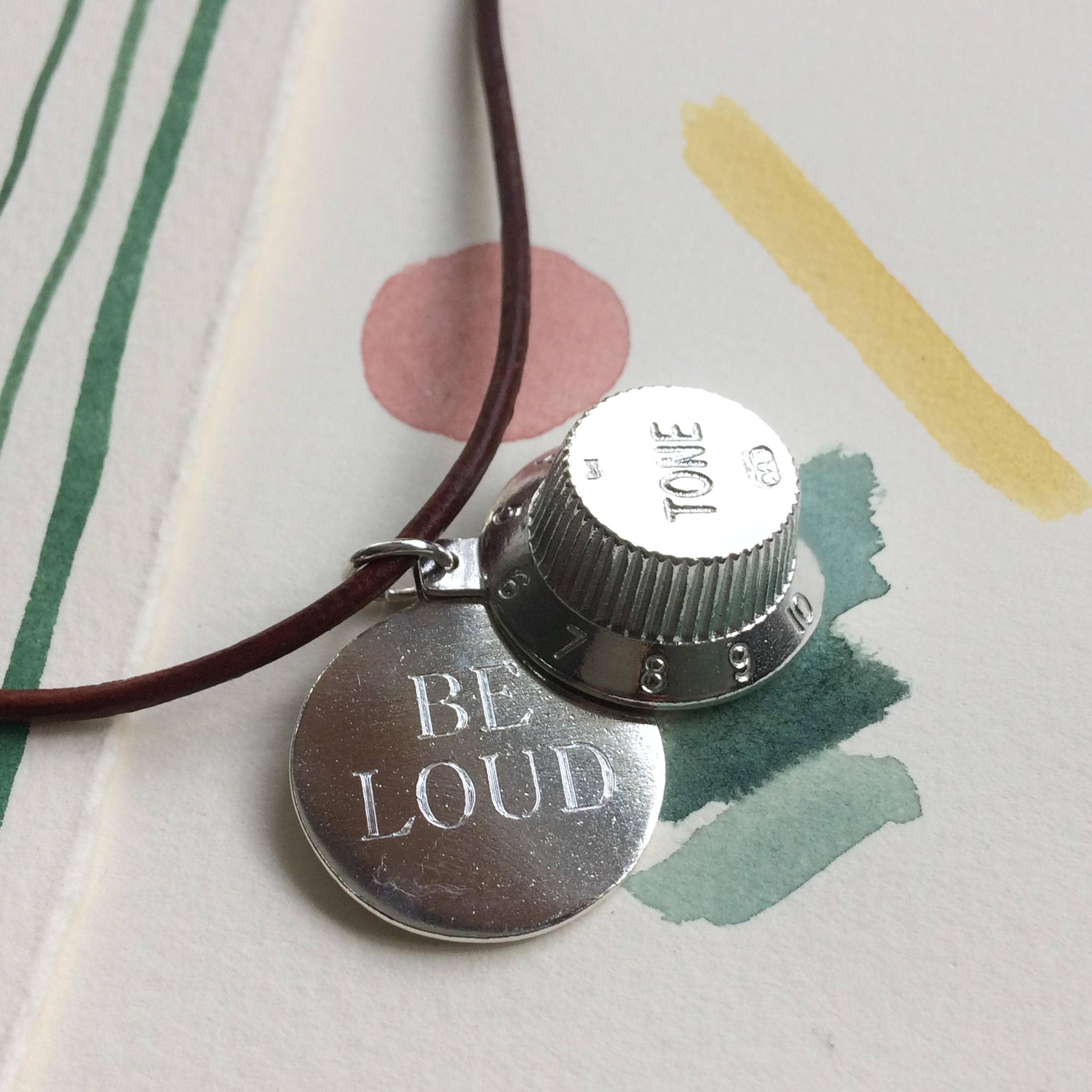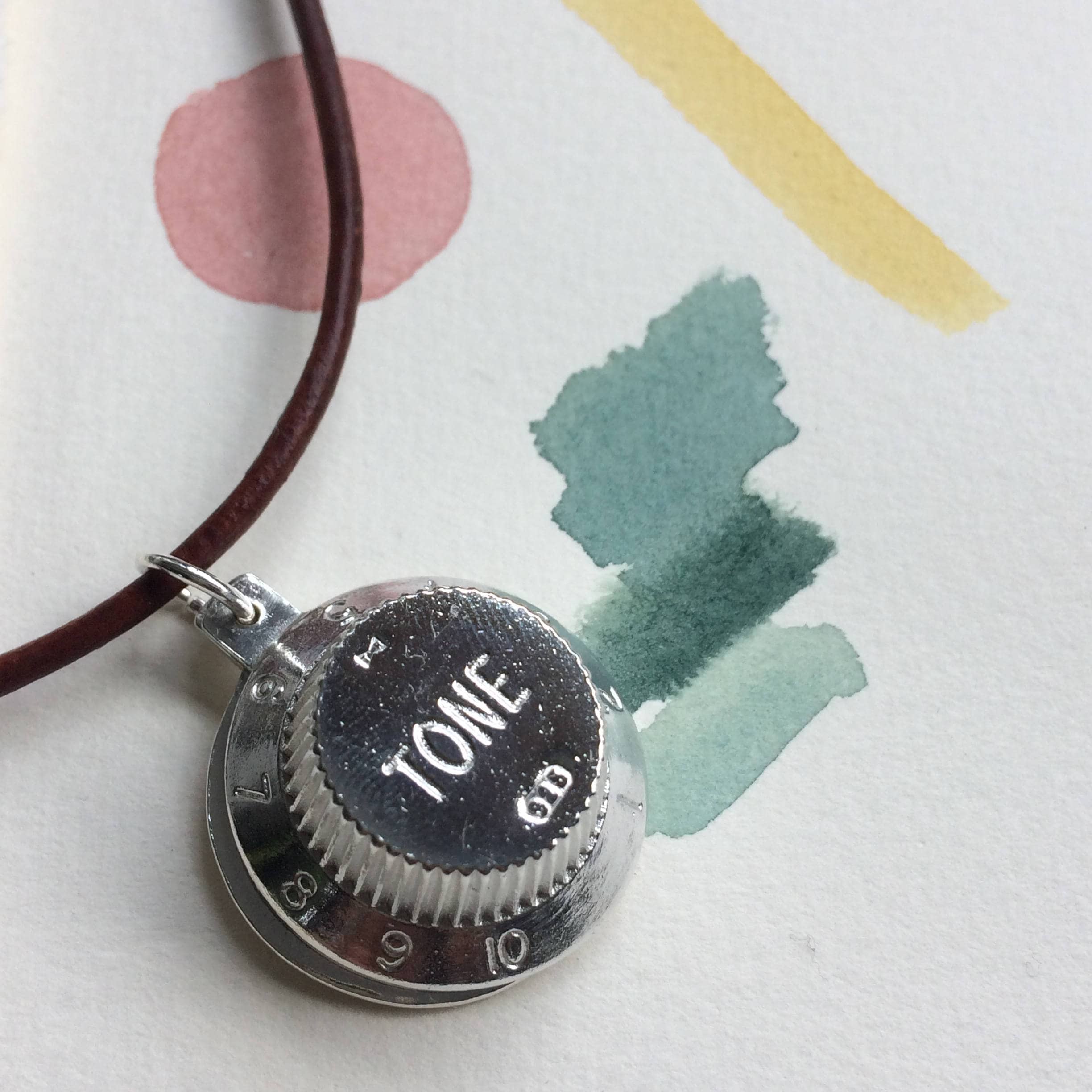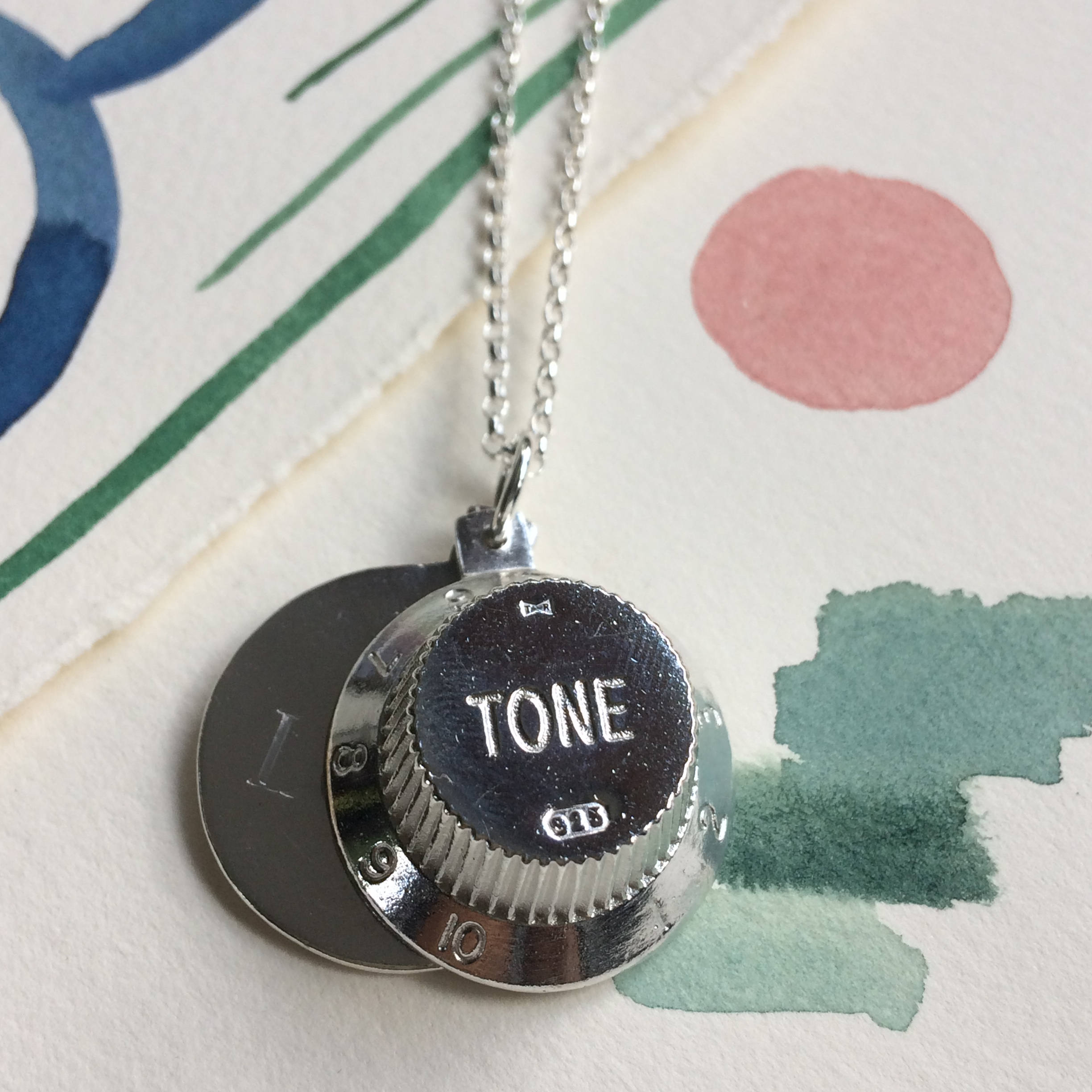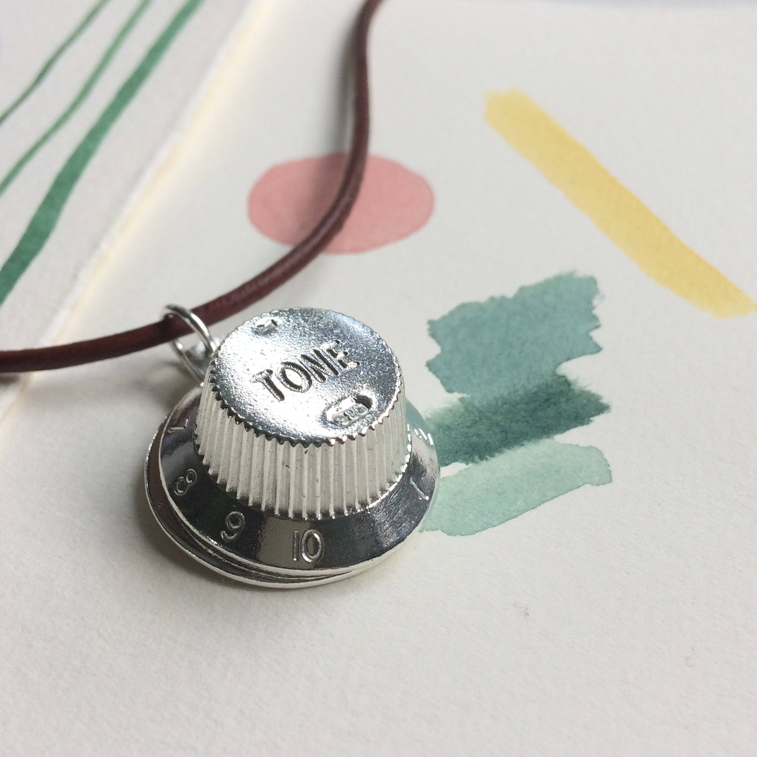 Beautifully casted Fender Guitar knob in sterling silver and a personalised casted sterling silver tag create locket style necklace. Great gift for musicians.