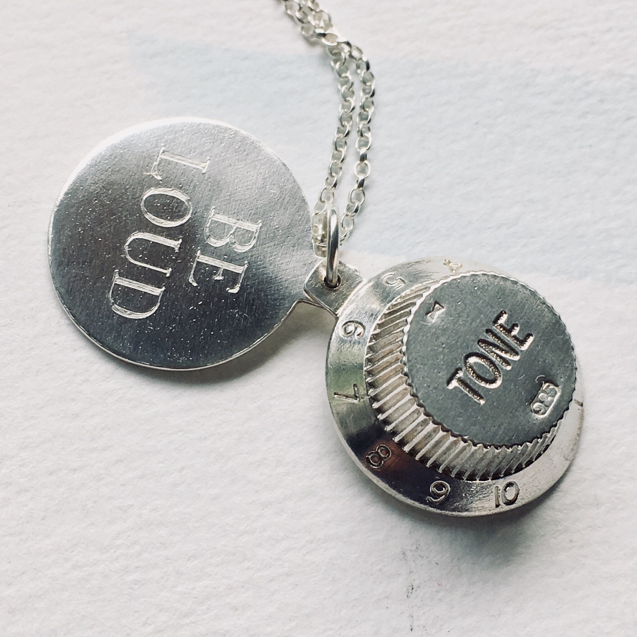 This casted sterling silver Fender Guitar knob locket necklace is a great gift for a person who is into guitars and musicians. You can add your sterling silver tag to complete your guitar knob locket-style necklace with your special message on both sides.