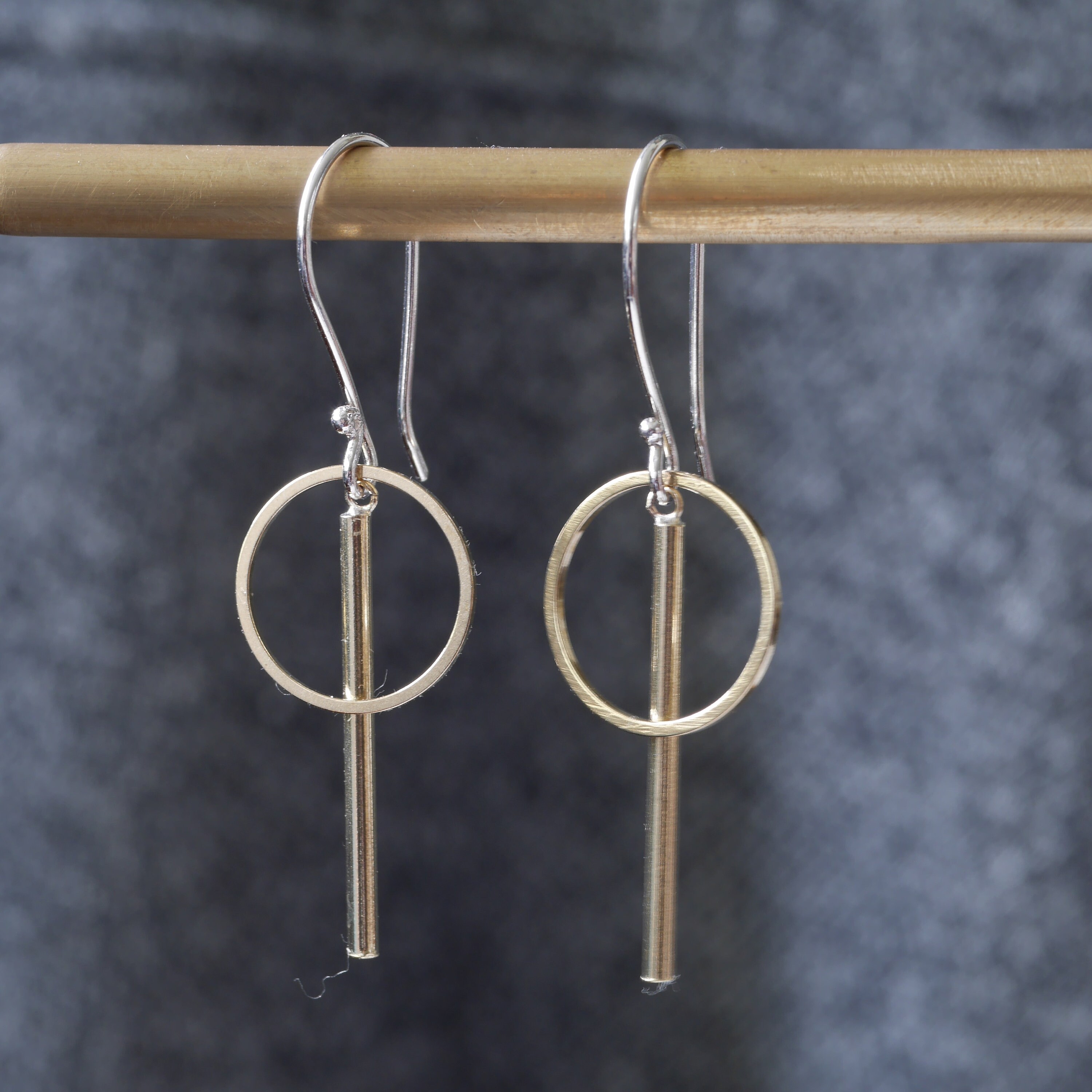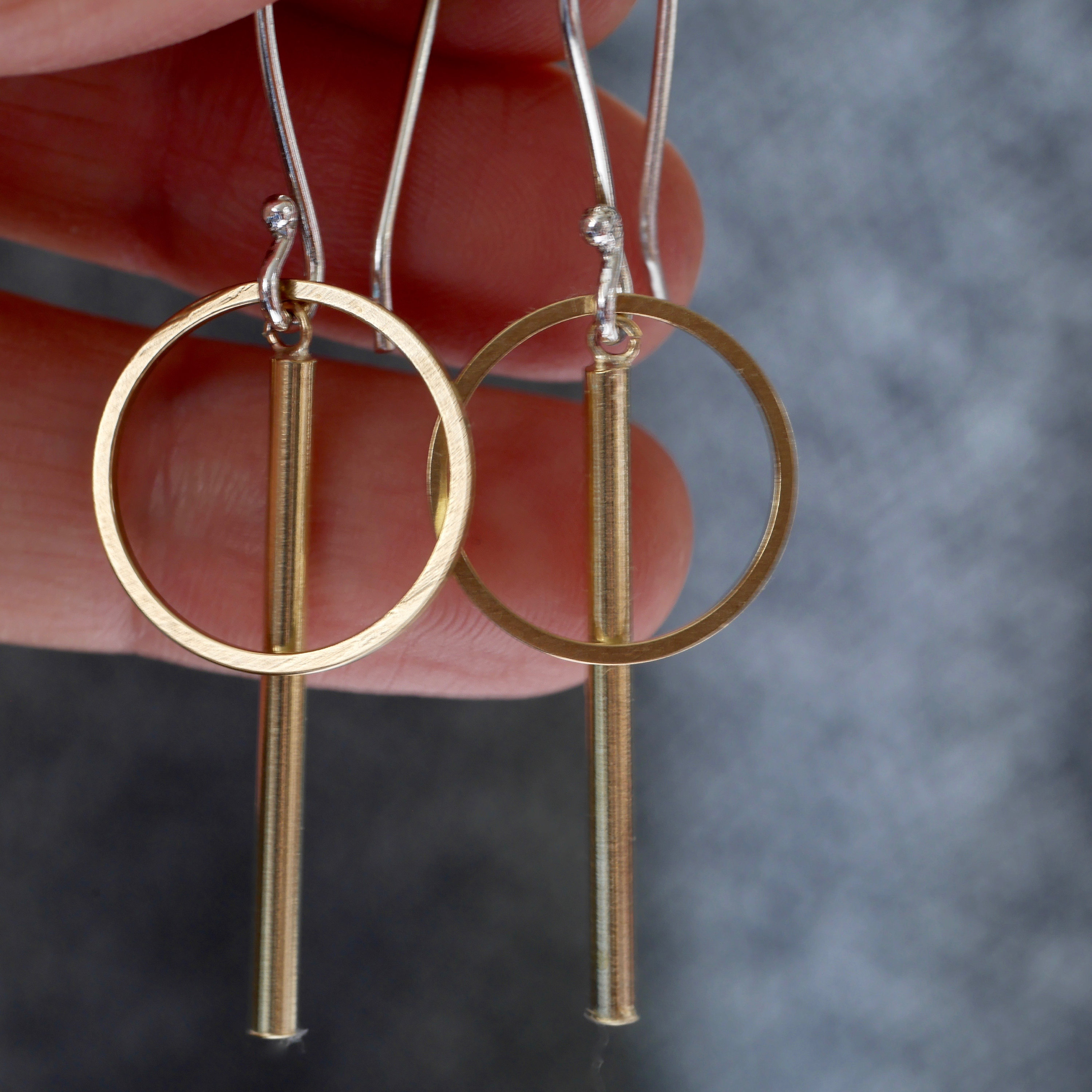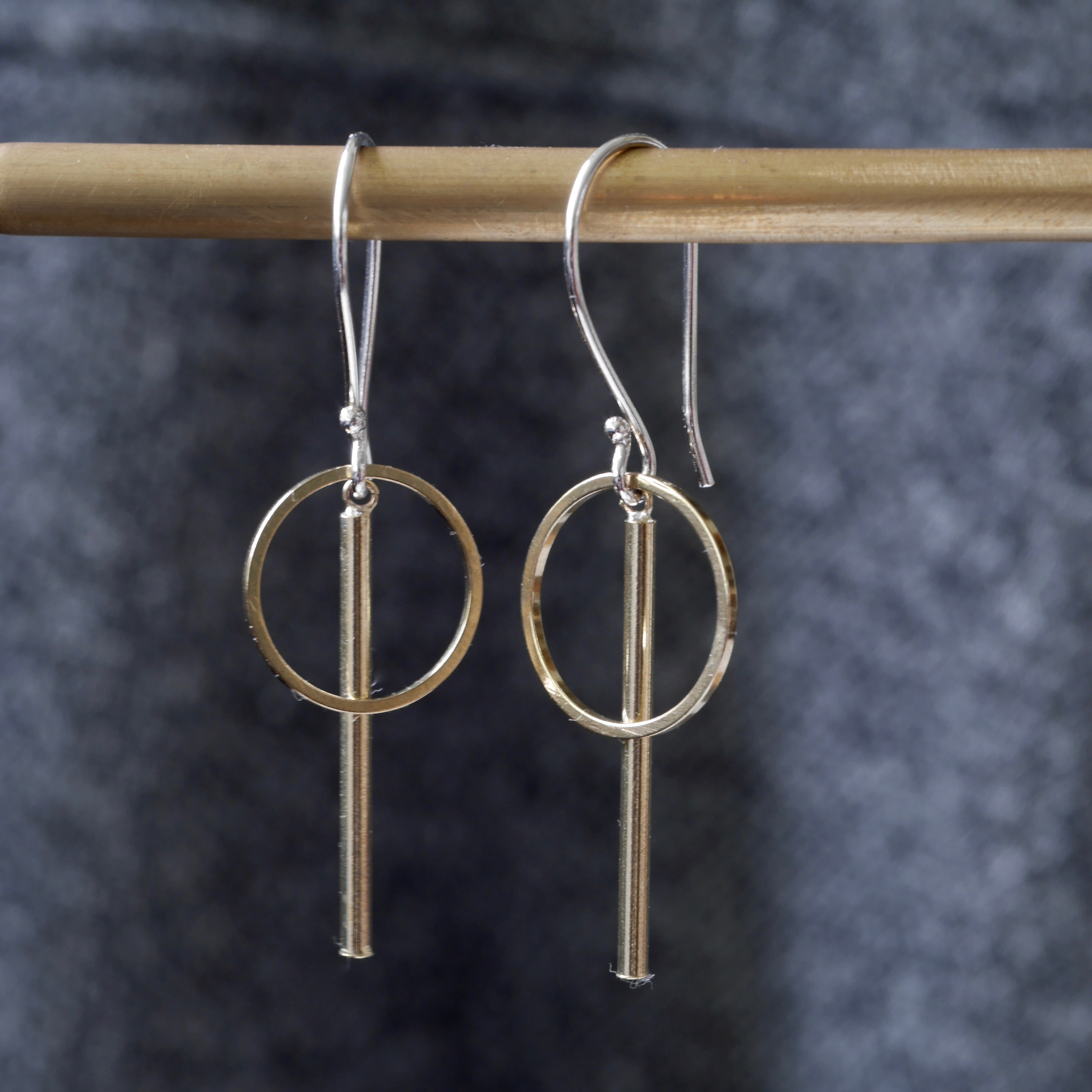 Gold-tone Handmade Circle and Bar Brass Drop Earrings - Geometric Circle And Bar Drop dangles - Geometric hoop and bar long earrings.