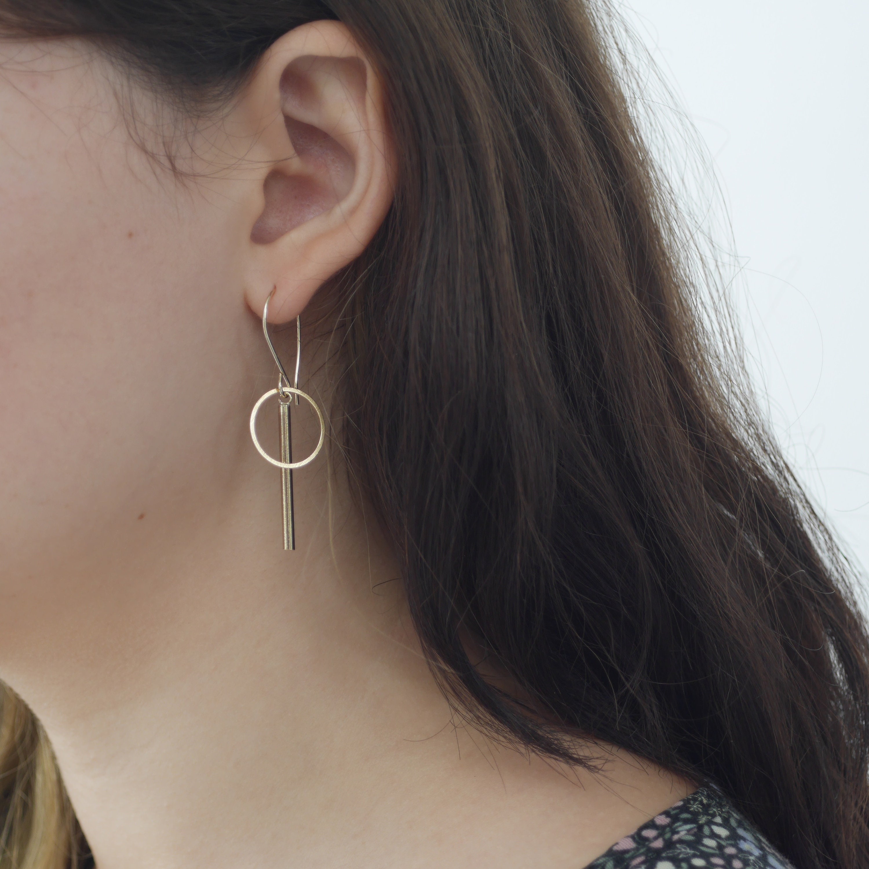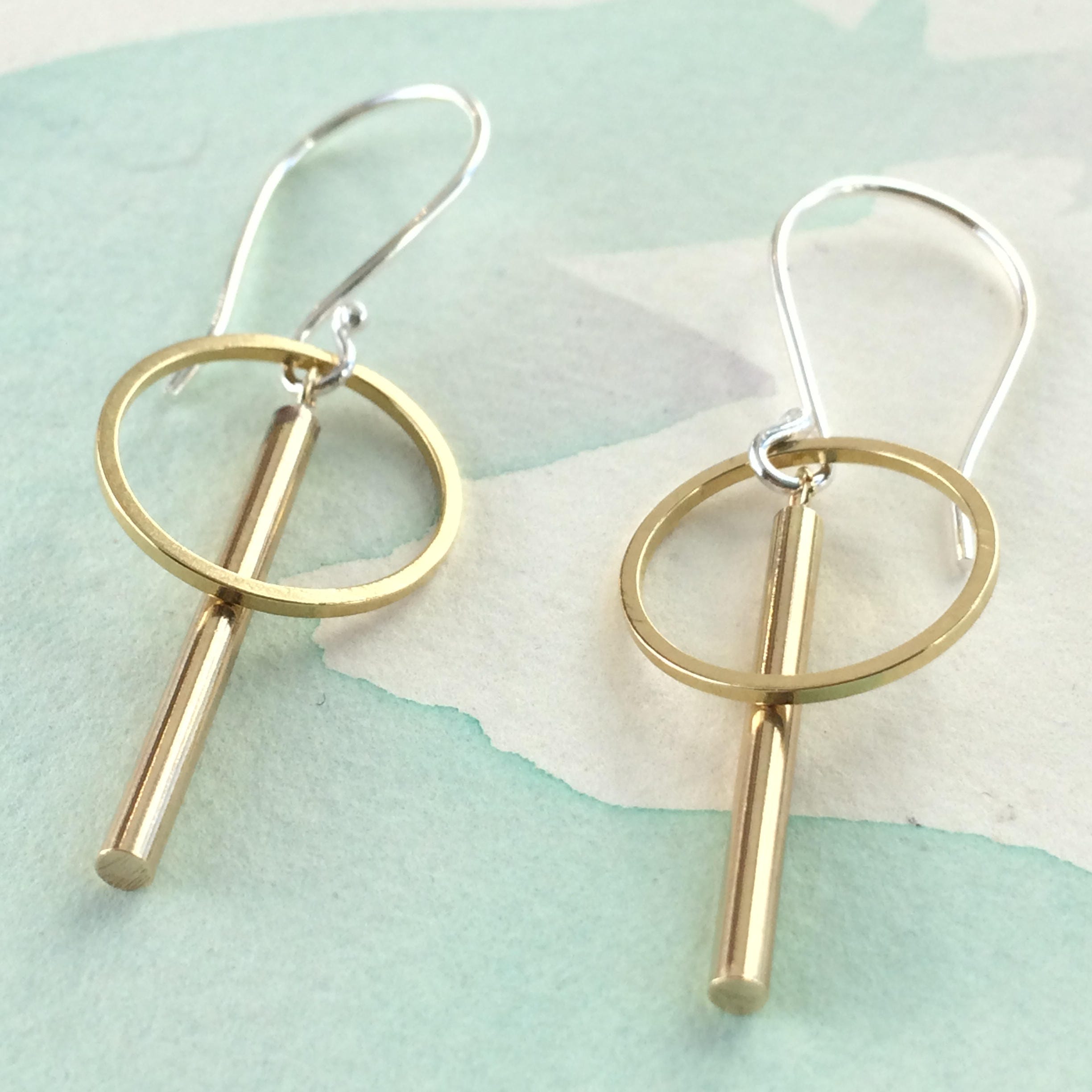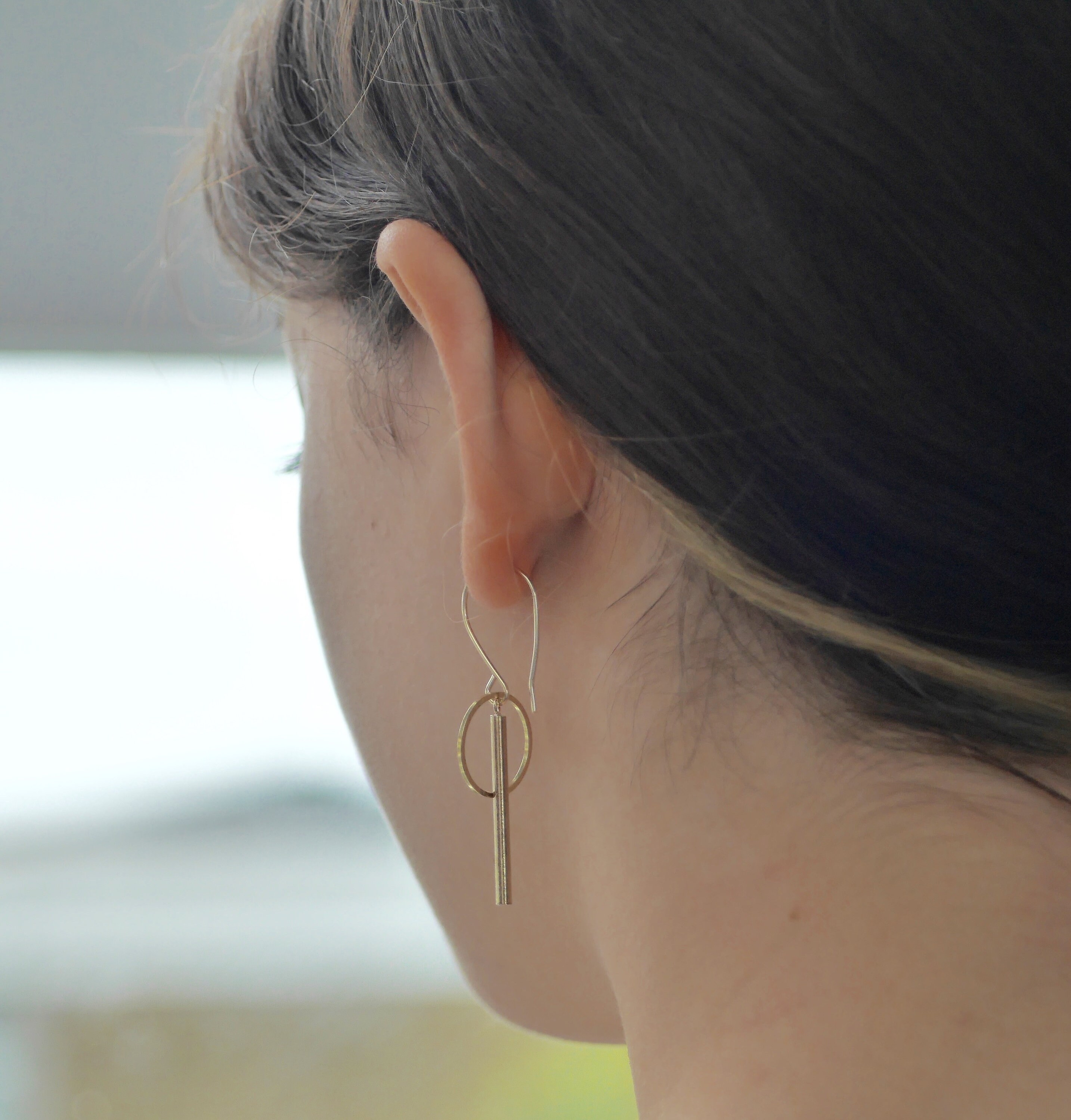 Gold-tone Handmade Circle and Bar Brass Drop Earrings - Geometric Circle And Bar Drop dangles - Geometric hoop and bar long earrings.
