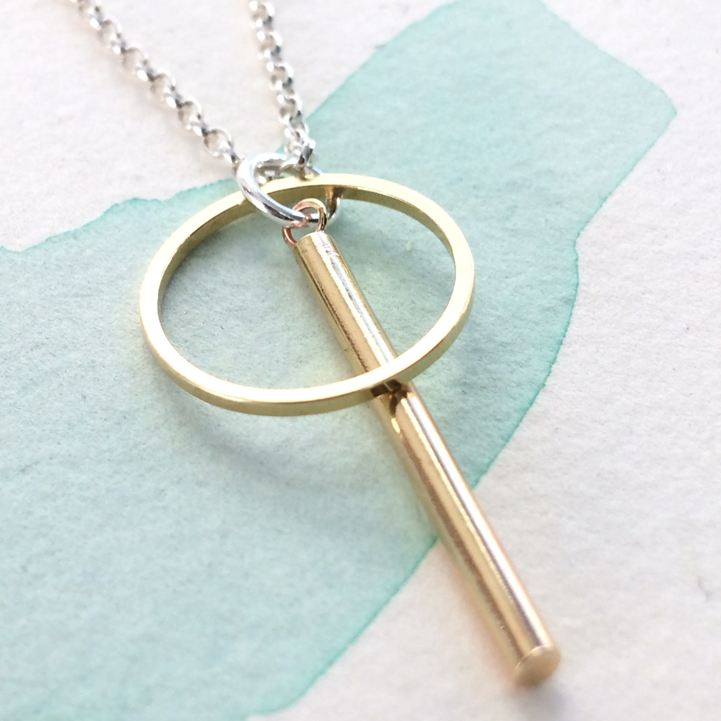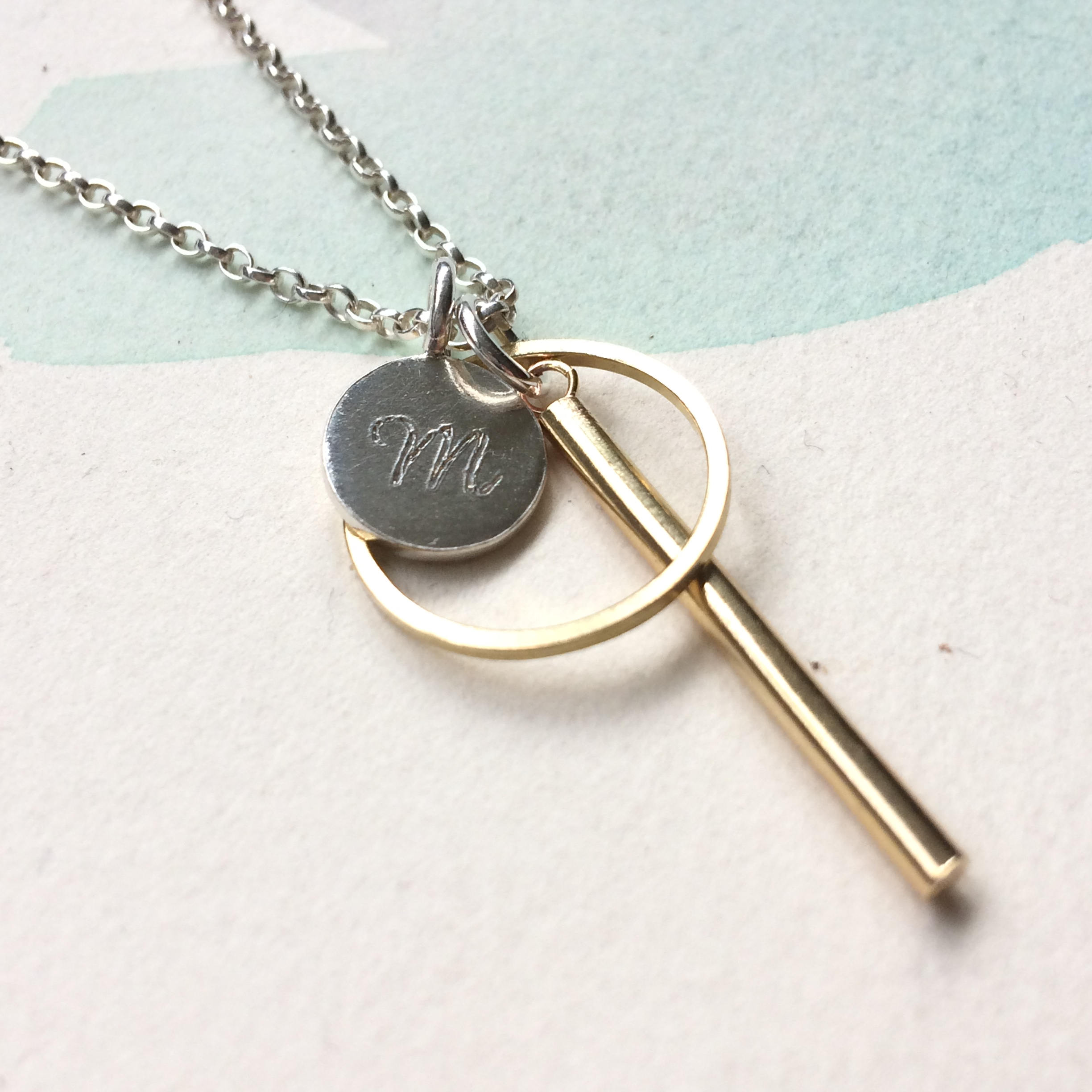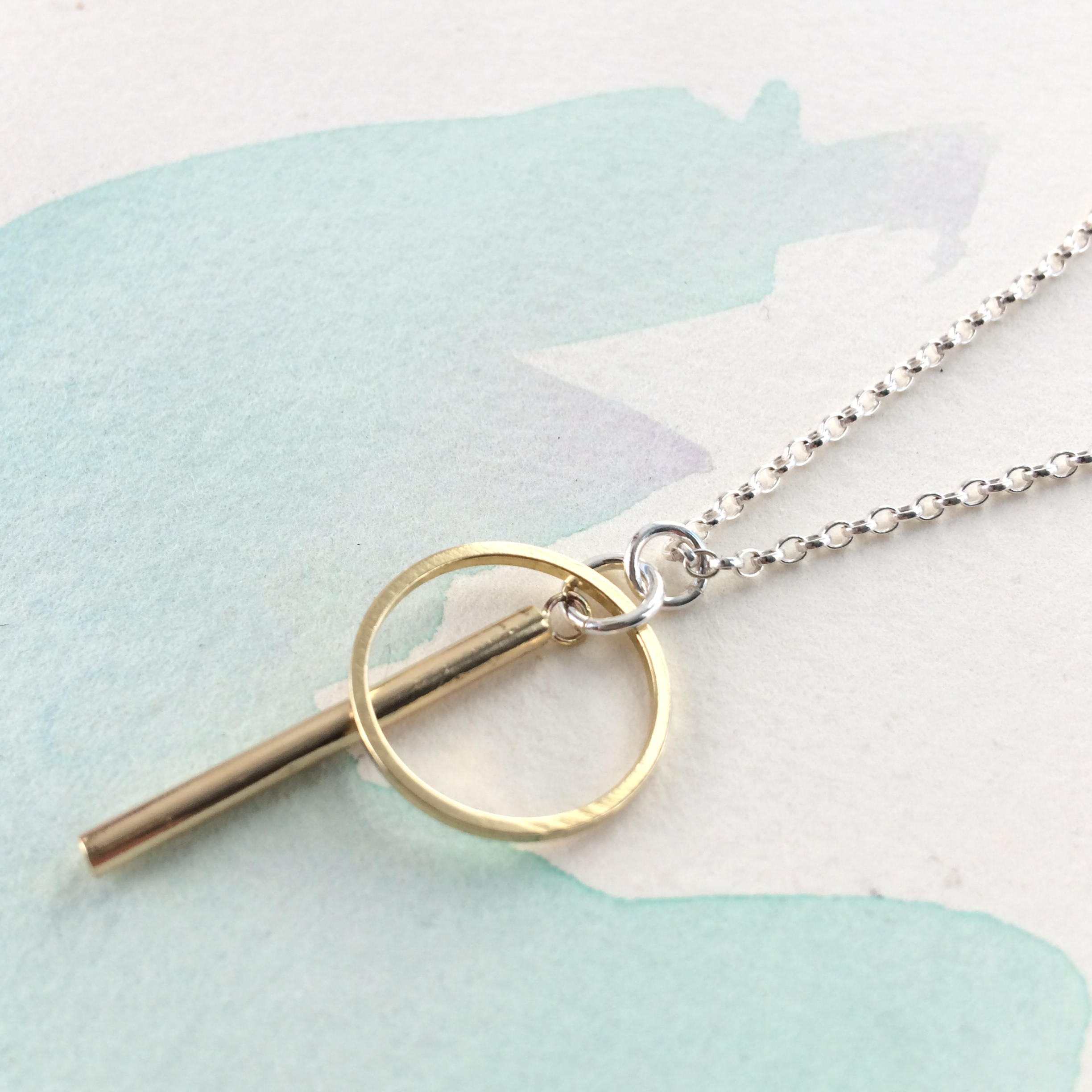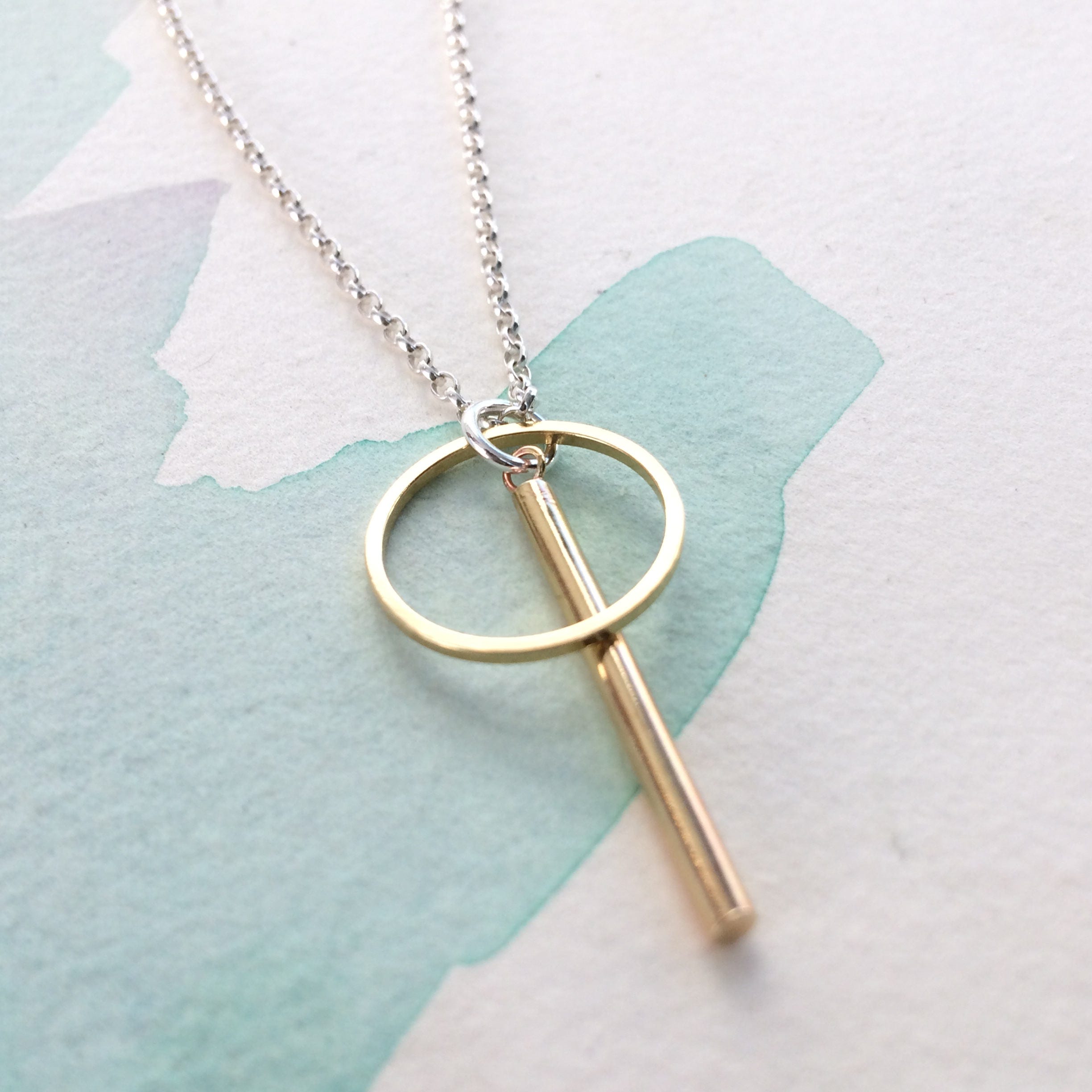 Brass circle and Bar with sterling silver circle charm geometric jewellery. Very beautiful minimal long jewelry can be a great gift for your loved one. The sterling silver tag makes it even more special with your personalisation.