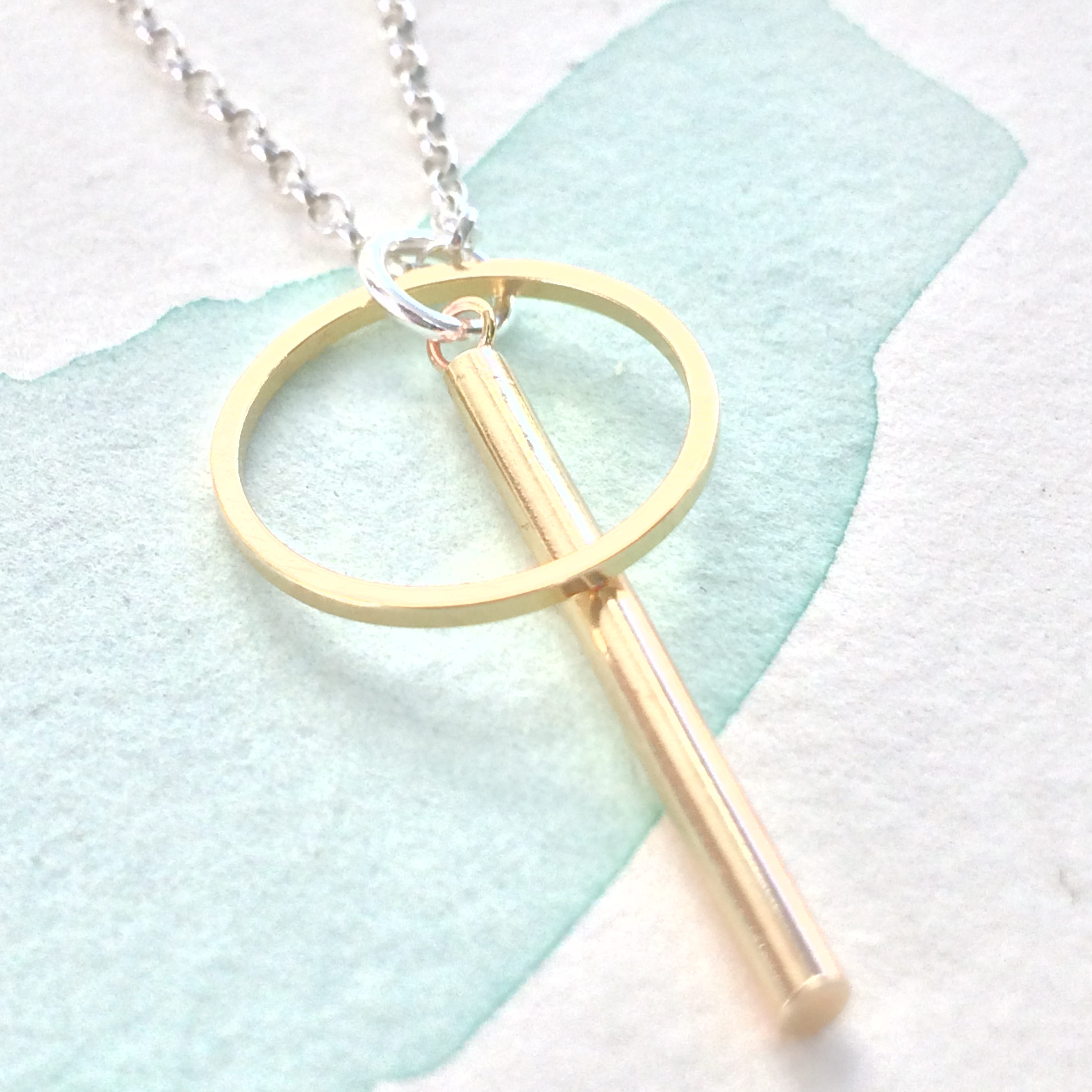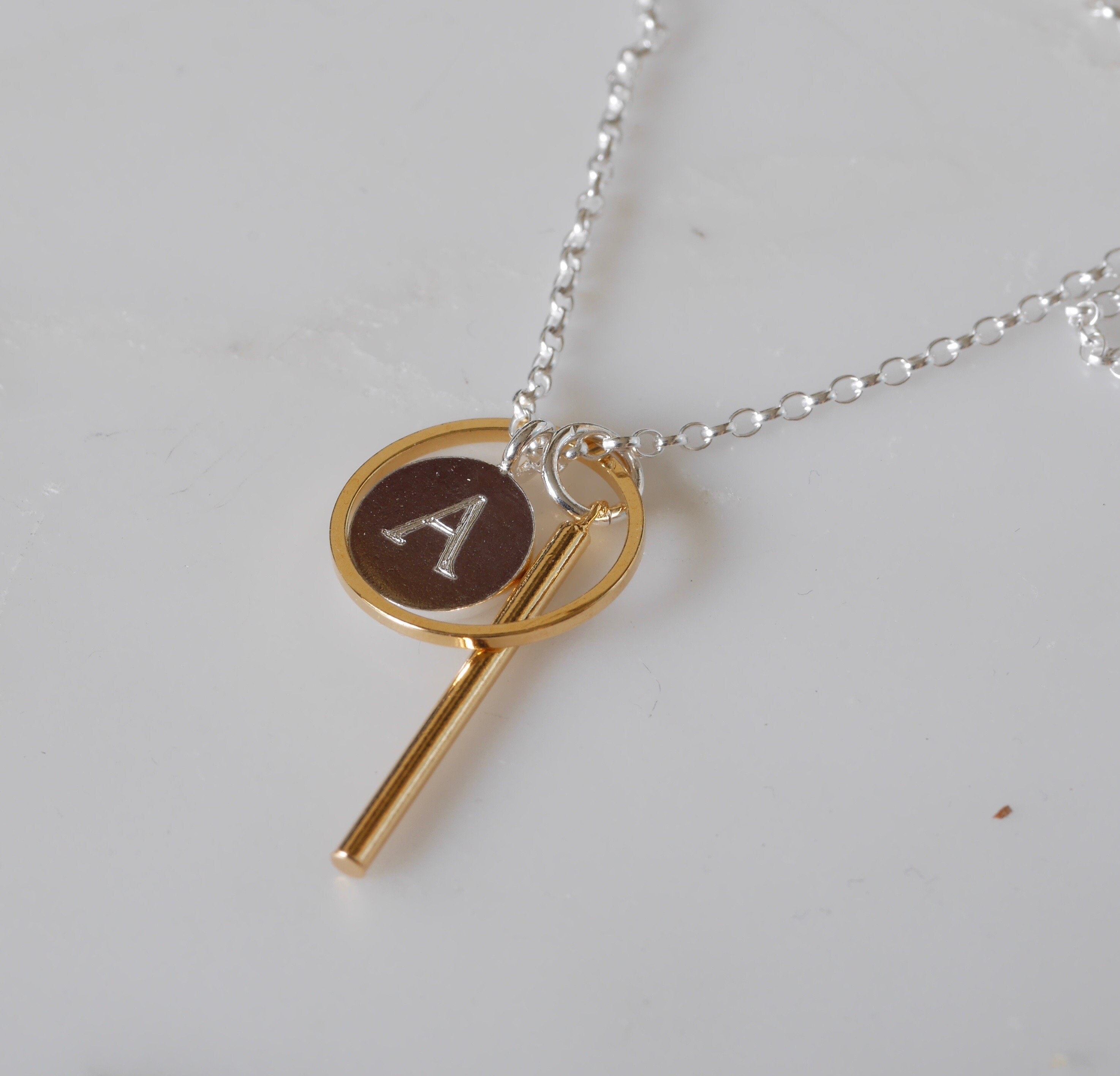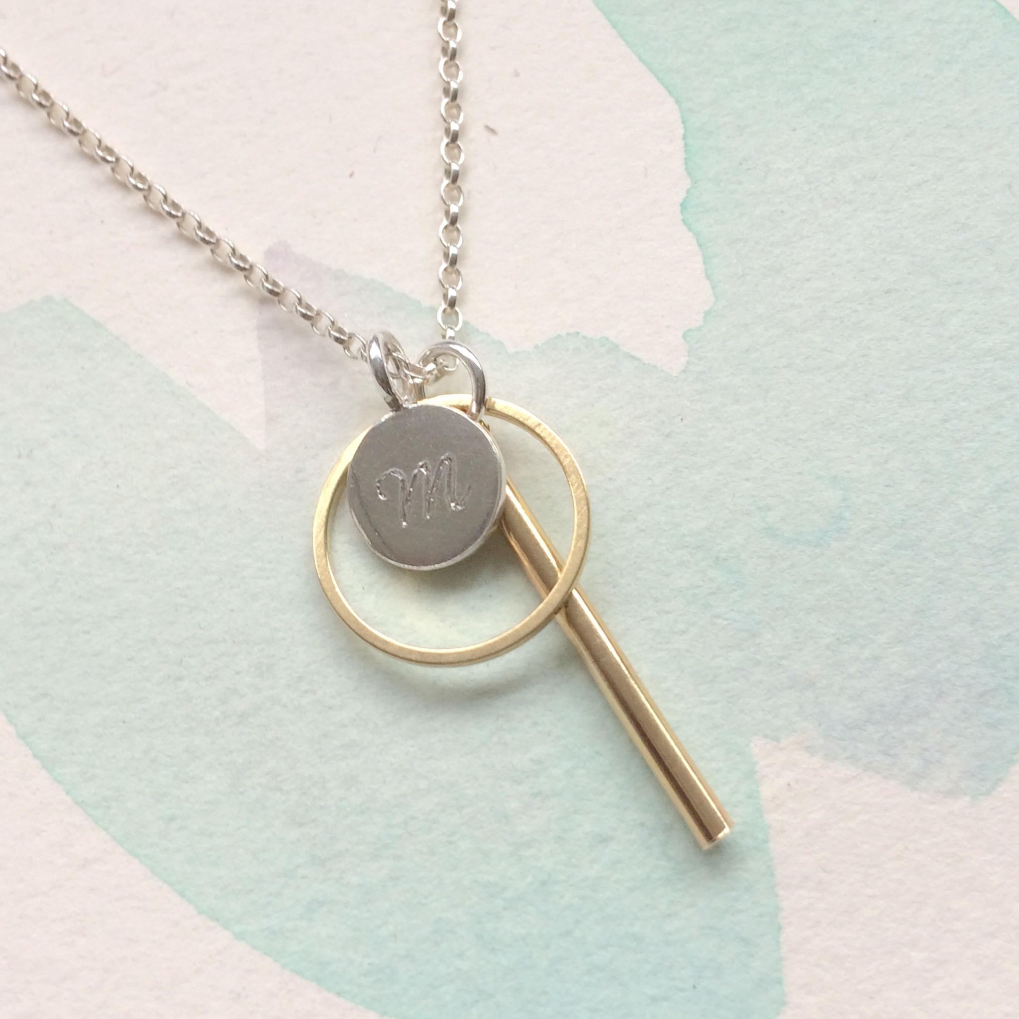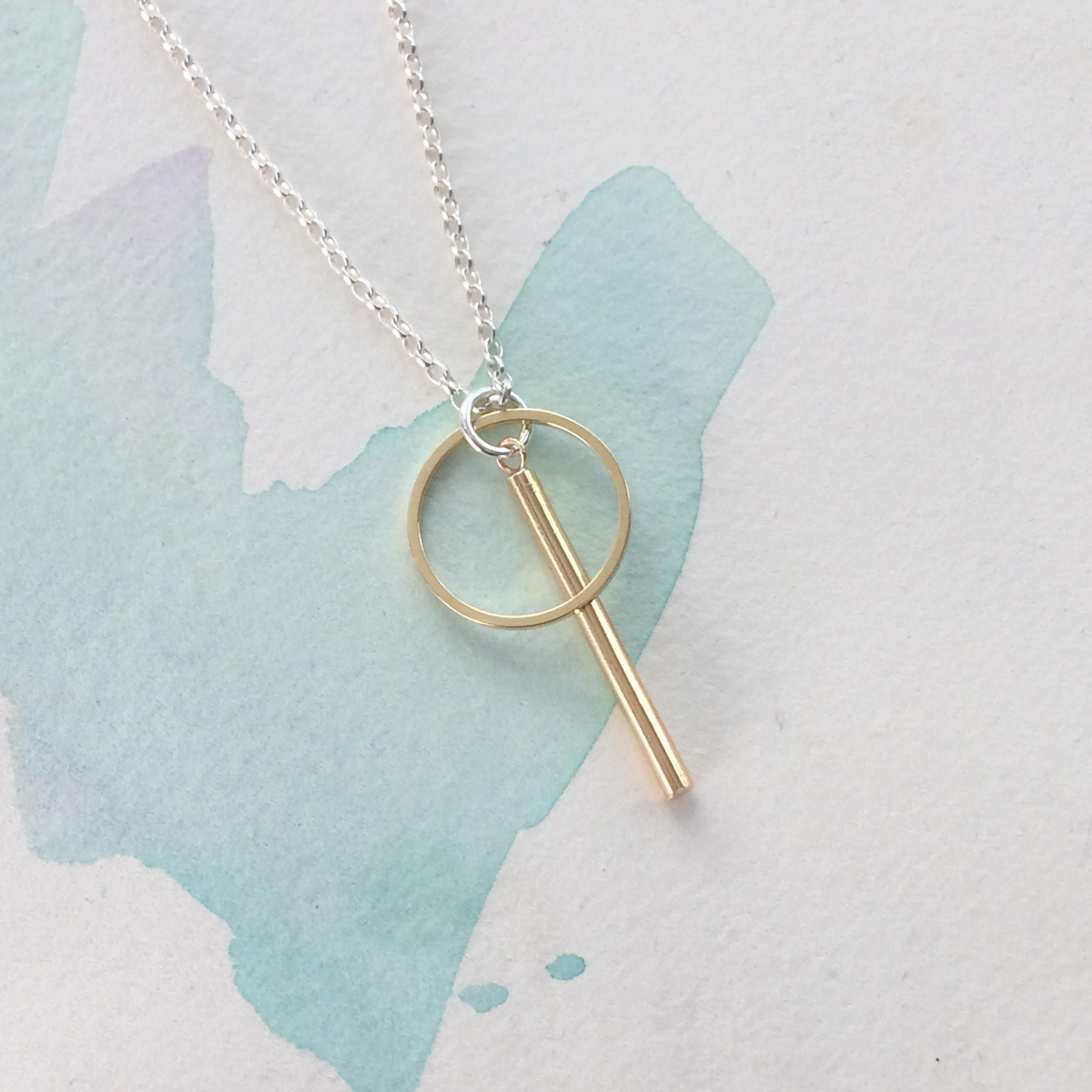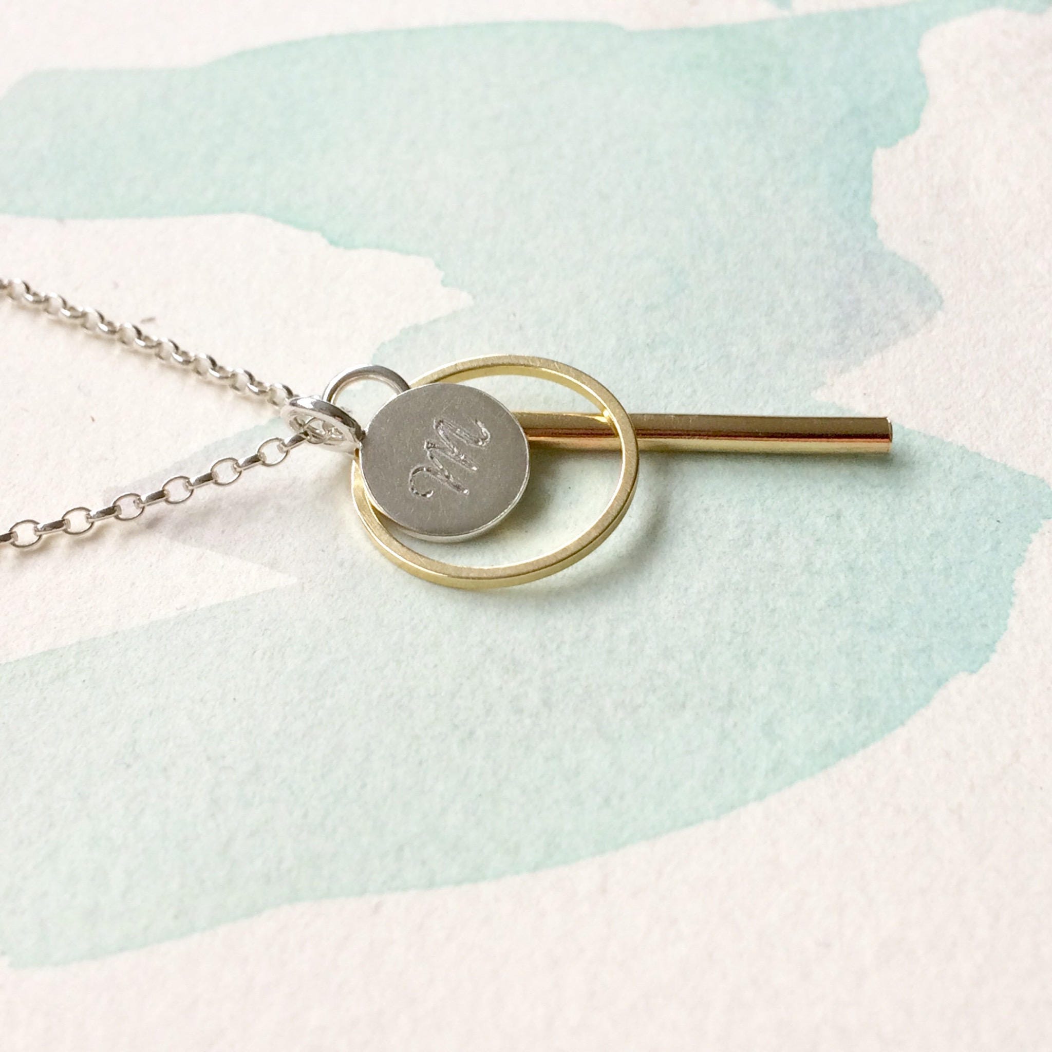 Brass circle and Bar with sterling silver circle charm geometric jewellery. Very beautiful minimal long jewelry can be a great gift for your loved one. The sterling silver tag makes it even more special with your personalisation.