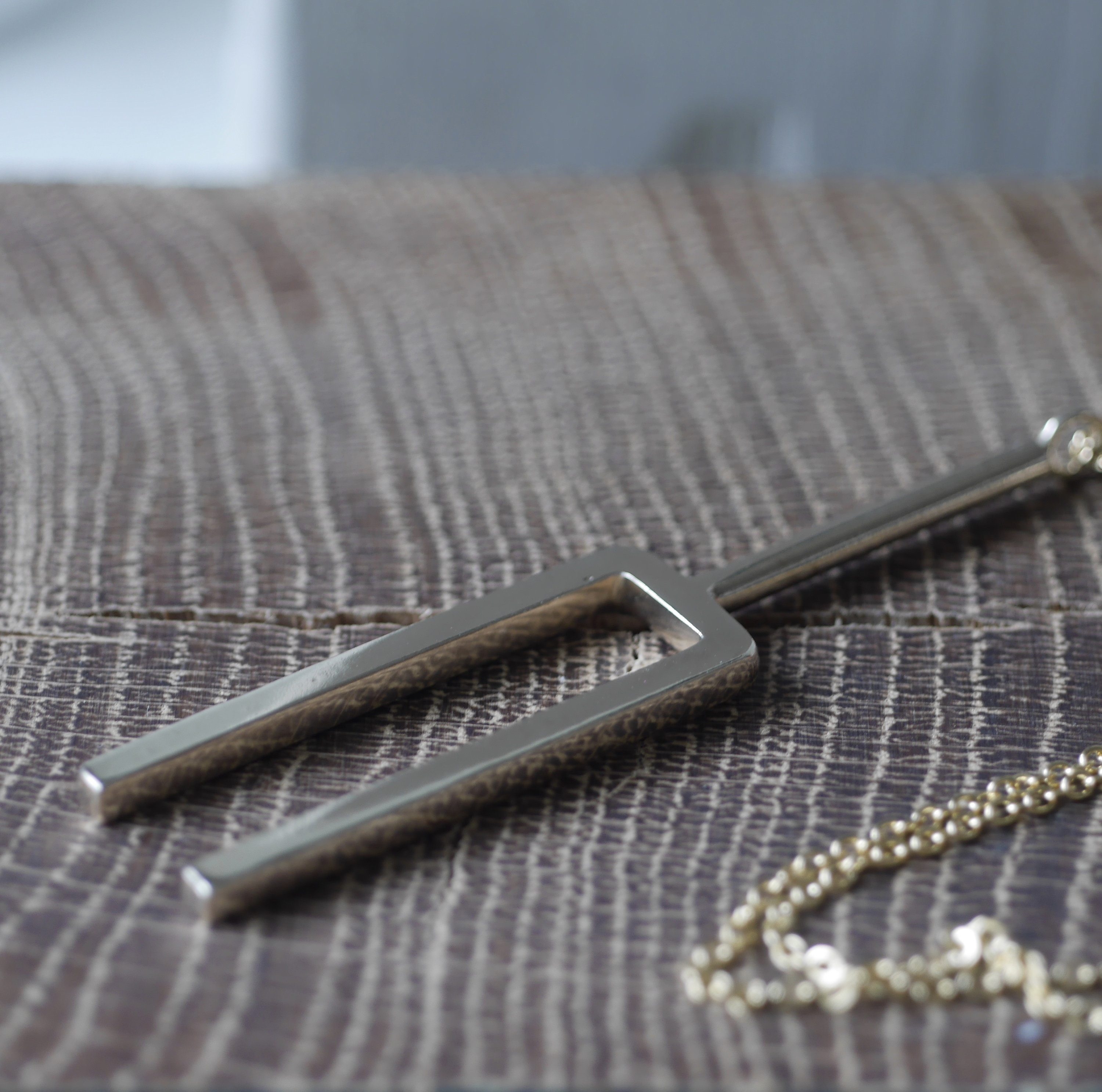 Watching a scientist lecture about sounds inspired me to create an interactive and very cute tuning fork jewellery. A tuning fork is an acoustic resonator. It resonates at a specific constant pitch when set vibrating by striking it against a surface or with an object, and emits a pure musical tone once the high overtones fade out.