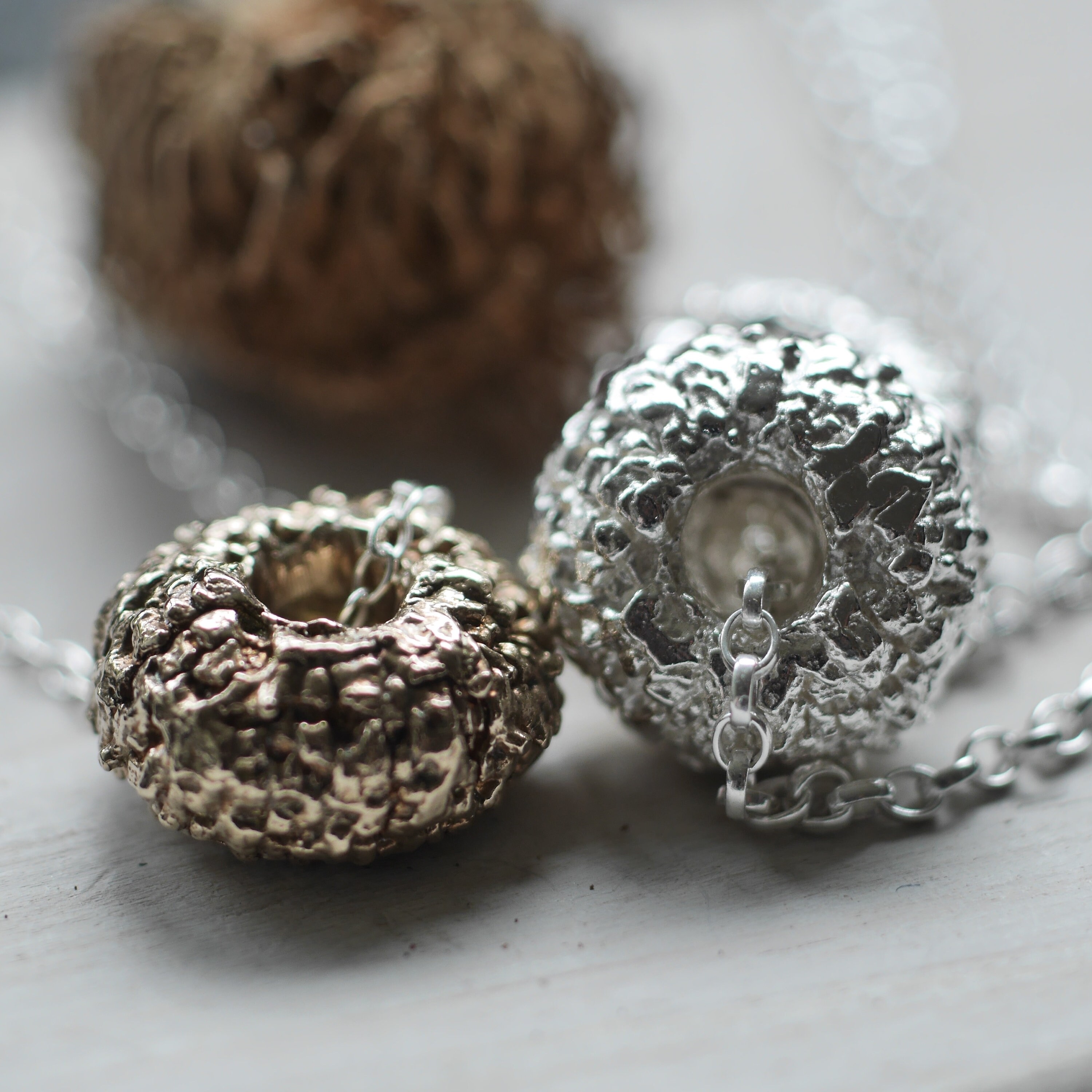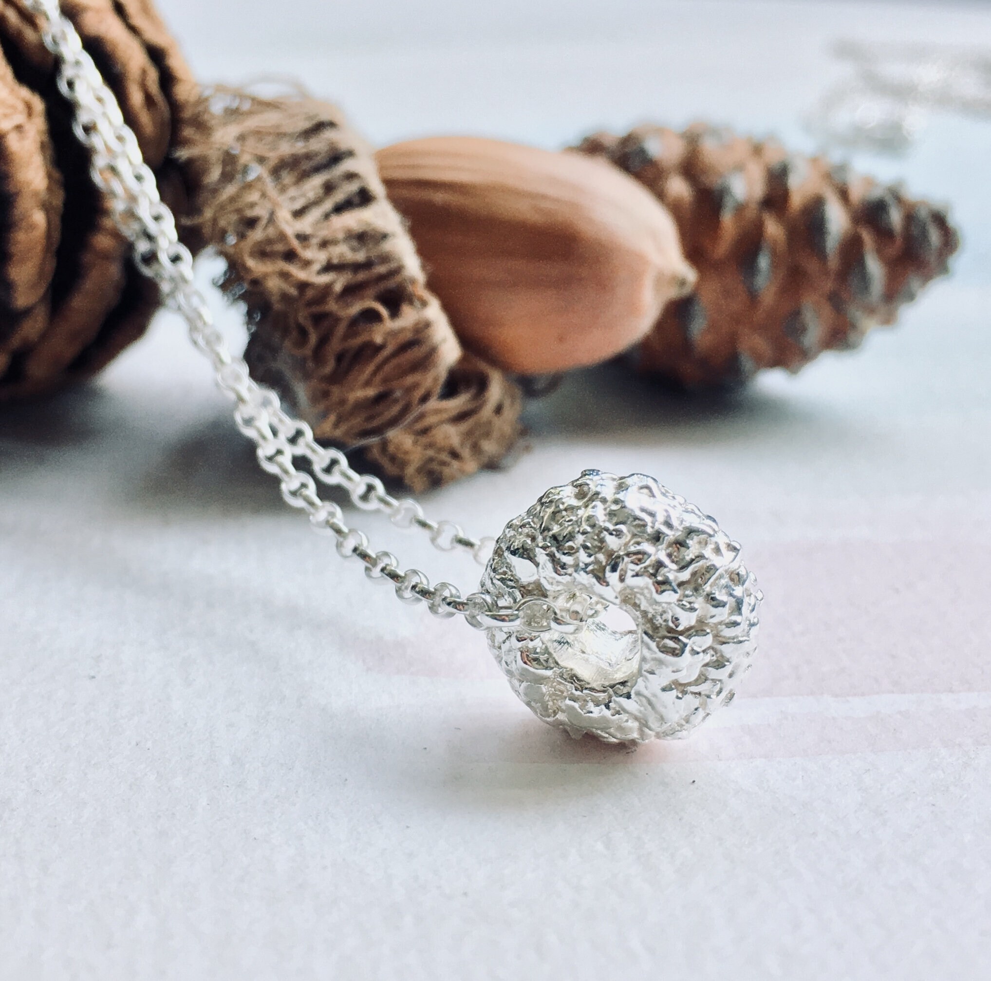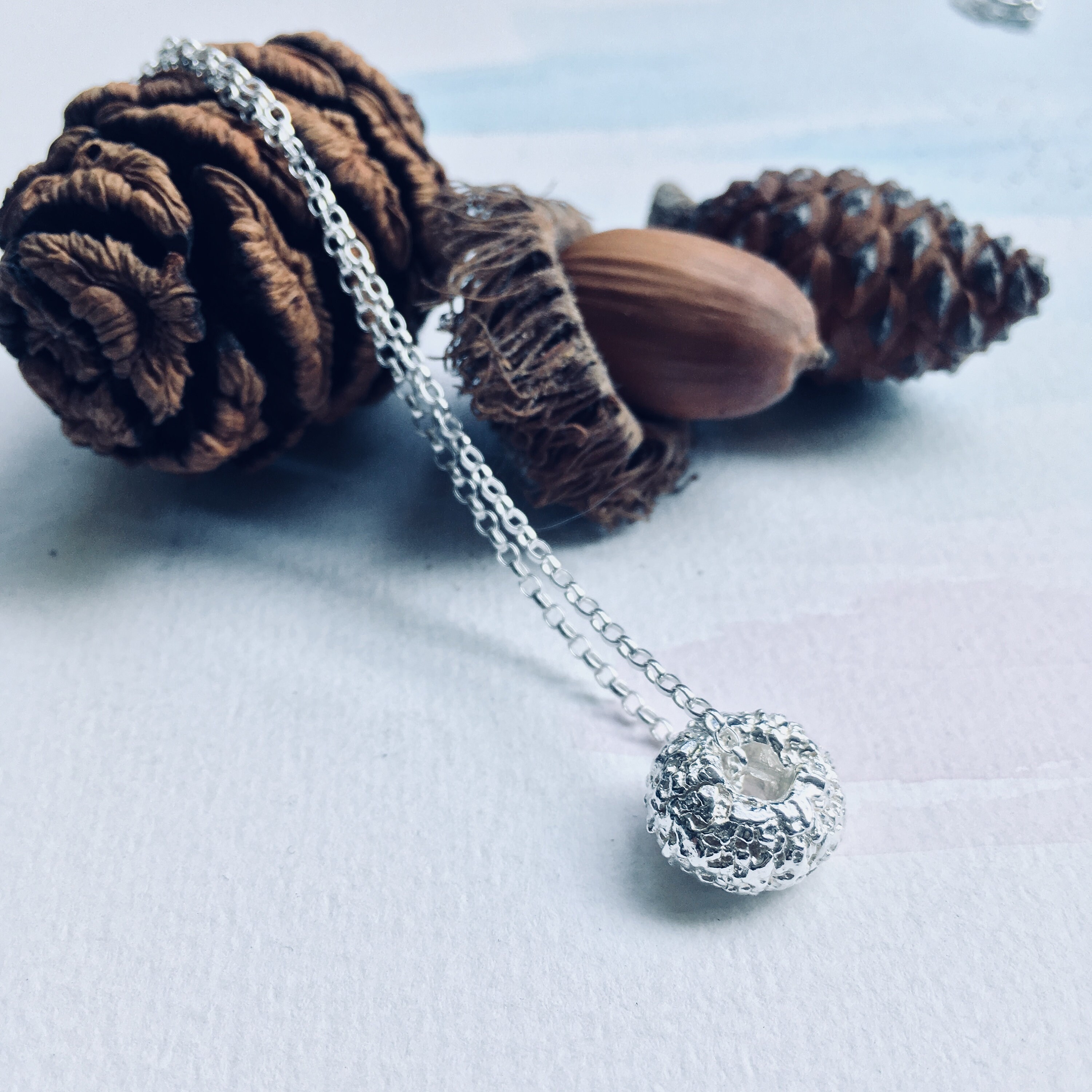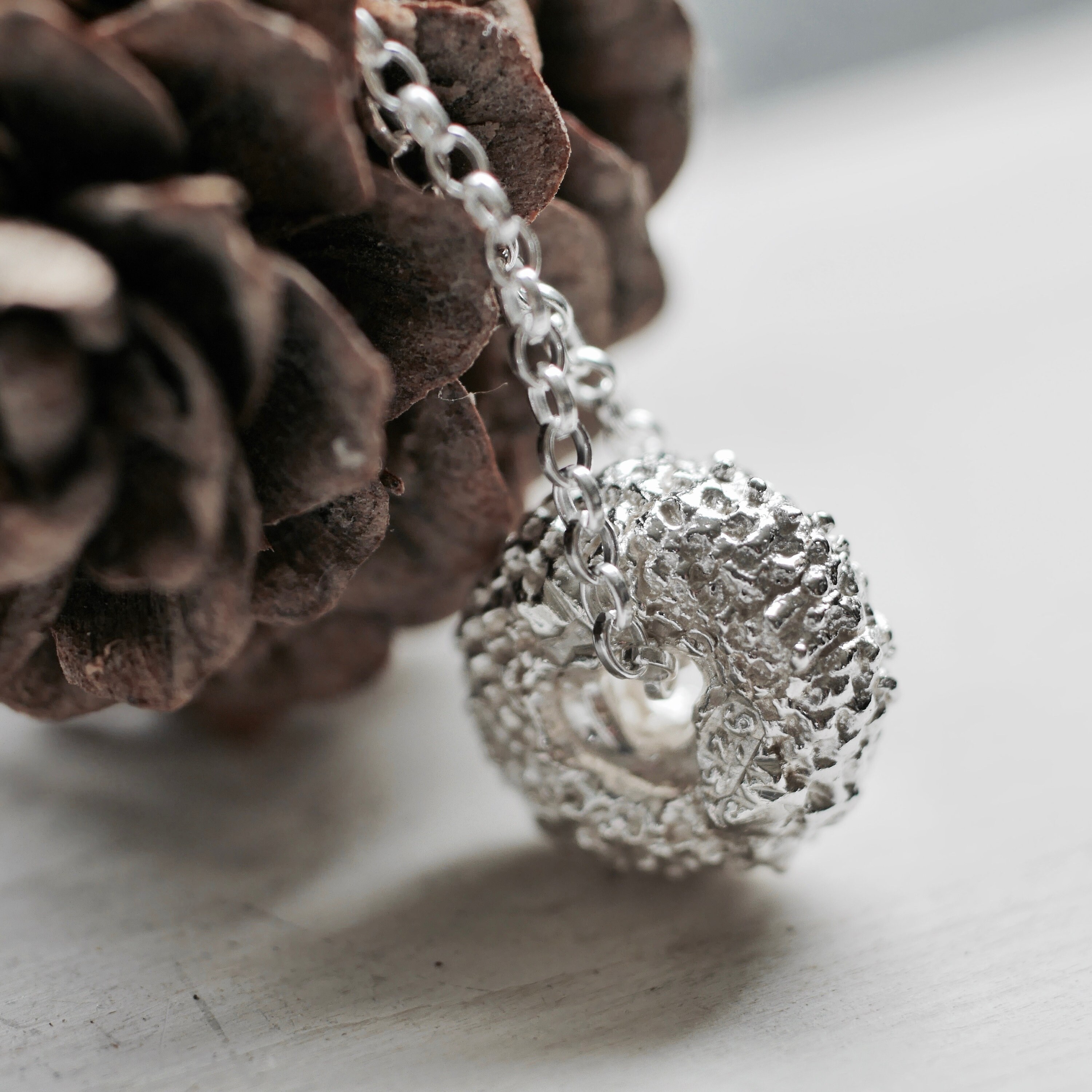 Autumnal acorn doughnut hat necklace, available in your choice of sterling silver or bronze. This piece of natural history acorn cap jewellery makes the perfect gift for nature lovers. The necklace chain is finished in sterling silver. A unique, doughnut-shaped acorn cap necklace is an ideal gift for someone with an autumn birthday. The acorn for this necklace was collected when my daughter was very small. We used to visit the local park, gathering acorns to feed the squirrels during winter. This acorn doughnut necklace holds many cherished memories.