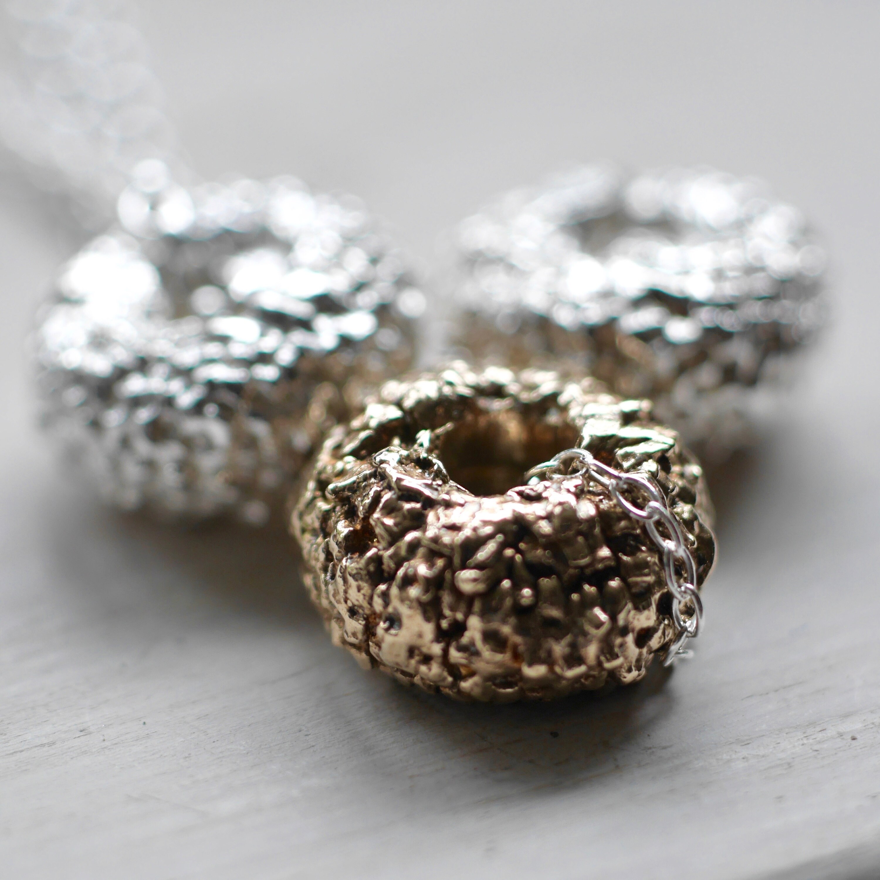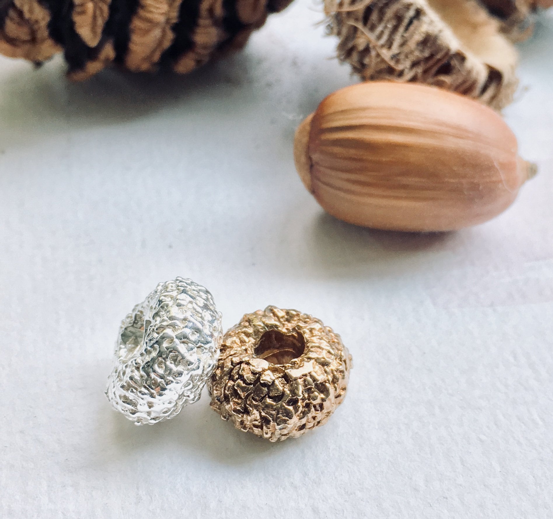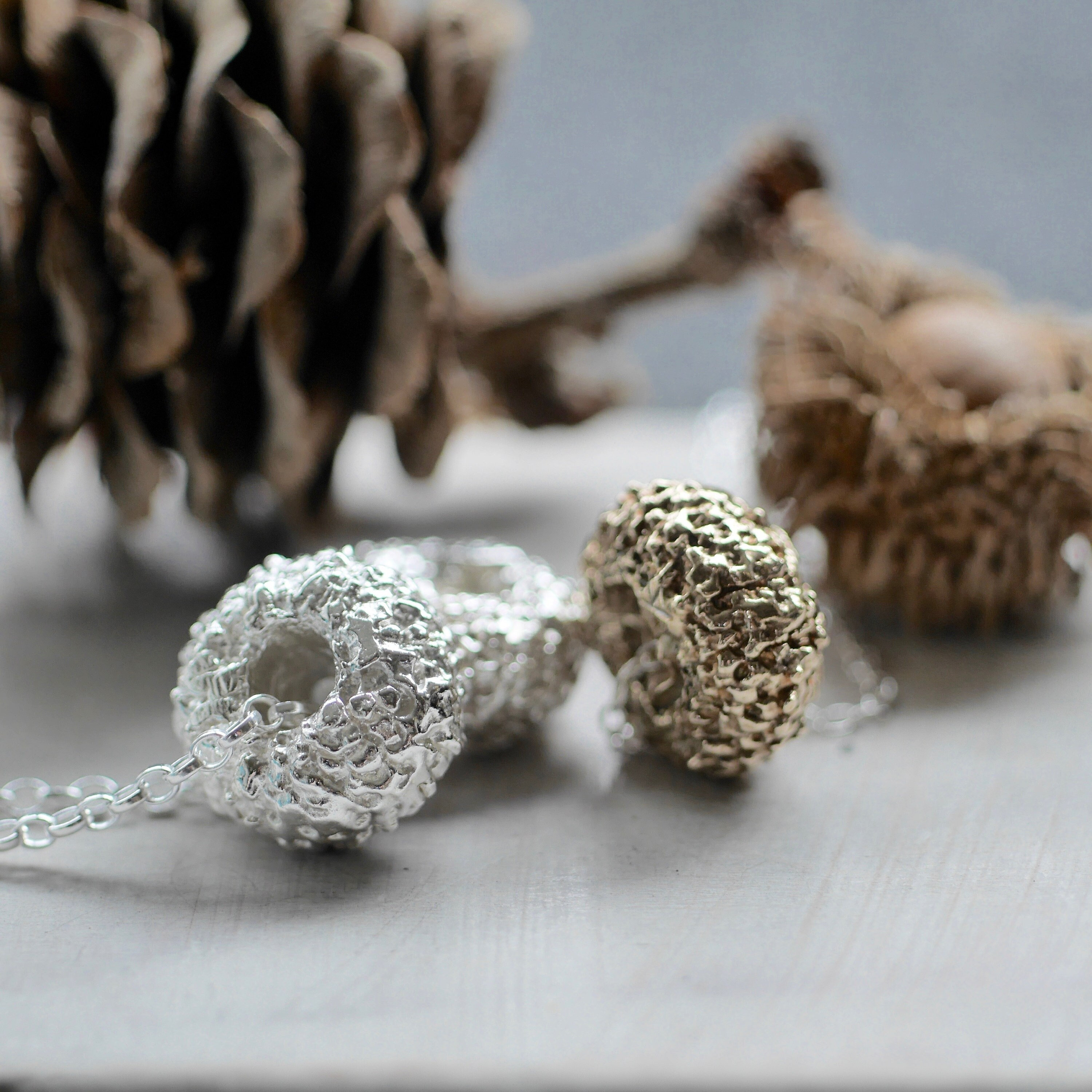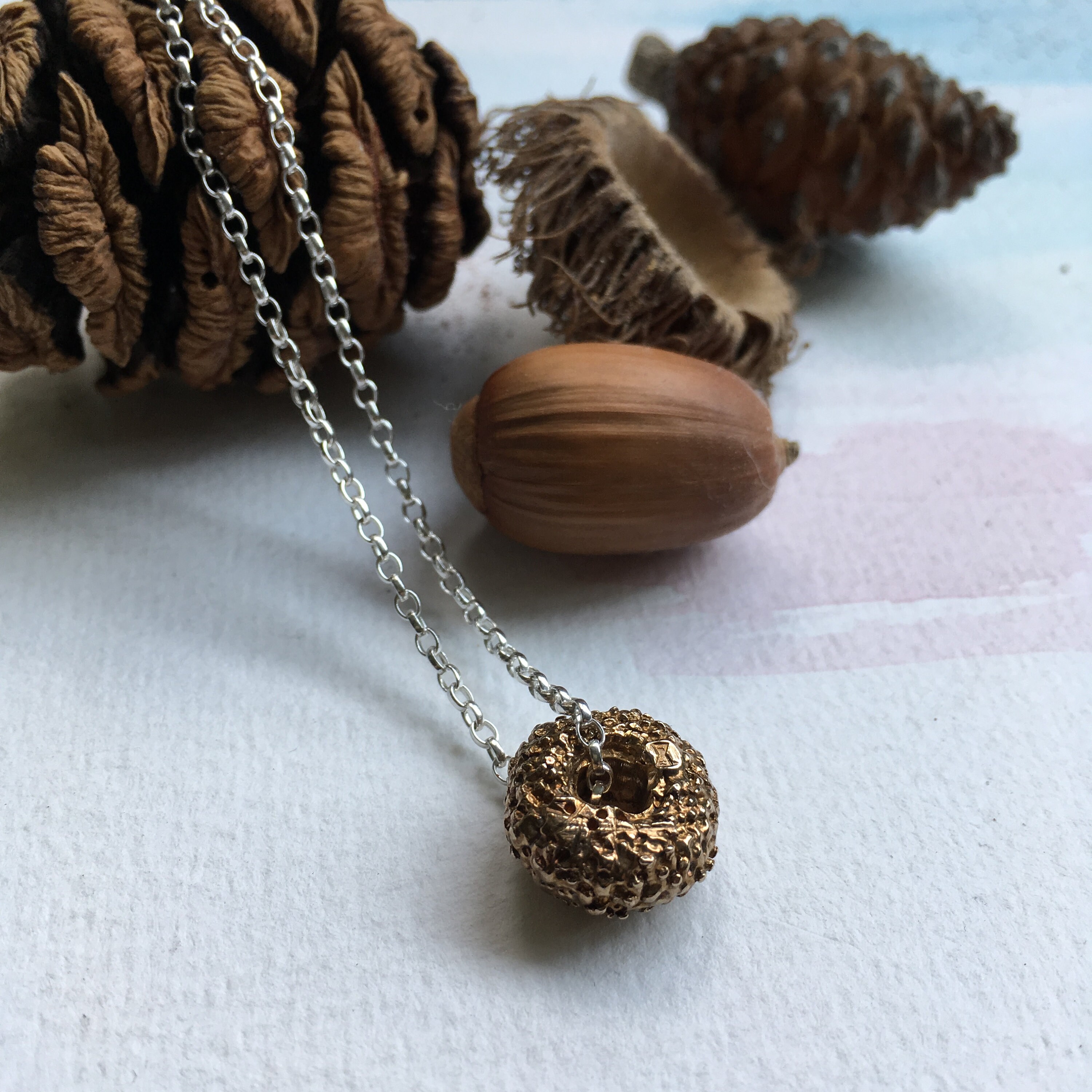 Autumnal acorn doughnut hat necklace, available in your choice of sterling silver or bronze. This piece of natural history acorn cap jewellery makes the perfect gift for nature lovers. The necklace chain is finished in sterling silver. A unique, doughnut-shaped acorn cap necklace is an ideal gift for someone with an autumn birthday. The acorn for this necklace was collected when my daughter was very small. We used to visit the local park, gathering acorns to feed the squirrels during winter. This acorn doughnut necklace holds many cherished memories.