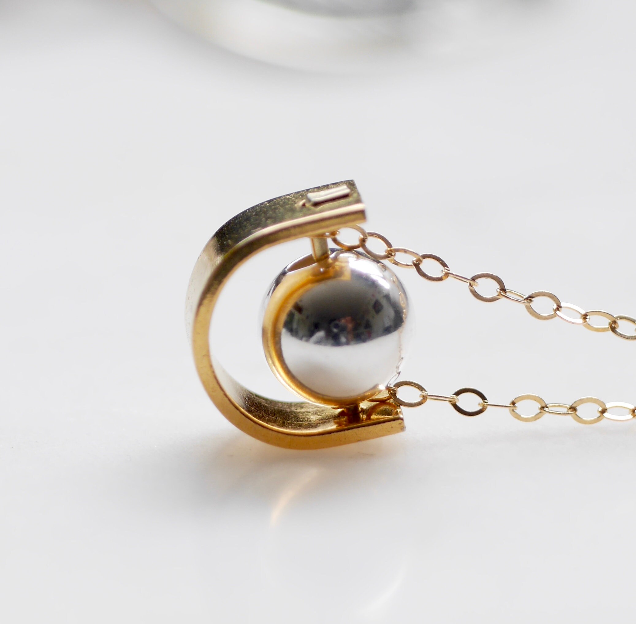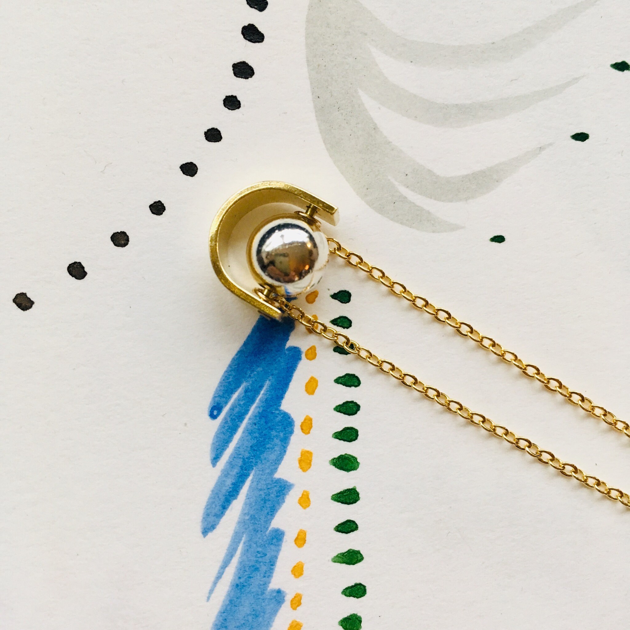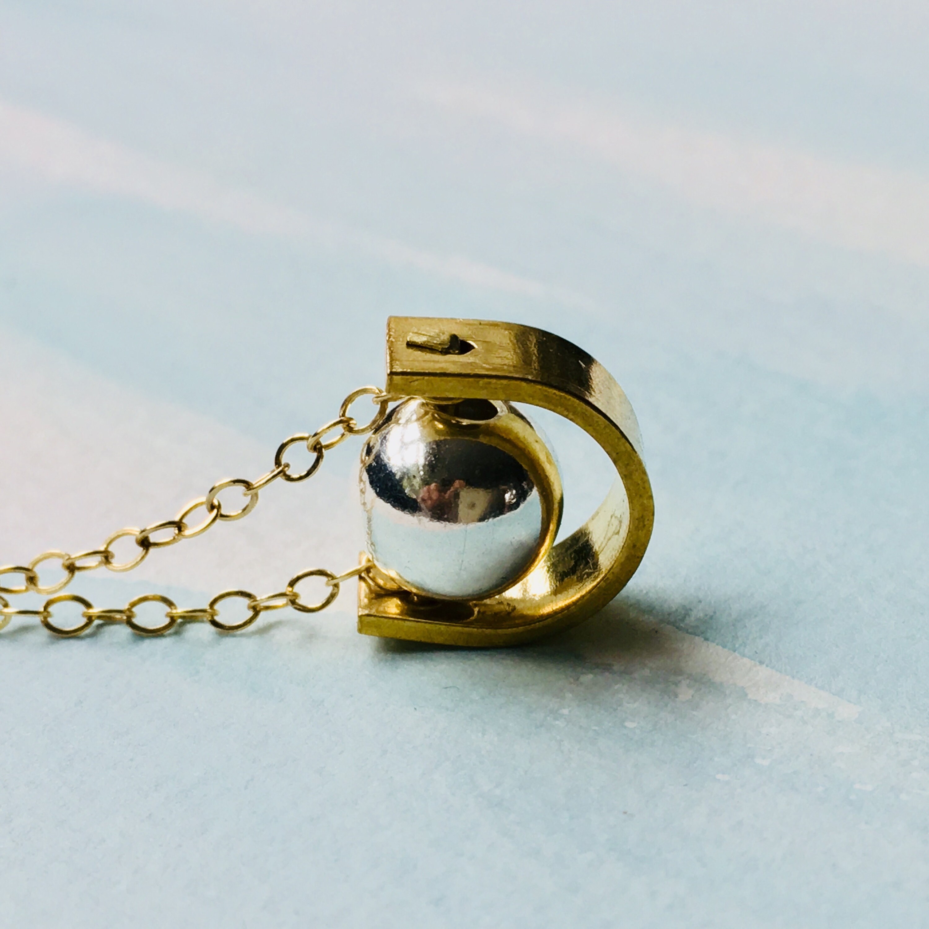 Sterling Silver Ball and Brass Semi Circle Charm Geometric Necklace - Silver Ball and Brass Semi Circle Fidget Necklace- Fidget Jewellery - Stress Relief Jewelry.